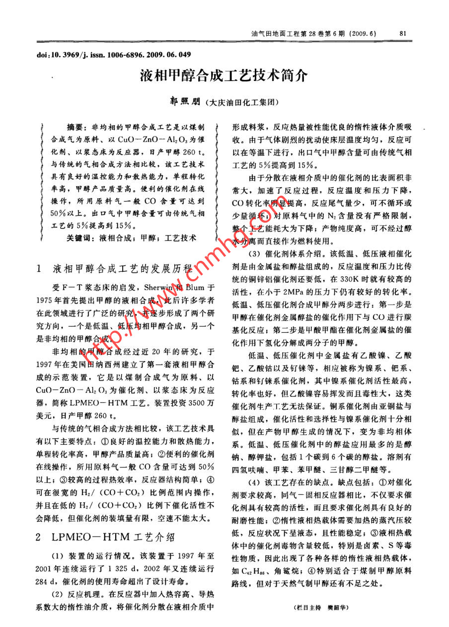 油氣田地面工程第28卷第6期(2009. 6)31doi:10. 3969/j. issn. 1006-6896. 2009.06. 049液相甲醇合成工藝技術(shù)簡(jiǎn)介郭照朋(大慶油田化工集團(tuán))摘要:非均相的甲醇合成工藝是以煤制形成料漿,反應(yīng)熱量被性能優(yōu)良的惰性液體介質(zhì)吸合成氣為原料、以CuO- ZnO- Al2O3為催收。由于氣體劇烈的擾動(dòng)使床層溫度均勻,反應(yīng)可化劑、以漿態(tài)床為反應(yīng)器,日產(chǎn)甲醇260 t。以在等溫下進(jìn)行,出口氣中甲醇含量可由傳統(tǒng)氣相與傳統(tǒng)的氣相合成方法相比較,該工藝技術(shù)工藝的5%提高到15%。具有良好的溫控能力和散熱能力,單程轉(zhuǎn)化由于分散在液相介質(zhì)中的催化劑的比表面積非率高,甲醇產(chǎn)品質(zhì)量高。便利的催化劑在線常大,加速了反應(yīng)過程,反應(yīng)溫度和壓力下降,操作,所用原料氣一般CO含量可達(dá)到CO轉(zhuǎn)化率明顯提高,反應(yīng)尾氣量少,可不循環(huán)或50%以上。出口氣中甲醇含量可由傳統(tǒng)氣相少量循環(huán);對(duì)原料氣中的N2含量沒有嚴(yán)格限制,整個(gè)工藝能耗大為下降;產(chǎn)物純度高,可不經(jīng)過醇關(guān)鍵詞:液相合成;甲醇;工藝技術(shù)水分離而直接作為燃料使用。(3)催化劑體系介紹。該低溫、低壓液相催化1液相甲醇合成工藝的發(fā)展歷程劑是由金屬鹽和醇鹽組成的,反應(yīng)溫度和壓力比傳統(tǒng)的銅鋅鋁催化劑還要低,在330K時(shí)就有較高的受F- T漿態(tài)床的啟發(fā),Sherwin 和Blum于活性,在小于2MPa的壓力下仍有較好的轉(zhuǎn)化率。1975年首先提出甲醇的液相合成,此后許多學(xué)者低溫、低壓催化劑合成甲醇分兩步進(jìn)行:第一步是在此領(lǐng)域進(jìn)行了廣泛的研究,并逐步形成了兩個(gè)研甲醇在催化劑金屬醇鹽的催化作用下與CO進(jìn)行羰究方向,一個(gè)是低溫、低壓均相甲醇合成,另一個(gè)基化反應(yīng);第二步是甲酸甲酯在催化劑金屬鹽的催是非均相的甲醇合成?;饔孟職浠纸獬蓛煞肿拥募状肌?非均相的甲醇合成經(jīng)過近20年的研究,于低溫、低壓催化劑中金屬鹽有乙酸鎳、乙酸1997年在美國(guó)田納西州建立了第一套液相甲醇合鈀、乙酸鈷以及釘錸等,相應(yīng)被稱為鎳系、鈀系、成的示范裝置,它是以煤制合成氣為原料、以鈷系和釕錸系催化劑,其中鎳系催化劑活性最高,Cu0- ZnO - Al2O3為催化劑、以漿態(tài)床為反應(yīng)轉(zhuǎn)化率也好,但乙酸鎳容易揮發(fā)而且毒性大,這類器,簡(jiǎn)稱LPMEO- HTM工藝。裝置投資3500萬催化劑生產(chǎn)工藝無法保證。銅系催化劑由亞銅鹽與美元,日產(chǎn)甲醇260 t.醇鹽組成,催化活性和選擇性與鎳系催化劑十分相與傳統(tǒng)的氣相合成方法相比較,該工藝技術(shù)具似,但在產(chǎn)物甲醇生成的情況下,變?yōu)榉蔷囿w有以下主要特點(diǎn):①良好的溫控能力和散熱能力,系。低溫、低壓催化劑中的醇鹽應(yīng)用最多的是醇單程轉(zhuǎn)化率高,甲醇產(chǎn)品質(zhì)量高;②便利的催化劑鈉、醇鉀鹽,包括1個(gè)碳到6個(gè)碳的醇鹽。溶劑有在線操作,所用原料氣一般CO含量可達(dá)到50%四氫呋喃、甲苯、苯甲醚、三甘醇二甲醚等。以上;③較高的過程熱效率,反應(yīng)器結(jié)構(gòu)簡(jiǎn)單;④(4)該工藝存在的缺點(diǎn)。缺點(diǎn)包括:①對(duì)催化可在很寬的H2/ (CO+CO2)比例范圍內(nèi)操作,劑要求較高,同氣-固相反應(yīng)器相比,不僅要求催并且在低的H2/ (CO+CO2)比例下催化活性不化劑具有較高的活性,而且要求催化劑具有良好的會(huì)降低,但催化劑的裝填量有限,空速不能太大。耐磨性能;②惰性液相熱載體需要加熱的蒸汽壓較2 LPMEO-HTM工藝介紹低,反應(yīng)狀況下呈液態(tài),且性能穩(wěn)定;③液相熱載.體中的催化劑毒物含最較低,特別是鹵素、S等毒.(1)裝置的運(yùn)行情況。該裝置于1997年至性物質(zhì),因此出現(xiàn)了各種各樣的惰性液相熱載體,2001年連續(xù)運(yùn)行了1325d,2002年又連續(xù)運(yùn)行如CqzH8、角鯊?fù)?④特別適合于煤制甲醇原料284 d,催化劑的使用壽命超出了設(shè)計(jì)壽命。路線,但對(duì)于天然氣制甲醇還有不足之處。(2)反應(yīng)機(jī)理。在反應(yīng)器中加人熱容高、導(dǎo)熱系數(shù)大的惰性油介質(zhì),將催化劑分散在液相介質(zhì)中(欄目主持樊韶華)