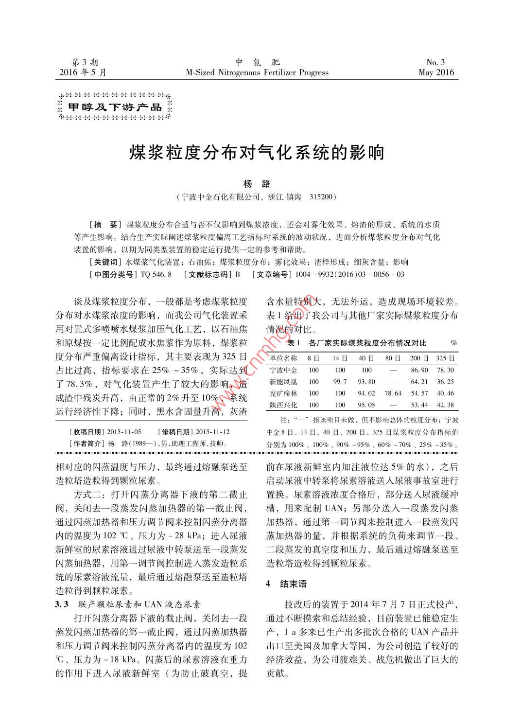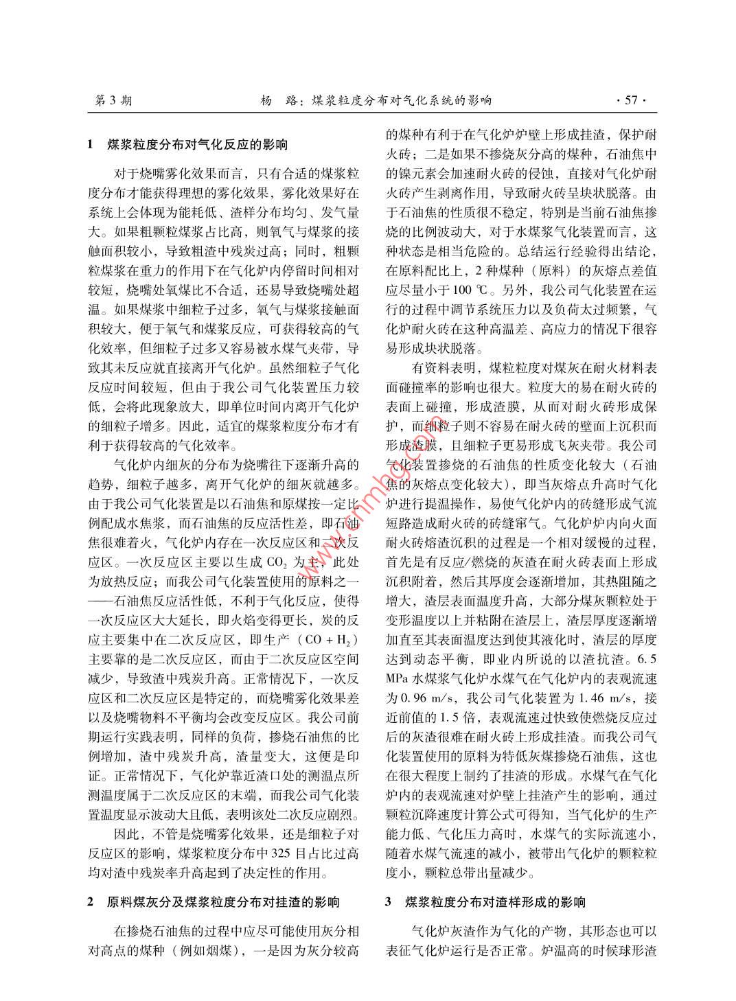 第3期中氮肥No.32016年5月M-Sized Nitrogenous Fertilizer ProgressMay 2016甲醇及下游產(chǎn)品煤漿粒度分布對氣化系統(tǒng)的影響楊路(寧波中金石化有限公司,浙江鎮(zhèn)海315200)[摘要]煤漿粒度分布合適與否不僅影響到煤漿濃度,還會(huì)對霧化效果、熔渣的形成、系統(tǒng)的水質(zhì)等產(chǎn)生影響。結(jié)合生產(chǎn)實(shí)際闡述煤漿粒度偏離工藝指標(biāo)時(shí)系統(tǒng)的波動(dòng)狀況,進(jìn)而分析煤漿粒度分布對氣化裝置的影響,以期為同類型裝置的穩(wěn)定運(yùn)行提供一-定的參考和幫助。[關(guān)鍵詞]水煤漿氣化裝置;石油焦;煤漿粒度分布;霧化效果;渣樣形成;細(xì)灰含量;影響[中圖分類號(hào)] TQ 546.8 [文獻(xiàn)標(biāo)志碼] B [文章編號(hào)] 1004 -9932(2016)03 -0056 -03談及煤漿粒度分布,一般都是考慮煤漿粒度含水量特別大,無法外運(yùn),造成現(xiàn)場環(huán)境較差。分布對水煤漿濃度的影響,而我公司氣化裝置采表1給出了我公司與其他廠家實(shí)際煤漿粒度分布用對置式多噴嘴水煤漿加壓氣化工藝,以石油焦情況的對比。和原煤按一定比例配成水焦?jié){作為原料,煤漿粒表1各廠家實(shí)際煤漿 粒度分布情況對比度分布嚴(yán)重偏離設(shè)計(jì)指標(biāo),其主要表現(xiàn)為325目單位名稱8目14目 40日 80日 200日 325 目.占比過高,指標(biāo)要求在25% ~35%,實(shí)際達(dá)到寧波中金100 100 10086.9078. 30了78. 3%,對氣化裝置產(chǎn)生了較大的影響,造新能鳳凰100 99.7 93. 80一64. 2136. 25成渣中殘?zhí)可撸烧5?%升至10%,系統(tǒng)兗礦榆林100 100 94.02 78.64 54.57 40. 46運(yùn)行經(jīng)濟(jì)性下降;同時(shí),黑水含固量升高,灰渣陜西興化10000 95.0553.44 42.38注:“一”指該項(xiàng)目未做,但不影響總體的粒度分布;寧波[收稿日期] 2015-11-05[修稿日期] 2015-11-12中金8目、14目、40目、200目、325目煤漿粒度分布指標(biāo)值[作者簡介]楊路(1989- +) ,男,助理工程師,技師。分別為100%、100%、 90% -95%、60% -70%、25% -35%。相對應(yīng)的閃蒸溫度與壓力,最終通過熔融泵送至前在尿液新鮮室內(nèi)加注液位達(dá)5%的水),之后造粒塔造粒得到顆粒尿素。啟動(dòng)尿液中轉(zhuǎn)泵將尿素溶液送人尿液事故室進(jìn)行方式二:打開閃蒸分離器下液的第二截止置換。尿素溶液濃度合格后,部分送人尿液緩沖閥,關(guān)閉去一段蒸發(fā)閃蒸加熱器的第一截止閥,槽,用來配制UAN;另部分送人一段蒸發(fā)閃蒸通過閃蒸加熱器和壓力調(diào)節(jié)閥來控制閃蒸分離器加熱器, 通過第一調(diào)節(jié) 閥來控制進(jìn)入- - 段蒸發(fā)閃內(nèi)的溫度為102 C、壓力為-28 kPa;進(jìn)入尿液蒸加熱器的量,并根據(jù)系統(tǒng)的負(fù)荷來調(diào)節(jié)- -段、新鮮室的尿素溶液通過尿液中轉(zhuǎn)泵送至- - 段蒸發(fā)二 二段蒸發(fā)的真空度和壓力,最后通過熔融泵送至閃蒸加熱器,用第一-調(diào)節(jié)閥控制進(jìn)人蒸發(fā)造粒系統(tǒng)的尿素溶液流量,最后通過熔融泵送至造粒塔4結(jié)束語造粒得到顆粒尿素。3.3聯(lián)產(chǎn)顆粒尿素和UAN液態(tài)尿素技改后的裝置于2014年7月7日正式投產(chǎn),打開閃蒸分離器下液的截止閥,關(guān)閉去- -段通 過不斷摸索和總結(jié)經(jīng)驗(yàn),目前裝置已能穩(wěn)定生蒸發(fā)閃蒸加熱器的第一截止閥, 通過閃蒸加熱器產(chǎn), 1 a多來已生產(chǎn)出多批次合格的UAN產(chǎn)品并和壓力調(diào)節(jié)閥來控制閃蒸分離器內(nèi)的溫度為102出口至美國及加拿大等國,為公司創(chuàng)造了較好的C、壓力為-18 kPa。閃蒸后的尿素溶液在重力經(jīng)濟(jì)效益,為公司渡難關(guān)、戰(zhàn)危機(jī)做出了巨大的的作用下進(jìn)入尿液新鮮室( 為防止破真空,提貢獻(xiàn)。第3期楊路:煤漿粒度分布對氣化系統(tǒng)的影響的煤種有利于在氣化爐爐壁上形成掛渣,保護(hù)耐1煤漿粒度分布對氣化 反應(yīng)的影響火磚;二是如果不摻燒灰分高的煤種,石油焦中對于燒嘴霧化效果而言,只有合適的煤漿粒的鎳元索會(huì)加速耐火磚的侵蝕,直接對氣化爐耐度分布才能獲得理想的霧化效果,霧化效果好在火磚產(chǎn)生剝離作用,導(dǎo)致耐火磚呈塊狀脫落。由系統(tǒng)上會(huì)體現(xiàn)為能耗低、渣樣分布均勻、發(fā)氣量于石油焦的性質(zhì)很不穩(wěn)定,特別是當(dāng)前石油焦摻大。如果粗顆粒煤漿占比高,則氧氣與煤漿的接燒的比例波動(dòng)大,對于水煤漿氣化裝置而言,這觸面積較小,導(dǎo)致粗渣中殘?zhí)窟^高;同時(shí),粗顆種狀態(tài)是相當(dāng)危險(xiǎn)的??偨Y(jié)運(yùn)行經(jīng)驗(yàn)得出結(jié)論,粒煤漿在重力的作用下在氣化爐內(nèi)停留時(shí)間相對在原料配比上,2種煤種(原料)的灰熔點(diǎn)差值較短,燒嘴處氧煤比不合適,還易導(dǎo)致燒嘴處超應(yīng)盡量小于100 C。另外,我公司氣化裝置在運(yùn)溫。如果煤漿中細(xì)粒子過多,氧氣與煤漿接觸面行的過程中調(diào)節(jié)系統(tǒng)壓力以及負(fù)荷太過頻繁,氣積較大,便于氧氣和煤漿反應(yīng),可獲得較高的氣化爐耐 火磚在這種高溫差、高應(yīng)力的情況下很容化效率,但細(xì)粒子過多又容易被水煤氣夾帶,導(dǎo)易形成塊狀脫落。致其未反應(yīng)就直接離開氣化爐。雖然細(xì)粒子氣化有資料表明,煤粒粒度對煤灰在耐火材料表反應(yīng)時(shí)間較短,但由于我公司氣化裝置壓
