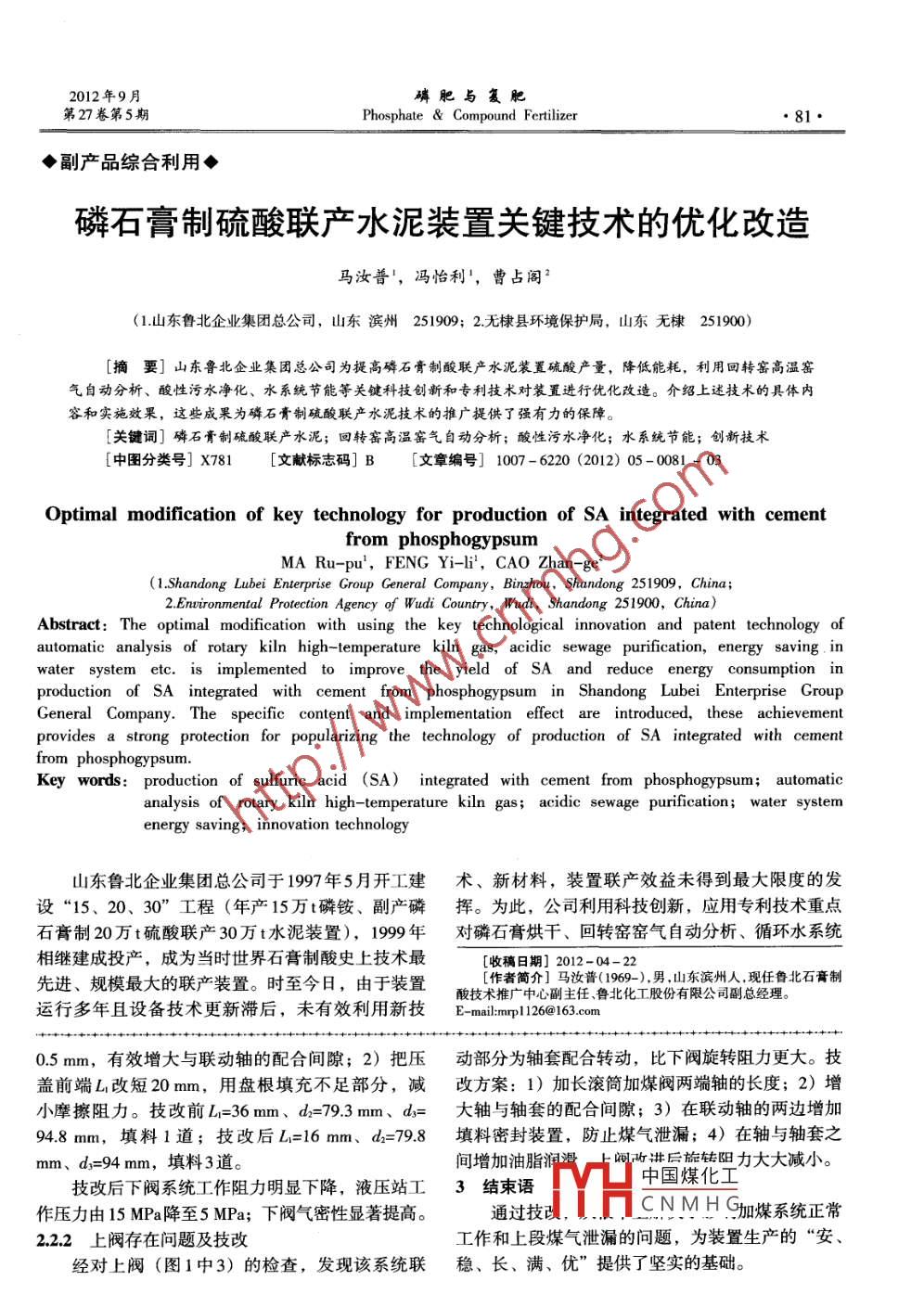 磷肥與復肥2012年9月●80●Phosphate & Compound Fertilizer第27卷第5期.煤氣爐加煤系統(tǒng)的技改業(yè)文成(云南云天化氟化學有限公司,云南昆明650113) .[中圖分類號] TQ440.5[文獻標志碼] B[文章編號] 1007-6220 (2012) 05 - 0080 - 02D2.6BZ-3Q型煤氣爐是我公司30kt/a冰晶石產(chǎn)問題的原因及解決的措施如下。品的熱源供給設備。煤氣爐的運行情況將直接決定2.1液壓站液壓油渾濁及 其解決措施我公司冰晶石的烘千工藝能否正常進行。經(jīng)檢查,液壓站液壓油已渾濁不清。采取措1加煤系統(tǒng)的工作原理施:放掉廢油,對液壓站油箱和油路清洗脫脂、換煤氣爐加煤系統(tǒng)由加煤機和液壓系統(tǒng)組成,結構油。液壓站油箱用清潔的棉布或棉紗蘸清洗液(配見圖1。加煤過程由液壓驅(qū)動的上閥(滾筒閥)和下比見表1)擦洗;油路管線用清洗液灌洗法清洗閥(重錘閥)控制。啟動液壓站油泵,打開煤倉下(每處灌洗時間不能少于15 min)。部插板閥,使煤進入加煤機,關閉插板閥;接通加表1堿性清洗液的配比%煤機滾筒電磁閥,使?jié)L筒閥液壓缸動作,滾筒閥打u(磷酸三鈉) m(磷酸二氫鈉) w(硅酸鈉) (烷基苯磺酸鈉) w(H20)開給煤,待煤進人緩沖倉,并由時間繼電器控制到一5~82~35~60.5~182定時間后停止給煤,然后氣缸泄壓,關閉滾簡閥;打清洗脫脂完畢后,向液壓站的油箱中加入新油開重錘閥開關,使重錘閥液壓缸、電磁閥動作,閥[ ]至觀察孔2/3處。加油時應用0.124mm濾油器過打開,使緩沖倉煤入爐,用時間繼電器控制,待煤落濾。同時對電磁換向閥進行拆卸,用高壓空氣吹掃完后,閥泄壓,閥門關閉,靠重錘壓緊。整個加煤清潔,保證油路系統(tǒng)暢通。過程連續(xù)有序,其中逸出煤氣由煤倉放散管放空。2.2 加煤機下閥、 上閥存在問題及其技改措施2.2.1下 閥存在問題及技改經(jīng)對加煤機下閥拆除檢查,發(fā)現(xiàn)下閥旋轉機構(圖1中8)的問題是:1)壓蓋與軸配合間隙過小; 2)壓蓋前端過長,導致壓蓋與軸摩擦阻力過大。技改措施(見圖2): 1)把壓蓋內(nèi)孔徑d擴大613中12x4均布91-煤倉: 2- 插板閥; 3-上閥: 4- 上閥液壓缸; 5-下閥: 6-下閥液壓缸; 7-下閥連桿(帶配重); 8- 下閥連桿旋轉機構; 9-煤氣爐; 10-放散管圖1煤氣爐加煤系統(tǒng)結構示意圖1-填料壓董; 2-聯(lián)動軸; 3- 填料盒; 4-填料2加煤系統(tǒng)存在問題及 技改措施我公司是新建企業(yè),加煤系統(tǒng)液壓站投人使用d-主轉“中國煤化山-填料盤外徑比工村裝置后,液壓系統(tǒng)工作壓力由原來的6 MPa上升至15TYHCNMHG-MPa,為最高工作壓力6.3 MPa的238%,對安全生[收稿日期] 2011-10-05; [修回日期] 2012-04-25[作者簡介]業(yè)文成(1972-),男,云南江川人,助理工程師。產(chǎn)及設備的正常使用帶來巨大隱患。分析造成這一E- mil:y602829136@qq com2012年9月磷肥與復肥第27卷第5期Phosphate & Compound Fertilizer●81●◆副產(chǎn)品綜合利用◆磷石膏制硫酸聯(lián)產(chǎn)水泥裝置關鍵技術的優(yōu)化改造馬汝普',馮怡利',曹占閣2(1.山東魯北企業(yè)集團總公司,山東濱州251909; 2.無棣縣環(huán)境保護局,山東無棣251900)[摘要]山東魯北企業(yè)集團總公司為提高磷石膏制酸聯(lián)產(chǎn)水泥裝置硫酸產(chǎn)量,降低能耗,利用回轉窯高溫窯氣自動分析、酸性污水凈化、水系統(tǒng)節(jié)能等關鍵科技創(chuàng)新和專利技術對裝置進行優(yōu)化改造。介紹上述技術的具體內(nèi)容和實施效果,這些成果為磷石膏制硫酸聯(lián)產(chǎn)水泥技術的推廣提供了強有力的保障。[關鍵詞]磷石膏制硫酸聯(lián)產(chǎn)水泥;回轉窯高溫窯氣自動分析;酸性污水凈化;水系統(tǒng)節(jié)能;創(chuàng)新技術[中圖分類號] X781[文獻標志碼] B [文章編號] 1007-6220 (2012) 05-0081 - 03Optimal modification of key technology for production of SA integrated with cementfrom phosphogypsumMA Ru-pu', FENG Yi-li, CAO Zhan-ge'(1.Shandong Lubei Enterprise Group General Company, Binzhou, Shandong 251909, China;2.Enwironmental Protection Agency of Wudi Country, Wudi, Shandong 251900, China)Abstract: The optimal modification with using the key technological innovation and patent technology ofautomatic analysis of rotary kiln high-temperature kiln gas, acidic sewage purification, energy saving. inwater system etc. is implemented to improve the yield of SA and reduce energy consumption inproduction of SA integrated with cement from phosphogypsum in Shandong Lubei Enterprise GroupGeneral Company. The specific content and implementation effect are introduced, these achievementprovides a strong protection for popularizing the technology of production of SA integrated with cementfrom phosphogypsum.Key words: production of sulfuric acid (SA) integrated with cement from phosphogypsum; automaticanalysis of rotary kiln high-temperature kiln gas; acidic sewage purification; water systemenergy saving; innovation technology山東魯北企業(yè)集團總公司于1997年5月開工建術、新材料,裝置聯(lián)產(chǎn)效益未得到最大限度的發(fā)設“15、 20、30”工程(年產(chǎn)15萬t磷銨、副產(chǎn)磷揮。 為此,公司利用科技創(chuàng)新,應用專利技術重點石膏制20萬t硫酸聯(lián)產(chǎn)30萬t水泥裝置), 1999年對磷石膏烘千、回轉窯窯氣自動分析、循環(huán)水系統(tǒng)相繼建成投產(chǎn),成為當時世界石膏制酸史上技術最[收稿日期] 2012-04-22 .先進、規(guī)模最大的聯(lián)產(chǎn)裝置。時至今日,由于裝置[作者簡介]馬汝普(1969-),男,山東濱州人,現(xiàn)任魯北石膏制運行多年且設備技術更新滯后,未