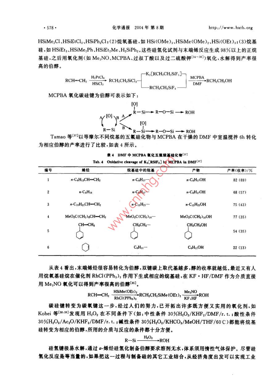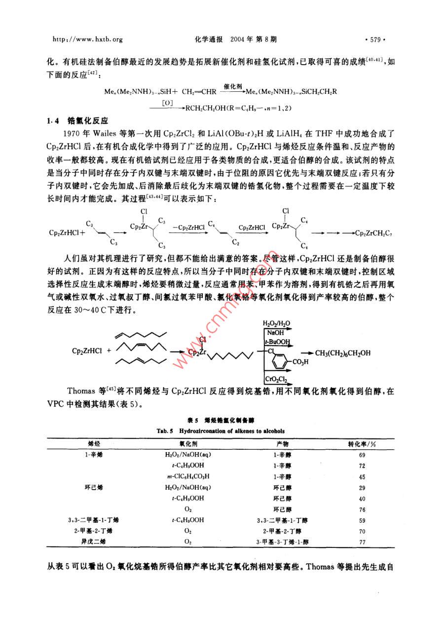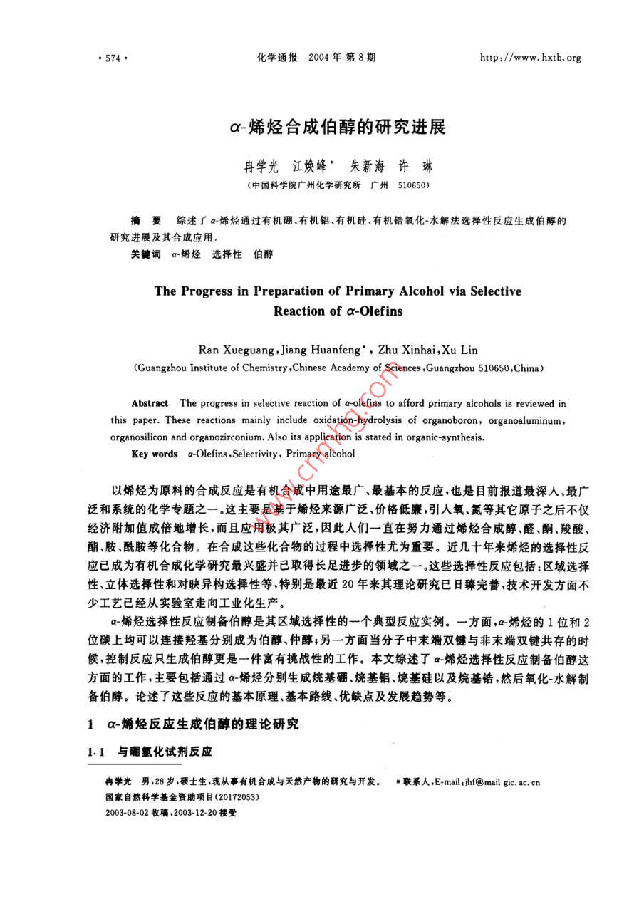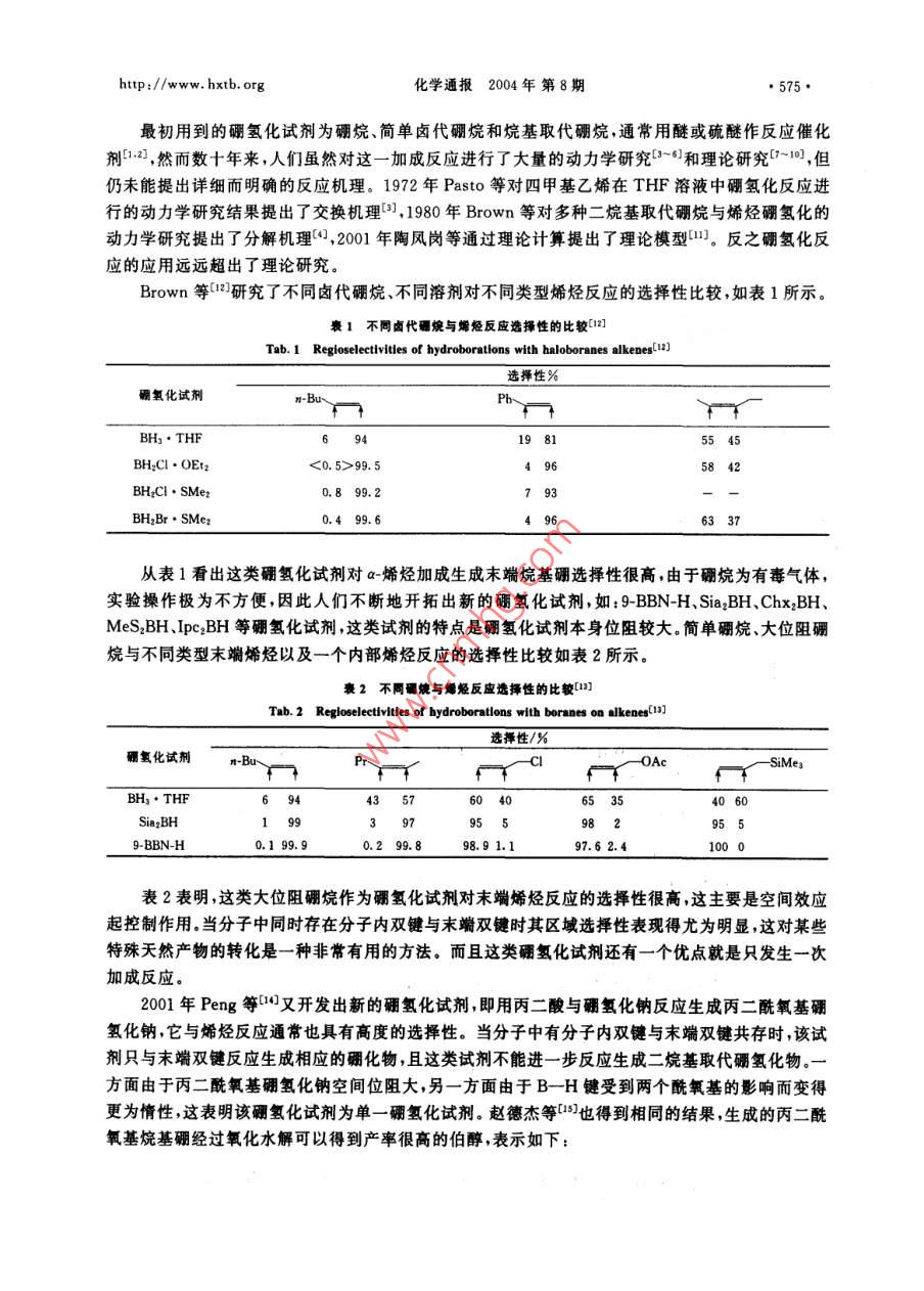 ●574●化學通報2004年 第8期http://www. hxtb. orga-烯烴合成伯醇的研究進展冉學光江煥峰*朱新海許琳(中國科學院廣州化學研究所廣 州510650)摘要綜述了a-烯烴通過有機硼、有機鋁、有機硅、有機鋯氧化水解法選擇性反應(yīng)生成伯醇的研究進展及其合成應(yīng)用。關(guān)鍵詞a-烯烴選擇性伯醇The Progress in Preparation of Primary Alcohol via SelectiveReaction of a-OlefinsRan Xueguang ,Jiang Huanfeng" , Zhu Xinhai ,Xu Lin(Guangzhou Institute of Chemistry ,Chinese Academy of Sciences ,Guangzhou 510650 ,China)Abstract The progress in selective reaction of a-olefins to afford primary alcohols is reviewed inthis paper. These reactions mainly include oxidation-hydrolysis of organoboron, organoaluminum,organosilicon and organozirconium. Also its application is stated in organic-synthesis.Key words a-Olefins ,Selectivity , Primary alcohol以烯烴為原料的合成反應(yīng)是有機合成中用途最廣、最基本的反應(yīng),也是目前報道最深人、最廣泛和系統(tǒng)的化學專題之一。這主要是基于烯烴來源廣泛、價格低廉,引人氧、氮等其它原子之后不僅經(jīng)濟附加值成倍地增長,而且應(yīng)用極其廣泛,因此人們一直在努力通過烯烴合成醇、醛、酮、羧酸、酯、胺、酰胺等化合物。在合成這些化合物的過程中選擇性尤為重要。近幾十年來烯烴的選擇性反應(yīng)已成為有機合成化學研究最興盛并已取得長足進步的領(lǐng)域之--。這些選撣性反應(yīng)包括:區(qū)域選擇性、立體選揮性和對映異構(gòu)選擇性等,特別是最近20年來其理論研究已日臻完善,技術(shù)開發(fā)方面不少工藝已經(jīng)從實驗室走向工業(yè)化生產(chǎn)。a-烯烴選擇性反應(yīng)制備伯醇是其區(qū)域選擇性的一個典型反應(yīng)實例。- 方面,-烯烴的1位和2位碳_上均可以連接羥基分別成為伯醇、仲醇;另一方面當分子中末端雙鍵與非末端雙鍵共存的時候,控制反應(yīng)只生成伯醇更是一件富有挑戰(zhàn)性的工作。本文綜述了a-烯烴選擇性反應(yīng)制備伯醇這方面的工作,主要包括通過a-烯烴分別生成烷基硼、烷基鋁、烷基硅以及烷基鋯,然后氧化-水解制備伯醇。論述了這些反應(yīng)的基本原理、基本路線、優(yōu)缺點及發(fā)展趨勢等。1 a-烯烴反應(yīng)生成伯醇的理論研究1.1 與硼氫化試劑反應(yīng)冉學光男,28 歲,碩士生,現(xiàn)從事有機合成與天然產(chǎn)物的研究與開發(fā)。* 聯(lián)系人,E-mail:jhf@mail gic. ac. cn國家自然科學基金資助項目(20172053)2003-08-02收稿,2003-12-20接受http://www. hxtb. org化學通報2004年 第8期.●575.最初用到的硼氫化試劑為硼烷、簡單鹵代硼烷和烷基取代硼烷,通常用醚或硫醚作反應(yīng)催化劑1.2 ,然而數(shù)十年來,人們雖然對這一加成反應(yīng)進行了大量的動力學研究[3~6]和理論研究[^~10] ,但仍未能提出詳細而明確的反應(yīng)機理。1972年P(guān)asto等對四甲基乙烯在THF溶液中硼氫化反應(yīng)進行的動力學研究結(jié)果提出了交換機理[8],1980年Brown等對多種二烷基取代硼烷與烯烴硼氫化的動力學研究提出了分解機理(4,2001年陶鳳崗等通過理論計算提出了理論模型1。反之硼氫化反應(yīng)的應(yīng)用遠遠超出了理論研究。Brown等(12研究了不同鹵代硼烷、不同溶劑對不同類型烯烴反應(yīng)的選擇性比較,如表1所示。表1不同鹵代硼烷與烯烴反應(yīng)選擇性的比較[12]Tab. 1 Regioselectivtles of hydroborations with haloboranes alkenes[12])選擇性%硼氫化試劑n-Bu~Ph廠7F↑BHs. THF69419 8155 45BH2Cl●OEt2<0.5>99.54 9658 42BH2CI●SMez0.8 99.2793BH:Br●SMer0.4 99.6.6337從表1看出這類硼氫化試劑對a-烯烴加成生成末端烷基硼選擇性很高,由于硼烷為有毒氣體,實驗操作極為不方便,因此人們不斷地開拓出新的硼氫化試劑,如:9-BBN-H、Sia,BH、Chx,BH、MeS.BH.JIpc:BH等硼氫化試劑,這類試劑的特點是硼氫化試劑本身位阻較大。簡單硼烷、大位阻硼烷與不同類型末端烯烴以及一個內(nèi)部烯烴反應(yīng)的選擇性比較如表2所示。衰2不同硼燒與烯烴反應(yīng)選擇性的比較([1]Tab.2 Reloslectvites of bydroboratlons with boranes on alkenes[L8]選擇性/%r-ClOAc廠¥- SiMesBHs●THF6 943 576040653540 60SiaeBH9397955.982559-BBN-H0.1 99.90.2 99.898.9 1.197.6 2.41000表2表明,這類大位阻硼烷作為硼氫化試劑對末端烯烴反應(yīng)的選擇性很高,這主要是空間效應(yīng)起控制作用。當分子中同時存在分子內(nèi)雙鍵與末端雙鍵時其區(qū)域選擇性表現(xiàn)得尤為明顯,這對某些.特殊天然產(chǎn)物的轉(zhuǎn)化是一種非常有用的方法。而且這類硼氫化試劑還有一個優(yōu)點就是只發(fā)生一次加成反應(yīng)。2001年P(guān)eng等[0又開發(fā)出新的硼氫化試劑,即用丙二酸與硼氫化鈉反應(yīng)生成丙二酰氧基硼氫化鈉,它與烯烴反應(yīng)通常也具有高度的選擇性。當分子中有分子內(nèi)雙鍵與末端雙鍵共存時,該試劑只與末端雙鍵反應(yīng)生成相應(yīng)的硼化物,且這類試劑不能進一步 反應(yīng)生成二烷基取代硼氫化物。- -方面由于丙二酰氧基硼氫化鈉空間位阻大,另-方面由于B-H鍵受到兩個酰氧基的影響而變得更為惰性,這表明該硼氫化試劑為單-硼氫化試劑。趙德杰等[5]也得到相同的結(jié)果,生成的丙二酰氧基烷基硼經(jīng)過氧化水解可以得到產(chǎn)率很高的伯醇,表示如下:●576●化學通報2004年 第8期.http:/www. hxtb. orgNaBH+CH2(COOH)2 .THFAr- →Na H2B'pTHF0]RCH一CH2+NaH2B→Na+ RCH2CH2OH△98%RCH2CH2這一