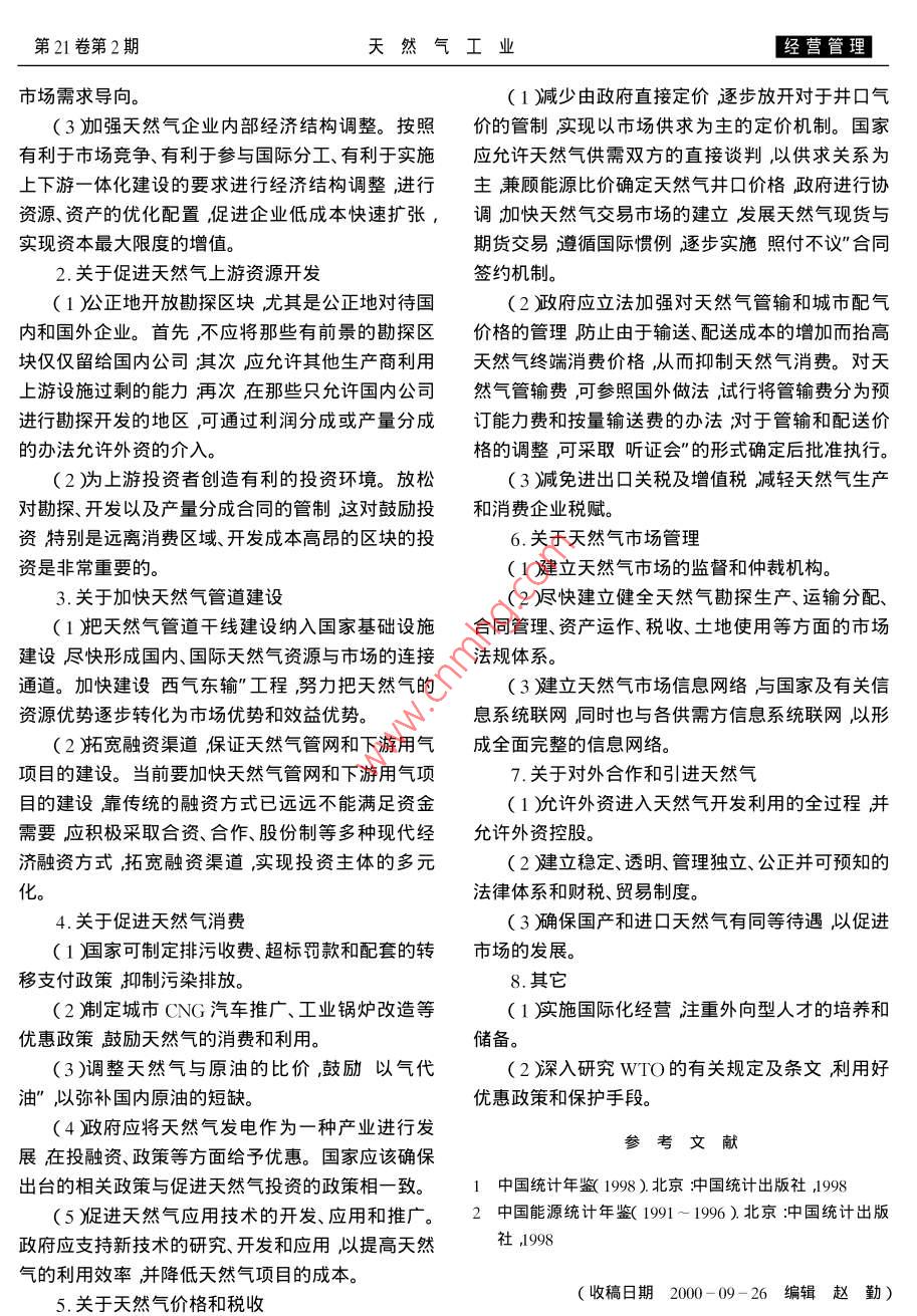 〖經(jīng)營管理天然氣工業(yè)年3月加入WQ對我國天然氣工業(yè)的影響何潤民白蘭君王軍(西南油氣田分公司天然氣經(jīng)濟研究所)西南石油學院)何潤民等加入wTO對我國天然氣工業(yè)的影響天然氣工業(yè)2001212)10-113摘要天然氣工業(yè)是世界經(jīng)濟體系中的高度國際化產(chǎn)業(yè)之一90年代世界天然氣生產(chǎn)與消費的全球一體化已經(jīng)形成。我國天然氣工業(yè)目前仍然處于發(fā)展初期階段,市場發(fā)育緩慢國際化程度極低。加入WIO以后我國天然氣工業(yè)將獲得前所未有的發(fā)展機遇但同時也將面臨嚴峻的挑戰(zhàn)。如何應對新的國際國內(nèi)形勢是一個值得深入研究的問題。文章在對我國目前的天然氣市場經(jīng)濟環(huán)境進行分析的基礎上對加入WTO后的我國天然氣工業(yè)的面臨的機遇與挑戰(zhàn)進行了較深入的探討提出了發(fā)展我國天然氣工業(yè)的相應政策措施建議供參考主題詞WTO天然氣工業(yè)天然氣供應天然氣消費天然氣價格影響我國天然氣工業(yè)的經(jīng)濟市場環(huán)境發(fā)展機遇。3.煤炭工業(yè)的總量控制為天然氣等清潔能源提1.中國能源工業(yè)的布局與發(fā)展重點正由東向西供了良好的發(fā)展環(huán)境轉(zhuǎn)移為加大環(huán)境保護的力度、規(guī)范煤炭市場行為和中國政府已確定把天然氣的開發(fā)利用作為能源保護煤炭資源國家近幾年來做了大量的總量控制發(fā)展的一項重要決策力爭到2005年使全國天然氣和清潔煤應用技術工作。這就為天然氣等清潔能源生產(chǎn)能力在目前的基礎上翻一番其中絕大部分天創(chuàng)造了一個很好的競爭和發(fā)展的環(huán)境和機遇然氣將產(chǎn)于西部的陜甘寧、四川和新疆等省區(qū)。隨西氣東輸”工程的啟動將拉開加速我國天然著西部地區(qū)天然氣的大規(guī)模開發(fā)這一地區(qū)正成為氣工業(yè)發(fā)展的序幕中國重要的能源工業(yè)中心隨著西氣東輸”工程的啟動,天然氣資源將由2.西部大開發(fā)也為我國天然氣工業(yè)的發(fā)展提供中西部地區(qū)流向沿海經(jīng)濟發(fā)達地區(qū),一方面促進了了良好的機遇地區(qū)經(jīng)濟的發(fā)展,另一方面也將推動我國天然氣工為更加適應西部開發(fā)我國正四面八方融資支業(yè)的發(fā)展持西部大開發(fā)國內(nèi)外的私人投資以及國際金融機5.我國經(jīng)濟發(fā)展速度與天然氣供求前景第21卷第2期天然氣工業(yè)〖經(jīng)營管理量增長,與經(jīng)濟發(fā)展速度碁本協(xié)調(diào)。預計到2010深層次的問題沒有根本解決與市場經(jīng)濟還不相適年、20)20年我國人均GDP將分別達到15400元、應。加入WTO以后將更加有利于在管理體制和25800元人民幣而天然氣產(chǎn)量將分別達到750億經(jīng)營機制上進行持續(xù)的重組逐步建立起適應市場立方米、1050億立方米左右天然氣消費量將達到經(jīng)濟要求的、符合國際規(guī)范的管理體制和機制形成1000億立方米、2000億立方米左右。符合國際大市場需求的新的平衡結(jié)構(gòu)。6.中國擴大開發(fā)探礦權將從政策面上進一步加2.有利于天然氣企業(yè)的對外融資快天然氣工業(yè)的發(fā)展加入WTO以后隨著金融服務業(yè)市場的開放據(jù)悉中國政府近期將進一步開放探礦權允許國外資本必將大量流入天然氣企業(yè)將面臨相對寬國外企業(yè)在中國境內(nèi)獨資或者與中外合作的非法人松的融資環(huán)境。這將增強融資的安全性降低融資組織進行風險勘探。這一新的政策將為勘探西部成本緩解因資金不足而導致的企業(yè)發(fā)展后勁不足天然氣資源帶來大量的資金與技術參與西部天然的矛盾同時有助于各企業(yè)審時度勢、科學合理地引氣資源的風險勘探開發(fā)對全國豐富天然氣資源的進和利用外資進一步開發(fā)將起著積極的推動作用3.有利于天然氣工業(yè)技術、裝備的改進和管理7.引進天然氣與多種能源市場的開放水平的提高根據(jù)未來的天然氣供需形勢2010年中國天然些跨國公司將前來投資天然氣企業(yè)與國外氣進口量將達到250億立方米左右2020年將達到公司合作的機會大大增加。通過合作有利于天然950億立方米左右。進口天然氣屆時將成為中國天氣企業(yè)管理水平和市場競爭力的提高。同時隨著然氣市場的重要組成部分。俄羅斯東西伯利亞可能貿(mào)易壁壘的減少和逐步取消,有利于天然氣企業(yè)進成為中國進口天然氣的重要來源。中亞三國也可能口一些國內(nèi)短缺的原材料和國外先進的技術設備向中國出口天然氣。此外廣東省從東南亞或澳大全面提高天然氣企業(yè)的技術和裝備水平。利亞進口液化天然氣的項目也在推進之中。4.將給天然氣企業(yè)的國際化經(jīng)營提供前所未有中國多種能源的開發(fā)已使天然氣與其它能源商的發(fā)展機遇品之間的競爭逐步展開。天然氣代替汽油作汽車燃WTO成員國市場的相互開放,及某些優(yōu)惠待料不僅環(huán)保效益好,也具有價格優(yōu)勢;天然氣替代遇和條件使我們的國際化經(jīng)營獲得良好的發(fā)展機煤作燃料雖然按熱值計算的價格相對高些但煤造遇。天然氣企業(yè)可以到國外市場從事夭然氣勘探開成的污染嚴重屬環(huán)??刂茖ο筇烊粴饪商娲糠职l(fā)及合作、技術服務、工程承包、設備產(chǎn)品出口和勞電力用于