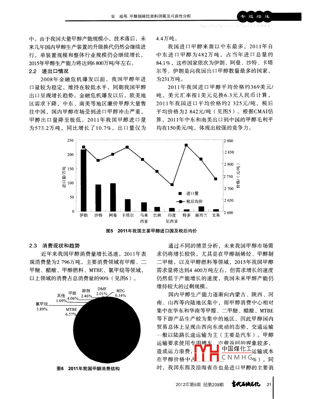 甲醇制烯烴原料供需及可獲性分析安福閔劍(中國石化集團公司經(jīng)濟技術研究院,北京100029)摘要:研究了甲醇行業(yè)和甲醇制烯烴的現(xiàn)狀及發(fā)展趨勢,對外購甲醇制烯烴項目的原料可獲性進行了分析,提出了此類項目控制甲醇成本的相關建議關鍵詞:甲醇制烯烴原料可獲性隨著國際原油價格的上漲,新型煤化工在產(chǎn)1世界甲醇供需現(xiàn)狀及趨勢品競爭力方面顯示出較強的競爭力。在我國煤炭2010年世界甲醇生產(chǎn)能力達到8731萬噸/年,資源豐富的內(nèi)蒙古、寧夏等地區(qū)建設的煤經(jīng)甲醇產(chǎn)量為4942萬噸,表觀消費量為4942萬噸。世界制烯烴項目運行情況良好,在我國蒸汽裂解乙烯甲醇產(chǎn)能增長速度超過需求增長速度,產(chǎn)能出現(xiàn)裝置普遍虧損的情況下,具有較強的盈利能力。嚴重過剩的情況。2010年平均開工率為56.6%,比MTO/MTP成功工業(yè)化,擁有良好的商業(yè)前景,已2008年降低了3.5個百分點。世界各地區(qū)甲醇供需經(jīng)成為國內(nèi)化工行業(yè)關注的焦點?,F(xiàn)狀見表1。表12010年世界甲醇供需狀況萬噸地區(qū)產(chǎn)能(萬噸庫年產(chǎn)量進口量出口量衰觀消費量開工率,%492618341239372中東142092.1中南美1025中東歐75661.8非洲160686.0北美8358271.6大洋洲928合計494227852785*注:不包括中東,以下同。1.1供應現(xiàn)狀及趨勢有所減少,但裝置更加大型化。西歐和北美的甲目前甲醇生產(chǎn)裝置主要分布在亞洲、中東醇產(chǎn)能出現(xiàn)萎縮。和中南美等煤炭和天然氣資源比較豐富的地區(qū)2010年以上地區(qū)的甲醇生產(chǎn)能力占到世界總生產(chǎn)收稿日期:201204-07能力858%,其中亞洲占564%,中東占177%,中作者簡介學碩士,高級工程師,1985南美洲占1.7%(見圖1)。最近幾年,亞洲甲醇生年畢業(yè)于中國煤化工中國石化集產(chǎn)能力增長最快,2010年產(chǎn)能達到4926萬噸/年,團公司經(jīng)CNMHG主要從事石主要增長來自于中國。中南美洲總產(chǎn)能比2005年油化工與煤化工項目評估、咨詢和規(guī)劃等工作18北代2012年第5期總第209期安福等.甲醇制烯烴原料供需及可獲性分析中南美洲、中東等地的甲醇企業(yè)規(guī)模大,天其他然氣原料成本低廉,具有很強的競爭力。因此,中東和中南美洲的甲醇裝置開工率較高。預計2015年,世界甲醇生產(chǎn)能力達到12795甲基丙烯酸萬噸/年(見圖1),2010-2015年產(chǎn)能年均增速甲酯2%燃料7.9%,產(chǎn)能增長仍然較快,開工率可能會進甲胺3%步降低。在全部已公開的擴建計劃中,未來全球溶劑4%甲醇新增生產(chǎn)能力主要集中在亞洲,尤其以中國氯甲烷產(chǎn)能增長為主。除中國外,甲醇產(chǎn)能將明顯增長圖22010年世界甲醇消費結(jié)構(gòu)的國家主要有智利、埃及、伊朗、俄羅斯等。另外,由于北美天然氣價格下降,加拿大、美國一受金融危機影響,2010年世界甲醇消費較些閑置的甲醇裝置將會重新啟動。2008年有較大的變化。甲醛主要用于建筑行業(yè)的粘合劑,北美、西歐的經(jīng)濟衰退導致房地產(chǎn)行14000魯大洋洲■中東歐業(yè)不景氣,較大程度地影響甲醛對甲醇的需求,12000北美中南美2010年甲醇消費結(jié)構(gòu)程度地中,用于生產(chǎn)甲醛的100非洲中東甲醇比例下降較快,降低了8個百分點。甲醇作直■西歐■亞洲8000接燃料的消費量增長迅速,占甲醇消費的比例已6000由2008年的78%上升到107%。由于美國禁止使用4000MTBE,歐洲推廣ETBE替代品,從2003年開始,世界MTBE的消費量就在逐年下降,目前,世界2000MTBE消費的甲醇量已從甲醇消費結(jié)構(gòu)的原第二位2005年010年2015年降至第四位。圖1世界甲醇生產(chǎn)能力及地區(qū)分布變化趨勢預計2015年全球甲醇需求量為7800萬噸左右,亞洲仍是世界甲醇消費最大的地區(qū)。甲醇消1.2需求現(xiàn)狀及趨勢費結(jié)構(gòu)中,傳統(tǒng)甲醇消費領域,如甲醛、MTBE等2010年世界甲醇需求為4942萬噸,2005-所占比例將持續(xù)下降,受中國煤化工的影響,直2010年年均增長62%。目前全球甲醇消費地區(qū)集接用于燃料的甲醇,以及用于生產(chǎn)乙烯、丙烯、中在亞洲、西歐和北美等地區(qū),2010年以上區(qū)域二甲醚等產(chǎn)品的甲醇將逐步增多。甲醇總消費量約為4153萬噸,占當年全球總消費1.3世界甲醇貿(mào)易平衡和流向分析量的840%。以上區(qū)域同時也是甲醇的主要凈進口007年以前,世界甲醇供需較為平衡,過剩區(qū)域。產(chǎn)能基本維持在1000萬噸/年以下。2008年以后世界范圍內(nèi),僅中國對甲醇的需求增長供獻甲醇產(chǎn)能擴張迅猛,世界甲醇產(chǎn)能過剩情況急劇惡較大。2008年金融危機發(fā)生后,北美和西歐房地化,到2010年,產(chǎn)能過剩已經(jīng)接近4000萬噸/。產(chǎn)、汽車等行業(yè)的衰退使這些地區(qū)對甲醇的需求預計2013年左右,世界甲醇產(chǎn)能過剩將達到頂峰,量明顯減少,中東地區(qū)大量過剩的甲醇商品涌入超過5500萬噸年,此后甲醇行業(yè)開工率將逐漸恢中國市場。復。世界甲醇市場的供應能力將長期保持過剩。在2010年世界甲醇消費結(jié)構(gòu)中,甲醛是最大由于世界甲醇的主要生產(chǎn)能力分布在亞洲、的消費領域,占27%;其次為直接燃料用途,約中東和中南美,需求主要集中在北美、歐洲和亞占總消費量的17%;第三為醋酸,約占10%;甲洲。供給與需求V凵中國煤化工的世界貿(mào)基叔丁基醚(MTBE)用途約占10%。2