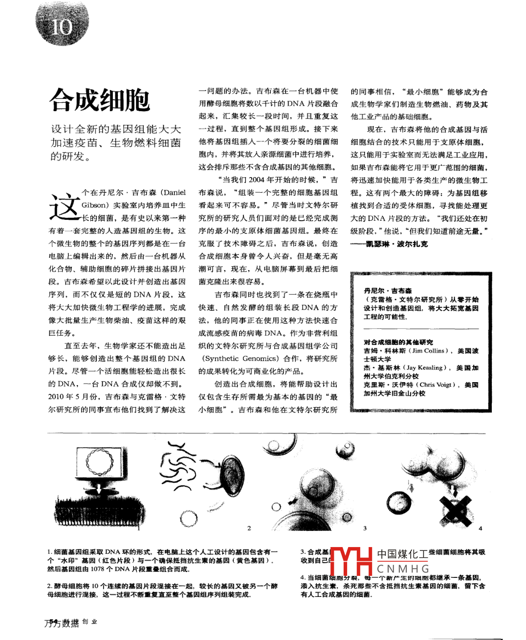 IO一問題的辦法。吉布森在一臺機器中使的同事相信, “ 最小細胞”能夠成為合用酵母細胞將數(shù)以千計的DNA片段融合成生物學(xué)家們制造生物燃油、藥物及其合成細胞起來,匯集較長-段時間, 并且重復(fù)這他工業(yè)產(chǎn)品的基礎(chǔ)細胞。設(shè)計全新的基因組能大大.一過程,直到整個基因組形成。接下來現(xiàn)在,吉布森將他的合成基因與活加速疫苗、生物燃料細菌他將基因組插入- -個將要分裂的細菌細細胞 結(jié)合的技術(shù)只能用于支原體細胞,的研發(fā)。胞內(nèi),并將其放人親源細菌中進行培養(yǎng),這只能用于實驗室而無法滿足工業(yè)應(yīng)用,這會排斥那些不含合成基因的其他細胞。如果吉布森能將它用于更廣范圍的細菌,“當(dāng)我們2004年開始的時候,”吉將迅速加快能用于各類生產(chǎn)的微生物工個在丹尼爾.吉布森(Daniel布森說,“組裝一個完整的細胞基因組程。這有兩個最大的障礙:為基因組移Gibson) 實驗室內(nèi)培養(yǎng)皿中生看起來可不容易。”盡管當(dāng)時文特爾研植找到合適的受體細胞,尋找能處理更這r長的細菌,是有史以來第一 種究所的研究人員們面對的是已經(jīng)完成測 大的DNA片段的方法。 “我們還處在初有著--套完整的人造基因組的生物。這序的最小的支原體細菌基因組。最終在級階段,”他說,“但我們知道前途無量?!眰€微生物的整個的基因序列都是在- -臺克服了 技術(shù)障礙之后,吉布森說,創(chuàng)造凱瑟琳●波爾扎克電腦上編輯出來的,然后由- -臺機器從合成細胞本身曾令人興奮,但是毫無高化合物、輔助細胞的碎片拼接出基因片潮可言,現(xiàn)在,從電腦屏幕到最后把細段。古布森希望以此設(shè)計并創(chuàng)造出基因菌 克隆出來很容易。丹尼爾●吉布森序列,而不僅僅是短的DNA片段,這吉布森同時也找到了一條在燒瓶中(克雷格.文特爾研究所)從零開始將大大加快微生物工程學(xué)的進展,完成快速、自然發(fā)酵的組裝長段DNA的方設(shè)計和創(chuàng)造基因組,將大大拓寬基因像大批量生產(chǎn)生物柴油、疫苗這樣的艱法,他的同事正在使用這種方法快速合工程的可能性.巨任務(wù)。成流感疫苗的病毒dNA.作為非營利組對合成細胞的其他研究直至去年,生物學(xué)家還不能造出足織的文特爾研究所與合成基因組學(xué)公司吉姆.科林斯(Jim Collins),美國波夠長,能夠創(chuàng)造出整個基因組的DNA(Synthetic Genomics) 合作,將研究所片段。盡管一個活細胞能輕松造出很長的成果轉(zhuǎn)化為可商業(yè)化的產(chǎn)品。杰.基斯林(Jay Keasling),美國加州大學(xué)伯克利分校的DNA,一臺DNA合成儀卻做不到。創(chuàng)造出合成細胞,將能幫助設(shè)計出克里斯.沃伊特( Chris Voigt),美國加州大學(xué)舊金山分校2010年5月份,吉布森與克雷格.文特僅包含生存所需最為基本的基因的“最爾研究所的同事宣布他們找到了解決這小細胞”。吉布森和他在文特爾研究所)◎Hbtttintietintues1.細菌基因組采取DNA環(huán)的形式,在電腦. 上這個人工設(shè)計的基因包含有一3.合成基中國煤化工些細菌細胞將其吸個“水印”基因(紅色片段)與一個確保抵擋抗生素的基因(黃色基因) .收到自己然后基因組由1078 個DNA片段重組合而成.CNMHG4.當(dāng)細離:MH個稱產(chǎn)生的細肥都繼承-條基因,2.酵母細胞將10個連續(xù)的基因片段混接在-起,較長的基因又被另一個酵添入抗生素,殺死那些不含抵擋抗生素基因的細菌,留下含母細胞進行混接,這一過程不斷1 復(fù)直至整個基因組序列組裝完成.有人工合成基因的細菌.防數(shù)搪創(chuàng)業(yè)