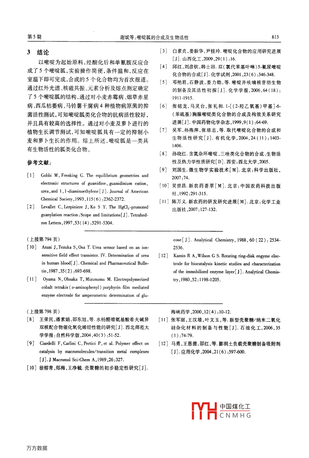 第42卷第5期應(yīng)用化工Vol. 42 No.52013 年5月Applied Chemical IndustryMay 2013嘧啶胍的合成及生物活性謝斌',孫曉紅2 ,劉源發(fā),陳邦,馬海霞‘(1.陜西省西安植物園,陜西西安710061 ;2.西北大學(xué)化學(xué)研究所,陜西西安710069;3.西北大學(xué)化學(xué)與材料學(xué)院,陜西西安710069;4. 西北大學(xué)化工學(xué)院,陜西西安710069)摘要:以嘧啶 為起始原料,酸化后和單氰胺反應(yīng)生成五種具有生物活性的嘧啶胍。通過(guò)紅外光譜( IR)、核磁共振('HNMR)、元索分析和熔點(diǎn)測(cè)定確定了各化合物的結(jié)構(gòu).研究了化合物對(duì)小麥赤霉病煙草赤星病、西瓜枯萎病、馬鈴薯干腐病4種植物病原菌的生物活性,得到毒力回歸方程及相關(guān)性系數(shù)、ECo和ECgs值;還對(duì)小麥和蘿卜生長(zhǎng)調(diào)節(jié)的活性進(jìn)行了研究。結(jié)果表明,該類化合物具有較好的抑菌活性和植物生長(zhǎng)調(diào)節(jié)活性。關(guān)鍵詞:嘧啶;胍類化合物;合成;生物活性中圖分類號(hào):0 621.3文獻(xiàn)標(biāo)識(shí)碼:A文章編號(hào):1671 - 3206(2013)05 -0809 -05Synthesis and biological activities of guanidinesubstituted pyrimidineXIE Bin' ,SUN Xiao -hong2 ,U Yuan-fa? ,CHEN Bang' ,MA Hai-xia'(1. Institute of Botany of Shaanxi Province ,Xi' an 710061 ,China;2. Chemical Research Institute , Northwest University ,Xi' an 710069 ,China ;3. Collge of Chemistry & Materials Science , Northwest University ,Xi' an 710069 ,China;4. College of Chemical Engineering, Northwest University , Xi' an 710069 ,China)Abstract: Five biological active pyrimidine guanidines were synthesized by using pyrimidine and cyanam-ide under acidification. Their structures were confirned by infrared spectra ( IR) , nuclear magnetic reso-nance spectroscopy (' H NMR ) elemental analysis and melting point measurement. The biological activi-ties to the four vegetable pathogens of Gibberlla saubineti , Gibberlla nicotiancola , Fusarium oxysporium f.s. p. niveum, Pythium solani were tested, the toxic regression equation and correlation coefficient were ob-tained , the ECso and ECgs were calculated; the growth regulation activities to wheat and radish were alsotested. The results show that such compounds exhibit good fungicidal activities and plant growth regulatingactivities.Key words:pyrimidine ; guanidine compounds; synthesis ; biological activity胍類化合物是具有良好生物活性和廣泛應(yīng)用的等,是一種廣譜的殺菌劑,具有對(duì)人畜和植物安全無(wú)化合物。胍是最強(qiáng)的有機(jī)堿" ,對(duì)某些物質(zhì)有較高毒害的優(yōu)點(diǎn)。本文利用單氰胺與具有生物活性的取的親和性,特別是酸、磷酸脂、羧酸脂和金屬離代嘧啶反應(yīng),合成了5個(gè)嘧啶胍類化合物,化合物結(jié)子(21。胍類化合物具有良好的生理活性,常作為添構(gòu)通過(guò)IR、'HNMR和元素分析得到證實(shí),并初步加劑、表面活性劑以及藥物合成中間體等被用于多測(cè)定了其抑菌活性及植物生長(zhǎng)調(diào)節(jié)活性。個(gè)領(lǐng)域。嘧啶廣泛應(yīng)用于醫(yī)藥135]、農(nóng)藥等領(lǐng)域。嘧啶的1實(shí)驗(yàn)部分母核本身具有殺菌能力。不僅能夠有效抑制細(xì)菌的1.1 試劑與儀器滋生,也擁有對(duì)雙子葉植物大于70%的除草活4.6-二氯-5-氨基嘧啶、2-氨基4-羥基6-甲基嘧性[61,同時(shí),它對(duì)幾種植物寄生蟲也有一定的殺蟲啶、2-氨基4,6-二甲氧基嘧啶、2-氨基4-氯-6-甲氧性能”。嘧霉胺及其鹽是一類典型的嘧啶類殺菌基嘧啶、2-氨基4 ,6-二羥基嘧啶均為自制;吐溫40、劑(8] ,用于防治蔬菜水果的灰霉病、黑星病、灰星病3-_吲哚丁酸均為化學(xué)純;甲基托布津,工業(yè)品;菌種:收稿日期:2013-03-05修改稿日期:2013-03-26中國(guó)煤化工基金項(xiàng)目:國(guó)家自然科學(xué)基金資助項(xiàng)目(21073141 ,31200257);陜西省科學(xué)院YHCN M H夾西科技統(tǒng)籌刨新工程計(jì)劃項(xiàng)目(2012KTCL02-07)作者簡(jiǎn)介:謝斌(1985-),男,臺(tái)灣臺(tái)南人,陜西省植物研究所研究實(shí)習(xí)員,碩士,從事有機(jī)化學(xué)方面的研究。電話:18049283628 , E - mail:0000scar@ sina. com810應(yīng)用化工第42卷小麥赤霉病( Gbebrla saubineti), 煙草赤星病(Gib-三角 瓶依次趁熱取出,用移液槍從低濃度到高濃度berlla nicotiancola) ,西瓜枯萎病( Fusarium oxyspori-依次吸取0.4 mL已知濃度藥液,加入三角瓶,搖勻,umf. s. p. niveum) , 馬鈴薯干腐病( Pythium solani)。則藥液被稀釋為100,250 ,500,1 000 mg/L,迅速倒X4型顯微熔點(diǎn)儀; VarioEL鞏型元素分析儀;人培養(yǎng)皿中,并在培養(yǎng)皿上依次進(jìn)行編號(hào),倒完后平VERTEX 70型紅外分光光度計(jì)( KBr) ; Varian unity放在無(wú)菌操作臺(tái)上冷卻凝固,待用。用高溫滅菌后INOVA- 400超導(dǎo)核磁共振儀。的注射器針頭將4種真菌的菌餅菌絲朝下置于裝有.2 化合物的合成含藥培養(yǎng)基的平板中央,按一定順序放在恒溫培養(yǎng)合成路線如下:箱中,在28 C下培養(yǎng)72 h。R一NH,濃HCl>R一NH,●HCl+NH.CN1.3.5抑菌活性測(cè)試 72 h后,取出培養(yǎng)皿,測(cè)量NH菌落直徑(以游標(biāo)卡尺測(cè)量,十字交叉2次,取平均)。重復(fù)測(cè)量3次,取平均值進(jìn)行抑制率的計(jì)算:"0),→R-NH NH,●HCl抑制率=:空白對(duì)照菌落直徑=處理菌落直徑x 100%空白對(duì)照菌落直徑-4NF1.4植物生長(zhǎng)活性11]1.4.1 種子前處理 因?yàn)樽尤~形狀大小基本均勻R- NHNH,●HCI- NaOH+ R--NH NH,可以保證實(shí)驗(yàn)的準(zhǔn)確,所以選擇單子葉(小