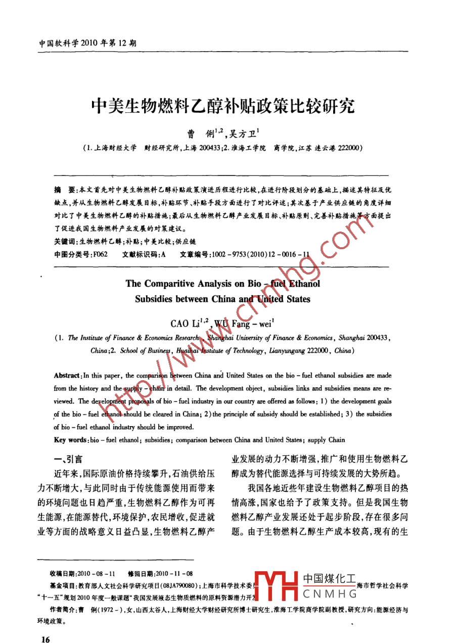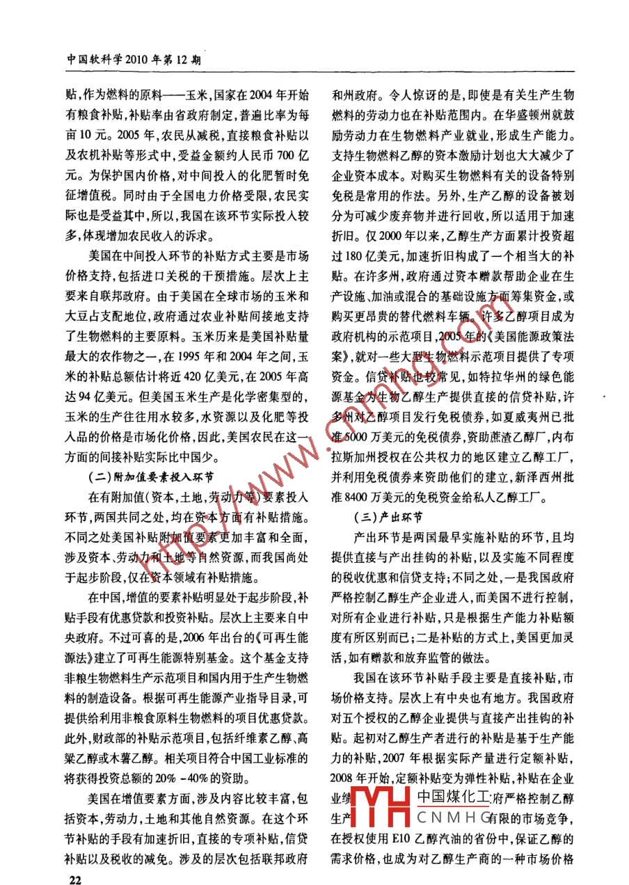 中國軟科學2010年第12期中美生物燃料乙醇補貼政策比較研究曹俐2,吳方衛(wèi)(1.上海財經(jīng)大學財經(jīng)研究所,上海20043;2.淮海工學院商學院,江蘇連云港2200摘要:本文首先對中美生物燃料乙醇補點政策演進歷程進行比較,在進行階段劃分的基礎上,描迷其特征及優(yōu)缺點,并從生物燃料乙醇發(fā)展目標,補貼環(huán)節(jié)、補貼手段方面進行了對比評逑;其次基于產(chǎn)業(yè)供應鏈的角度詳細對比了中美生物燃料乙醇的補貼措施;最后從生物燃料乙醇產(chǎn)業(yè)發(fā)展目標、補貼原則、完善補貼措施等方面提出了促進我國生物燃料產(chǎn)業(yè)發(fā)展的對策建議。關鍵詞:生物燃料乙醇;補點;中美比較;供應鏈中圖分類號F062文獻標識碼:A文章編號:1002-9753(200)12-0016-11The Comparitive Analysis on Bio-fuel EthanolSubsidies between China and United StatesCAO Li, wU fang-wei1. The institute of Finance& Economics Research, Shanghai University of Finance EconShanghai 200433China; 2. School of Business, Huaihai Institute of Technology, Lianyungang 222000, ChinaAbstract: In this paper, then between China and United States on the bio-fuel ethanol subsidies are madefrom the history and the supply-chain in detail. The development object, subsidies links and subsidies means are re-viewed. The development proposals of bio-fuel industry in our country are offered as follows: 1)the development goalsof the bio-fuel ethanol should be cleared in China; 2)the principle of subsidy should be established; 3)the subsidiesKey words: bio-fuel ethanol; subsidies; comparison between China and United States; supply Chain一、引言業(yè)發(fā)展的動力不斷增強推廣和使用生物燃料乙近年來,國際原油價格持續(xù)攀升,石油供給壓醇成為替代能源選擇與可持續(xù)發(fā)展的大勢所趨力不斷增大,與此同時由于傳統(tǒng)能源使用而帶來我國各地近些年建設生物燃料乙醇項目的熱的環(huán)境問題也日趨嚴重,生物燃料乙醇作為可再情高漲,國家也給予了政策支持。但是我國生物生能源,在能源替代,環(huán)境保護,農(nóng)民增收,促進就燃料乙醇產(chǎn)業(yè)發(fā)展還處于起步階段,存在很多問業(yè)等方面的戰(zhàn)略意義日益凸顯,生物燃料乙醇產(chǎn)題。由于生物燃料乙醇生產(chǎn)成本較高,現(xiàn)有的生收稿日期:2010-08-11修回日期:2010-11-08基金項目:教育部人文社會科學研究項日(08A790080);上海市科學技術委H中國煤化工海市哲學社會科學一五”規(guī)劃2010年度一般課題“我國發(fā)展液態(tài)生物質(zhì)燃料的原料資源潛力開CNMHG作者簡介:曹俐(1972-),女山西太谷人,上海財經(jīng)大學財經(jīng)研究所博士研究生淮海工學院商學院副教授研究方向能源經(jīng)濟與環(huán)境政策。16戰(zhàn)略與決策中美生物燃料乙醇補貼政策比較研究產(chǎn)規(guī)模、技術水平導致生物燃料乙醇缺乏市場競海的首家非糧乙醇企業(yè)(木薯乙醇)廣西中糧生物爭力,生物燃料乙醇企業(yè)如果沒有國家的補貼質(zhì)能源有限公司的20萬噸燃料乙醇試點項目,予將面臨虧損。為了提高生物燃料乙醇企業(yè)的市場以補貼政策支持。迄今為止,生物燃料乙醇補貼化競爭能力,實現(xiàn)發(fā)展生物燃料乙醇能源替代,保政策演進經(jīng)歷了以下三個階段護環(huán)境增加就業(yè),促進農(nóng)民增收的訴求,政府應1.成本加利潤(保本微利)補貼階段(2002該如何補貼生物燃料乙醇產(chǎn)業(yè),具體應該采取哪2004年)本階段糧食乙醇的生產(chǎn)目標主要是為些補貼策略成為我們亟待探討的問題。目前,美了消化陳化糧在199年我國糧食積壓情況嚴重,國是世界上生物燃料乙醇的最大生產(chǎn)國,為促進大量富余的糧食無法釋放,只有儲存起來。國家生物燃料乙醇的生產(chǎn),美國政府從20世紀石油危不僅要拿出大量資金去新建糧庫,還要對庫存的機之后就開始對生物乙醇生產(chǎn)采取了一系列的補糧食提供巨額補貼財政不堪重負,消化陳化糧成貼措施促進發(fā)展生物燃料乙醇產(chǎn)業(yè),積累了豐富為中國政府推廣燃料乙醇的最初設想。考慮到試的經(jīng)驗值得我們借鑒。本文在總結中美生物燃料點期間企業(yè)生產(chǎn)經(jīng)營的積極性,采取保本微利的乙醇補貼政策演進歷程的基礎上,深人比較兩國補貼原則,其政策目標是有利于扶持糧食乙醇企在生物燃料補貼政策上的異同,尋找我國完善生業(yè)生存發(fā)展。政策執(zhí)行的主要依據(jù)是2001年頒發(fā)物燃料補貼政策的策略的《國家計委關于車用乙醇汽油定價原則的通本文的研究貢獻在于:(1)對中美生物燃料乙知》。醇補貼政策演進歷程進行了階段性劃分;(2)從中該階段的主要特征有四個方面:一是政府補美生物燃料乙醇產(chǎn)業(yè)供應鏈環(huán)節(jié)依次進行補貼策貼面向糧食乙醇企業(yè)購、產(chǎn)、銷環(huán)節(jié),不僅對生產(chǎn)略的詳細對比,彌補先前文獻泛泛而談的缺陷;變性燃料乙醇企業(yè)采購的陳化糧提供陳化糧補貼(3)在結合中美生物燃料補貼政策目標與預期效政策,而且對企業(yè)的生產(chǎn)和調(diào)配銷售過程中發(fā)生應的基礎上,針對我國實際,借鑒美國的經(jīng)驗,提的虧損也進行補貼;二是政府補貼的手段既有價出未來我國補貼生物燃料乙醇產(chǎn)業(yè)的政策建議。格支持,又有稅收優(yōu)惠,如“陳化糧的供應價格是二、中美生物燃料乙醇補貼政策演進比較按燃料乙醇生產(