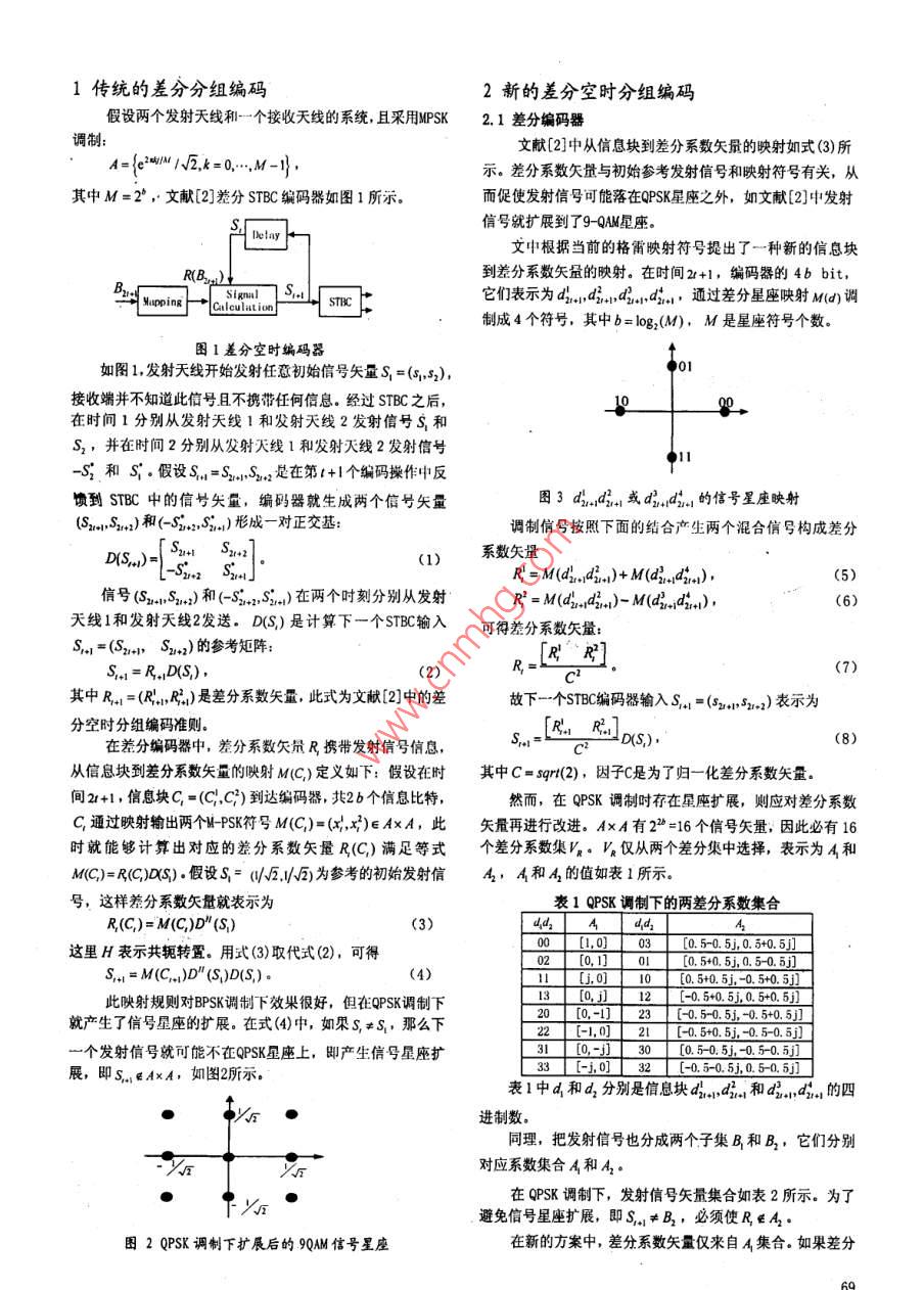 2007年第11期,第40卷通信技術Vol.40,No.11,2007總第191期Communications TechnologyNo. 191, To種新穎的兩天線差分空時分組編碼方案李偉,王宏霞,張玉衛(wèi)(西南交通大學信息安全與國家計算網格實驗室,四川成都610031)【摘要】傳統(tǒng)的差分空時分組編碼( DSTBC)在QPSK調制時存在著信號星座擴展。文中提出了一種在QPSK調制下新穎的兩發(fā)射天線差分空時分組編碼方策,此方案提供了一定的編碼增益,同時也解決了星座擴展問題。在新方案中,改進了從信息塊到系數矢量的映射,從而使其性能與相干空時分組編碼相比大約只差1dB.同時新方象編碼相對簡單,在接收端也具有低的解瑪復雜度【關鍵詞】發(fā)射分集;差分檢測;差分空時分組編碼;星座擴展【中圖分類號】TN911.22【文獻標識碼】A【文章編號】1002-0802(2007)11-0068-03A New Differential Space-Time Block Coding Schemewith two Transmit antennasLI Wei, WANG Hong-xia, ZHANG Yu-wei(Lab. of Information Security and National Computing Grid, Southwest Jiaotong University, Chengdu Sichuan 61003, China)(Abstract] The traditional differential space-time block code(DSTBC)suffers from the signal constellationexpansion for QPSK modulation. In this paper, a new differential space-time block code for QPSK modulation withtwo transmit antennas is proposed, which can offer a differential coding gain without constellation expansion.In this scheme, the mapping from the information blocks to the coefficient vectors is improved. As a result, theperformance is only about ldb away from the coherent STBC. the new encoding is relatively simple, and decodingis achieved with low decoding complexity at the receiver[Key words] transmit diversity: differential detection: DSTBC: constellation expansi0引言確解碼。 Tarokh和 Jafarkhani提出了基于正交設計的兩天近年來,無線通信中的空時編碼迅速發(fā)展。作為移動通線差分空時編碼方案,此方案與傳統(tǒng)的空時分組編碼相信中的一項新技術,空時編碼技術已被納入第三代移動通信比,其性能在高信噪比時有大約3dB的差異,但在QPSK調的標準。制下存在信號星座擴展;后來他們把文獻[2]的兩天線進行然而,大多數空時編碼方案在接收端都需要準確的信道推廣,提出了基于多發(fā)射天線的差分空時分組編碼狀態(tài)信息(CSI)在信道相對符號速率變化緩慢的情況下, Bertrand M Hochwald通過引入一類對角信號提出了一種新接收端可以通過發(fā)射端發(fā)送已知的訓練符號或導頻序列來的差分酉空時編碼"。 Brian L. Hughes提出了一種基于群碼獲得CSI。但在發(fā)射天線數目較多或移動臺高速移動使信道的多天線差分調制方法, Xun Shae引出了一種新的差分空衰落系數變化較快時,接收端就很難進行準確信道估計,有時分組編碼方案,此方案解決了在QPSK調制下的信號星座時甚至根本無法估計。如在第三代歐洲移動通信標準中要求擴展問題,同時還獲得了1~1.5dB的編碼增益。通信終端在時速達500km/h的火車上通信,這將使信道衰文中提出了一種性能更優(yōu)的 DSTBC方案,通過選擇一對落系數快速變化無法進行信道估計。因此不需要信道估計的使所有發(fā)射信號都落在QPSK星座上的差分系數使信號星座空時編碼設計成為了人們關注的焦點擴展問題得到了解決。仿真結果表明此方案的性能比文獻[2]最近,在文獻[2~5]中提出了幾種不同的空時編碼方,中的好15~2dB,比文獻[6]中的好大約1dB同時新方案案,它們都能在不需要信道狀態(tài)信息CSI)的情況下進行準具有低解碼復雜度的優(yōu)點收稿日期:2007-06-18基僉項目:四川省青年科技基金資助項目(編號:072026-004):西南交通大學發(fā)展基金資助項目(編號:200604),作者簡介:李偉(1982-),男,碩士研究生,主要從事差分空時編碼、M-ΦFDM、移動空中接口方面的研究工作:王宏霞(1973-),女,教授,博士生導師,主要從事保密通信、信息隱藏、多媒體處理技術方面的研究工作;張玉衛(wèi)(1981-),男,碩士研究生,主要從事MI系統(tǒng)的空吋編碼、信道編碼方面的研究工作1傳統(tǒng)的差分分組編碼2新的差分空時分組編碼假設兩個發(fā)射天線和個接收天線的系統(tǒng),且采用MPSK2.1差分編碼器調制:文獻[2]中從信息塊到差分系數矢量的映射如式(3)所A={ew/√2,k=0,示。差分系數矢量與初始參考發(fā)射信號和映射符號有關,從其中M=2°,文獻[2]差分STBC編碼器如圖1所示而促使發(fā)射信號可能落在QPSK星座之外,如文獻[2]中發(fā)射信號就擴展到了9QAM星座文中根據當前的格雷映射符號提出了一種新的信息塊到差分系數矢量的映射。在時間2+1,編碼器的4bbitYapping它們表示為al,a2t,t3.,d2,通過差分星座映射Md)調制成4個符號,其中b=log(M),M是星座符號個數。圖1差分空時編碼器如圖1發(fā)射天線開始發(fā)射任意初始信號矢量S1=(51,52),●01接收端并不知道此信號且不攜帶任何信息。經過STBC之后在時間1分別從發(fā)射天線1和發(fā)射天線2發(fā)射信號S和S2,并在時間2分別從發(fā)射天線1和發(fā)射天線2發(fā)射信號●11S2,和S.假設S,=S2,S2是在第t+1個編碼操作中反頃到STBC中的信號矢量,編碼器就生成兩個信號矢量圖3ad.,d2l或d,d,的信號星座映射(S1,S)和(-S2S}n)形成一對正交基:調制信號按照下面的結合產生兩個混合信號構成差分D(S)=(1)系數矢量R=M(dl,42)+M(d-,dt,),信號(S21,S2)和(-S23S)在兩個時刻分別從發(fā)射R=M(d,2)-M(d-,d1)天線1和發(fā)射天線2發(fā)送,D(S)是計算下一個STBC輸入可得差分系數矢量:S,=(S2,S2+2)的參考矩陣:R RS,1=R D(S),其中R1=(RR2