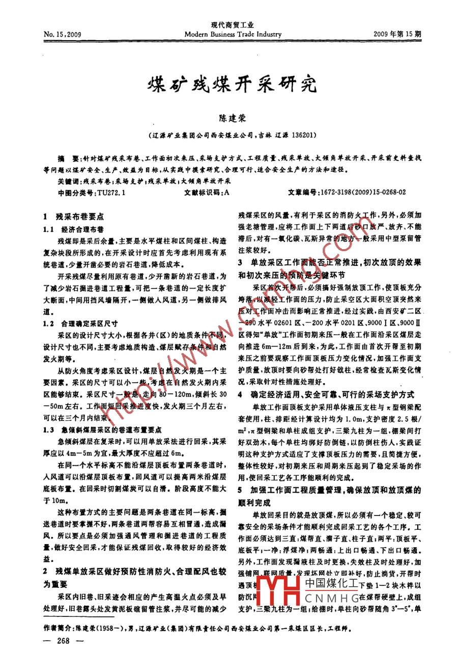 現(xiàn)代商貿(mào)工業(yè)No. 15 ,2009Modern Business Tradc Industry2009年第15期,煤礦殘煤開采研究陳建榮(遼源礦業(yè)集團公司西安煤業(yè)公司,吉林遼源136201)摘要:針對煤礦殘采布巷、工作面初次來壓、采場支護方式、工程質(zhì)量、殘采單放、大傾角單放開采、開采前史料查找等問題以煤礦安全、生產(chǎn)、效益為目標,從實踐中摸索研究、合理可行、適合安全生產(chǎn)的方法和途徑。關(guān)鍵詞:殘采布巷;采場支護;殘采單放;大傾角單放開采中圖分類號:TU272. 1文獻標識碼:A文章編號:1672-3198<2009)15 -0268-021殘采布巷要點殘煤采區(qū)的風(fēng)量,有利于采區(qū)的消防火工作,另外,必須加1.1經(jīng)濟合理布巷強老塘管理,應(yīng)將工作面上下兩道后砂口放嚴、放齊、不能殘煤即是采后余量,主要是水平煤柱和區(qū)間煤柱、構(gòu)造滯后,對有一氧化碳、瓦斯異常的地方一般采用中型泵留管復(fù)雜塊段所形成的,在開采設(shè)計時應(yīng)首先考慮利用現(xiàn)有系注漿較好。統(tǒng)巷道,少量開鑿必要的巖石巷道,降低成本。3單放采區(qū)工作面能否正常推進,初次放頂?shù)男Ч_采殘煤盡量利用原有巷道,少開鑿新的巖石巷道,為和初次來壓的預(yù)防是關(guān)鍵環(huán)節(jié)了減少巖石掘進巷道工程量,可把- -條巷道的一-定長度擴采區(qū)首次開幫后,必須搞好強制放頂工作,使頂板充分大斷面,中間用擋風(fēng)墻隔開,一側(cè)做入風(fēng)道,另一側(cè)做排風(fēng)垮落 ,以減輕工作面的壓力,防止采空區(qū)大面積空頂突然來壓對工作面沖擊而影響正常推進,經(jīng)過實踐,由西安礦二區(qū)1.2 合理確定采區(qū)尺寸-290水平02601區(qū).一200水平0201區(qū)、9000I區(qū)、9000I采區(qū)的設(shè)計尺寸大小,根據(jù)各井(區(qū))的地質(zhì)條件不同,區(qū)得知“單放"工作面初期來壓- -般在工作面沿采區(qū)煤層走設(shè)計尺寸也不同,主要考慮地質(zhì)構(gòu)造、煤層賦存條件和自然向推進6m- -12m 后到來,為此,工作面由首次開幫至初期發(fā)火期等.來壓之前要觀察工作面頂板壓力變化情況,加強工作面支從防火角度考慮采區(qū)設(shè)計,煤層自然發(fā)火期是一個主護質(zhì)量,放頂時要向砂幫處打好戧柱,經(jīng)常檢查瓦斯變化情要因素。采區(qū)的尺寸可以小一些,考慮在自然發(fā)火期內(nèi)采況,采取針對性措施 處理好。區(qū)能夠結(jié)束.采區(qū)尺寸一般是:走向80- 120m,傾斜長304確定經(jīng)濟適 用、安全可靠.可行的采場支護方式- 50m左右。工作面短回采推進度快,發(fā)火期三個月左右,單放工作面頂板支護采用單體液壓支柱與π型鋼梁配可以在三個月內(nèi)結(jié)束.套使用,柱.排距經(jīng)計算設(shè)計均為1.0m,支護密度2.5根/1.3危傾斜煤層采區(qū)的巷道布置要點m2 ,π型鋼粲和單柱成組支護,三梁九柱為一組,棚梁間打急傾斜煤層在復(fù)采時.可以用單放采法進行回采,其采好雙勁木,每個 單柱均綁好防倒鏈,以防倒柱傷人,實踐證厚應(yīng)以4m- 5m為宜,最大厚度不應(yīng)超過6m.明這種支護方式適應(yīng)了支撐頂板壓力的需要,且簡捷方便,在同一個水平標高不能沿煤層頂板布置兩條巷道時,整體性較好,對初期來壓和周期來壓起到了穩(wěn)定采場的作入風(fēng)道可以沿煤層頂板布置,回風(fēng)道可以提高兩米沿煤層用,使回采工藝各工序能順利的完成。底板布置.在回采時切制煤炭可以自滑.階段高度不能大5加強工作面工程質(zhì)量管理,確保放 頂和放頂煤的于10m,順利完成這種布置方式的主要向題是兩條巷道在同一標高,掘單放回采目的就是放頂煤,所以必須有一個穩(wěn)定、較可送巷道時要掌握不好,兩條巷道兩幫容易互相冒通,造成漏靠安全的采場條件才能順利完成回采工藝的各個工序。工風(fēng).所以要點是必須加強通風(fēng)管理和掘進巷道的工程質(zhì)作面必須達到三直:煤幫直.溜子直、柱子直;兩平:頂板平、量,做好安全回采,才能保證殘煤回收,取得較好的經(jīng)濟效底板平;一凈:浮煤凈;兩暢通:上出口暢通.下出口暢通.另外,工作面發(fā)現(xiàn)漏液柱及時更換,失效柱及時處理好,加.2殘煤單放采區(qū)做好預(yù)防性消 防火、合理配風(fēng)也較強鋪網(wǎng)聯(lián)網(wǎng)質(zhì)量.發(fā)理壞網(wǎng)外立即補好,防止淌貨,開幫時為重要遇頂中國煤化工下墊1-2塊木樺以采區(qū)內(nèi)舊巷、舊采跡會相應(yīng)的產(chǎn)生高溫火點必須及早防沉網(wǎng)|YHCNMHG在煤幫硬壁上,成組處理好,舊巷露頭處發(fā)黃泥板碹留管注漿,并盡可能的減少支護,三聚九柱為一組;給棚時 ,單柱向砂幫隨角3°-5",單作者簡介:陳建榮(1958-),男,遼源礦亞(集團)有限責(zé)任公司西安煤業(yè)公司第一采煤區(qū)區(qū)長,工程師。一268一現(xiàn)代商貿(mào)工業(yè)No. 15 ,2009Modern Business Trade Industry2009年第15期柱上尺上線,確保初撐力達到90KN以上,乳化液泵站出口第三種方法其實與第二方法相同,是在第二種方法的壓力不小于15MPa.放頂時,向砂幫打好戧柱以防悠棚,放基礎(chǔ)上通過生產(chǎn)實踐進行改進 ,適合于40m以上較長的單頂煤時不準超過頂板線,發(fā)現(xiàn)砂幫頂板超前工作面頂板冒放工作面 ,工作面溜子有過渡段,可以上(或下)邊開幫,下落,立即停止放頂煤處理好。放頂煤時,工作面砂幫出現(xiàn)空(或上)邊放煤。頂時必須強制放頂,以減少工作面的