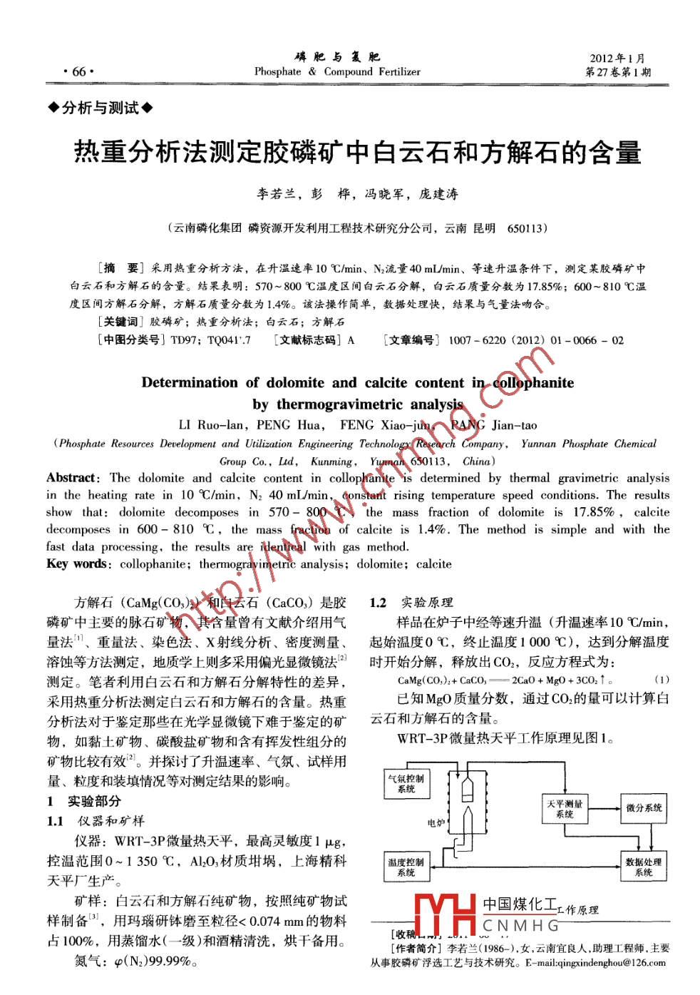 褲肥與復(fù)肥2012年1月Phosphate Compound Fertilizer第27卷第1期◆分析與測試◆熱重分析法測定膠磷礦中白云石和方解石的含量李若蘭,彭樺,馮曉軍,龐建濤(云南磷化集團磷資源開發(fā)利用工程技術(shù)研究分公司,云南昆明650113)[摘要]采用熱重分析方法,在升溫速率10℃min、N流量40mL/min、等速升溫條件下,測定某膠磷礦中白云石和方解石的含量。結(jié)果表明:570~800℃溫度區(qū)間白云石分解,白云石質(zhì)量分?jǐn)?shù)為1785%;600~810℃溫度區(qū)間方解石分解,方解石質(zhì)量分?jǐn)?shù)為14%。該法操作簡單,數(shù)據(jù)處理快,結(jié)果與氣量法吻合。關(guān)鍵詞]膠磷礦;熱重分析法;白云石;方解石[中圖分類號]TD97;TQ041∵7[文獻標(biāo)志碼]A[文章編號]1007-6220(2012)01-0066-02Determination of dolomite and calcite content in collophaniteby thermogravimetric analysisLI Ruo-lan, PENG Hua, FENG Xiao-jun, PANG Jian-taoPhosphate Resources Development and Utilization Engineering Technology Research Company, Yunnan Phosphate ChemicalGroup Co., Lud, Kunming, Yunnan 650113, China)Abstract The dolomite and calcite content in collophanite is determined by thermal gravimetric analysisin the heating rate in 10 C/min, N2 40 mL/min, constant rising temperature speed conditions. The resultsshow that: dolomite decomposes in 570-800C, the mass fraction of dolomite is 17.85albiten600-810℃nass fraction of calcite is 1. 4%. The method is simple and with thefast data processing, the results are identical with gas methodKey words: collophanite; thermogravimetric analysis; dolomite; calcite方解石(CaMg(CO3)2)和白云石(CaCO3)是膠12實驗原理磷礦中主要的脈石礦物,其含量曾有文獻介紹用氣樣品在爐子中經(jīng)等速升溫(升溫速率10℃/min,量法、重量法、染色法、X射線分析、密度測量、起始溫度0℃,終止溫度1000℃),達到分解溫度溶蝕等方法測定,地質(zhì)學(xué)上則多采用偏光顯微鏡法?時開始分解,釋放出CO2,反應(yīng)方程式為測定。筆者利用白云石和方解石分解特性的差異CaMg(CO)2+CaCO3=2CaO+MgO+3CO2↑。采用熱重分析法測定白云石和方解石的含量。熱重已知MgO質(zhì)量分?jǐn)?shù),通過CO2的量可以計算白分析法對于鑒定那些在光學(xué)顯微鏡下難于鑒定的礦云石和方解石的含量。物,如黏土礦物、碳酸鹽礦物和含有揮發(fā)性組分的WRT-3P微量熱天平工作原理見圖1。礦物比較有效2。并探討了升溫速率、氣氛、試樣用量、粒度和裝填情況等對測定結(jié)果的影響。氣氛控制系統(tǒng)1實驗部分微分系統(tǒng)1.1儀器和礦樣系統(tǒng)電爐儀器:WRT-3P微量熱天平,最高靈敏度1Hg,控溫范圍0~1350℃,A2O3材質(zhì)坩堝,上海精科溫度控制數(shù)據(jù)處理天平廠生產(chǎn)。礦樣:白云石和方解石純礦物,按照純礦物試中國煤化工工作原理樣制備3,用瑪瑙研缽磨至粒徑<0.074mm的物料CNMHG占100%,用蒸餾水(一級)和酒精清洗,烘干備用[作者簡介]李若蘭(1986-),女,云南宜良人,助理工程師,主要氮氣:q(N2)99.99%。從事膠磷礦浮選工藝與技術(shù)研究。E- mail: qingxindenghou@126com2012年第27卷第1期李若蘭等熱重分析法測定膠磷礦中白云石和方解石的含量67儀器由天平測量系統(tǒng)、微分系統(tǒng)和溫度控制系2.2白云石、方解石純礦物分解溫度的測定統(tǒng)組成,輔之以氣氛單元和冷卻風(fēng)扇,測量結(jié)果由將制備好的礦樣放入爐子,按分析步驟的方法計算機數(shù)據(jù)處理系統(tǒng)處理。進行測定,生成TG曲線,見圖2、圖31.3分析步驟首先確認(rèn)天平各線路連接正確,儀器校準(zhǔn)后按電爐、氣氛單元、天平單元、數(shù)據(jù)接口單元、計算機的順序開啟設(shè)備,同時通N2,預(yù)熱20~30min首先調(diào)零;打開電爐,放入礦樣,稱量(一般為2~5mg);稱量后,執(zhí)行計算機采樣軟件設(shè)置溫001000020006080100度,起始溫度必須設(shè)為0℃,結(jié)束溫度根據(jù)測試設(shè)圖2白云石純礦物TG曲線圖3方解石純礦物TG曲線置,升溫速率設(shè)為10℃/min;進行“參數(shù)設(shè)置由圖2可看出,0~570℃曲線平直,白云石沒設(shè)置樣品名稱和質(zhì)量;再設(shè)置一個采樣始溫,進行有發(fā)生熱分解;570~800℃,TG曲線出現(xiàn)臺階測試;升溫結(jié)束后,點擊熱分析控制屏上的“停失重現(xiàn)象明顯,白云石分解,釋放CO。止”按鈕,最后點“返回”鍵,執(zhí)行計算機“數(shù)據(jù)由圖3可看出,0~600℃時,TG曲線平直,處理”軟件,對數(shù)據(jù)進行處理。測試完畢,退出程方解石無分解;600~810℃失重現(xiàn)象明顯,TG曲序線出現(xiàn)臺階,方解石分解,釋放CO2。2實驗結(jié)果和討論2、3某膠磷礦礦樣測定21測試條件的選擇測定步驟同22節(jié),TG曲線見圖4。211升溫速率的確定升溫速率是對TG曲線測定影響最大的因素升溫速率越大,溫度滯后越嚴(yán)重;開始分解溫度及終止分解溫度越高,溫度區(qū)間也越寬。一般進行熱重法測定不要采用太高的升溫速率,對傳熱差的高分子物試樣升溫速率一般用5~10℃/min,對傳熱0I000好的無機物、金屬試樣升溫速率可用10~20℃/圖4云南某膠磷礦TG曲線min,進行動力學(xué)分析試樣的升溫速率還要低由圖4可看出,溫度在0~547℃,TG曲線平些。本臺儀器升溫速率范圍是5-20℃min。針對直;547~710℃失重現(xiàn)象明顯,TG曲線出現(xiàn)臺該礦樣,進行了升溫速率為5、10、15℃/min的條階,釋放CO2,w(CO2)為9.14%。件實驗。結(jié)果表明:設(shè)置為5℃/min時,TG曲線已知化學(xué)法分析測定,v(Mg0)3.89%,根據(jù)分辨率