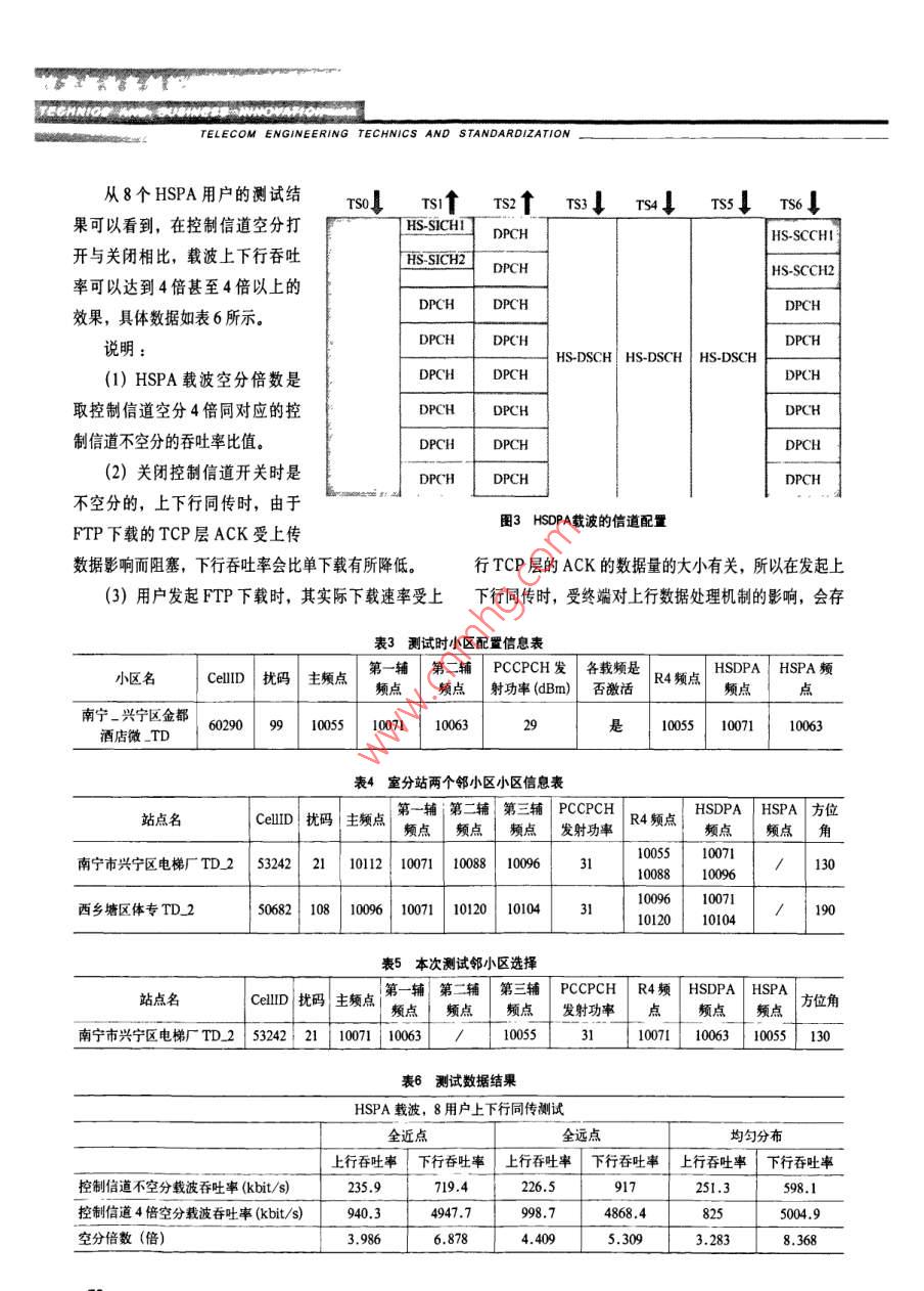 電值工程技術(shù)與標(biāo)灌化TD-HSPA控制信道空分復(fù)用技術(shù)創(chuàng)新應(yīng)用刁兆坤(中國(guó)移動(dòng)通信集團(tuán)設(shè)計(jì)院有限公司,北京100080)摘要TD- SCDMA系統(tǒng)對(duì)于要支持4倍空分復(fù)用功能需至少配置相應(yīng)4對(duì)數(shù)的HS-ScCH/HS-SICH控制信道,這使得HSPA帶寬降低或接入用戶數(shù)下降,影響HSPA業(yè)務(wù)信道空分復(fù)用的效果容量。為此,提出了控制信道空分復(fù)用技術(shù),它有效的解決了該問(wèn)題關(guān)鍵詞空分復(fù)用;幀分復(fù)用;吞吐量;隔離度中圖分類號(hào)TN929.5文獻(xiàn)標(biāo)識(shí)碼A文章編號(hào)1008-5599(2011)03-0069-061HsPA控制信道空分復(fù)用技術(shù)引入背景從技術(shù)原理上來(lái)看,TD- SCDMA HSPA控制信道空分復(fù)用技術(shù)可同時(shí)應(yīng)用于室內(nèi)、室外兩種環(huán)境,具在TD- SCDMA三期建設(shè)中已經(jīng)逐步引入了對(duì)體如下HSPA業(yè)務(wù)信道空分技術(shù),在不需要對(duì)系統(tǒng)和終端進(jìn)行21室內(nèi)場(chǎng)景修改的前提下,可成倍提高系統(tǒng)的多用戶吞吐量。隨著目前,TD- SCDMA網(wǎng)絡(luò)室內(nèi)小區(qū)中,以商務(wù)寫(xiě)字HSUPA的引入與復(fù)用倍數(shù)提升,用戶數(shù)面臨DPCH數(shù)樓及大廈為核心,小區(qū)話務(wù)量相對(duì)較高,HSPA用戶相量受限。在這樣的背景下,HSPA控制信道空分技術(shù)應(yīng)對(duì)密集,多用戶同時(shí)下載或上傳速率會(huì)偏低,用戶體驗(yàn)運(yùn)而生,該技術(shù)可解決伴隨信道受限的問(wèn)題,達(dá)到吞吐較差,為了解決上述問(wèn)題,采用空分技術(shù),有效地提高量和用戶容量的平衡小區(qū)吞吐量,使小區(qū)吞吐量成倍增加,多用戶同時(shí)下載或上傳速率高,改善用戶感知。2 TD-SCDMA HSPA控制信道空分復(fù)用技術(shù)原理在室內(nèi)覆蓋的情況下,對(duì)于不同的樓層使用不同的通道進(jìn)行覆蓋,利用室內(nèi)樓板構(gòu)成用戶間天然的隔離,控制信道空分復(fù)用技術(shù)用于對(duì)HSPA的控制信道的利用TD- SCDMA HSPA控制信道空分復(fù)用算法,實(shí)空分復(fù)用,其基本原理跟HSPA空分復(fù)用技術(shù)原理相同,現(xiàn)用戶間頻率、時(shí)隙和碼道等無(wú)線資源的重用,提高系主要是空分多址,是利用空間隔離將用戶分割構(gòu)成不同統(tǒng)吞吐能力。室內(nèi)TD- SCDMA HSPA控制信道空分的通道,根據(jù)用戶在不同通道上的狀態(tài),計(jì)算用戶間的復(fù)用技術(shù)原理如圖1所示。隔離度,選擇隔離度足夠大的用戶實(shí)現(xiàn)控制信道碼資源22室外場(chǎng)景的復(fù)用,從而提高系統(tǒng)接入用戶的能力。在室外宏蜂窩覆蓋場(chǎng)景下,利用智能天線的波束賦收稿日期:2011-01-06TECHNIcs AND BushTELECOM ENGINEERING TECHNICS AND STANDARDIZATION形功能,在不同用戶間形成的空間隔離基礎(chǔ)吸頂天線上,利用TD- SCDMA HSPA控制信道空分復(fù)用算法,實(shí)現(xiàn)用戶間頻率、時(shí)隙和碼道等光纖無(wú)線資源的重用,提高系統(tǒng)吞吐能力。室外控制信道空分復(fù)用原理如圖2所示。理論上當(dāng)兩個(gè)用戶的來(lái)波方向的偏離大settAt L于隔離度要求時(shí),可以對(duì)這兩個(gè)用戶進(jìn)行空DwIN LrTS分。但實(shí)際上由于室外實(shí)際環(huán)境的復(fù)雜性、圖1室內(nèi)TD- SCDMA HSPA控制信道空分復(fù)用技術(shù)原理圖波瓣旁瓣于擾,隔離度估計(jì)精度、信道變化速度等原因,易導(dǎo)致錯(cuò)誤的觸發(fā)空分,建議暫不使用。3信道配置以系統(tǒng)上下行時(shí)隙配置為2:4,且HSUPA/ HSDPA共存的典型配置為例對(duì)于HSPA載波,典型配置中上下行各圖2室外TD- SCDMA HSPA控制信道空分復(fù)用技術(shù)原理圖配置一個(gè)控制時(shí)隙,如果要支持業(yè)務(wù)信道4倍重空分,則一個(gè)TT最少需要同時(shí)調(diào)度4個(gè)用戶。裹1開(kāi)啟4倍速業(yè)務(wù)信道空分復(fù)用,不開(kāi)啟控制信道空分的信道配置如果 HS-SCCH、Hs-sCH、E-AGCH不支持下行上行上行下行下行下行下行空分復(fù)用,則需要同時(shí)配置4條HSsc,4條1mw| TS3 TS4 TSS TSHS-SICH和4條E-AGCH信道,可以看出此時(shí)RUCCHDPCHE-AGCHHS-SICH根本無(wú)法再分配下行伴隨信道,也不可能支持業(yè)務(wù)DPCH E-AGCHTHS-SICH信道4倍重空分。如果需要配置下行伴隨信道,信DPCHE-AGCHHS-SICH ICH E-AGCH道配置如表1所示,過(guò)多的控制信道開(kāi)銷(xiāo)不僅擠占DPCHHS-SCCH伴隨DPCH資源,還將擠占 HS-PDSCH資源池DPCHDPCHHS-SCCH的資源,將降低 HSDPA的系統(tǒng)容量。DPCHFPACH HS-SCCH為了節(jié)省空分HSPA條件下的控制信道開(kāi)銷(xiāo),DPCHE-HICH HS-SCCH有必要對(duì)HS-SCCH/HS-SICH、E-AGCH信道進(jìn)行空分復(fù)用。開(kāi)啟控制信道4倍空分后HSPA載波的對(duì)概率越小,單用戶性能越優(yōu),反之該值越小,配對(duì)概典型配置如表2所示。率越大,用戶間干擾越大,單用戶性能惡化,因此隔離度門(mén)限的設(shè)置需要綜合整個(gè)小區(qū)的吞吐量、控制信道的4隔離度的設(shè)置BLER值、用戶解調(diào)性能需求因素和業(yè)務(wù)信道的隔離度取值來(lái)設(shè)置。目前HSPA業(yè)務(wù)信道空分復(fù)用的隔離度設(shè)隔離度的設(shè)置影響用戶的配對(duì)概率,值越大,配置值一般是10~15dB,控制信道空分復(fù)用的隔離度根電工程技術(shù)與標(biāo)準(zhǔn)化據(jù)不同的廠家策略