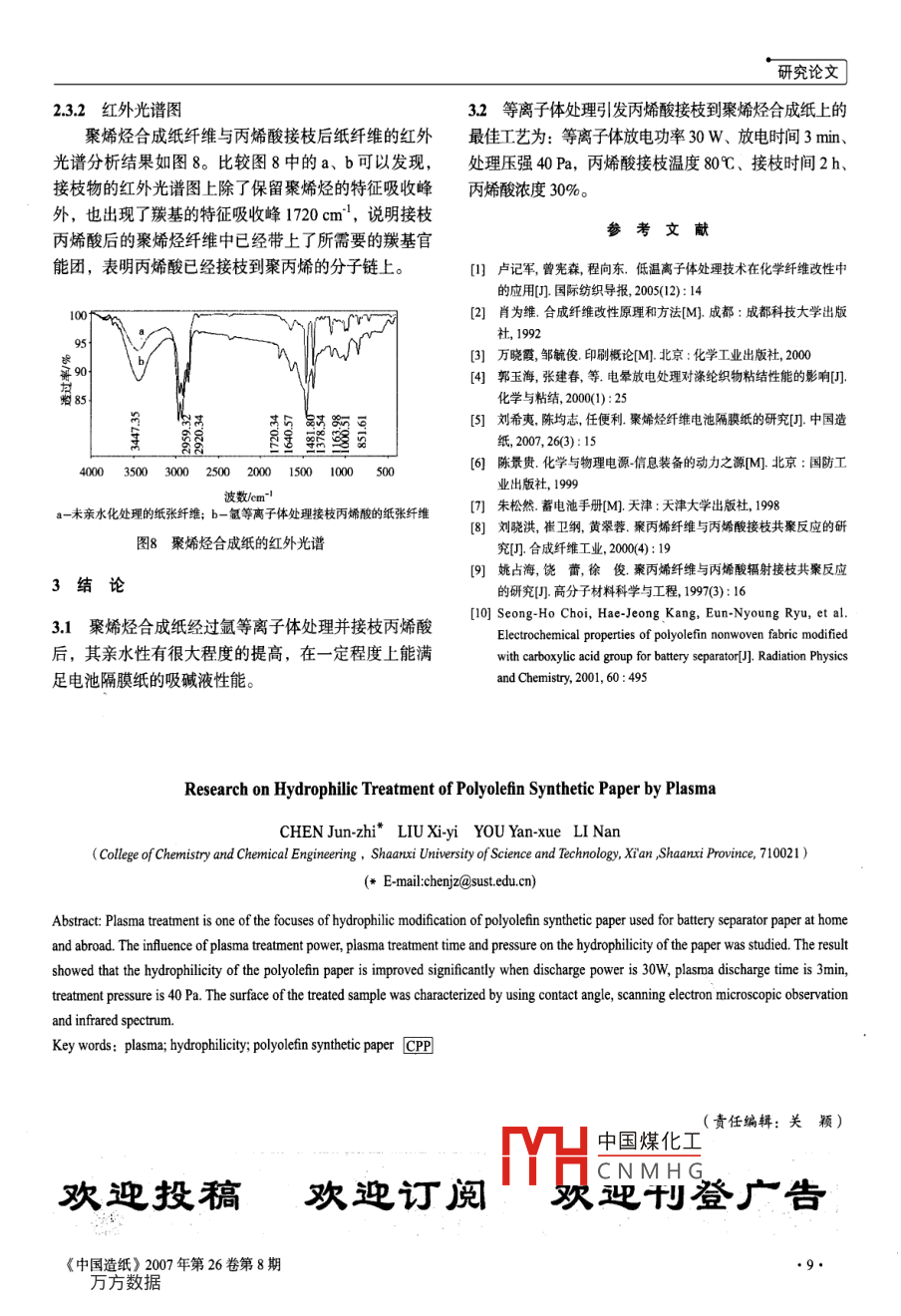 [研究論文●等離子體●等離子體親水處理聚烯烴合成紙的研究陳均志劉希夷尤艷雪李楠(陜西科技大學(xué)化學(xué)與化工學(xué)院,陜西西安,710021)摘要: 重點(diǎn)研究了等離子體處理對紙張親水性能的影響,發(fā)現(xiàn)在等離子體放電功率30 W.放電時(shí)間3 min 處理壓強(qiáng)40 Pa時(shí)紙張的親水性有很大提高;并通過接觸角測定、掃捕電鏡、紅外光譜圖對接枝樣品的表面進(jìn)行了表征。關(guān)鍵調(diào):等離子體;親水性;聚蠕烴合成紙國中圈分類號: TS76文獻(xiàn)標(biāo)識碼: A文章編號: 0254-50808-0006-04等離子體改性是一種1.2 實(shí)驗(yàn)方法氣固相干法處理聚合物的采用等離子體氣體發(fā)生器對經(jīng)手工抄片成形的紙作者簡介:陳均志先生,新方式,具有快速、高效、樣進(jìn)行親水化處理。將紙樣置于等離子體發(fā)生器的氣教授;主要從事輕化工材無污染、操作簡單、節(jié)省室中,啟動真空泵,將氣室中的真空度降到- -定程度,料、助劑的開發(fā)和研究工能源等優(yōu)點(diǎn),反應(yīng)僅涉及通人工作氣體并控制- -定的流量, 同時(shí)啟動電源,激作。纖維100nm內(nèi)的淺表面,發(fā)等離子體,對紙樣進(jìn)行處理。關(guān)閉電源,取出樣品。不改變聚合物的性能而可賦予聚合物新的特性。但等把處理后的紙樣放人一定溫度、一定濃度的丙烯酸水離子體處理需要在真空狀態(tài)下進(jìn)行,因此要求相當(dāng)大溶液中反應(yīng),取出紙樣,用水洗去殘余的丙烯酸,再的真空裝置,這提高了設(shè)備的投資,但對- -些高性能 、用沸水煮3h,最后在60心的烘箱中烘干備用。特殊使用要求的材料進(jìn)行處理,仍是- -種有效的方法。1.3檢測方法等離子體對纖維的表面處理主要發(fā)生3種作用:蝕吸堿率、電解液保留率(簡稱保留率)和吸堿高刻、表面交聯(lián)和引入極性基團(tuán)。等離子體通常含有高度的測定見參考文獻(xiàn)[5]。能態(tài)的粒子,當(dāng)這些高能態(tài)粒子作用到聚烯烴纖維上吸水率的測定方法:準(zhǔn)卻稱取上述改性纖維以及時(shí),會產(chǎn)生加熱、刻蝕以及自由基反應(yīng)"。通過這些未改性纖維各0.2g.攤鋪于表面皿上,放人濕度為作用可引入暫時(shí)性親水性基團(tuán),但是這些親水性基團(tuán)95%以上的養(yǎng)護(hù)室內(nèi), 24 h后取出,迅速稱量,計(jì)算容易消失,為了長久保持紙張的親水性能,常采用在吸水率。吸水率=100% x(吸水后纖維質(zhì)量-干燥纖等離子體處理之后,將具有親水性的單體(如丙烯酸)維質(zhì)量)y千燥纖維質(zhì)量。接枝到紙張纖維上24。本研究重點(diǎn)探討了氬等離子2結(jié)果與討論體親水化處理聚烯烴合成紙。由于氬氣是非反應(yīng)性氣體,該氣體原子不直接進(jìn)人高聚物材料表面的大分子2.1等離子體處理對紙張性能的影響鏈中,不會對高分子主體的性質(zhì)產(chǎn)生本質(zhì)的影響。(1)等離子體放電功率對紙張性能的影響不同等離子體放電功率對紙張性能的影響如圖1。1實(shí)驗(yàn)由圖1可知,隨著放電功率的增大,聚烯烴合成紙的1.1實(shí)驗(yàn)原料及儀器吸收性能增大到一定值后開始減小。這是因?yàn)樵龃蠓艑?shí)驗(yàn)原料: PP( 聚丙烯纖維)與ES(聚乙烯1聚丙電功率,紙表面被活化的自由基越來越多,在-定的烯)雙組分纖維復(fù)配的合成紙;丙烯酸為化學(xué)純。反應(yīng)溫度下,它引發(fā)丙烯酸對聚烯烴合成紙的接枝實(shí)驗(yàn)儀器:等離子體發(fā)生器(功率發(fā)射源為SY率增中國煤化工氧基團(tuán),這些基團(tuán)跟型300 W射頻功率源,中科院微電子中心);抗張強(qiáng)水分MYHCNMH G冰的接觸角變小(如度測定儀; JC2000 接觸角測定儀;多媒體光學(xué)顯微鏡; ESCALABMKII型光電子能譜儀;日本JEOL公司JSM-35C型掃描電子顯微鏡。收稿日期: 20.03-14(修改稿)China Pulp & Paper Vol.26, No.8, 2007.6.研究論文}表1所示)。隨著放電功率的進(jìn)-一步增大,紙張吸收升高。這是因?yàn)槠鸪趸罨饔谜紦?jù)主導(dǎo),使纖維表面性能反而減小,這可能是由于帶電粒子能量增大,等引人了大量的極性基團(tuán),降低了聚烯烴合成紙與水的離子體對紙表面的交聯(lián)刻蝕作用占據(jù)了主導(dǎo),導(dǎo)致活接觸角。此后延長放電時(shí)間,降低了丙烯酸對纖維表性基團(tuán)數(shù)量下降,結(jié)果造成聚烯烴合成紙的吸收性能面的接枝率,降低紙張吸收性能。但隨著處理時(shí)間的先升后降的變化趨勢。吸堿高度也是吸堿速率的一個(gè)繼續(xù)增加, 吸收性能又有所提高,這是由于此時(shí)等離反映,而吸堿速率是親水性能好壞的另一個(gè)重要指標(biāo)子體主要發(fā)生刻蝕作用,但是繼續(xù)延長時(shí)間,交聯(lián)刻(67]。電解液保留率越高,說明越有能力吸收足夠的電蝕占據(jù)主導(dǎo),活性基團(tuán)數(shù)量下降,處理效果會隨著時(shí)解液。吸收電解液后形成微孔很細(xì)的隔膜,同時(shí)分布間的推移而變差[89。因此,對紙張吸收性能來說,均勻,有利于防止形成穿透隔膜的電子電導(dǎo)通路。同在適當(dāng)?shù)姆烹姽β氏?,最佳放電時(shí)間為3 min。時(shí)吸收電解液可防止電池隔膜的干涸,增加電池的循(3)等離子體處理壓強(qiáng)對紙張性能的影響環(huán)壽命。綜合考慮認(rèn)為,較佳的等離子體放電功率為不同等離子體處理壓強(qiáng)對紙張性能的影響如圖3。30W。從圖3氬等離