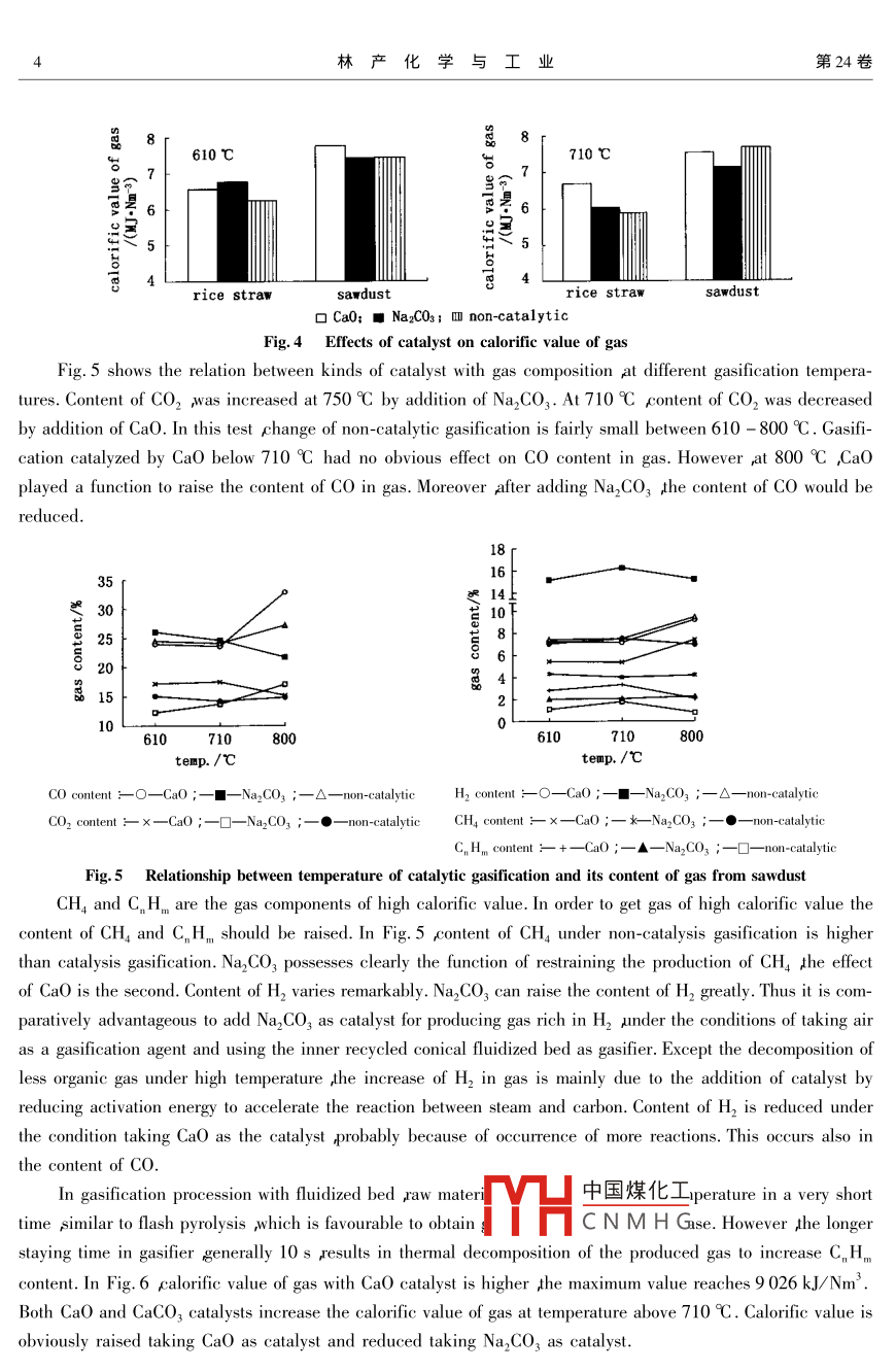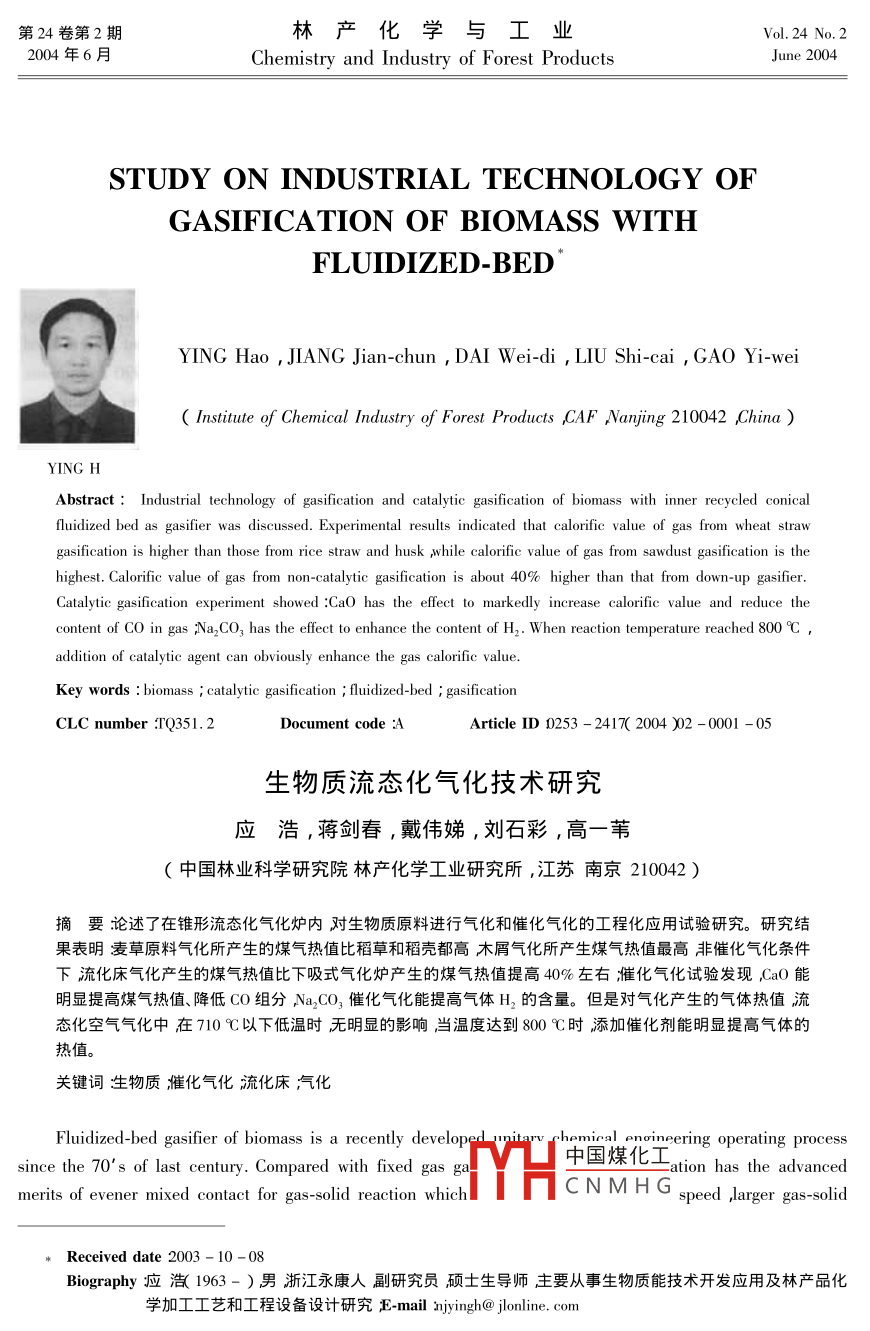 第24卷第2期林產(chǎn)化學(xué)與工業(yè)Vol 24 No. 22004年6月Chemistry and Industry of Forest ProductsJune 2004STUDY ON INDUSTRIAL TECHNOLOGY OFGASIFICATION OF BIOMASS WITHFLUIDIZED-BEDYING Hao, JIANG Jian-chun, DAI Wei-di, LIu Shi-cai, Gao Yi-weiInstitute of Chemical Industry of Forest Products CAF Nanjing 210042 ChinaYING HAbstract: Industrial technology of gasification and catalytic gasification of biomass with inner recycled conicalfluidized bed as gasifier was discussed. Experimental results indicated that calorific value of gas from wheat strawgasification is higher than those from rice straw and husk while calorific value of gas from sawdust gasification is thehighest. Calorific value of gas from non-catalytic gasification is about 40% higher than that from down-up gasifieratalytic gasification experiment showed Cao has the effect to markedly increase calorific value and reduce thecontent of CO in gas Na, CO, has the effect to enhance the content of H,. When reaction temperature reached 800Caddition of catalytic agent can obviously enhance the gas calorific valueKey words: biomass catalytic gasification fluidized-bed gasificationCLCr:TO351.2Document code AArticle ID0253-2417(200402-0001-05生物質(zhì)流態(tài)化氣化技術(shù)研究應(yīng)浩,蔣劍春,戴偉娣,劉石彩,高一葦〔中國(guó)林業(yè)科學(xué)研究院林產(chǎn)化學(xué)工業(yè)研究所,江蘇南京210042)摘要論述了在錐形流態(tài)化氣化爐內(nèi)對(duì)生物質(zhì)原料進(jìn)行氣化和催化氣化的工程化應(yīng)用試驗(yàn)研究。研究結(jié)果表明淩草原料氣化所產(chǎn)生的煤氣熱值比稻草和稻殼都高木屑?xì)饣a(chǎn)生煤氣熱值最高非催化氣化條件下流化床氣化產(chǎn)生的煤氣熱值比下吸式氣化爐產(chǎn)生的煤氣熱值提高40%左右催化氣化試驗(yàn)發(fā)現(xiàn)CaO能明顯提高煤氣熱值、降低CO組分№aC3催化氣化能提高氣體H2的含量。但是對(duì)氣化產(chǎn)生的氣體熱值流態(tài)化空氣氣化中在710℃以下低溫時(shí)無(wú)明顯的影響當(dāng)溫度達(dá)到800℃時(shí)添加催化劑能明顯提高氣體的熱值關(guān)鍵詞泩物質(zhì)滙化氣化流化床汽氣化Fluidized-bed gasifier of biomass is a recently developering operating processsince the 70's of last century. Compared with fixed gas中國(guó)煤化工ation has the advancedmerits of evener mixed contact for gas-solid reaction whichCNMHGeed larger gas-solidReceived date 2003-10-0sBiography痖溦1963-)男浙江永康人副研究員碩士生導(dǎo)師主要從事生物質(zhì)能技術(shù)開發(fā)應(yīng)用及林產(chǎn)品化學(xué)加工工藝和工程設(shè)備設(shè)計(jì)研究衛(wèi)mailinjyingh@jlonline.com林產(chǎn)化學(xué)與工業(yè)contact area evener reaction temperature higher heat transfer coefficient higher reaction intensity of unit areaeasier operation controls shorter stay time of the reaction material in the reaction devices greater productioncity lower operation temperature and higher gasified calorific value than fixed bed gasifier -2] In recentyears researches have been paid attention to fluidized-bed technology deeplyRecycled fluidized-bed and pressure fluidized-bed have been developed respectively by researchers ofUSA, Britain Sweden Japan , India ,Germany Spain Belgium ,New Zealand Canada etc. Some of these tech-nologies have been applied in industry.The application technologies of biomass gasification have been developed in China since the 80s of lastcentury. Specially gasification system for civil cooking gas fuel have been spread in development area of ruralvillages. The gasifier that has been applied mainly is the fixed bed gasifier 51. Early in the 1990s,domesticresearches on gasification technology of recycled fluidized-bed had been carried out. However, gasificationtechnology of biomass in our country is still not advanced and the scale is small. Today reports on research ofcatalytic gasification and its industrial application are rare b.The purpose of this research is to investigate engineering adaptability of fluidized-bed gasifier designed byus using forestry residue and agriculture residue( such as sawdust straw ,rice husk etc. )as materials. Theresults of gasification experiment are discussed in this paperExperimental1.1 Raw materialsPulverizer was used to smash raw materials into granules smaller than 5 mm with the following indicescalorific values of wheat straw rice straw rice husk sawdust are 17 757, 16 317, 16 649 and 18784 kJ/krespetively the content of water( dry base )are 9.7%0 14 0% 11 5% and 13. 2% respectively1.2 Gasificationdesi technical process nner recycled fluidized bed and other equipment of biomass gasification system were1. 3 Analysis of gasGas was analyzed with a gas chromatography apparatus at testing place4 Choice of catalystsIn experiment choice of catalysts is very important. Based on laboratory test, CaO and Na, CO,werechosen as catalysts because of their good catalytic effect feasible nature and economy of industry application2 Results2.1 Gasification experimentGasification feature of sawdust rice straw heat straw and rice husk was respectively investigated. Duringthe trial processing of gasification temperature of gasification reaction was controlled by adjusting the amount ofair flow and the speed of adding raw material. Composition of gas flowing out from the gasification system wanalyzed. For different raw materials the selected feasible catalystdded into raw material before sendinto gasifier Sawdust or rice and wheat straw smashed into si中國(guó)煤化工5mm) were mixed withthe catalyst fully and evenly then they were constantly sentCNMHGgiven air flow amountwhen temperature of gasifier arrived at 600C. They were dried and decomposed quickly to carry out reactionto produce the gases such as CO, H, o,, Ha C, Hmetc2. 2 Influence