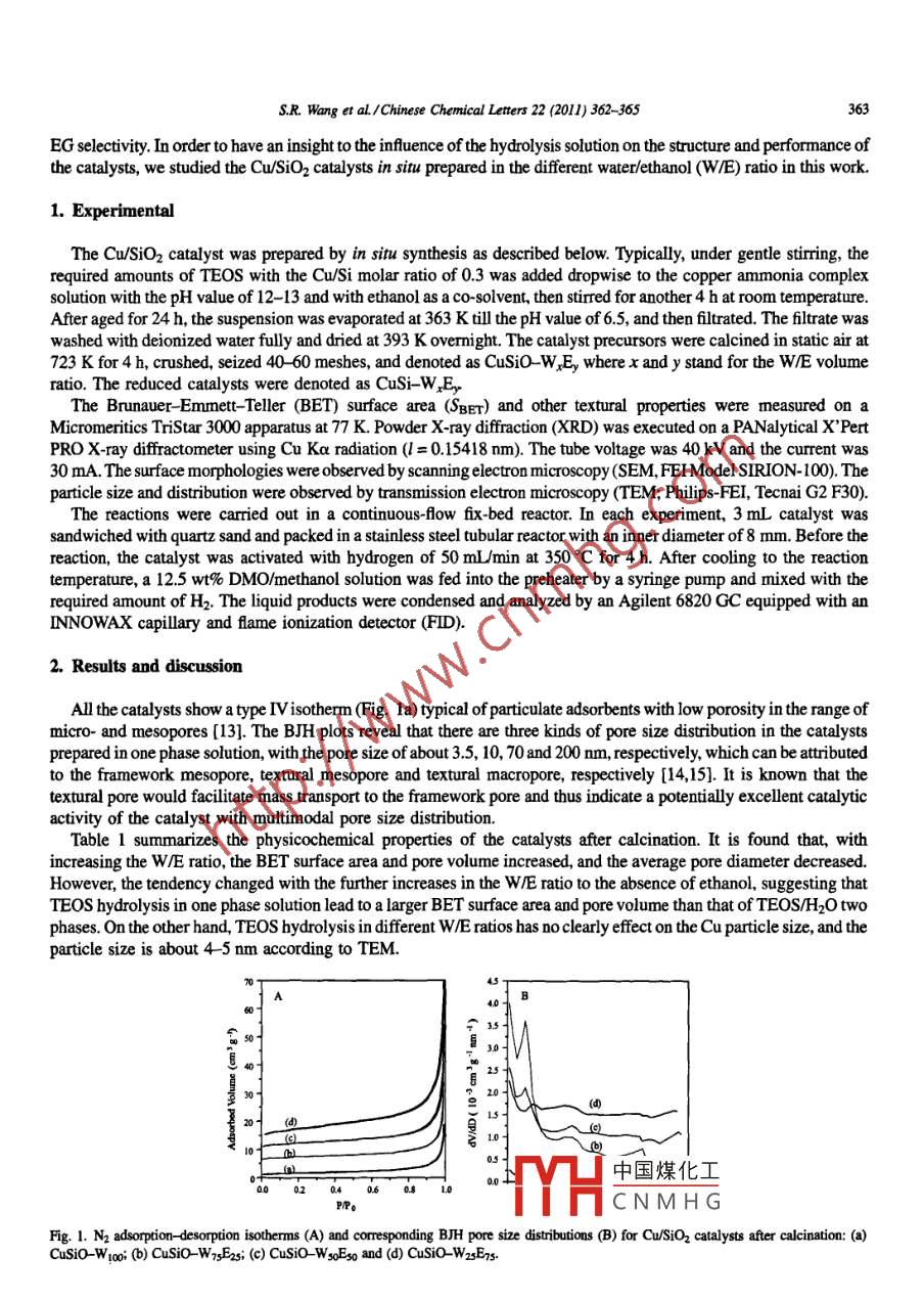 Availableonlineatwww.sciencedirect.coCHINESE° Science DirectCHEMICALLETTERSELSEVIERhinese Chemical Letters 22(2011)362-365www.elsevier.com/locate/ccletEffects of ethanol on the in situ synthesized Cu/Sio2 catalystTexture, structure, and the catalytic performance in hydrogenationdimethyl oxalate to ethylene glycolShu rong Wang", Ling Jun Zhu, Ying Ying Zhu, Xiao Lan Ge, Xin Bao LiState Key Laboratory of clean Energy Unilization, Zhejiang University, Hangzhow 310027, ChinaReceived 21 June 2010Available online 22 December 2010AbstractThe Cu/SiO catalysts were in situ synthesized by the hydrolysis of tetraethyl orthosilicate (TEOS)in one phase solution usingethanol as co-solvent or TEOS/H2o two phases solution, followed by the precipitation of copper on Sio2 by ammonia evaporation.In the hydrogenation of dimethyl oxalate, the catalyst prepared by one phase hydrolysis exhibited higher activity and ethyleneglycol (EG)selectivity at lower temperature than that of two phases due to its larger BET surface area and multimodal poredistribution. At 488-503 K, the catalyst prepared in one phase solution with water/ethanol (W/E) volume ratio of 3: 1 exhibited 90-95% EG selectivity, while catalyst prepared by two phase hydrolysis reached 90% EG selectivity only atC 2010 Shu Rong Wang. Published by Elsevier B V on behalf of Chinese Chemical Society. All rights reserved.Keywords: Ethanol; Cu/SiO2: TEOS; Hydrogenation; Dimethyl oxalate; Ethylene glycolEthylene glycol (EG), an important chemical widely used in polyester manufacture and as antifreeze, is mainlyroduced by the hydrolysis of ethylene oxidation generated from petroleum in the present industrial approach. Sinceour dependence on fossil fuels and the diminishing of petroleum resources have brought environmental and politicalproblem, the indirect synthesis of EG from biomass-derived syngas is a promising new process to sustainableproduction of EG. The process involves the coupling of Co with nitrite esters to oxalates, followed by thehydrogenation of oxalates to EG [1-4]. Since Cu shows high activities for the esters hydrogenation, and is much lessexpensive than the noble Ru, several types of Cu based catalysts have been prepared and evaluated in thehydrogenation of dimethyl oxalate(DMO)to EG. Although a high yield of EG was obtained on CuCr based catalyst[1, 5, 6], the toxicity of Cr severely limits its practical application. Therefore, the research of Cr-free Cu-based catalystsattracts more and more interest, among which, the Cu/Sio2 catalyst[7-12]exhibited the highest catalytic performancein the hydrogenation of dMo to EG due to the weak acidic and basic properties of SiO2In the above-mentioned Cu/SiO2 catalysts, Cu supported on tetraethyl orthosilicate(TEOS)based amorphous Sio2[7] and mesoporous materials, i.e. HMs [10, 11] and SBA-15 [12], by deposition-precipitation and incipient wetimpregnation, have been studied. Recently, we prepared Cu/Sioz catalyst via a convenient new method, one-potsynthesis using TEOS as a Sior source and without surfactant, which exhibited a high activity of DMo conversion ands Corresponding author.中國(guó)煤化工E-mailaddress:srwang@zju.edu.cn(SR.Wang).CNMHG1001-8417/S-see front matter C 2010 Shu Rong Wang. Published by Elsevier B. on behalf of Chinese Chemical Society. All rights reserved.doi:10.106clet.2010.10006S.R. Wang et aL /Chinese Chemical Letters 22(2011)362-365EG selectivity. In order to have an insight to the influence of the hydrolysis solution on the structure and performance ofthe catalysts, we studied the Cu/Sio2 catalysts in situ prepared in the different water/ethanol (W/Eratio in this work.1. ExperimentalThe Cu/SiO2 catalyst was prepared by in situ synthesis as described below. Typically, under gentle stirring, therequired amounts of TEOS with the Cu/Si molar ratio of 0.3 was added dropwise to the copper ammonia complexsolution with the pH value of 12-13 and with ethanol as a co-solvent, then stirred for another 4 h at room temperatureAfter aged for 24 h, the suspension was evaporated at 363 K till the pH value of 6.5, and then filtrated. The filtrate waswashed with deionized water fully and dried at 393 K overnight. The catalyst precursors were calcined in static air at723 K for 4 h, crushed, seized 40-60 meshes, and denoted as CuSio-W,Ey where x and y stand for the W/E volumeratio. The reduced catalysts were denoted as Cusi-WEyThe Brunauer-Emmett-Teller(BET) surface area(SBEr)and other textural properties were measured on aMicromeritics TriStar 3000 apparatus at 77 K. Powder X-ray diffraction(XRD)was executed on a PANalytical X'PertPRO X-ray diffractometer using Cu Ka radiation(=0. 15418 nm). The tube voltage was 40 kV and the current was30 mA. The surface morphologies were observed by scanning electron microscopy(SEM, FEI Model SIRION-100)Theparticle size and distribution were observed by transmission electron microscopy (TEM; Philips-FEL, Tecnai G2 F30)4. The reactions were carried out in a continuous-flow fix-bed reactor. In each experiment, 3 mL catalyst wassandwiched with quartz sand and packed in a stainless steel tubular reactor with an inner diameter of 8 mm. Before thereaction, the catalyst was activated with hydrogen of 50 mL/min at 350C for 4 h. After cooling to the reactiontemperature, a 12.5 wt% DMO/methanol solution was fed into the preheater by a syringe pump and mixed with therequired amount of H,. The liquid products were condensed and analyzed by an agilent 6820 GC equipped with anINNOWAX capillary and fame ionization detector (FID)2. Results and discussionAll the catalysts show a type IVisotherm( Fig. la)typical of particulate adsorbents with low porosity in the range ofmicro-and mesopores [13]. The BJH plots reveal that there are three kinds of pore size distribution in the catalystsprepared in one phase solution, with the pore size of about 3.5, 10, 70 and 200 nm, respectively, which can be attributedto the framework mesopore, textural mesopore and textural macropore, 