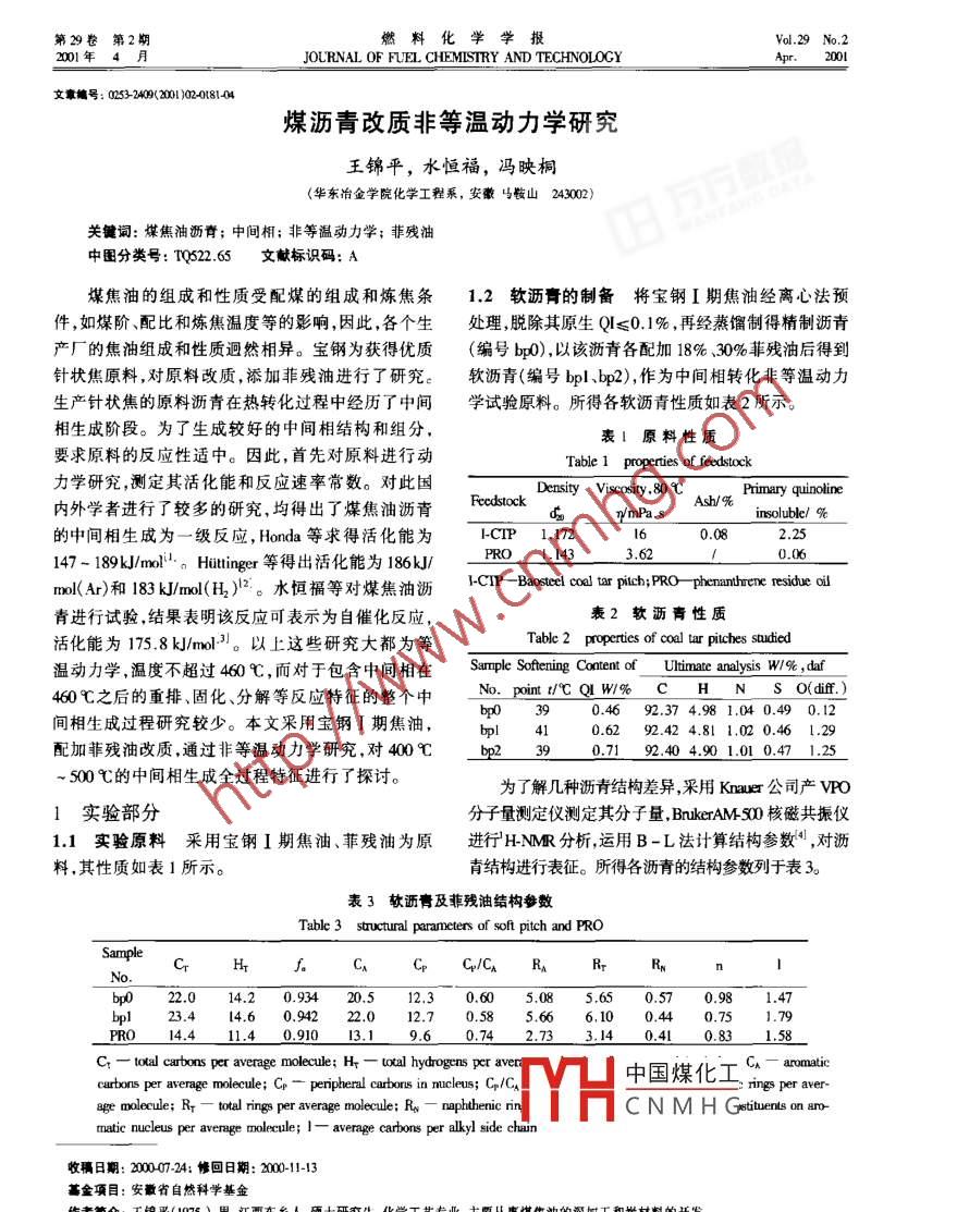 第29卷Vol 29 No. 2OLRNAL OF FLEL CHEMISTRY AND TECHNOLOGY文章號(hào):02532409(2001)0208104煤瀝青改質(zhì)非等溫動(dòng)力學(xué)研究王錦平,水恒福,馮映桐華東冶金學(xué)院化學(xué)工程系,安徽嗎鞍山243002)關(guān)鍵詞:煤焦油瀝青;中間相;非等溫動(dòng)力學(xué);菲殘油中圍分類號(hào):mQ622.65文獻(xiàn)標(biāo)識(shí)碼:A煤焦油的組成和性質(zhì)受配煤的組成和煉焦條1.2軟瀝膏的制備將寶鋼I期焦油經(jīng)離心法預(yù)件,如煤階、配比和煉焦溫度等的影響,因此各個(gè)生處理脫除其原生Q≤0.1%,再經(jīng)蒸餾制得精制瀝青產(chǎn)廠的焦油組成和性質(zhì)迥然相異。寶鋼為獲得優(yōu)質(zhì)(編號(hào)bO),以該瀝青各配加18%30%菲殘油后得到針狀焦原料,對(duì)原料改質(zhì),添加菲殘油進(jìn)行了研究。軟瀝青(編號(hào) bpl, bp2),作為中間相轉(zhuǎn)化非等溫動(dòng)力生產(chǎn)針狀焦的原料瀝青在熱轉(zhuǎn)化過(guò)程中經(jīng)歷了中間學(xué)試驗(yàn)原料。所得各軟瀝青性質(zhì)如表2所示相生成階段。為了生成較好的中間相結(jié)構(gòu)和組分表1原料性質(zhì)要求原料的反應(yīng)性適中。因此,首先對(duì)原料進(jìn)行動(dòng)Table 1 properties of feedstock力學(xué)研究,測(cè)定其活化能和反應(yīng)速率常數(shù)。對(duì)此國(guó)Density vis80℃Primary quinoline內(nèi)外學(xué)者進(jìn)行了較多的研究,均得出了煤焦油瀝青FeedstockAsh/%insoluble/ %c的中間相生成為一級(jí)反應(yīng), Honda等求得活化能為-CTP1.1720.08147-189kJ/mol, n Huttinger等得出活化能為186kPRO1433.62m(Ar)和183kJml(H2)2。水恒福等對(duì)煤焦油瀝 tar pitc; o-phenanthrene residue o青進(jìn)行試驗(yàn),結(jié)果表明該反應(yīng)可表示為自催化反應(yīng),表2軟瀝青性質(zhì)活化能為175.8k/mol3。以上這些研究大都為等Table 2 properties of coal tar pitches sadie溫動(dòng)力學(xué),溫度不超過(guò)40℃,而對(duì)于包含中間相在 mple Softening Content of Ultimate analysis w%,d40℃之后的重排、固化、分解等反應(yīng)特征的整個(gè)中.pm℃QW% c H s o(diff)0.4692.374.981.040.490.12間相生成過(guò)程研究較少。本文采用寶鋼Ⅰ期焦油l410.6292.424.811.020.461.29配加菲殘油改質(zhì)通過(guò)非等溫動(dòng)力學(xué)研究,對(duì)400℃bp2390.7192404901010.471.25500℃的中間相生成全過(guò)程特征進(jìn)行了探討。為了解幾種瀝青結(jié)構(gòu)差異,采用Knr公司產(chǎn)ⅴPO1實(shí)驗(yàn)部分分子量測(cè)定儀測(cè)定其分子量, BrukeTAn0核磁共振儀1.1實(shí)驗(yàn)原料采用寶鋼I期焦油、菲殘油為原進(jìn)行HNM分析運(yùn)用B-L法計(jì)算結(jié)構(gòu)參數(shù),對(duì)瀝料,其性質(zhì)如表1所示。青結(jié)構(gòu)進(jìn)行表征。所得各瀝青的結(jié)構(gòu)參數(shù)列于表3表3軟瀝膏及菲殘油結(jié)構(gòu)參數(shù)Table 3 structural parameters of soft pitch and PROSampleCP C/CA RAb1022.014.20.93420.512.30.605085.650.570.981.47pl23414.60.94222.012.70.585666.100.440.751RRO14.411.40.9013.19.60.742.733.140.410.831.58Cr- total carbons per average molecule Hr -total hydrogens per aver中國(guó)煤化工CA aromaticcarbons per average molecule; CP-peripheral carbons in mucleus; CP/CAage molecule: Rr- total rings per average molecule: Ro-naphthenic riCN MHGstituents on aro-matic nucleus per average molecule; l-average carbons per alkyl side chain收稿日期:2000024:修回日期:20001-13金項(xiàng)目:安徽省自然科學(xué)基金作者簡(jiǎn)介:工錦平(1975),男,江西東鄉(xiāng)人,硬士研究生,化學(xué)工藝專業(yè),主要從事煤焦油的深加工和炭材料的開(kāi)發(fā)燃料化學(xué)學(xué)報(bào)卷13中間相熱轉(zhuǎn)化試驗(yàn)瀝青中間相熱轉(zhuǎn)化試驗(yàn)應(yīng),則積分處理公式為:在8×φ25×265試管爐中進(jìn)行,用A708P智能溫控儀控制加熱,從400℃起以恒定的升溫速率加熱In(lo-MV)=2.(1-D )exp(-p)直至終溫。然后測(cè)定中間相瀝青中的中間相含量?jī)蛇吶∽匀粚?duì)數(shù)并整理:中間相產(chǎn)率采用下式計(jì)算In(lo1r1(1)=如中間相產(chǎn)率=中間相含量×殘留物產(chǎn)率式中各向同性基質(zhì)l,中間相產(chǎn)率M,揮發(fā)份V升2非等溫動(dòng)力學(xué)數(shù)據(jù)處理函數(shù)溫速率β和溫度均可由實(shí)驗(yàn)測(cè)得中問(wèn)相轉(zhuǎn)化過(guò)程就是瀝青中各向同性基質(zhì)(1)轉(zhuǎn)化為各向異性的中間相(M),同時(shí)析出揮發(fā)分?jǐn)?shù)據(jù)處理時(shí),首先以加(mMY)對(duì)1/r(V)的這樣一個(gè)過(guò)程,該過(guò)程可表示為:作圖時(shí),由直線斜率可求出初始活化能B0,然后把Bn代人1(M)(12B)中,并以血(則根據(jù)質(zhì)量速率方程有:hM2)h(12R)(注:令其等于Y值)對(duì)1/T=k(Iu-M-V(1)作圖,根據(jù)斜率求出一個(gè)新的Ea,如此反復(fù)疊代,直其中,為光學(xué)各向同性基質(zhì)含量,=FM0,M為瀝到前后的a值相差小于103為止(瀝青中問(wèn)相轉(zhuǎn)青由室溫升至400開(kāi)始恒速升溫時(shí)的中間相產(chǎn)率化動(dòng)力學(xué)曲線見(jiàn)圖1)求出最終的Fa后,根據(jù)最根據(jù) Arrhenius定律有終的直線截距與h[RA/(BEa)]求出指前因子A(2)積分法求得的結(jié)果見(jiàn)表4在恒速升溫條件下升溫速率為:3=d7/dt(3)l】5把(2)、(3)代入(1)式,整理并兩端積分:dM A(4)-13.5若反應(yīng)級(jí)數(shù)n=1時(shí),則(4)式左邊積分得:0(l0-Mv)In(Lu-M-v)若反應(yīng)級(jí)數(shù)n=m時(shí),則(4)式左邊積分得1261.301341.381.421461.500(J-MV)”你了(b-MV)m)(6)l7·10