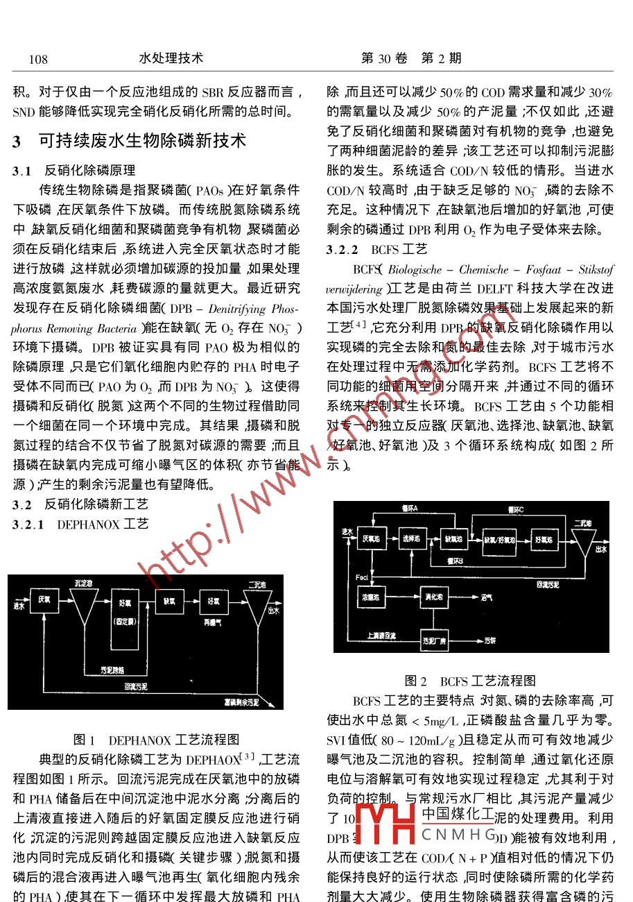 第30卷.第2期水處理技術(shù)Vol. 30 No.22004年4月TECHNOLOGY OF WATER TREATMENTApr. ,2004 .城市可持續(xù)污水生物處理技術(shù)王曉蓮'彭永臻,王淑瑩',馬勇2( 1.北京工業(yè)大學(xué)北京市水環(huán)境恢復(fù)重點(diǎn)試驗(yàn)室北京100022 ;2.哈爾濱工業(yè)大學(xué)市政與環(huán)境工程學(xué)院, 黑龍江哈爾濱150090)摘要針對傳統(tǒng)污水生物脫氮除磷處理技術(shù)存在的問題提出了可持續(xù)污水處理的概念,介紹了國內(nèi)外生物脫氮除磷領(lǐng)域開發(fā)的若干新工藝為水處理工藝選擇提供了新思路、新方法在此基礎(chǔ)上提出了城市可持續(xù)污水生物處理工藝。關(guān)鍵詞污水生物處理可持續(xù)生物脫氮除磷;反硝化除磷( DPB )中圖分類號:TQ085+ .413文獻(xiàn)標(biāo)識碼:A文章編號:1000-37700 2004 )02-0106-04值。1可持 續(xù)污水處理概念從氨氮的微生物轉(zhuǎn)化過程來看氨氮被氧化成針對傳統(tǒng)污水生物脫氮除磷處理技術(shù)存在的問硝酸氮是由兩類獨(dú)立的細(xì)菌催化完成的兩個(gè)不同反題我們提出了可持續(xù)污水生物處理技術(shù)的概念,以應(yīng)應(yīng)該可以分開。對于反硝化菌無論是硝酸氮還盡可能的減少能耗、高效節(jié)能和污水可回用為目的是亞硝酸氮均可以作為最終受氫體,因而整個(gè)生物的新技術(shù)推動污水處理技術(shù)不斷前進(jìn)。本概念主脫氮過程也可以經(jīng)NH2 -NO2 -N2這樣的途徑完成。要包含以下幾個(gè)內(nèi)容:盡可能減少COD氧化;盡可早在1975年Voet等就發(fā)現(xiàn)在硝化過程中亞硝酸氮能大的甲烷( CH4 )產(chǎn)量盡可能低的能量消耗相應(yīng)積累的現(xiàn)象并首次提出了亞硝酸型生物脫氮(也可盡可能減少CO2釋放盡可能減小剩余污泥產(chǎn)量磷稱為不完全或稱短硝化/反硝化生物脫氮)這種將酸鹽再生處理水回用。硝化過程控制在亞硝酸階段的短程生物脫氮工藝具有以下特點(diǎn):對于活性污泥法,可節(jié)省氧供應(yīng)量約2可持續(xù)污水生物脫氮技術(shù)25%降低能耗節(jié)省反硝化所需碳源40%在C/N2.1短程 硝化/反硝化比一定的情況下提高TN去除率;減少污泥生成量長期以來無論是在污水生物脫氮理論上還是可達(dá)50%減少投堿量;縮短反應(yīng)時(shí)間相應(yīng)反應(yīng)器在工程實(shí)踐中都認(rèn)為要實(shí)現(xiàn)污水生物脫氮就必須容積減少,節(jié)省基建費(fèi)用。針對這些新發(fā)現(xiàn)開發(fā)出使NH2經(jīng)歷典型的硝化和反硝化過程才能完全被多種生物脫氮新工藝。去除這條途徑稱為全程(或完全)硝化反硝化生物SHARON( Single reactor for High actiwity Ammonia脫氮。最近研究表明,生物脫氮過程中出現(xiàn)了一些Removal Orer nitrie )工藝是由荷蘭Delft 技術(shù)大學(xué)開超出傳統(tǒng)認(rèn)識的新現(xiàn)象如亞硝酸型硝化硝化不僅發(fā)的脫氮新工藝1。其基本原理是將氨氮氧化控制可以由自養(yǎng)菌完成,而且異氧菌也可以完成好氧硝在亞硝化階段然后進(jìn)行反硝化。用SHARON工藝化某些微生物在好氧條件下也可以進(jìn)行反硝化作來處理城市污水二級處理系統(tǒng)中污泥消化上清液和用。有些研究者在實(shí)驗(yàn)中發(fā)現(xiàn)在厭氧條件下氨氮減垃圾中國煤化工使硝化系統(tǒng)中亞硝酸少的情況。這些現(xiàn)象的發(fā)現(xiàn)為水處理工作者設(shè)計(jì)處積累MHCNMHG應(yīng)用硝酸菌和亞硝酸理工藝提供了新的理論和思路具有較高的應(yīng)用價(jià)菌的不同生長速率,即在高溫( 30~ 359C )下亞硝酸菌的生長速率明顯高于硝酸菌的生長速率亞硝酸收稿日期2002-06-04基金項(xiàng)縣數(shù)推”資助項(xiàng)目( 2003AA601010 )國家十五"科技攻關(guān)項(xiàng)目( 2002BA860B04 );刀方效花源市教委科技發(fā)展計(jì)劃重點(diǎn)項(xiàng)目( K2003010000王曉蓮等,城市可持續(xù)污水生物處理技術(shù)107菌的最小停留時(shí)間小于硝酸菌這一固有特性通過者說它可以利用硝酸鹽作為電子受體來氧化氨??刂葡到y(tǒng)的水力停留時(shí)間使其介于硝酸菌和亞硝酸ANAMMOX工藝基本原理為氨的氧化與NO2 .菌最小停留時(shí)間之間,從而使亞硝酸菌具有較高的的還原相偶聯(lián),從理論,上講并不新穎。本工藝的新濃度而硝酸菌被自然淘汰維持穩(wěn)定的亞硝酸積累。穎之處在于利用生化原理開發(fā)出切實(shí)可行的生物脫在SHARON工藝中通過提高反應(yīng)器中的溫度使氮的新工藝。在較高溫度下增長速率較快的亞硝化細(xì)菌占優(yōu)勢,2.3 SHARON 和ANAMMOX聯(lián)合工藝所以溫度和HRT值應(yīng)嚴(yán)格控制。利用此專利工藝SHARON工藝可以通過控制溫度、水力停留時(shí)的兩座廢水生物脫氮處理廠已在荷蘭建成。間、pH等條件使氨氮氧化控制在亞硝化階段,目前OLAND( Oxygen Limited Autotrophic Nirification盡管HARON工藝以好氧/厭氧的間歇運(yùn)行方式處Denitrification氧限制自養(yǎng)硝化反硝化)工藝是由比理高氨廢水取得較好的效果,但由于在反硝化中需利時(shí)Gent微生物生態(tài)實(shí)驗(yàn)室開發(fā)。該工藝技術(shù)關(guān)要消耗有機(jī)碳源并且出水濃度相對較高,因此可以鍵是控制溶解氧濃度使硝化過程僅進(jìn)行到NHt氧SHARON工藝作為硝化反應(yīng)器,而ANMMOX工藝作化為NO2階段。由于該過程缺乏電子受體,使得為反硝化反應(yīng)器進(jìn)行組合工藝。SHARON 工藝可以NH氧化產(chǎ