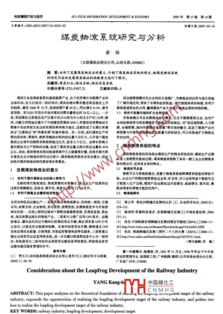 科技情報開發(fā)與經(jīng)濟(jì)SCI-TECH INFORMATION DEVELOPMENT & ECONOMY2007年第17卷第14期文章編號:1005- 6033(2007)14-0245-02收稿日期:2007-03-16煤炭物流系統(tǒng)研究與分析俞恒(太原煤炭運銷分公司,山西太原,030002)摘要:分析了 發(fā)展煤炭物流業(yè)的意義,介紹了煤炭物流系統(tǒng)的特點,就煤炭物流系統(tǒng)的研究內(nèi)容和發(fā)展煤炭物流的戰(zhàn)略重點進(jìn)行了探討。關(guān)鍵詞:煤炭行業(yè);物流系統(tǒng);物流信息系統(tǒng)中圖分類號:F25;F407.21文獻(xiàn)標(biāo)識碼:A煤炭行業(yè)是國家重要的基礎(chǔ)能源產(chǎn)業(yè),由于經(jīng)濟(jì)增長對能源產(chǎn)業(yè)的供應(yīng)鏈管理模式在企業(yè)間的8益推廣,為物流業(yè)的運作與成長創(chuàng)造總體拉動,在今后相當(dāng)- -段時間內(nèi) ,煤炭的絕對需求量還將呈穩(wěn)定上升了廣闊市場空間,帶來了豐厚的經(jīng)濟(jì)效益?,F(xiàn)代物流體系的構(gòu)建,有利于的趨勢。截至2006年10月,我國原煤產(chǎn)量20億1,同比增長8.1%。據(jù)專降低流通資金的占用,贏得煤炭產(chǎn)業(yè)大市場中物流運營的利潤份額。家預(yù)測,到2020年國內(nèi)市場對煤炭的需求量將達(dá)到24億t以上。一方1.3 有利于拓展市場和擴(kuò)大生存空間面,我國煤炭主要商品化產(chǎn)區(qū)集中在以山西為中心的北方產(chǎn)區(qū)(山西、陜有效地確立專業(yè)化物流的運行模式,立足于做強(qiáng)煤炭主業(yè),也為產(chǎn)西、內(nèi)蒙古西部地區(qū)集中了中國煤炭資源的60%);而煤炭的消費地卻大業(yè)的拓展延伸與再發(fā)展提供了物流運作的保證。對“供應(yīng)商資源、人力資都集中在經(jīng)濟(jì)較為發(fā)達(dá)的東部沿海和南方地區(qū),這就形成了長期以來煤源、倉儲資源、國內(nèi)外物流市場資源”等方面的整合,促進(jìn)了煤炭產(chǎn)業(yè)內(nèi)炭業(yè)“北煤南運"和“西煤東調(diào)”的基本格局。另-方面.進(jìn)行煤炭生產(chǎn)所部資源與外部市場資源的優(yōu)化配置與有機(jī)結(jié)合,可以有效地擴(kuò)大物流運需的原材料零部件、燃料等輔助材料的供應(yīng)量十分巨大,幾乎每個煤炭作的空間。集團(tuán)企業(yè)每年的物資采購都要超過億元,甚至幾十億元。這種長距離大2煤炭物流系統(tǒng)的特點量的煤炭及生產(chǎn)資料的運輸,造成了煤炭貨運量占國內(nèi)貨運總量的45%左右。因此.煤炭物流在我國流通領(lǐng)域中已占據(jù)重要位置。但是目前大部煤炭物流系統(tǒng)的活動是由煤炭生產(chǎn)的特點所決定的,煤炭生產(chǎn)過程分煤炭企業(yè)對物流的研究還比較少,煤炭物流系統(tǒng)尚未完全建立,因此實質(zhì)上是物資的流動過程。煤炎物流系統(tǒng)除了具有一般工業(yè)企業(yè)物流系加快對煤炭物流的研究就變得非常緊迫。統(tǒng)的特點外,還具有自身的特點。1發(fā)展煤炭物流業(yè)的意義2.1物流的節(jié)點多物流節(jié)點又稱物流據(jù)點,是整個物流系統(tǒng)指揮調(diào)度和信息的神經(jīng)中1.1有利于提升煤炭企 業(yè)的核心竟?fàn)幜?。企業(yè)生產(chǎn)所需的物資要經(jīng)過總庫、礦倉庫、井口倉庫等多個物流節(jié)點全新的現(xiàn)代物流理念、物流資源的有效整合,使企業(yè)生產(chǎn)經(jīng)營的全才能投入生產(chǎn)過程,煤炭產(chǎn)品也要經(jīng)過井底煤倉、地面煤倉、裝車站、集過程實現(xiàn)精確化、信息化、數(shù)字化高效化,提升了產(chǎn)業(yè)水平。配站等多次停頓才能發(fā)往用戶。1.2有利于提高企業(yè)整體經(jīng)濟(jì)效益2.2物流線路長化帶動和促進(jìn)運輸生產(chǎn)。-是要積極發(fā)展物流事業(yè)。堅持統(tǒng)- -規(guī)劃,合理[2]梁立華。 深化對跨越式發(fā)展的認(rèn)識[J].社會科學(xué)論壇,2005(8):布局,政策支持,企業(yè)唱戲,多元投資,按需投放;發(fā)展物流技術(shù)與市場營129-131.銷有機(jī)統(tǒng)一,實現(xiàn)上游供應(yīng)鏈和下游配送鏈緊密連接,實現(xiàn)信息流資金[3]陳國祥,依靠科技進(jìn)步 ,實現(xiàn)跨越式發(fā)展[J]中國農(nóng)墾經(jīng)擠,2004流、商品流源遠(yuǎn)流長的物流產(chǎn)業(yè)。二是要大力推廣應(yīng)用GPS技術(shù)。運輸(9):13.劇毒品、爆炸品的貨運車輛和長距離的客運車輛,都必須安裝GPS行車[4]佚名.中國鐵路實現(xiàn)跨越式發(fā)展 的現(xiàn)實可能性[ EB/OLJ.[2006-11-記錄儀,以強(qiáng)化安全教援和保障。有條件的客貨運車輛,都將通過GPS1:/://www teliu.cm.cn/zhuanti/ShowAricle. asp?AriclelD=2285.系統(tǒng)實現(xiàn)優(yōu)化配置、合理調(diào)度、有效監(jiān)控管理和多樣化服務(wù)。三是要建立[5]佚名. 鐵路跨越式發(fā)展三周年二十八件大事[EB/0L].[2006-11-健全全國客貨運信息網(wǎng)絡(luò)系統(tǒng)。進(jìn)一步完善以鐵道部信息中心為一級網(wǎng)16 ].:/:/.i.ne/htn//elhu/oieluej/19111.htmol.站、各鐵路局為二級網(wǎng)站的全國客貨運輸信息網(wǎng)絡(luò)建設(shè),積極推進(jìn)客貨(責(zé)任編輯:李敏)運輸電腦化服務(wù)管理的水平。參考文獻(xiàn)第-作者簡介:楊康恒,男,1961年11月勝, 1996年畢業(yè)于中央黨[1]賈玉川.如何提高鐵路多經(jīng)企業(yè)核心競爭 []理論學(xué)習(xí)與探索,校經(jīng)濟(jì)管理專業(yè),助理政工師,廣州鐵路(集團(tuán))公司有線電視臺辦公室,2006(1):38-39.廣