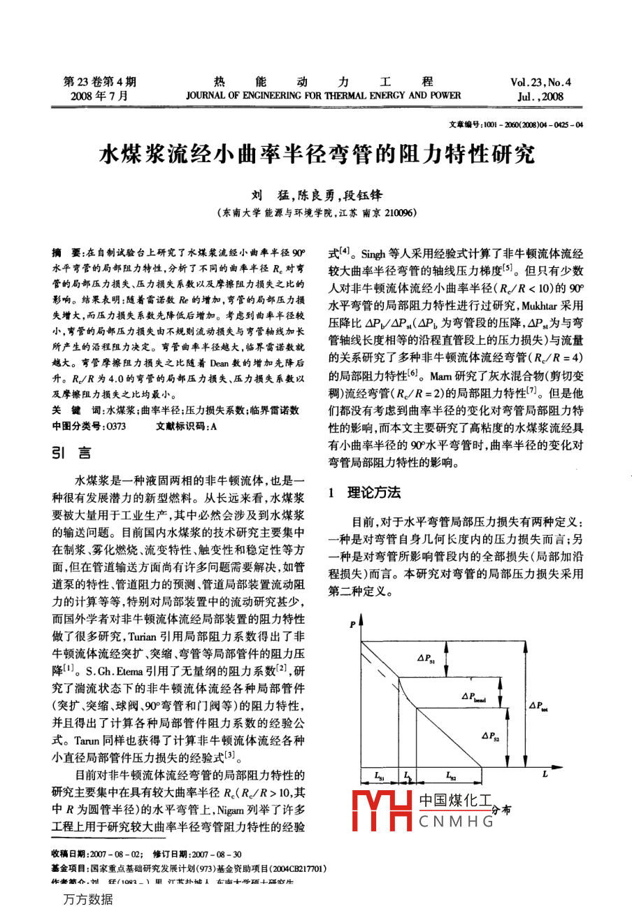 第23卷第4期熱能動(dòng)力工程Vol 23. No 42008年7月JOURNAL OF ENGINEERING FOR THERMAL ENERGY AND POWERul.,2008文章編號:1001-2000208)04-0425-04水煤漿流經(jīng)小曲率半徑彎管的阻力特性研究劉猛,陳良勇,段鈺鋒(東南大學(xué)能源與環(huán)境學(xué)院,江蘇南京21006)摘要:在自制試驗(yàn)臺(tái)上研究了水媒漿流經(jīng)小曲率半徑9式。Ssi等人采用經(jīng)驗(yàn)式計(jì)算了非牛頓流體流經(jīng)水平彎管的局部阻力特性分析了不同的曲率半徑R對彎較大曲率半徑彎管的軸線壓力梯度(S。但只有少數(shù)管的局部壓力損失、壓力損失系數(shù)以及摩擦阻力損失之比的人對非牛頓流體流經(jīng)小曲率半徑(RR<10)的90°影響。結(jié)栗表明:隨著雷諾數(shù)B的增加彎管的局部壓力損水平彎管的局部阻力特性進(jìn)行過研究Mh.用失增大,而壓力損失系數(shù)先降低后增加??紤]到曲率半徑較小,彎管的局部壓力損失由不規(guī)則流動(dòng)損失與彎管軸線加長壓降比△PAPn(AP為彎管段的壓降,△Pn為與彎所產(chǎn)生的沿程阻力決定。彎管曲率半徑越大臨界雷諾數(shù)就管軸線長度相等的沿程直管段上的壓力損失)與流量越大。彎管摩擦阻力損失之比隨著Dean數(shù)的增加先降后的關(guān)系研究了多種非牛頓流體流經(jīng)彎管(RR=4)升。R/R為4.0的彎管的局部壓力損失、壓力損失系數(shù)以的局部阻力特性0。Mm研究了灰水混合物(剪切變及摩擦阻力損失之比均最小稠)流經(jīng)彎管(RR=2)的局部阻力特性。但是他關(guān)鍵詞:水煤漿;曲率半徑;壓力損失系數(shù);臨界雷諾數(shù)們都沒有考慮到曲率半徑的變化對彎管局部阻力特中圖分類號:0373文獻(xiàn)標(biāo)識碼:A性的影響,而本文主要研究了高粘度的水煤漿流經(jīng)具引言有小曲率半徑的90水平彎管時(shí),曲率半徑的變化對彎管局部阻力特性的影響。水煤漿是一種液固兩相的非牛頓流體,也是種很有發(fā)展?jié)摿Φ男滦腿剂?。從長遠(yuǎn)來看,水煤漿1理論方法要被大量用于工業(yè)生產(chǎn),其中必然會(huì)涉及到水煤漿的輸送問題。目前國內(nèi)水煤漿的技術(shù)研究主要集中目前,對于水平彎管局部壓力損失有兩種定義:種是對彎管自身幾何長度內(nèi)的壓力損失而言;另在制漿、霧化燃燒、流變特性、觸變性和穩(wěn)定性等方種是對彎管所影響管段內(nèi)的全部損失(局部加沿面但在管道輸送方面尚有許多問題需要解決,如管程損失)而言。本研究對彎管的局部壓力損失采用道泵的特性、管道阻力的預(yù)測、管道局部裝置流動(dòng)阻第二種定義力的計(jì)算等等,特別對局部裝置中的流動(dòng)研究甚少,而國外學(xué)者對非牛頓流體流經(jīng)局部裝置的阻力特性做了很多研究, Turian引用局部阻力系數(shù)得出了非牛頓流體流經(jīng)突擴(kuò)、突縮、彎管等局部管件的阻力壓△P降。s.Ch.Eema引用了無量綱的阻力系數(shù)(2),研究了湍流狀態(tài)下的非牛頓流體流經(jīng)各種局部管件△P(突擴(kuò)、突縮、球閥、90°彎管和門閥等)的阻力特性,△P并且得出了計(jì)算各種局部管件阻力系數(shù)的經(jīng)驗(yàn)公式。 Tarun同樣也獲得了計(jì)算非牛頓流體流經(jīng)各種小直徑局部管件壓力損失的經(jīng)驗(yàn)式目前對非牛頓流體流經(jīng)彎管的局部阻力特性的研究主要集中在具有較大曲率半徑Ra(R/R>10,其中國煤化工中R為圓管半徑的水平彎管上,Ngm列舉了許多工程上用于研究較大曲率半徑彎管阻力特性的經(jīng)驗(yàn)CNMHG收稿日期:2007-08-02;修訂日期:2007-08-30基金項(xiàng)目:國家重點(diǎn)基礎(chǔ)研究發(fā)展計(jì)劃(973)基金資助項(xiàng)目(2004CB21701)作妾筼個(gè).訓(xùn)狂0Q)阻訂卦櫺k右齒士些而熱能動(dòng)力工程2008如圖1所示,彎管的壓力損失主要是由兩個(gè)部=20.58816+0.16273y,由于試驗(yàn)管道中的流速較分組成:一部分是彎管的局部壓力損失△Pww,另一低,水煤漿的表觀粘度較大,所以可以認(rèn)為管內(nèi)流動(dòng)部分是彎管段前后直管段的壓力損失△P,則彎管屬于層流狀態(tài)。的總壓力損失△P表示為:2.1曲率半徑對彎管的局部壓力損失的影響圖2給出了不同曲率半徑彎管的局部壓力損失彎管段前后直管段的壓降采用下式來計(jì)算與雷諾數(shù)的關(guān)系。從圖中可以看出,在較小雷諾數(shù)AP,=△P1+△P(Re<75)下,水煤漿流經(jīng)彎管的局部壓力損失較小(Lsl+L且出現(xiàn)波動(dòng),其后隨著雷諾數(shù)的增大,局部壓力損失D迅速地增加。式中:L、La彎管前后直管段的長度;-管內(nèi)的平均流速;p、D一水煤漿密度和圓管直徑,對于阻力系數(shù)λ我們采用 Darey-Weisbach摩擦阻力系數(shù)R/B30入=64/R(3)R./R=80因此彎管的局部壓力損失AP為:R/R=12△P-(L+LOliveira等人用壓力損失系數(shù)研究了黏彈性流體層流狀態(tài)下流經(jīng)突擴(kuò)管時(shí)的局部阻力特性8。故可引用壓力損失系數(shù)ξ來研究水煤漿流經(jīng)彎管的雷諾數(shù)Re局部阻力特性,即圖2彎管的局部壓力損失與雷諾數(shù)的關(guān)系White和 Mishra-Gupta分別提出了用于計(jì)算較彎管的局部壓力損失之所以波動(dòng),主要是因?yàn)榇笄拾霃?R。R>12)彎管的摩擦阻力損失之比水煤漿是一種具有觸變性的非牛頓流體,在受到某與De關(guān)系的經(jīng)驗(yàn)式9-0:剪切之后內(nèi)部結(jié)構(gòu)遭到破壞,粘度降低,如果停止2221-1heLp(6)剪切,其內(nèi)部結(jié)