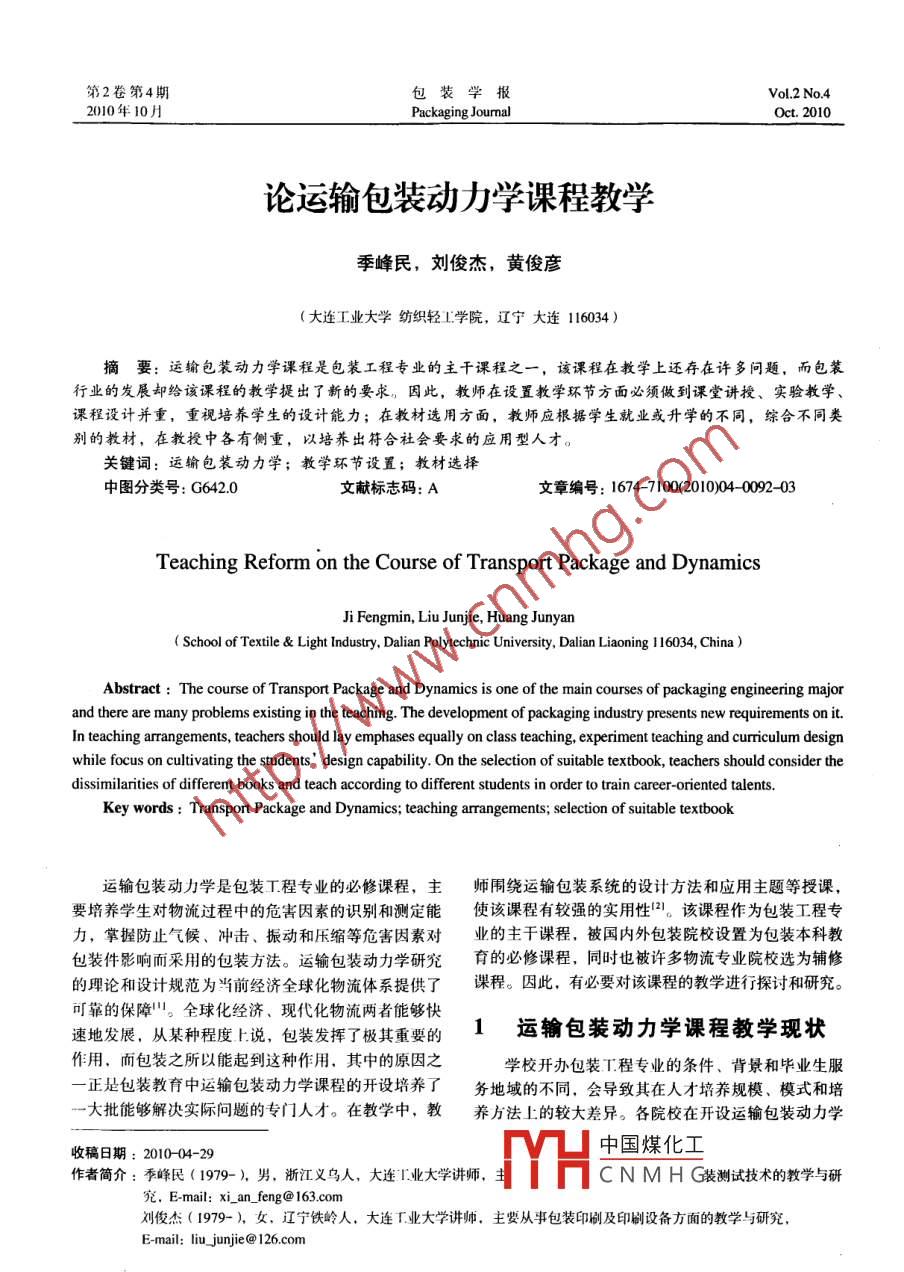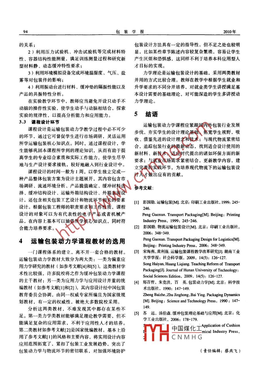 第2卷第4期Vol 2 No, 42010年10月Packaging JoumalOct.2010論運(yùn)輸包裝動(dòng)力學(xué)課程教學(xué)季峰民,劉俊杰,黃俊彥(大連工業(yè)大學(xué)紡織輕工學(xué)院,遼寧大連116034)摘要:運(yùn)輸包裝動(dòng)力學(xué)課程是包裝工程專業(yè)的主干課程之一,該課程在教學(xué)上還存在許多問題,而包裝行業(yè)的發(fā)展卻給該課程的教學(xué)提出了新的要求。因此,教師在設(shè)置教學(xué)環(huán)節(jié)方面必須做到課堂講授、實(shí)驗(yàn)教學(xué)課程設(shè)計(jì)并重,重視培養(yǎng)學(xué)生的設(shè)計(jì)能力;在教材選用方面,教師應(yīng)根據(jù)學(xué)生就業(yè)或升學(xué)的不同,綜合不同類別的教材,在教授中各有側(cè)重,以培養(yǎng)出符合社會(huì)要求的應(yīng)用型人才。關(guān)鍵詞:運(yùn)輸包裝動(dòng)力學(xué);教學(xué)環(huán)節(jié)設(shè)置;教材選擇中圖分類號(hào):G6420文獻(xiàn)標(biāo)志碼:A文章編號(hào):16747100201004009-03Teaching Reform on the Course of Transport Package and dynamicsJi Fengmin, Liu Junjie, Huang JunyanSchool of Textile Light Industry, Dalian Polytechnic University, Dalian Liaoning 116034, ChinaAbstract The course of Transport Package and Dynamics is one of the main courses of packaging engineering majorand there are many problems existing in the teaching. The development of packaging industry presents new requirements on it.In teaching arrangements, teachers should lay emphases equally on class teaching, experiment teaching and curriculum designwhile focus on cultivating the students design capability. On the selection of suitable textbook, teachers should consider thedissimilarities of different books and teach according to different students in order to train career-oriented talentsKey words: Transport Package and Dynamics; teaching arrangements; selection of suitable textbook運(yùn)輸包裝動(dòng)力學(xué)是包裝工程專業(yè)的必修課程,主師圍繞運(yùn)輸包裝系統(tǒng)的設(shè)計(jì)方法和應(yīng)用主題等授課要培養(yǎng)學(xué)生對物流過程中的危害因素的識(shí)別和測定能使該課程有較強(qiáng)的實(shí)用性12。該課程作為包裝工程專力,掌握防止氣候、沖擊、振動(dòng)和壓縮等危害因素對業(yè)的主干課程,被國內(nèi)外包裝院校設(shè)置為包裝本科教包裝件影響而采用的包裝方法。運(yùn)輸包裝動(dòng)力學(xué)研究育的必修課程,同吋也被許多物流專業(yè)院校選為輔修的理論和設(shè)計(jì)規(guī)范為當(dāng)前經(jīng)濟(jì)全球化物流體系提供了課程。因此,有必要對該課程的教學(xué)進(jìn)行探討和研究。??康谋U?。全球化經(jīng)濟(jì)、現(xiàn)代化物流兩者能夠快速地發(fā)展,從某種程度上說,包裝發(fā)揮了極其重要的運(yùn)輸包裝動(dòng)力學(xué)課程教學(xué)現(xiàn)狀作用,而包裝之所以能起到這種作用,其中的原因之學(xué)校開辦包裝工程專業(yè)的條件、肯景和畢業(yè)生服正是包裝教育中運(yùn)輸包裝動(dòng)力學(xué)課程的開設(shè)培養(yǎng)了務(wù)地域的不同,會(huì)導(dǎo)致其在人才培養(yǎng)規(guī)模、模式和培大批能夠解決實(shí)際問題的專門人才。在教學(xué)中,教養(yǎng)方法上的較大差異。各院校在開設(shè)運(yùn)輸包裝動(dòng)力學(xué)收稿日期:2010-04-29中國煤化工作者簡介:季峰民(1979-),男,浙江義烏人,大連工業(yè)大學(xué)講師,CNMHG裝測試技術(shù)的教學(xué)與研Di.E-mail:xi_an_feng@163.com刈俊杰(1979-),女、遼寧鐵嶺人,大連「業(yè)大學(xué)講帥,主要從事包裝印刷及印刷設(shè)備方面的教學(xué)與研究E-mail:liu_junjie@126.com季峰民,劉俊杰,黃俊彥運(yùn)輸包裝動(dòng)力學(xué)課程教學(xué)課程時(shí),對授課內(nèi)容的確定以及對課程的命名都有所會(huì))中國地區(qū)年會(huì)”中獲悉,包裝減量化、運(yùn)輸包裝測不同。至今該課程名稱有“運(yùn)輸包裝”“緩沖包裝動(dòng)力試合理化、運(yùn)輸環(huán)境與包裝物流一體化以及新型環(huán)保包學(xué)”“包裝動(dòng)力學(xué)”“物流運(yùn)輸包裝設(shè)計(jì)”“運(yùn)輸包裝動(dòng)裝材料如何應(yīng)對運(yùn)輸包裝等主題已經(jīng)成為未來運(yùn)輸包裝力學(xué)”等。美國的密歇根州立大學(xué)包裝學(xué)院在開設(shè)該技術(shù)的研究方向。同時(shí),此次大會(huì)還為包裝專業(yè)教育指課程之初,依據(jù)社會(huì)發(fā)展需要制定了運(yùn)輸包裝動(dòng)力學(xué)出了方向,對包裝人才培養(yǎng)提出了更高的要求。課程的教學(xué)目標(biāo),在授課內(nèi)容上將力學(xué)研究和結(jié)構(gòu)設(shè)因此,運(yùn)輸包裝動(dòng)力學(xué)課程教學(xué)應(yīng)按照現(xiàn)代物流計(jì)并重,其培養(yǎng)目標(biāo)被我國多院校認(rèn)同并采納。然而發(fā)展的要求和社會(huì)對包裝人才素質(zhì)的要求,對現(xiàn)有的該課程在內(nèi)容上存在明顯不足,主要表現(xiàn)為物流包裝課程和教學(xué)內(nèi)容進(jìn)行相應(yīng)調(diào)整和充實(shí),使包裝工程專系統(tǒng)設(shè)計(jì)方面內(nèi)容的缺乏。業(yè)培養(yǎng)的學(xué)生不僅掌握相應(yīng)的專業(yè)知識(shí),而且具有現(xiàn)當(dāng)前我國大多數(shù)包裝院校在該課程教學(xué)上存在如代物流的觀念和意識(shí),這樣才能更好地適應(yīng)社會(huì)發(fā)展下問題:的需求。1)課程內(nèi)容設(shè)置不完善,培養(yǎng)環(huán)節(ji