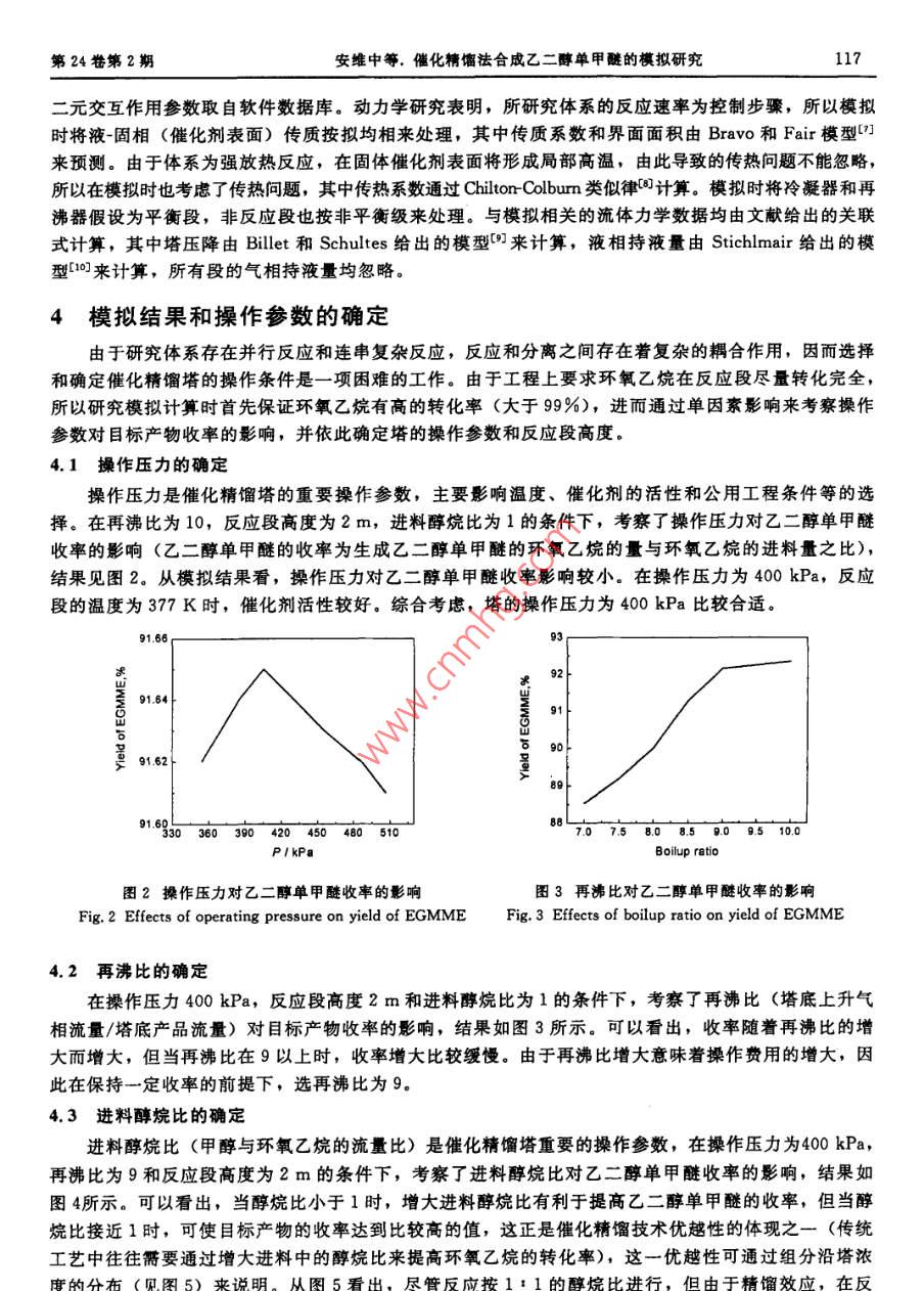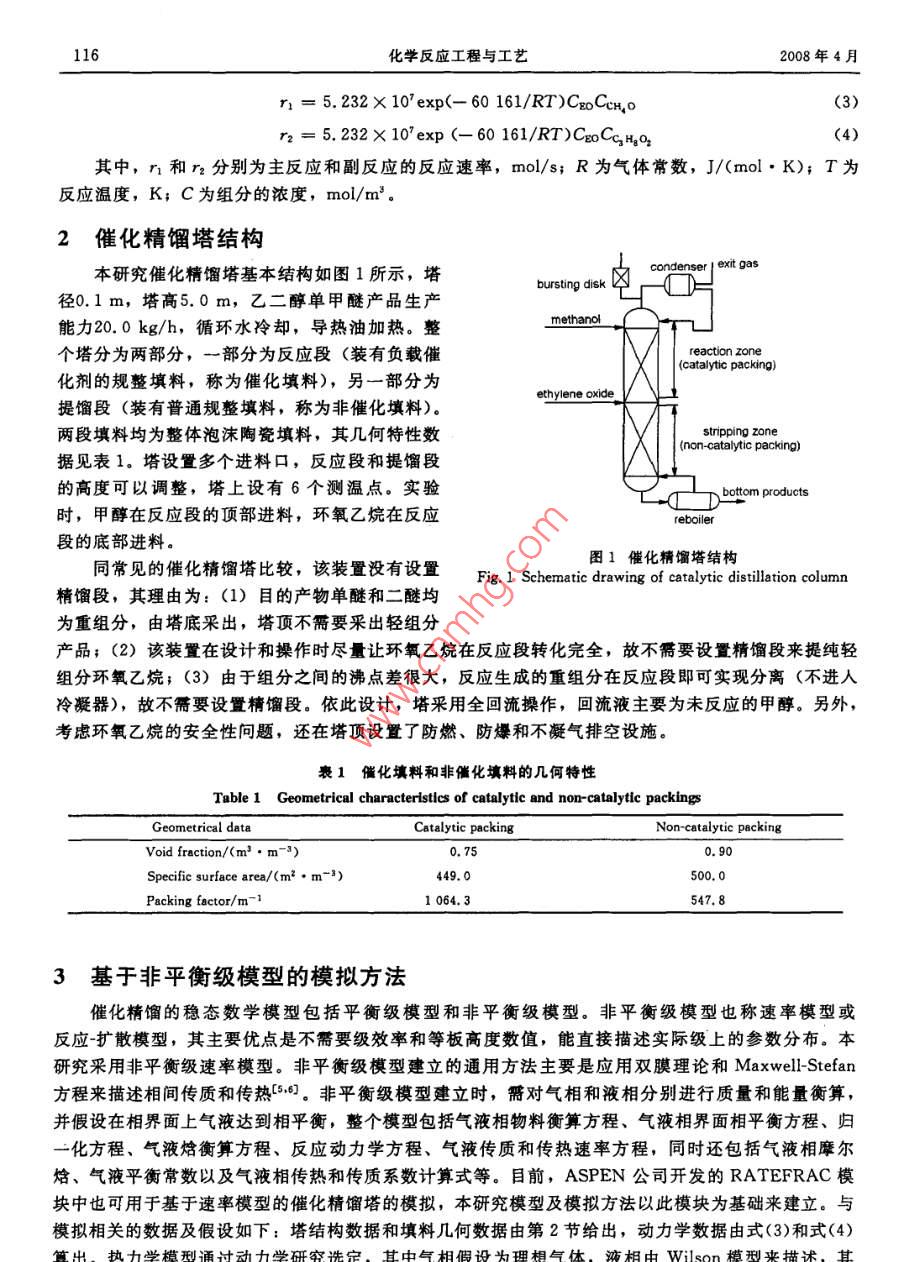 第24卷第2期化學(xué)反應(yīng)工程與工藝 Vol 24. No22008年4月 Chemical Reaction Engineering and TechnologyApr.2008文章編號:1001-7631(2008)02-0115-06催化精餾法合成乙二醇單甲醚的模擬研究安維中董鳳蕾國洪超劉兆濱2朱建民2(1.中國海洋大學(xué)化學(xué)化工學(xué)院,山東青島266100;2.遼寧奧克化學(xué)集團(tuán),遼寧遼陽111003)摘要:提出以環(huán)氧乙烷和甲醇為原料,應(yīng)用催化精餾技術(shù)合成乙二醇單甲醚的工藝方法采用基于非平衡級模型的模擬方法,考察關(guān)健操作參數(shù)對目的產(chǎn)選擇性和收事的影響,并得到優(yōu)化的操作條件為400kpa,377K,甲醇和環(huán)氧乙烷流量均為0.07mol/s,再沸比9,反應(yīng)段高度1.8m,提段高度3.2m建立了中試規(guī)模的催化精塔對模擬結(jié)果進(jìn)行了驗證。結(jié)果表明,采用催化精餾法合成乙二醇單甲醚,在優(yōu)化條件下乙二醇單甲醚收率達(dá)到93%以上實驗結(jié)果與模擬結(jié)果吻合良好,表明模擬方法可靠關(guān)鍵謂:乙二醇單甲醚;催化精餾;模擬;非平衡級模型中圖分類號:TQ223.2+4TQ203.2TQ018文獻(xiàn)標(biāo)識碼:A乙二醇單甲醚(ethylene glycol monomethyl ether, EGMME)是環(huán)氧乙烷的重要衍生物之一,是優(yōu)良的溶劑和有機(jī)合成中間體,廣泛應(yīng)用于印染、涂料及油墨等工業(yè)領(lǐng)域1。傳統(tǒng)的乙二醇單甲醚生產(chǎn)主要采用間歐釜式反應(yīng)工藝和連續(xù)管式反應(yīng)工藝2,但這些工藝存在諸多問題,如目標(biāo)產(chǎn)物的收率低、能耗高、均相催化劑分離困難且對設(shè)備的腐蝕嚴(yán)重等。催化精餾是將化學(xué)反應(yīng)與精餾分離結(jié)合在同一設(shè)備中進(jìn)行的一種耦合過程,因其顯著的優(yōu)點而備受關(guān)注。迄今,催化精餾技術(shù)已成功應(yīng)用于甲基叔丁基醚、乙基叔丁基醚和甲酸乙酯等的工業(yè)化生產(chǎn)3。許錫恩等用催化精餾技術(shù)合成乙二醇乙醚,為該類產(chǎn)品的生產(chǎn)提供了一種新的工藝方法。本研究以 ASPEN PLUS軟件為工具,采用非平衡級模型對乙二醇單甲醚中試催化精餾塔進(jìn)行了模擬與分析,為催化精餾法合成乙二醇單甲醚工業(yè)化提供技術(shù)支撐。1化學(xué)體系和反應(yīng)動力學(xué)乙二醇單甲醚由環(huán)氧乙烷(EO)和甲醇在催化劑作用下合成,反應(yīng)為典型的競爭不可逆反應(yīng),反應(yīng)方程式如下: C2H,+CH,. H. O2(1)反應(yīng)生成的乙二醇單甲醚繼續(xù)和環(huán)氧乙烷反應(yīng),生成副產(chǎn)物二乙二醇甲醚,反應(yīng)方程式如下: C2H.O+C,H:O2-C:Hi2O3(2)副產(chǎn)物二乙二醇甲醚還可以與環(huán)氧乙烷繼續(xù)反應(yīng),生成一系列的環(huán)氧乙烷加成產(chǎn)物。動力學(xué)研究發(fā)現(xiàn),在實驗條件下,這些加成產(chǎn)物的生成量很少,因此本研究只考慮上述兩個反應(yīng)。另外,兩個反應(yīng)均為放熱反應(yīng),其反應(yīng)熱(373K條件)分別為每摩爾EO反應(yīng)完全后產(chǎn)生熱量104.44kJ和100.61kJ/mol(通過ASPEN PLUS軟件模擬計算得出)該體系的本征動力學(xué)實驗在遼寧奧克化學(xué)集團(tuán)完成,所用催化劑為自制固體酸。依據(jù)乙氧基化反應(yīng)機(jī)理,可認(rèn)為兩個反應(yīng)的反應(yīng)速率常數(shù)近似相等,研究得出如下的動力學(xué)方程:收稿日期:2007-12-29;修訂日期:2008-03-04作者簡介:安維中(1968),男,副教授,博士E -mail awzhong@ouc edu cn基金項目:遼寧省科學(xué)技術(shù)攻關(guān)計劃項目(JH2/01-ZT102-04)116化學(xué)反應(yīng)工程與工藝2008年4月r=5.232×10exp(-60161/rt)Cgo CCH(3)r2=5.232×10exp(-6016/rt)Cgo2(4)其中,r1和r2分別為主反應(yīng)和副反應(yīng)的反應(yīng)速率,mol/s;R為氣體常數(shù),J/(mol·K);T為反應(yīng)溫度,K;C為組分的濃度,mol/m32催化精餾塔結(jié)構(gòu)本研究催化精餾塔基本結(jié)構(gòu)如圖1所示,塔 condenser exit gas bursting disk徑0.1m,塔高5.0m,乙二醇單甲醚產(chǎn)品生產(chǎn)能力20.0kg/h,循環(huán)水冷卻,導(dǎo)熱油加熱。整 methanol個塔分為兩部分,一部分為反應(yīng)段(裝有負(fù)載催 (catalytic packing化劑的規(guī)整填料,稱為催化填料),另一部分為 ethylene oxide提餾段(裝有普通規(guī)整填料,稱為非催化填料)。兩段填料均為整體泡沫陶瓷填料,其幾何特性數(shù) stripping zone (non-catalytic packing)據(jù)見表1。塔設(shè)置多個進(jìn)料口,反應(yīng)段和提餾段的高度可以調(diào)整,塔上設(shè)有6個測溫點。實驗 bottom products時,甲醇在反應(yīng)段的頂部進(jìn)料,環(huán)氧乙烷在反應(yīng) reboiler段的底部進(jìn)料。圖1催化精餾塔結(jié)構(gòu)同常見的催化精餾塔比較,該裝置沒有設(shè)置Fig.1 Schematic drawing of catalytic distillation column精餾段,其理由為:(1)目的產(chǎn)物單醚和二醚均為重組分,由塔底采出,塔頂不需要采出輕組分產(chǎn)品;(2)該裝置在設(shè)計和操作時盡量讓環(huán)氧乙烷在反應(yīng)段轉(zhuǎn)化完全,故不需要設(shè)置精餾段來提純輕組分環(huán)氧乙烷;(3)由于組分之間的沸點差很大,反應(yīng)生成的重組分在反應(yīng)段即可實現(xiàn)分離(不進(jìn)人冷凝器),故不需要設(shè)置精餾段。依此設(shè)計塔采用全回流操作,回流液主要為未反應(yīng)的甲醇。另外,考慮環(huán)氧乙烷的安全性問題,還在塔頂設(shè)置了防燃、防爆和不凝氣排空設(shè)施。表1催化填料和非催化填料的幾何