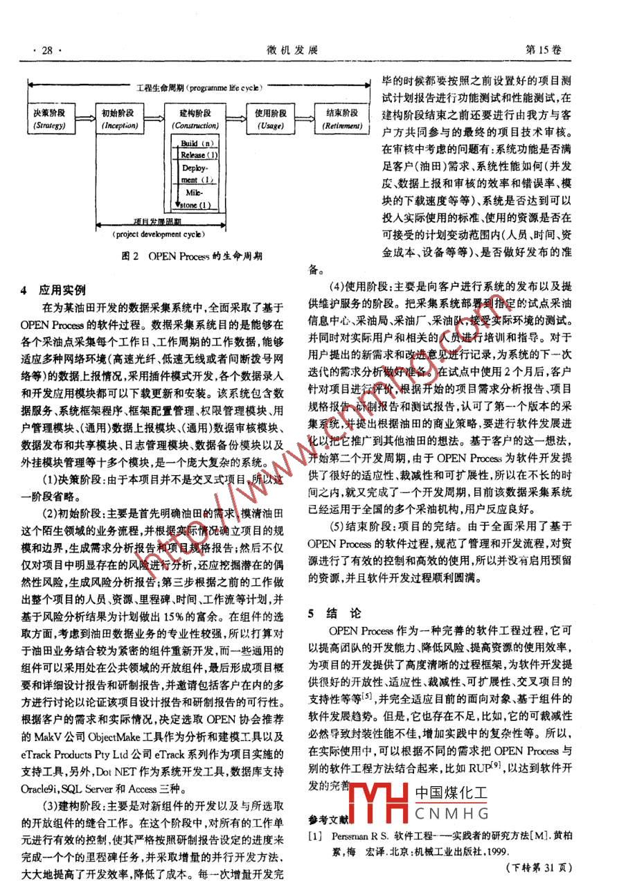 第15卷第g期微機(jī)發(fā)展Val.15 No.92005年9月Microcomputer DevelopmentSep. 2005OPEN Process Framework軟件工程框架研究與應(yīng)用廖芳,彭定強(qiáng),張松(北京師范大學(xué)信息科學(xué)學(xué)院計(jì)算機(jī)系,北京100875)滴要:OPEN Proess Framework(OPF)是使軟件開發(fā)過程達(dá)到CMM5級(jí)標(biāo)準(zhǔn)的軟件工程框架。文中討論了基于OPF的軟件過程的主要元素及實(shí)施過程,并把該過程應(yīng)用于某油田數(shù)據(jù)采集系統(tǒng)的開發(fā),實(shí)賤證明基于OPF的軟件過程可以提高團(tuán)隊(duì)的開發(fā)能力、降低風(fēng)險(xiǎn)、有效控制資源,為項(xiàng)目的開發(fā)提供了高度清晰的過程框架,規(guī)范管理和開發(fā)流程。關(guān)鍵詞:OPF;軟件過程;階段;迭代中圈分類號(hào):TP311.5文獻(xiàn)標(biāo)識(shí)碼:A文章編號(hào):1005 -3751(2005)09-0026-03Research and Application of OPEN Process FrameworkLIAO Fang, PENG Ding-qiang, ZHANG Song(Dept. of Computer Sai. , Coll. of Infomation Sci. , Beijing Normal Univ. , Beijing 100875 ,China)Abstrnct:OPEN Process Framnework(OPF)is a software process framework which leads an organization towerds CMM Level 5. In thispaper major metaclasses and running model of software process based on OPF is discussed, and then this software is applied in the oil -field development data acquisition systen. In fact sofware process besed on OPF can develop ability of teams, reduce risk of sotware,control resource efectelly,, supply high definitin process framework to standerdize process of management.Key wordls:OPEN process framework; software proces; phase; iterative0引言個(gè)過程框架,運(yùn)用這個(gè)框架會(huì)產(chǎn)生-一個(gè)具有組織性、特殊軟件工程是--種必須以有組織的質(zhì)量保證為基礎(chǔ)的性的過程(或者說是實(shí)例)。每-一個(gè)過程實(shí)例都是- -個(gè)建層次化技術(shù)。這種層次技術(shù)不僅包括應(yīng)用的技術(shù)方法和構(gòu)的過程,通過選擇特殊的活動(dòng)、任務(wù)、技術(shù)以及相關(guān)的架工具,更主要的是運(yùn)用這兩個(gè)元素以達(dá)到軟件建造這- -最構(gòu)創(chuàng)造。任務(wù)與技術(shù)細(xì)節(jié)要整合以適合特定的問題領(lǐng)域,終目標(biāo)的“過程"[12]。全面的質(zhì)量管理和類似的理念刺在這個(gè)整合過程中同時(shí)也需要過程的搭建與裁減縫合相激了不斷的過程改進(jìn),正是這種改進(jìn)導(dǎo)致了更加成熟的軟配合。運(yùn)用了這個(gè)過程框架,就會(huì)使軟件過程組織達(dá)到件工程方法的不斷出現(xiàn)。隨謄軟件朝著更大更復(fù)雜的趨CMM的5級(jí)標(biāo)準(zhǔn)[3]。勢(shì)發(fā)展以及面向?qū)ο蠛突诮M件化的方法在軟件開發(fā)過程中的大量運(yùn)用,對(duì)軟件開發(fā)過程提出了新的需求?;?OPF的5個(gè)元類組這個(gè)新需求,在這個(gè)發(fā)展的洪流中,OPEN Process和別的工作單元、工作成品、有過程階段和代碼支持(語言)過程框架(RUP,0OSP等)一道脫穎而出,并在世界范圍的生產(chǎn)者是構(gòu)成OPF的幾個(gè)元類組,向?qū)琼?xiàng)目實(shí)施過內(nèi)特別是澳大利亞和美洲得到廣泛運(yùn)用。OPEN 是面向程中的理論支持,如圖1所示,具體而言,有如下5類[4];對(duì)象過程、環(huán)境以及符號(hào)的簡(jiǎn)稱,它由非盈利組織一*工作單元(work unit):為生產(chǎn)者生產(chǎn)工作成品而OPEN協(xié)會(huì)來維護(hù)和發(fā)展,是第三代的、應(yīng)用于公共領(lǐng)域、創(chuàng)造操作模型的組件。擁有完整生命周期、著重于過程的方法論[3] ,該方法論是*生產(chǎn)者(producer):生產(chǎn)工作成品的組件。針對(duì)軟件增強(qiáng)型應(yīng)用的發(fā)展以及面向?qū)ο?、基于組件技術(shù)*工作成品( work product):由項(xiàng)目生成的組件。的發(fā)展和設(shè)計(jì)的,正迎合了目前軟件發(fā)展的趨勢(shì)。*過程階段(stage) :用來為工作單元提供大量組織的時(shí)間中國(guó)煤化工1什么是 OPFOPF(OPEN Process Franework)是OPEN定義的一件。TYHCNMHG5數(shù)工作成品的組圖1中的虛線框是-一個(gè)用于OPEN的組件庫(kù),從這個(gè)收稿日期:2004-11-30作者簡(jiǎn)介:廖芳(1980-),女(壯族),廣 西柳州人,碩士研究生,研組件庫(kù)中選擇個(gè)體實(shí)例,把它們放到--起,構(gòu)造樣式就能究方向?yàn)榫W(wǎng)絡(luò)與信息系統(tǒng)。創(chuàng)造一個(gè)詳細(xì)明確的OPEN實(shí)例。工作單元規(guī)定了活第9期廖芳等 :OPEN Process Framework軟件工程框架研究與應(yīng)用, 27動(dòng)、任務(wù)、技術(shù)這3個(gè)類型?;顒?dòng)規(guī)定了該“做什么”,但并碑設(shè)定、成本估算等項(xiàng)目計(jì)劃,這些就構(gòu)成了OPF初始階不會(huì)規(guī)定該“怎么做”。任務(wù)就類似于以這個(gè)所謂的“什段的工作單元。在這些工作單元中生成的各種文檔和模么”為目標(biāo),而不是“怎么”,做更好的準(zhǔn)備。這些目標(biāo)可以型是工作成品,而生產(chǎn)者則包括系統(tǒng)分析員需求分析員、在相對(duì)短的時(shí)間內(nèi)由開發(fā)個(gè)體或者是一個(gè)小的開發(fā)組用項(xiàng)目經(jīng)理、過程工程師以及相關(guān)的人員或角色。其中要特一定的技術(shù)完成,而最終對(duì)該目標(biāo)真正完成與否的結(jié)論別指出過程工程師要做的工作包括實(shí)例化類庫(kù)以生產(chǎn)真要由項(xiàng)目經(jīng)理來做出。要達(dá)到任務(w