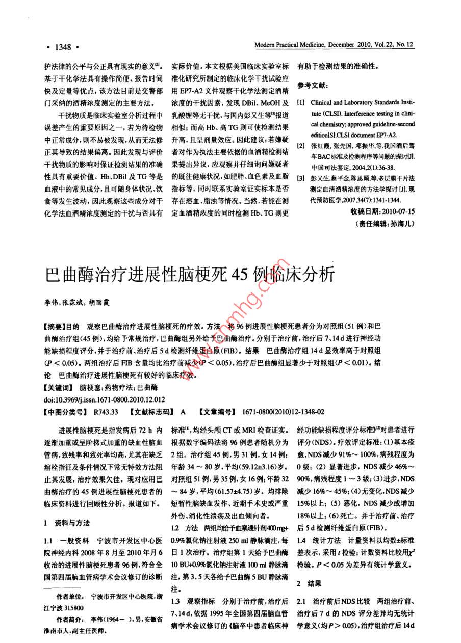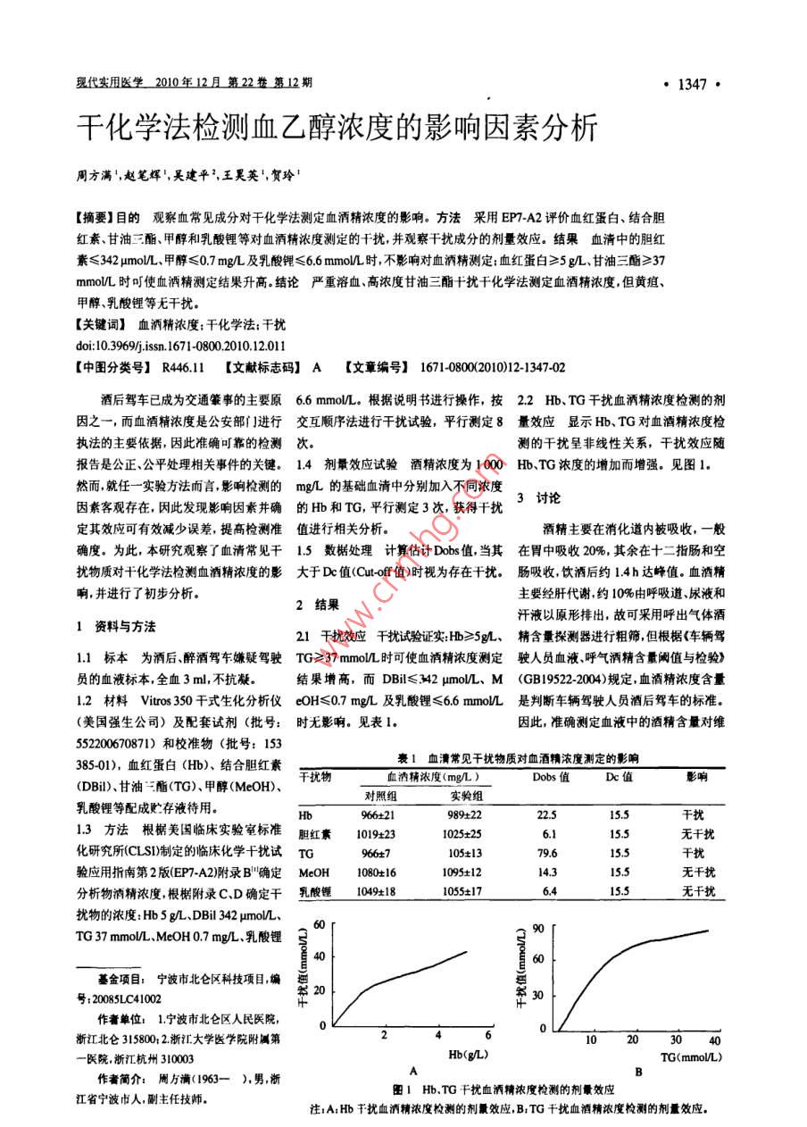 現(xiàn)代實(shí)用醫(yī)學(xué)2010年12月第22卷第12期1347·干化學(xué)法檢測(cè)血乙醇濃度的影響因素分析周方滿',趙筆輝',吳建平2王昊英,賀玲【摘要】目的觀察血常見(jiàn)成分對(duì)干化學(xué)法測(cè)定血酒精濃度的影響。方法采用EP7A2評(píng)價(jià)血紅蛋白、結(jié)合膽紅素、甘油三酯、甲醇和乳酸鋰等對(duì)血酒精濃度測(cè)定的干擾,并觀察干擾成分的劑量效應(yīng)。結(jié)果血清中的膽紅素≤342mo、甲醇≤07mg/L及乳酸鋰≤66 mmolL時(shí),不影響對(duì)血酒精測(cè)定;血紅蛋白≥5g/L、甘油三酯≥37mmoL時(shí)可使血灑精測(cè)定結(jié)果升高結(jié)論嚴(yán)重溶血、高濃度甘油三酯干擾干化學(xué)法測(cè)定血酒精濃度,但黃疸、甲醇、乳酸鋰等無(wú)干擾【關(guān)鍵詞】血酒精濃度:干化學(xué)法;干擾do:10.3969/issn1671-0800.2010.1201l【中圖分類(lèi)號(hào)】R44611【文獻(xiàn)標(biāo)志碼】A【文章編號(hào)】167108002010)12134702酒后駕車(chē)已成為交通肇事的主要原66 mmolL。根據(jù)說(shuō)明書(shū)進(jìn)行操作,按22Hb、TG干擾血酒精濃度檢測(cè)的劑因之一,而血酒精濃度是公安部門(mén)進(jìn)行交互順序法進(jìn)行干擾試驗(yàn),平行測(cè)定8量效應(yīng)顯示Hb、TG對(duì)血酒精濃度檢執(zhí)法的主要依據(jù),因此準(zhǔn)確可靠的檢測(cè)次。測(cè)的干擾呈非線性關(guān)系,干擾效應(yīng)隨報(bào)告是公正、公平處理相關(guān)事件的關(guān)鍵。14劑量效應(yīng)試驗(yàn)酒精濃度為1000Hb、TG濃度的增加而增強(qiáng)。見(jiàn)圖1然而就任一實(shí)驗(yàn)方法而言影響檢測(cè)的mgL的基礎(chǔ)血清中分別加入不同濃度因素客觀存在,因此發(fā)現(xiàn)影響因素并確的Hb和TG,平行測(cè)定3次,獲得干擾3討論定其效應(yīng)可有效減少誤差,提高檢測(cè)準(zhǔn)值進(jìn)行相關(guān)分析。酒精主要在消化道內(nèi)被吸收,一般確度。為此,本研究觀察了血清常見(jiàn)干15數(shù)椐處理計(jì)算佔(zhàn)計(jì)Dobs值當(dāng)其在胃中吸收20%,其余在十二指腸和空擾物質(zhì)對(duì)干化學(xué)法檢測(cè)血酒精濃度的影大于Dc值(Cuo值)時(shí)視為存在干擾。腸吸收,飲酒后約14h達(dá)峰值。血酒精響,并進(jìn)行了初步分析。主要經(jīng)肝代謝,約10%由呼吸道、尿液和2結(jié)果汗液以原形排出,故可采用呼出氣體酒1資料與方法21千擾效應(yīng)干擾試驗(yàn)證實(shí)Hb≥5gL、精含量探測(cè)器進(jìn)行粗篩但根椐《車(chē)輛駕1.1標(biāo)本為酒后、醉酒駕乍嫌疑駕駛TG≥37mmoⅥL時(shí)可使血酒精濃度測(cè)定駛?cè)藛T血液、呼氣灑精含量閾值與檢驗(yàn)》員的血液標(biāo)本,全血3ml,不抗凝。結(jié)果增高,而DBi≤342μmoL、M(GB19522-2004)規(guī)定,血酒精濃度含量1.2材料 Vitros30千式生化分析儀cOH≤07mgL及乳酸鋰≤66mmoL是判斷車(chē)輛駕駛?cè)藛T酒后駕車(chē)的標(biāo)準(zhǔn)(美國(guó)強(qiáng)生公司)及配套試劑(批號(hào):時(shí)無(wú)影響。見(jiàn)表1因此,準(zhǔn)確測(cè)定血液中的酒精含量對(duì)維55200670871)和校準(zhǔn)物(批號(hào):15338501),血紅蛋白(Hb)、結(jié)合膽紅素1血清常見(jiàn)干擾物質(zhì)對(duì)血酒精濃度測(cè)定的影響(DBi)、甘油三酯(TG)、甲醇(MeOH)、干擾物血酒精濃度(mg/Dobs值Dc值影響對(duì)照組實(shí)驗(yàn)組乳酸鋰等配成貯存液待用。989±22干擾13方法根椐美國(guó)臨床實(shí)驗(yàn)室標(biāo)準(zhǔn)膽紅素10192310255無(wú)干擾化研究所CLS制定的臨床化學(xué)干擾試TG驗(yàn)應(yīng)用指南第2版EP7A2)附錄B確定MeOH1080±161095±12無(wú)干擾分析物酒精濃度根附錄C、D確定干乳酸鋰1049±181055±17擾物的濃度:Hb5g/L、DBi342moLTG37 mmolL, MeOH07mg、乳酸鋰s基金項(xiàng)目寧波市北倉(cāng)區(qū)科技項(xiàng)目編號(hào):20085LC41002作者單位:1.寧波市北侖區(qū)人民醫(yī)院,北侖3158002浙江大學(xué)醫(yī)學(xué)院附屬第102030一醫(yī)院浙江杭州310003TG(mmolL)作者簡(jiǎn)介:周方滿(1963-),男浙A田1HbTG干擾血酒精濃度檢測(cè)的劑量效應(yīng)江省寧波市人,副主任技師注1A1Hb千擾血酒精濃度檢測(cè)的劑景效應(yīng),B:TG干擾血酒精濃度檢測(cè)的劑量效應(yīng)1348Modern Practical Medicine, December 2010, Vol 22, No. 12護(hù)法律的公平與公正具有現(xiàn)實(shí)的意義口。實(shí)際價(jià)值。本文根椐美國(guó)臨床實(shí)驗(yàn)室標(biāo)有助于檢測(cè)結(jié)果的準(zhǔn)確性基于干化學(xué)法具有操作簡(jiǎn)便、報(bào)告時(shí)間準(zhǔn)化研究所制定的臨床化學(xué)干擾試驗(yàn)應(yīng)快及定量等優(yōu)點(diǎn),該方法目前是交警部用EP7A2文件觀察干化學(xué)法測(cè)定酒精璋考文獻(xiàn):門(mén)采納的酒精濃度測(cè)定的主要方法。濃度的干擾因素,發(fā)現(xiàn)DBil、MeOH及l(fā)] Clinical and Laboratory Standards Insti干擾物質(zhì)是臨床實(shí)驗(yàn)室分析過(guò)程中乳酸鋰等尤干擾,與國(guó)內(nèi)彭又生等報(bào)道 tute(CLSD. terference testing in clin誤差產(chǎn)生的重要原因之一,若為待檢物相似:而高Hb、高TG則可使檢測(cè)結(jié)果 al chemistry: approved guideline-secor中正常成分,則不易被發(fā)現(xiàn)從而無(wú)法修升高,且呈劑量效應(yīng)因此建議:若嫌疑edition(s). clsi document EP7-A2.正其導(dǎo)致的結(jié)果偏離。因此發(fā)現(xiàn)與評(píng)價(jià)者對(duì)作為執(zhí)法主要依