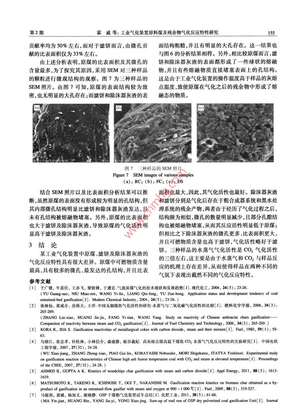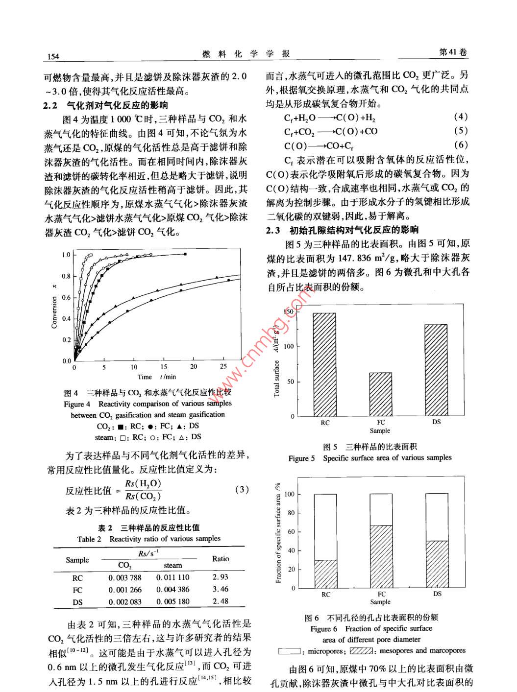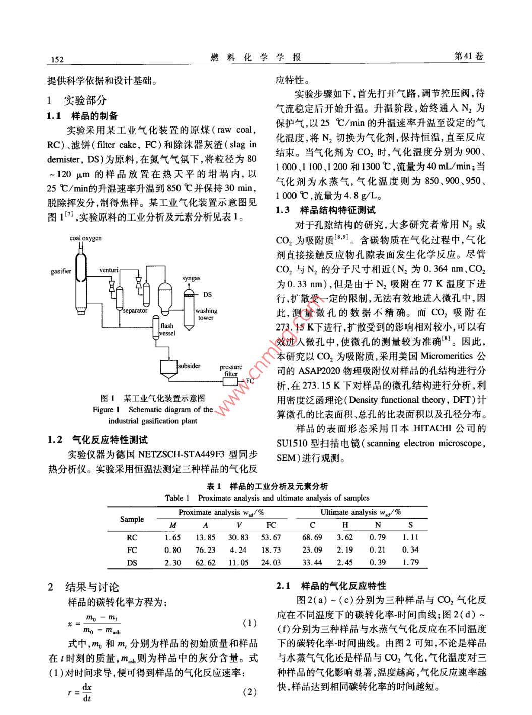 第41卷第2期燃料化學(xué)學(xué)報Vol.41 No.22013年2月Journal of Fuel Chemistry and TechnologyFeb. 2013文章編號: 0253-2409(2013 )02-0151-06工業(yè)氣化裝置原料煤及殘余物氣化反應(yīng)特性研究霍威',周志杰',王亦飛',于廣鎖',黃斌”, 張玉柱’(1.華東理工大學(xué)煤氣化及能源化工教育部重點實驗室,上海200237;2.神華寧夏煤業(yè)集團(tuán)煤炭化學(xué)工業(yè)分公司,寧夏銀川70004)摘要:考察了某工業(yè)氣化裝置中的原煤濾餅及除沫器灰渣在不同溫度下與水蒸氣和CO2的氣化反應(yīng)特性,采用掃描電子顯微鏡和吸附儀測試了樣品的初始結(jié)構(gòu)及表面特性。研究表明,采用相同氣化劑進(jìn)行氣化反應(yīng)時,原煤的氣化活性要高于除沫器灰渣,而除沫器灰渣的氣化活性則與濾餅相近但略好于濾餅。這主要是由于三種樣品的表面和內(nèi)部結(jié)構(gòu)存在很大的差異。由于水蒸氣和CO2與樣品的反應(yīng)機理存在差異,使得樣品的水蒸氣氣化活性比CO2氣化活性高三倍左右。關(guān)鍵詞:氣化反應(yīng)性;工業(yè)氣化裝置;水蒸氣氣化;二氧化碳?xì)饣袌D分類號: TQ54文獻(xiàn)標(biāo)識碼: AGasification reactivity of feed coal and residue from an industrial gasification plantHUO Wei' , ZHOU Zhi-je' , WANG Yi-fei' , YU Guang suo' , HUANG Bin2 , ZHANG Yu-zhu2(1. Key Laboratory of Coal Gasification and Energy Chemical Engineering, Ministry of Education,East China University of Science and Technology , Shanghai 200237, China;2. Shenghua Ningxia Coal Group Coal Chemical Industry Branch, Yinchuan 750004, China)Abstract: The gasification reactivity of raw coal, flter cake and the slag in demister from an industrialgasification plant was invetigated with steam and carbon dioxide as the gasification agent. The initial structureand surface characteristic of the samples were analyzed by scanning electron microscope and adsorptionapparatus. The results show that the gasification reactivity of the raw coal is better than that of the slag indemister, while the gasification reactivity of the slag is similar to or a bit better than that of filter cake, which ismainly atributed to the extraordinary difference of surface and intermal structure of these three samples. As aresult of different reaction mechanism with steam and CO2 , the gasification reactivity of the samples with steam isabout 3 times higher than that with CO2.Key words: gasification reactivity; industrial gasificaion plant; steam gasifcaion; carbon dioxide gasification中國煤炭資源豐富,煤炭產(chǎn)量持續(xù)增長,因此,CO2氣化反應(yīng)活性進(jìn)行研究,發(fā)現(xiàn)無煙煤焦與水蒸煤炭的合理利用尤為重要。近年來,氣流床煤炭氣氣氣化反應(yīng)的活性與無煙煤的煤化程度相對應(yīng),煤化技術(shù)成為煤炭高效潔凈利用的關(guān)鍵技術(shù)"。反化程度越高,水蒸氣反應(yīng)活性越小;而無煙煤與CO2應(yīng)活性高的煤炭在氣流床氣化過程中反應(yīng)速率快、氣化反應(yīng)的活性與煤中礦物質(zhì)的催化作用有關(guān)。效率高,并且能在保證穩(wěn)定生產(chǎn)能力的情況下,使氣Kora 等[3]) 發(fā)現(xiàn),褐煤和煙煤的水蒸氣氣化速率是化爐在較低溫度下運行,從而避免灰分結(jié)渣和影響CO2氣化速率的2~5倍。烏曉江等[41 對高灰熔點氣化過程。然而,在煤炭氣化的過程中會產(chǎn)生許多煤進(jìn)行了水蒸氣和CO2氣化反應(yīng)特性研究。氣化殘余物,這些殘余物主要是由轉(zhuǎn)化不完全的可Ahmed等[]考察了高壓下木屑片與水蒸氣和CO2燃物質(zhì)及無機礦物質(zhì)等組成。無論是從氣化整體的的氣化特性。Matsumoto 等[6]對生物質(zhì)焦進(jìn)行了水經(jīng)濟(jì)性,還是資源利用和環(huán)境保護(hù)的角度出發(fā),都需蒸 氣和CO2氣化反應(yīng)特性研究。要對氣化殘余物進(jìn)行轉(zhuǎn)化利用。因此,為了更好地為了更好地了解煤焦及其氣化后殘余物的氣化實現(xiàn)氣化殘余物的利用,有必要對其氣化反應(yīng)活性特性,本實驗針對某工業(yè)氣化裝置的原煤以及氣化進(jìn)行了解。后經(jīng)黑水處理的濾餅、粗合成氣處理系統(tǒng)中經(jīng)過除關(guān)于含碳物質(zhì)氣化反應(yīng)活性的研究,大多數(shù)研沫器后的灰渣,進(jìn)行了水蒸氣和CO2氣化反應(yīng)特性究者采用水蒸氣或CO2為氣化劑對其進(jìn)行研研究,比較了三者在不同溫度下的反應(yīng)特性差異以究[2-61。張林仙等21對中國六種無煙煤的水蒸氣和及在不同氣氛下的活性差異,為氣化殘余物的利用收稿日期: 201205-24;修回日期: 2012-07-26。聯(lián)系作者:于廣鎖,E-mail: gsyu@ ecust. edu. cn,Tel. : 021 64252974, Fax: 021 64251312。152燃料化學(xué)學(xué)報第41卷提供科學(xué)依據(jù)和設(shè)計基礎(chǔ)。應(yīng)特性。實驗步驟如下,首先打開氣路,調(diào)節(jié)控壓閥,待1實驗部分氣流穩(wěn)定后開始升溫。升溫階段,始終通入N2為1.1樣品的制備實驗采用某工業(yè)氣化裝置的原煤( raw coal,保護(hù)氣,以25C/min的升溫速率升溫至設(shè)定的氣RC)、濾餅( filter cake, FC)和除沫器灰渣(slag in化溫度,將N2切換為氣化劑,保持恒溫,直至反應(yīng)demister, DS)為原料,在氮氣氣氛下,將粒徑為80結(jié)束。當(dāng)氣化劑為CO2時,氣化溫度分別為900、~120 μm的樣品放置在熱天平的坩堝內(nèi),以1 000、1 100、1 200和1300 C ,流量為40 mL/min;當(dāng)25 C/ min的升溫速率升溫到850 C并保持30 min,氣化劑為水蒸氣,氣化溫度則為850、900、950、脫除揮發(fā)分,制得焦樣。某工業(yè)氣化裝