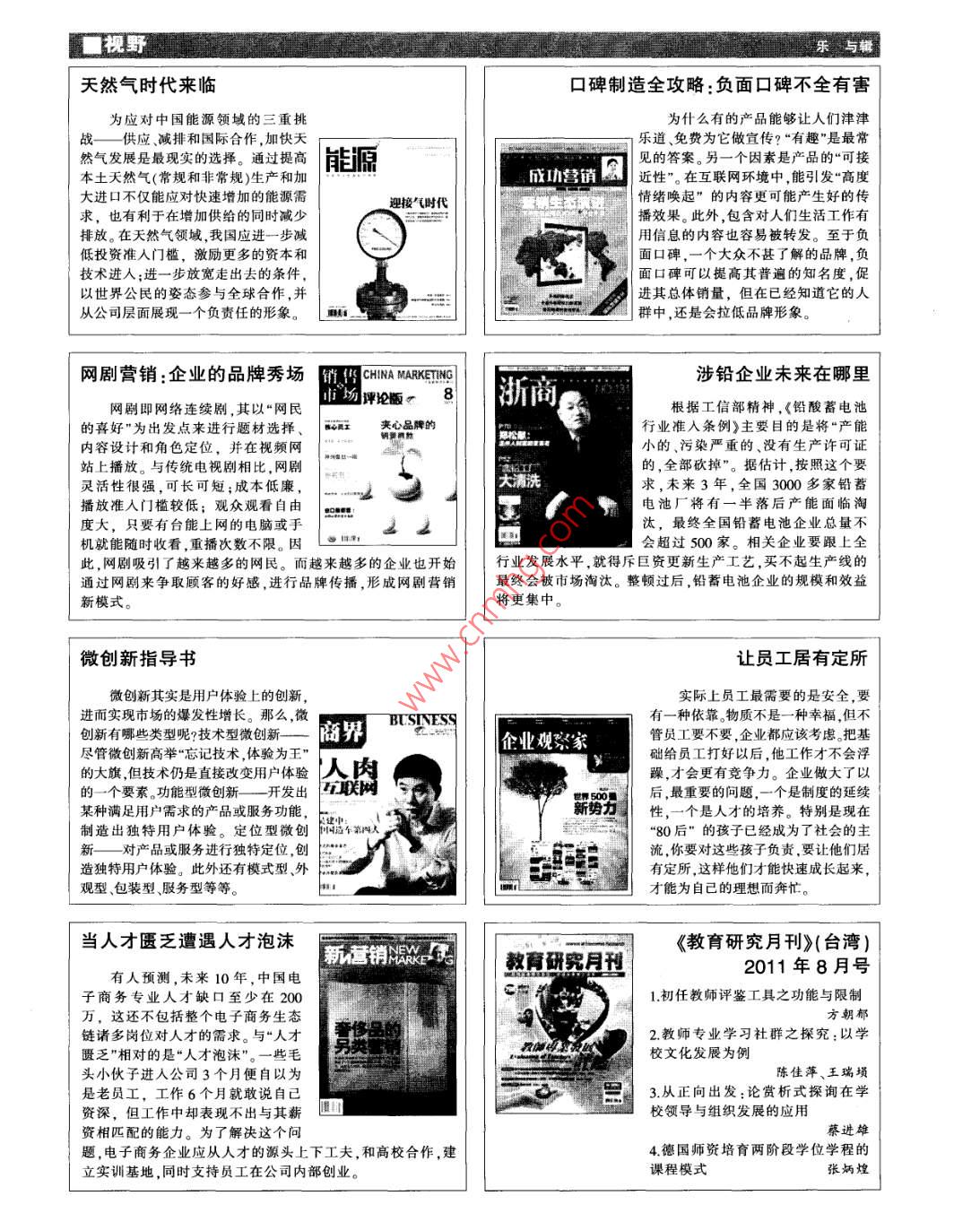 口碑制造全攻略:負面口碑不全有害天然氣時代來臨為什么有的產品能夠讓人們津津為應對中國能源領域的三重挑,樂道、免免費為它做宣傳?“有趣"是最常戰(zhàn)一供應 減排和國際示合作,加快天|見的答案。另一個因素是產品品的可接然氣發(fā)展是最現實的選擇。通過提高能源成功營銷2 I近性”。在互聯(lián)網環(huán)境中.能引發(fā)“高度本土天然氣(常規(guī)和非常規(guī))生產和加情緒喚起"的內容更可能產生好的傳大進口不僅能應對快速增加的能源需迎接氣時代播效果。此外,包含對人們生活工作有求,也有利于在增加供給的同時減少用信息的內容也容易被轉發(fā)。至于負放。在天然氣領域,我國應進一步減面口碑,一個大大眾不甚了解的品牌,負低投資準人門檻,激勵更多的資本和面口碑可以提高其普遍的知名度,促技術進人;進一步放寬走出去的條件,進其總體銷量,但在已經知道它的人以世界公民的姿態(tài)參與全球合作,并群中,還是會拉低品牌形象。從公司層面展現-個負責任的形象。涉鉛企業(yè)未來在哪里網劇營銷:企業(yè)的品牌秀場山場評論皈28CHINA MARKETING浙商|根據工信部精神,《鉛酸蓄電池網劇即網絡連續(xù)劇,其以“網民行業(yè)準入條例》主要目的是將“產能14R1的喜好"為出發(fā)點來進行題材選擇、小的,污染嚴重的、沒有生產許可證內容設計和角色定位,并在視頻網的,全部砍掉"。據估計,按照這個要站上播放。與傳統(tǒng)電視剛相比,網劇大清洗求,未來3年全國3000多家鉛蓄靈活性很強,可長可短;成本低康,電池廠將有一半落后產能面臨淘播放準入門檻較低;觀眾觀看自由0汰,最終全國鉛蓄電池企業(yè)總量不度大,只要有臺能上網的電腦或手區(qū)。E會超過500家。相關企業(yè)要跟上全機就能隨時收看,重播次數不限。因行業(yè)發(fā)展水平,就得斥巨資更新生產工藝,買不起生產線的此,網劇吸引了越來越來越多的網民。而越來越多的企業(yè)也開始最終會被市場淘汰。整頓過后,,鉛蓄電池企業(yè)的規(guī)模和效益好感進行品牌傳播,形成網劇營銷通過網劇來爭取顧客的好將更集中。新模式。讓員工居有定所微創(chuàng)新指導書實際上員工最需要的是安全,要一種幸福但不微創(chuàng)新其實是用戶體驗上的有一種依靠。物質不是一進而實現市場的爆發(fā)性增長。那么,微BUSINESS管員工要不要,企業(yè)都應該考慮。把基創(chuàng)新有哪些類型呢?技術型微創(chuàng)新-商界|企業(yè)觀察家礎給員工打好以后他工作才不會浮盡管微創(chuàng)新高舉“忘記技術,體驗為王”人肉躁,才會更有競爭力。企業(yè)做大了以的大旗,但技術仍是直接改變用戶體驗互聯(lián)網后,最重要的問題,-一個是制度的延續(xù)的一個要素。。功能型微創(chuàng)新-- 開發(fā)出新努力性,,一個是人才的培養(yǎng)。特別是現在戈服務功能,某種滿足用戶需求的產品或“80后”的孩子已經成為了社會的主制造出獨特用戶體驗。定位型微創(chuàng),流,你要對這些孩子負責,要讓他們居新對產品或服務進行獨特定位,創(chuàng)有定所,這樣他們才能快速成長起來,造獨特用戶體驗。此外還有模式型、外才能為自己的理想而奔忙。觀型包裝型、服務型等等?!督逃芯吭驴?臺灣)當人才匱乏遭遇人才泡沫新方 銷W教育研究月刊2011年8月號有人預測,未來10年,中國電1.初任教師評鑒I具之功能與限制子商務專業(yè)人才缺口至少在200方朝郁萬,這還不包括整個電子商務生態(tài)2.教師專業(yè)學習社群之探究:以學鏈諸多崗位對人才的需求。與“人才校文化發(fā)展為例陳佳萍、王瑞塤匱乏“相對的是“人才泡請”小日收為。一些毛頭小伙子進入公司3個)3.從正向出發(fā):論賞析式探詢在學是老員工,工作6個月就敢說自己校領導與組織發(fā)展的應用蔡進雄資深,但工作中卻表現不出與其薪資相匹配的能力。為了解決這個問4.德國師資培育兩階段學位學程的題,電子商務應從人才的源頭上下工夫,和高校合作,建課程模式張炳煌立實訓基地,同時支持員工在公司內部創(chuàng)業(yè)。