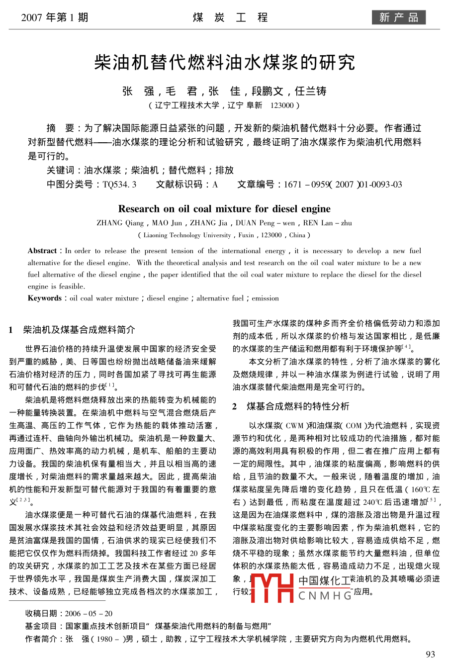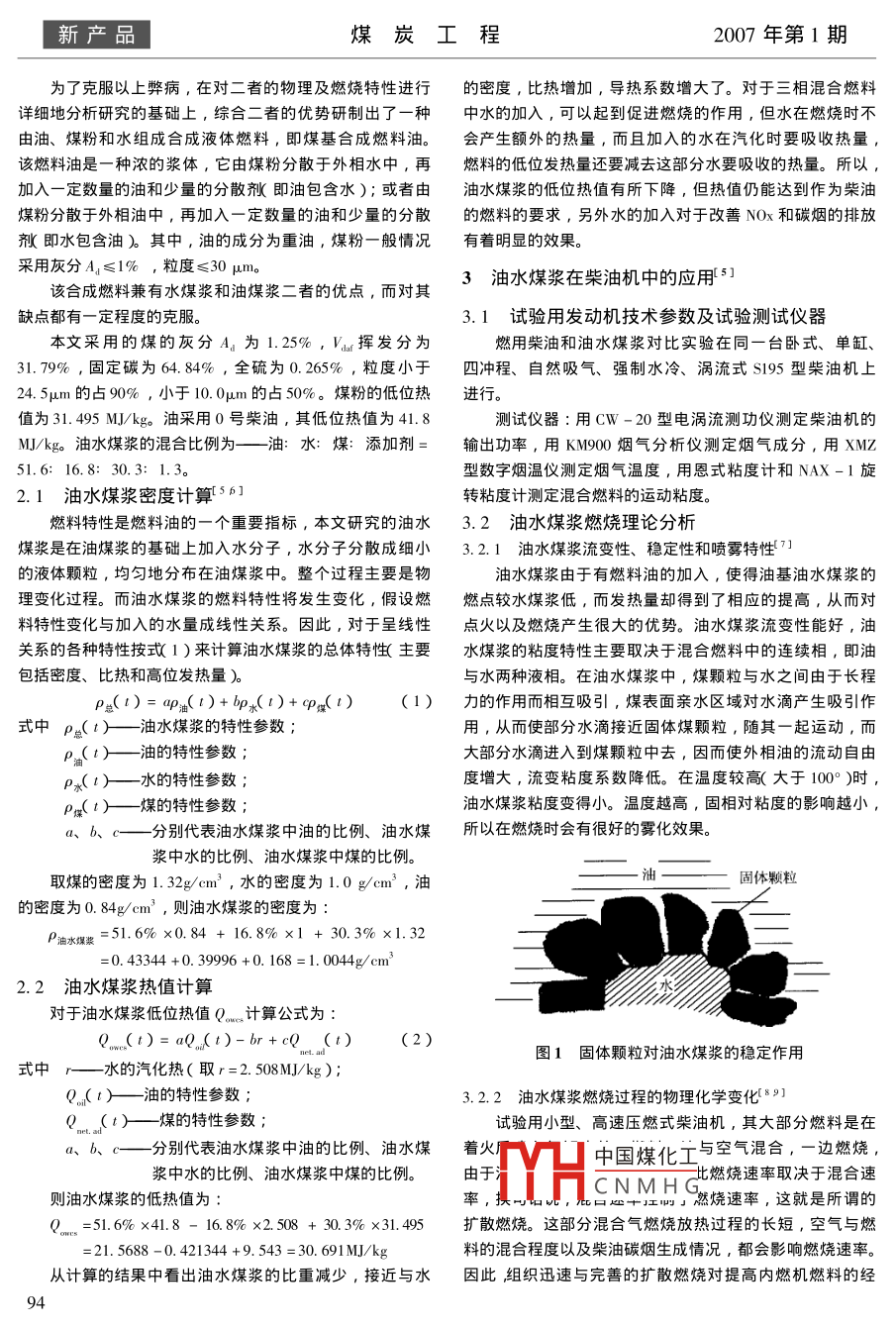 2007年第1期煤炭工程新產(chǎn)品柴油機(jī)替代燃料油水煤漿的研究張強(qiáng),毛君,張佳,段鵬文,任蘭鑄遼寧工程技術(shù)大學(xué),遼寧阜新123000摘要:為了解決國(guó)際能源日益緊張的問題,開發(fā)新的柴油機(jī)替代燃料十分必要。作者通過對(duì)新型替代燃料——油水煤漿的理論分析和試驗(yàn)硏究,最終證眀了油水煤漿作為柴油杋代用燃料是可行的。關(guān)鍵詞:油水煤漿;柴油機(jī);替代燃料;排放中圖分類號(hào):TQ534.3文獻(xiàn)標(biāo)識(shí)碼:A文章編號(hào):1671-0959(2007)01-009303Research on oil coal mixture for diesel engineZHANG Qiang, MAO Jun, ZHANG Jia, DUAN Peng -wen, REN Lan-zhuLiaoning Technology University Fuxin, 123000, ChinaAbstract: In order to release the present tension ofernational energyis necessary to develop a new fuelalternative for the diesel engine. With the theoretical analysis and test research on the oil coal water mixture to be a newfuel alternative of the diesel engine, the paper identified that the oil coal water mixture to replace the diesel for the dieselengine is feasibleKeywords: oil coal water mixture diesel engine alternative fuel emission1柴油機(jī)及煤基合成燃料簡(jiǎn)介我國(guó)可生產(chǎn)水煤漿的煤種多而齊全價(jià)格偏低勞動(dòng)力和添加劑的成本低,所以水煤漿的價(jià)格與發(fā)達(dá)國(guó)家相比,是低廉世界石油價(jià)格的持續(xù)升溫使發(fā)展中國(guó)家的經(jīng)濟(jì)安全受的水煤漿的生產(chǎn)儲(chǔ)運(yùn)和燃用都有利于環(huán)境保護(hù)等艸。到嚴(yán)重的威脅,美、日等國(guó)也紛紛拋出戰(zhàn)略儲(chǔ)備油來緩解本文分析了油水煤漿的特性,分析了油水煤漿的霧化石油價(jià)格對(duì)經(jīng)濟(jì)的壓力,同時(shí)各國(guó)加緊了尋找可再生能源及燃燒規(guī)律,并以一種油水煤漿為例進(jìn)行試驗(yàn),說明了用和可替代石油的燃料的步伐。油水煤漿替代柴油燃用是完全可行的。柴油機(jī)是將燃料燃燒釋放岀來旳熱能轉(zhuǎn)變?yōu)闄C(jī)械能ε一種能量轉(zhuǎn)換裝置。在柴油杋中燃料與空氣混合燃燒后產(chǎn)2煤基合成燃料的特性分析生高溫、高壓的工作氣體,它作為熱能的載體推動(dòng)活塞,以水煤漿(CwM廂和油煤漿(COM)為代油燃料,實(shí)現(xiàn)資再通過連桿、曲軸向外輸岀機(jī)械功。柴油杋是一種數(shù)量大、源節(jié)約和優(yōu)化,是兩種相對(duì)比較成功的代油措施,都對(duì)能應(yīng)用面廣、熱效率高的動(dòng)力機(jī)械,是機(jī)車、船舶的主要?jiǎng)釉吹母咝Ю镁哂蟹e極的作用,但二者在推廣應(yīng)用上都有力設(shè)備。我國(guó)的柴油機(jī)保有量相當(dāng)大,并且以相當(dāng)高的速一定的局限性。其中,油煤漿的粘度偏高,影響燃料的供度增長(zhǎng),對(duì)柴油燃料的需求量越來越大。因此,提髙柴油給,且節(jié)油的數(shù)量不大。一般來說,隨著溫度的增加,油機(jī)的性能和開發(fā)新型可替代能源對(duì)于我國(guó)的有著重要的意煤漿粘度呈先降后增的變化趨勢(shì),且只在低溫(160℃左右)達(dá)到最低,而粘度在溫度超過240℃后迅速增加3油水煤漿便是一種可替代石油的煤基代油燃料,在我這是因?yàn)樵谟兔簼{燃料中,煤的溶脹及溶岀物是升溫過程國(guó)發(fā)展水煤漿技術(shù)其社會(huì)效益和經(jīng)濟(jì)效益更明顯,其原因中煤漿粘度變化的主要影響因素,作為柴油機(jī)燃料,它的是貧油富煤是我國(guó)的國(guó)情,石油供求的現(xiàn)實(shí)已經(jīng)使我們不溶脹及溶岀物對(duì)供給影響比較大,容易造成供給不足,燃能把它僅僅作為燃料而燒掉。我國(guó)科技工作者經(jīng)過α0多年燒不平穩(wěn)的現(xiàn)象;雖然水煤漿能節(jié)約大量燃料油,但單位的攻關(guān)研究,水煤漿的加工工藝及技術(shù)在某些方面已經(jīng)居體積的水煤漿熱能太低,容易造成動(dòng)力不足,出現(xiàn)熄火現(xiàn)于世界領(lǐng)先水平,我國(guó)是煤炭生產(chǎn)消費(fèi)大國(guó),煤炭深加工象技術(shù)、設(shè)備成熟,已經(jīng)能夠獨(dú)立完成各檔次的水煤漿加工,行較H中國(guó)煤化工菜油機(jī)的及其噴嘴必須進(jìn)CNMHG應(yīng)用。收稿日期:2006-05-20基金項(xiàng)目:國(guó)家重點(diǎn)技術(shù)創(chuàng)新項(xiàng)目”煤基柴油代用燃料的制備與燃用作者簡(jiǎn)介∶張強(qiáng)(1980-)男,碩土,助教,遼寧工程技術(shù)大學(xué)機(jī)械學(xué)院,主要研究方向?yàn)閮?nèi)燃機(jī)代用燃料。93「新產(chǎn)品煤炭工程2007年第1期為了克服以上弊病,在對(duì)二者的物理及燃燒特性進(jìn)行的密度,比熱増加,導(dǎo)熱系數(shù)增大了。對(duì)于三相混合燃料詳細(xì)地分析研究的基礎(chǔ)上,綜合二者的優(yōu)勢(shì)研制岀了一種中水的加λ,可以起到促進(jìn)燃燒的作用,但水在燃燒時(shí)不由油、煤粉和水組成合成液體燃料,即煤基合成燃料油。會(huì)產(chǎn)生額外的熱量,而且加入的水在汽化時(shí)要吸收熱量該燃料油是一種濃的漿體,它由煤粉分散于外相水中,再燃料的低位發(fā)熱量還要減去這部分水要吸收的熱量。所以加入一定數(shù)量的油和少量的分散劑(即油包含水);或者由油水煤漿的低位熱值有所下降,但熱值仍能達(dá)到作為柴油煤粉分散于外相油中,再加入一定數(shù)量的油和少量的分散的燃料的要求,另外水的加入對(duì)于改善Nx和碳煙的排放艤即水包含油)其