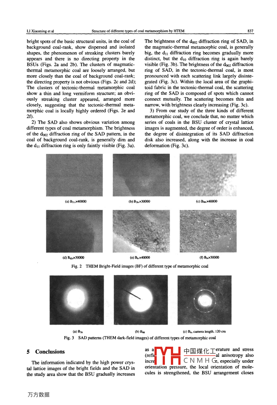 bleonlineatwwwwsciencedirect.comMININGScienceDirectSCIENCE ANDTECHNOLOGYELSEVIERining Science and Technology 20(2010)0835-0838ww.elsevier com/locate/jcumtStructure of different types of coal metamorphism by HTEMLI Xiaoming", CAO Daiyong?, LIU Demin".2a College of Safety Engineering, North China Institute of Science and Technology, Beijing 101601, Chinaollege of Geoscience and Surveying Engineering, China University of Mining Technology, Beijing 100083, chinaAbstract: In order to discuss the effect of tectonic stress on the structural evolution of coal, given the importance attached toHigh-resolution Transmission Electron MicrosHTEM), we investigated several aspects of material structures of high-rankCarboniferous period coal, located in the northern foreland basin of the Dabie orogenic belt in easterm China. High powlattice images of Bright Fields(BF)and Selected Area Diffraction patterns(SAD)of different types of metamorphism inobtained. The results show that the Basic Structural Units(BSU) become increasingly more compact as a function ofUnder pressure, the local orientation of molecules is strengthened, the arrangement of BSU speeds up and thelegree of order is clearly enhancedKeywords: Dabie orogenic belt; high-rank coal; high-resolution transmission electron microscopy; tectonic stress1 Introductionby coarse clastic rocks, where the tectonic deforma-tion is strong and contains many coal beds. However,In recent years, High-resolution Transmission the growth of various coal beds has been extremelyElectron Microscopy (HTEM)is onemethods for studying material structures. It plays anThe thickness and the structure of these coal bedsimportant role in studying the macro-molecular change considerably in both trends and tendency. Thechemical structure of coal. The basic structural unit of level of thermal-evolution of coal is high, reachingcoal can be observed directly from crystal lattice the stage of anthracite to superanthracite. In generalstripe images, when enlarged several hundred thou- the values of the maximum vitrinite reflectancesand times. Observations by transmission electron (Ro. max)are more than 4%microscopy are paid increasingly more attentionGiven the complex tectonic-thermal evolution ofalong with thorough going research. HTEM is ap- Carboniferous coal seams, we collected sets of threeplied in the study of deformed coal, particularly de- types of coal samples for a comparative study. Theformed coal from different types of metamorphism in first set, Bo to Bo, was collected from the Ma'anshanspecial environments, as well as in the investigation area in the west of Shangcheng county in Henanof the essential effects of tectonic stress on the evolu- province, which is located in the N-S trend shearingtion of coalzone. It is intensely affected by tectonic-stress and isreferred to as tectonic-thermal metamorphic coal. The2 Geological background and samples in second set, B63 to B68, came from Pichong towardsthe studyhe east of Shangcheng county, adjacent to the Yang-shanian granitic intrusion. It is affected by high temCoal samples were collected from mine strata of perature as the result of granitic intrusion and is rethe Yangshan Group (Low Carboniferous)in the ferred to as magmatic-thermal metamorphic coal.TheBeihuaiyang area, at the northern edge of the Dabie third set, B26 to Bst, was collected from other smallMountain orogenic belt. The Beihuaiyang area decoal mines, located far from faults and magmaticveloped along with the coal-bearing strata dominatedbodies. This set reflects regional metamorphism; it iscalle中國煤化工 coal-rank. The-acteristics of these*Corresponding author. Tel: 86 10 61596816CNMHGEmail address: Ixm7010( 126. comdoi:10.1016S1674-5264(0960291-Xning Science and Technologyol. 20 No6Table 1 Information of coal samplesNo. Sampling siteGcological MacroscopicDeformationControlling factorB6 Ma'anshan mine C3Mylonitic coal Orientationinear and strip62312997ng deformation extinctioB2 Yangshan mine CiyScaly coal1577Regional heat4.9B6 Pichong mine CGranulated coal Anomalous high heatBrittle-ductile Sheet-like5.197B6 Pichong mine ClyCataclasticorientational pressuredeformation3 Experimentalthat displayed in Fig. Ic as flexible crape graphite3.2 Sample separation processing and experi3.1 Basic principlestIonsThe Transmission Electron Microscope(TEM)isVitrain or bright coal strips were hand-picked fromnot only a type of high resolution(0.3-1.0 nm)opti- raw coal samples and ground to a 200 mesh size aftercal microscope, but also a kind of effective mi- crushing. Then a mineral-free treatment was carriedcro-area diffraction installment. It can supply massiveout. At first, the coal samples were heated with hyamounts of information on micro-structures while the drochloric acid and hydrofluoric acid in a water-bathappearance of the material can be observed directly (60-80C), removing carbonate, silicon dioxide,With a TEM. the transmission electron beam or the silicates and other impurities from the coal. Secondly,diffraction electron beam can be used separately to iron pyrites needed to be removed with nitric acidform images. The former beam can form images of from samples with a sulfur content 21%. Finally,theight fields and the second images of dark fields. In coal samples were scrubbed with water, dried andimages of bright fields, the streaking cluster of the ground to 0. 432 mm(325 mesh)BSU can be observed and in images of dark fields, aThe experiments were performed on JEM-2010,abright spot or a group of bright spots can be displayed High-Resolution Transmission Electron Microscopewhose dimensions and shapes are different because (UHRTEM)manufactured by the JEOL Company, inthe BSU of coal is a type of amorphous state material an electron microscope room for analysis and meas-of short range order. During the process of coal evo- urements at the Beijing University Center forlution, the images of bright fields and the Selected Chemical Technology. The LaB, filament 