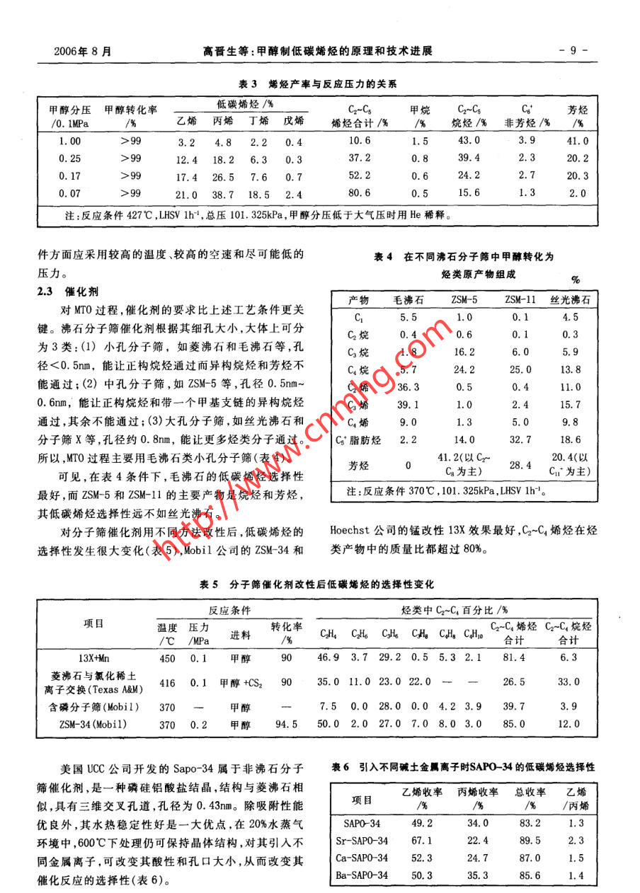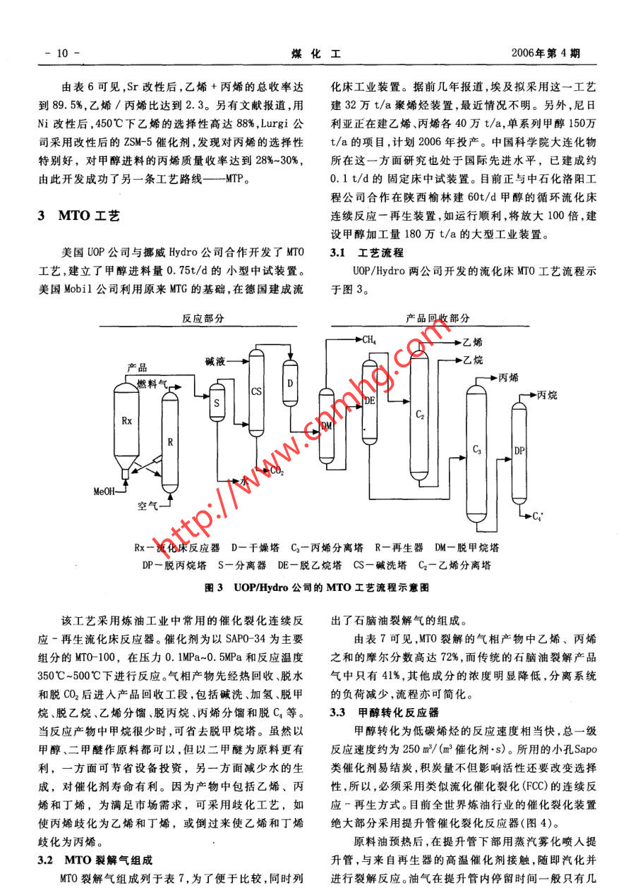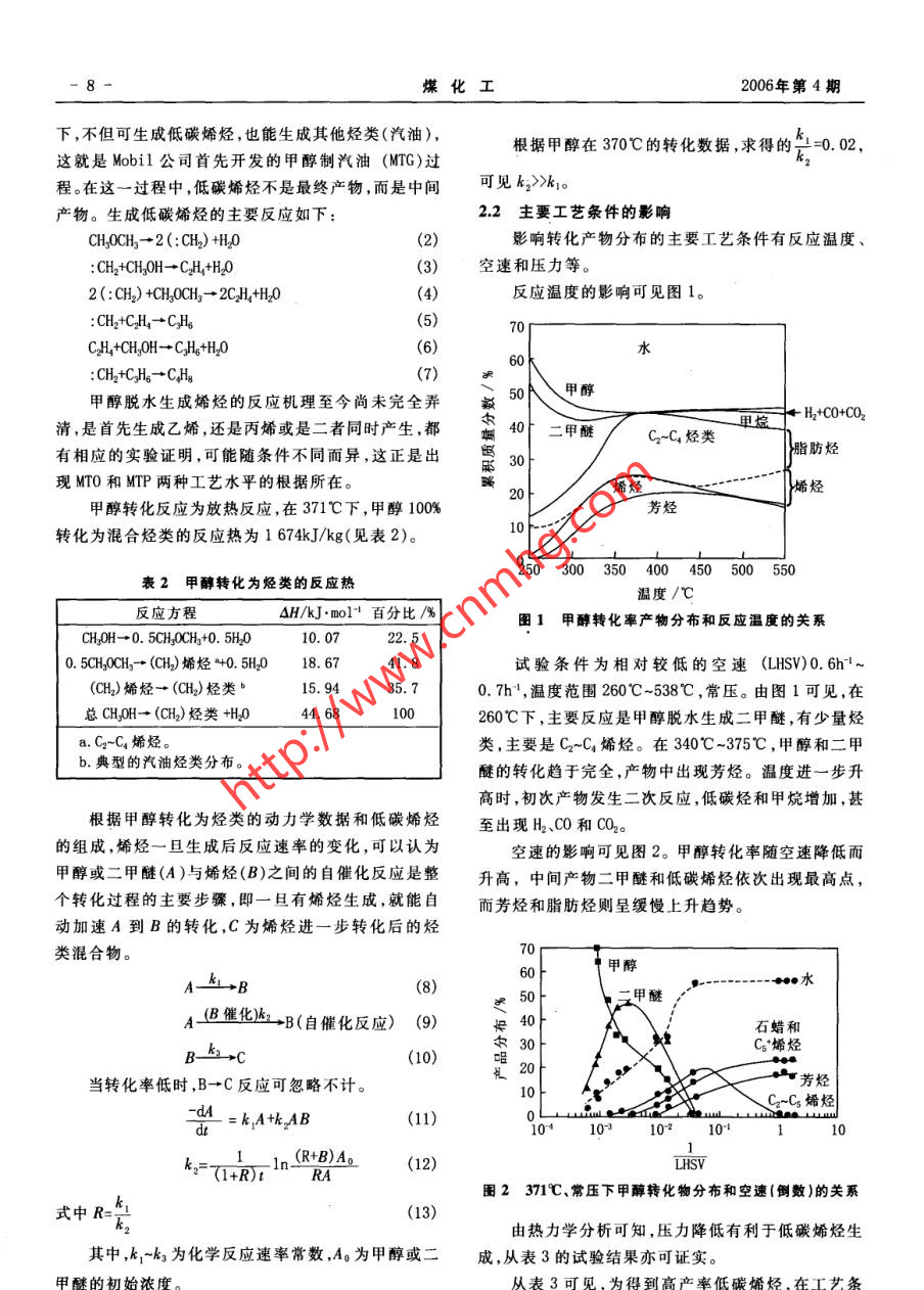 第4期(總第125期)煤化工No.4 (Total No.125)2006年8月Coal Chemical IndustryAug.2006甲醇制低碳烯烴的原理和技術進展高晉生張德祥(華東理工大學資源與環(huán)境工程學院,上海200237)摘妻從中國對烯烴的市場需求和前景出發(fā),介紹了甲醇制烯烴的原理催化劑和工藝的開發(fā)進展,比較甲醇制烯烴與傳統(tǒng)的石油化工制烯烴的產(chǎn)物分布和收率,并進行了不同工藝生產(chǎn)低碳烯烴的技術經(jīng)濟分.析,指出在中國開展煤基甲醇生產(chǎn)烯烴具有廣閻的發(fā)展空間。關鍵詞甲醇烯烴乙烯丙烯技術經(jīng)濟分析文章編號:1005-9598 (2006)-04-0007-07中 圖分類號:TQ211文獻標 識碼:A乙烯需石腦油3.18t、輕柴油3.79t、乙烷1. 3t,同時1低碳烯烴的需求和來源分析得到的其他關聯(lián)產(chǎn)品分別為2.18t、2. 79t、0. 30t。表1為不同原料裂解法制烯烴的產(chǎn)物分布。低碳烯烴(這里指乙烯和丙烯)是最重要的基本表1不同原料裂解法制烯烴的產(chǎn)物分布%有機化工原料,也是石油化工的龍頭產(chǎn)品。2005年我國乙烯生產(chǎn)能力已達到773萬t,當年產(chǎn)量756萬t,原料乙烯丙烯丁二烯混合芳烴其他乙烷84.01.4 1.40.412.8但只能滿足需求的40. 2%(包括進口來料加工再出輕石腦油40.3 15.8 4.9 .4.834. 2口)。預計2010年乙烯產(chǎn)量為1 000萬t,而需求量將全沸程石腦油31.7 13.0 4. 7達到2500萬t~2 600萬t。在市場需求的推動下,乙輕柴油28.3 13.5 4.8 .10.9 42. 5烯工程在全國各地紛紛.上馬,包括即將投產(chǎn)、開工建重柴油25.0 12.4 4.811.246. 6設、批準立項和進行可行性研究在內(nèi)的乙烯項目,總生產(chǎn)能力合計已超過1 000萬t/a,每套裝置的生產(chǎn)目前生產(chǎn)烯烴的主要原料是石腦油。由于我國原能力都在60萬t/a~100萬t/a范圍??梢娢覈蚁┯偷募庸つ芰σ堰_到3. 28億t/a,不可能與乙烯的生產(chǎn)正在面臨前所未有的大好發(fā)展機遇。丙烯是乙烯生產(chǎn)規(guī)模同步增長,故我國烯烴生產(chǎn)將面臨原料短缺的關聯(lián)產(chǎn)品,需求量也很大。2004年我國丙烯消耗量的問題,預計2010年缺乙烯原料油500萬t,2020 年為634.6萬t, 其消費構成如下:聚丙烯74. 9%,丙烯進一步增加到1 400萬t。腈10.1%,環(huán)氧丙烷5.9%,丁辛醇6.3%,其他2.8%。為滿足我國國民經(jīng)濟發(fā)展需求,開辟新的烯烴生預計2010年,丙烯需求量將達到1905萬t,而乙烯.產(chǎn)路線已成為當務之急。所以甲醇制烯烴(MTO 和.裝置聯(lián)產(chǎn)丙烯的生產(chǎn)能力只有1 080萬t,缺口高達MTP)應運而生,受到人們普遍的關注。825萬t。因此,有人建議烯烴生產(chǎn)應以“雙中心”(乙烯和丙烯)代替迄今為止的“一中心"(乙烯)。2甲 醇轉(zhuǎn)化為低碳烯烴的化學原理石油化工制取低碳烯烴主要靠裂解法,其原料有2.1主要化學反 應和反應動力學石腦油(輕和全沸程)、柴油(輕、重)和乙烷。生產(chǎn)1t由甲醇轉(zhuǎn)化為烴類的反應是一個十分復雜的反應系統(tǒng),包括許多平行和順序反應,其總反應式可表收稿日期:2006-05-27作者簡介:高晉生(1939- ), 男,1961年畢業(yè)于華東化工示如下:-H20學院燃料化工專業(yè),1979年-1981年在德國Clausthal工CH.OH-一CH.0CH,→Cz~Cj-一烯烴+烷烴+業(yè)大學進修并獲工學博士學位,教授,博士生導師,長期從環(huán)烷烴+芳烴(汽油)(1)事煤化工科研與教學工作??梢娂状荚诰哂行芜x功能的分子篩催化劑作用煤化工2006年第4期下,不但可生成低碳烯烴,也能生成其他烴類(汽油),根據(jù)甲醇在370"C的轉(zhuǎn)化數(shù)據(jù),求得的.后2=0. 02,這就是Mobil公司首先開發(fā)的甲醇制汽油(MTG)過程。在這一過程中,低碳烯烴不是最終產(chǎn)物,而是中間可見kz>>kq。產(chǎn)物。生成低碳烯烴的主要反應如下:2.2主要工藝 條件的影響CHJ0CH3→2(:CH2) +H20影響轉(zhuǎn)化產(chǎn)物分布的主要工藝條件有反應溫度.:CH,+CHf0H→CHl+H2O(3)空速和壓力等。2(:CH2) +CHJ0CH,→2CH+H2O(4)反應溫度的影響可見圖1。:CH,+CH- -CH(5)70 rCH4+CHjOH→CH+H20(6)水50 t:CH2+CH。→CHg7)甲醇甲醇脫水生成烯烴的反應機理至今尚未完全弄電信+ H+C0+CO2清,是首先生成乙烯,還是丙烯或是二者同時產(chǎn)生,都.昌40「二甲醚C~C,烴類有相應的實驗證明,可能隨條件不同而異,這正是出.武30}脂肪烴現(xiàn)MTO和MTP兩種工藝水平的根據(jù)所在。烯烴甲醇轉(zhuǎn)化反應為放熱反應,在371'C下,甲醇100%芳烴10一轉(zhuǎn)化為混合烴類的反應熱為1 674kJ/kg(見表2)。250 300 350 400 450 500 550表2甲醇轉(zhuǎn)化為烴類的反 應熱溫度/C反應方程AH/kJ.mol+百分比/%圍1甲醇轉(zhuǎn)化率產(chǎn) 物分布和反應溫度的關系CHJ0H→0. 5CH,OCH.+O. 5H00. 0722.50. 5CH0OCH5→(CH)烯烴+0. 5H2018.6741.8試驗條件為相對較低的空速(LHSV)0. 6h'~(CH)烯烴→(CH)烴類b15.9435.70.7h',溫度范圍260C~538"C,常壓。由圖1可見,在總CHJ0H→(CH)烴類+H2044. 68100260C下,主要反應是甲醇脫水生成二甲醚,有少量烴a. C2~C,烯烴。類,主要是C2~Cs烯烴。在340C~375"C ,甲醇和二甲b.典型的汽油烴類分布。醚的轉(zhuǎn)化趨于完全,產(chǎn)物中出現(xiàn)芳烴。溫度進一步升高時,初次產(chǎn)物發(fā)生二次反應,低碳烴和甲烷增加,甚根據(jù)甲醇轉(zhuǎn)化為烴類的動力學數(shù)據(jù)和低碳烯烴至出現(xiàn)H2、C0和C02。的組成,烯烴- .旦生成后反應速率的變化,可以認為空速的影響可見圖2。甲醇轉(zhuǎn)化率隨空速降低而甲醇或二甲醚(A)與烯烴(B)之間的自催化反應是整升高,中間產(chǎn)物二甲醚和