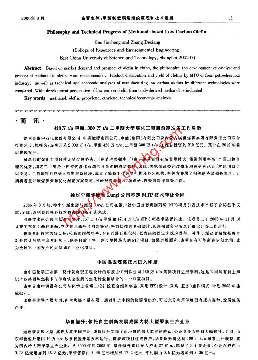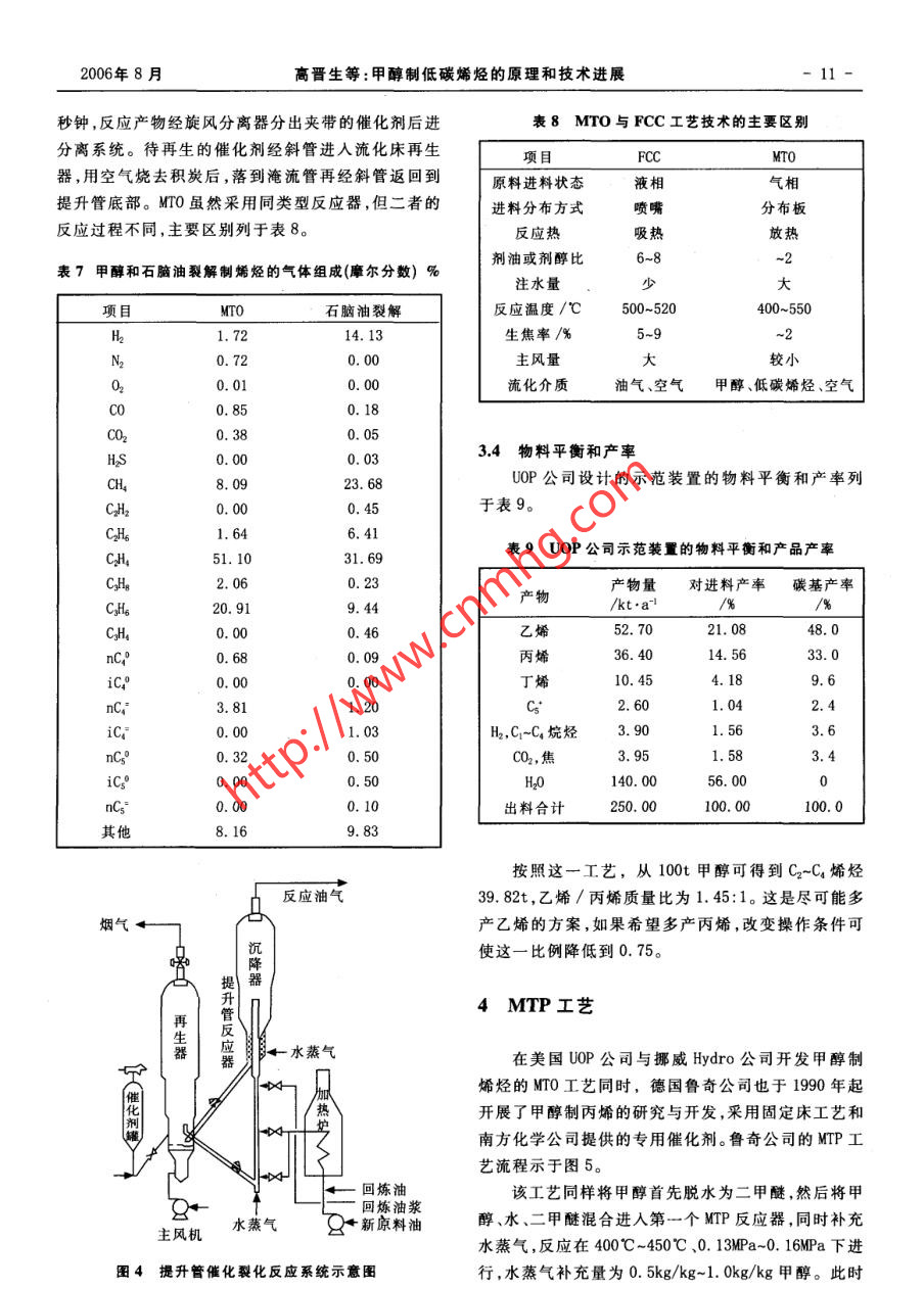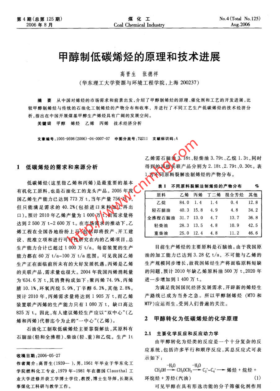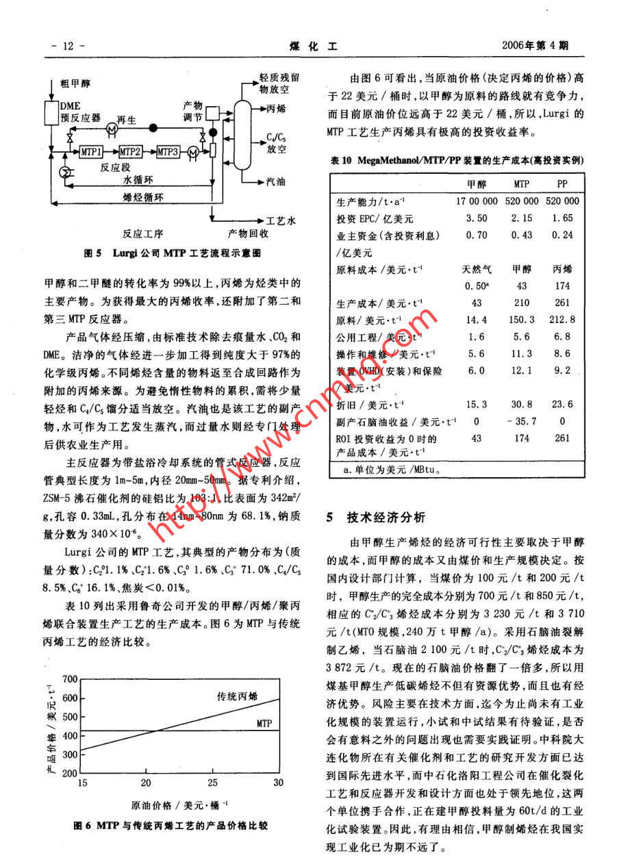 第4期(總第125期)煤化工No.4 (Total No.125)2006年8月Coal Chemical IndustryAug.2006甲醇制低碳烯烴的原理和技術進展高晉生張德祥(華東理工大學資源與環(huán)境工程學院,上海200237)摘妻從中國對烯烴的市場需求和前景出發(fā),介紹了甲醇制烯烴的原理催化劑和工藝的開發(fā)進展,比較甲醇制烯烴與傳統(tǒng)的石油化工制烯烴的產(chǎn)物分布和收率,并進行了不同工藝生產(chǎn)低碳烯烴的技術經(jīng)濟分.析,指出在中國開展煤基甲醇生產(chǎn)烯烴具有廣閻的發(fā)展空間。關鍵詞甲醇烯烴乙烯丙烯技術經(jīng)濟分析文章編號:1005-9598 (2006)-04-0007-07中 圖分類號:TQ211文獻標 識碼:A乙烯需石腦油3.18t、輕柴油3.79t、乙烷1. 3t,同時1低碳烯烴的需求和來源分析得到的其他關聯(lián)產(chǎn)品分別為2.18t、2. 79t、0. 30t。表1為不同原料裂解法制烯烴的產(chǎn)物分布。低碳烯烴(這里指乙烯和丙烯)是最重要的基本表1不同原料裂解法制烯烴的產(chǎn)物分布%有機化工原料,也是石油化工的龍頭產(chǎn)品。2005年我國乙烯生產(chǎn)能力已達到773萬t,當年產(chǎn)量756萬t,原料乙烯丙烯丁二烯混合芳烴其他乙烷84.01.4 1.40.412.8但只能滿足需求的40. 2%(包括進口來料加工再出輕石腦油40.3 15.8 4.9 .4.834. 2口)。預計2010年乙烯產(chǎn)量為1 000萬t,而需求量將全沸程石腦油31.7 13.0 4. 7達到2500萬t~2 600萬t。在市場需求的推動下,乙輕柴油28.3 13.5 4.8 .10.9 42. 5烯工程在全國各地紛紛.上馬,包括即將投產(chǎn)、開工建重柴油25.0 12.4 4.811.246. 6設、批準立項和進行可行性研究在內(nèi)的乙烯項目,總生產(chǎn)能力合計已超過1 000萬t/a,每套裝置的生產(chǎn)目前生產(chǎn)烯烴的主要原料是石腦油。由于我國原能力都在60萬t/a~100萬t/a范圍??梢娢覈蚁┯偷募庸つ芰σ堰_到3. 28億t/a,不可能與乙烯的生產(chǎn)正在面臨前所未有的大好發(fā)展機遇。丙烯是乙烯生產(chǎn)規(guī)模同步增長,故我國烯烴生產(chǎn)將面臨原料短缺的關聯(lián)產(chǎn)品,需求量也很大。2004年我國丙烯消耗量的問題,預計2010年缺乙烯原料油500萬t,2020 年為634.6萬t, 其消費構成如下:聚丙烯74. 9%,丙烯進一步增加到1 400萬t。腈10.1%,環(huán)氧丙烷5.9%,丁辛醇6.3%,其他2.8%。為滿足我國國民經(jīng)濟發(fā)展需求,開辟新的烯烴生預計2010年,丙烯需求量將達到1905萬t,而乙烯.產(chǎn)路線已成為當務之急。所以甲醇制烯烴(MTO 和.裝置聯(lián)產(chǎn)丙烯的生產(chǎn)能力只有1 080萬t,缺口高達MTP)應運而生,受到人們普遍的關注。825萬t。因此,有人建議烯烴生產(chǎn)應以“雙中心”(乙烯和丙烯)代替迄今為止的“一中心"(乙烯)。2甲 醇轉(zhuǎn)化為低碳烯烴的化學原理石油化工制取低碳烯烴主要靠裂解法,其原料有2.1主要化學反 應和反應動力學石腦油(輕和全沸程)、柴油(輕、重)和乙烷。生產(chǎn)1t由甲醇轉(zhuǎn)化為烴類的反應是一個十分復雜的反應系統(tǒng),包括許多平行和順序反應,其總反應式可表收稿日期:2006-05-27作者簡介:高晉生(1939- ), 男,1961年畢業(yè)于華東化工示如下:-H20學院燃料化工專業(yè),1979年-1981年在德國Clausthal工CH.OH-一CH.0CH,→Cz~Cj-一烯烴+烷烴+業(yè)大學進修并獲工學博士學位,教授,博士生導師,長期從環(huán)烷烴+芳烴(汽油)(1)事煤化工科研與教學工作??梢娂状荚诰哂行芜x功能的分子篩催化劑作用煤化工2006年第4期下,不但可生成低碳烯烴,也能生成其他烴類(汽油),根據(jù)甲醇在370"C的轉(zhuǎn)化數(shù)據(jù),求得的.后2=0. 02,這就是Mobil公司首先開發(fā)的甲醇制汽油(MTG)過程。在這一過程中,低碳烯烴不是最終產(chǎn)物,而是中間可見kz>>kq。產(chǎn)物。生成低碳烯烴的主要反應如下:2.2主要工藝 條件的影響CHJ0CH3→2(:CH2) +H20影響轉(zhuǎn)化產(chǎn)物分布的主要工藝條件有反應溫度.:CH,+CHf0H→CHl+H2O(3)空速和壓力等。2(:CH2) +CHJ0CH,→2CH+H2O(4)反應溫度的影響可見圖1。:CH,+CH- -CH(5)70 rCH4+CHjOH→CH+H20(6)水50 t:CH2+CH。→CHg7)甲醇甲醇脫水生成烯烴的反應機理至今尚未完全弄電信+ H+C0+CO2清,是首先生成乙烯,還是丙烯或是二者同時產(chǎn)生,都.昌40「二甲醚C~C,烴類有相應的實驗證明,可能隨條件不同而異,這正是出.武30}脂肪烴現(xiàn)MTO和MTP兩種工藝水平的根據(jù)所在。烯烴甲醇轉(zhuǎn)化反應為放熱反應,在371'C下,甲醇100%芳烴10一轉(zhuǎn)化為混合烴類的反應熱為1 674kJ/kg(見表2)。250 300 350 400 450 500 550表2甲醇轉(zhuǎn)化為烴類的反 應熱溫度/C反應方程AH/kJ.mol+百分比/%圍1甲醇轉(zhuǎn)化率產(chǎn) 物分布和反應溫度的關系CHJ0H→0. 5CH,OCH.+O. 5H00. 0722.50. 5CH0OCH5→(CH)烯烴+0. 5H2018.6741.8試驗條件為相對較低的空速(LHSV)0. 6h'~(CH)烯烴→(CH)烴類b15.9435.70.7h',溫度范圍260C~538"C,常壓。由圖1可見,在總CHJ0H→(CH)烴類+H2044. 68100260C下,主要反應是甲醇脫水生成二甲醚,有少量烴a. C2~C,烯烴。類,主要是C2~Cs烯烴。在340C~375"C ,甲醇和二甲b.典型的汽油烴類分布。醚的轉(zhuǎn)化趨于完全,產(chǎn)物中出現(xiàn)芳烴。溫度進一步升高時,初次產(chǎn)物發(fā)生二次反應,低碳烴和甲烷增加,甚根據(jù)甲醇轉(zhuǎn)化為烴類的動力學數(shù)據(jù)和低碳烯烴至出現(xiàn)H2、C0和C02。的組成,烯烴- .旦生成后反應速率的變化,可以認為空速的影響可見圖2。甲醇轉(zhuǎn)化率隨空速降低而甲醇或二甲醚(A)與烯烴(B)之間的自催化反應是整升高,中間產(chǎn)物二甲醚和