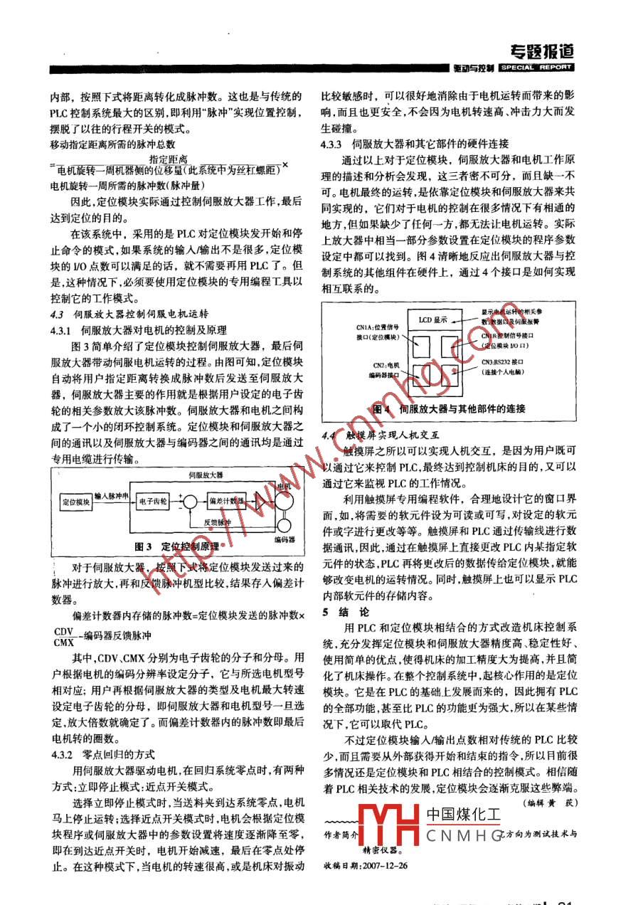 專(zhuān)題報(bào)道要?jiǎng)优c控制[ PECIAL"REPOR基于PLc技術(shù)的機(jī)床改造劉曉東,王卉(同濟(jì)大學(xué)機(jī)械學(xué)院先進(jìn)制造技術(shù)研究所,上海201804)摘要:主要介紹一種利用PLC改造機(jī)床控制系統(tǒng)的方法。通過(guò)實(shí)際和理論相結(jié)合闡述PLC在控制系統(tǒng)中所起的作用,即借助PLC組合技術(shù)提高機(jī)床的精度及效率,重點(diǎn)分析了定位模塊結(jié)合PLC實(shí)現(xiàn)位置控制的原理,并且闡述了人機(jī)交互的實(shí)現(xiàn)過(guò)程,最后總結(jié)了定位模塊相比PLC所特有的優(yōu)勢(shì)。關(guān)鍵詞:PLC;定位模塊;伺服放大器;人機(jī)交互中圖分類(lèi)號(hào):TM571文獻(xiàn)標(biāo)識(shí)碼:B文章編號(hào):1002-2333(2008)04-0029-03Improving Control System of Machine Based on PLCLIU Xiao-dong, WANG Hui(Mechanical College, Advanced Manvfacturing Technology Institute, Tongji University, Shanghai 201804, China)Abstract: It has introduced a kind of technology based on PLc using in improving control system of machine. It hasstated the function of PLC in control system by combining the practical and theory, which means how combination ofPLC technology works to improve the machine's precision and efficiency. It focuses on analyzing the control principleaccording to the combination of PLC and position module. And it has also described the realization of human-machineinteract, and concludes the advantage of position modules own compared with PLC in the end.Key words: PLC; position module; servo amplifier; human-machine interact1機(jī)床的運(yùn)動(dòng)及控制情況的位置決定采用由PLC作為控制元件,伺服電機(jī)帶動(dòng)絲待改造的機(jī)床用途是切割鋁條,將鋁條切割成需要杠運(yùn)轉(zhuǎn)的方式。由于系統(tǒng)中所有的硬件均為三菱公司的的長(zhǎng)度。鋁條用送料夾夾持送料,當(dāng)待切割的鋁條長(zhǎng)度不產(chǎn)品,因此不存在部件不兼容問(wèn)題。具體方案如下:樣時(shí),送料夾的橫向進(jìn)給行程也隨之改變,即送料夾進(jìn)2系統(tǒng)組成部件主要參數(shù)給運(yùn)動(dòng)的精度是機(jī)床加工的一個(gè)重要指標(biāo)PLC:輸入輸出點(diǎn)數(shù):64;定位模塊輸入輸出點(diǎn)數(shù):原機(jī)床利用行程開(kāi)關(guān)進(jìn)行左右限位,采用液壓和氣5;伺服放大器功率:600W;伺服電機(jī)最大輸出功率:動(dòng)系統(tǒng)驅(qū)動(dòng)繼電器,最終使機(jī)床的送料夾做橫向進(jìn)給運(yùn)1.5kW;伺服電機(jī)最大轉(zhuǎn)速:3000min;系統(tǒng)最小單位動(dòng);夾具夾緊、放松;刀具旋轉(zhuǎn)、上下行等動(dòng)作。工人在確001mm;脈沖率:6000sr;進(jìn)給率:5mmr;橫向進(jìn)給速定送料夾行程時(shí)要借助量尺,移動(dòng)左右行程開(kāi)關(guān)至目標(biāo)度:8000mm/min;絲杠螺距:5mm。位置然后固定。如果切削長(zhǎng)度發(fā)生變化,就需要再改變行2.2PLC與定位模塊控制的優(yōu)勢(shì)程開(kāi)關(guān)的位置重新進(jìn)行定位。這種定位方法主要靠肉眼22.1機(jī)械部分判斷,不僅操作麻煩,而且定位精度低。改造后的機(jī)床由PLC和定位模塊共同控制機(jī)床運(yùn)用PLC定位模塊以及伺服驅(qū)動(dòng)系統(tǒng)取代原來(lái)的液壓作。由于定位模塊的優(yōu)勢(shì),系統(tǒng)中不再需要原來(lái)用于定位和氣動(dòng)系統(tǒng),不僅使機(jī)床的控制系統(tǒng)更加穩(wěn)定,同時(shí)簡(jiǎn)化的限位開(kāi)關(guān)。驅(qū)動(dòng)系統(tǒng)也由原來(lái)的液壓驅(qū)動(dòng)變?yōu)樗欧帕藱C(jī)床的機(jī)械結(jié)構(gòu)。由于定位模塊的工作特點(diǎn),它可以承大器和伺服電機(jī)驅(qū)動(dòng)因此液壓缸,油泵等裝置都可以拆擔(dān)定位的任務(wù),而不再需要借助外界工具,所以大大地提除了。機(jī)床的機(jī)械結(jié)構(gòu)大大簡(jiǎn)化高了加工精度和工作效率,基于PLC技術(shù)的控制系統(tǒng)的22.2機(jī)床操作改動(dòng)和操作都非常方便。采用定位模塊完成定位的工作,只要將移動(dòng)的距離2系統(tǒng)改造方案通過(guò)觸摸屏輸入即可,不再需要借助量尺來(lái)確定送料夾改造的主要目的是提高機(jī)床的加工精度,即送料夾的進(jìn)給量,通過(guò)行程開(kāi)關(guān)來(lái)控制送料夾前進(jìn)或后退的位的橫向進(jìn)給量。為了保證送料夾精確地運(yùn)動(dòng)至用戶(hù)指定置,從而使機(jī)床的操作簡(jiǎn)單而且大大提高了工作效率[參考文獻(xiàn)][4]陳欠根,紀(jì)云鋒,吳萬(wàn)榮負(fù)載獨(dú)立流量分配(LUDV)控制系統(tǒng)[1]王長(zhǎng)江當(dāng)今挖掘機(jī)對(duì)液壓系統(tǒng)的要求及液壓系統(tǒng)的發(fā)展方向編輯吳天)J].工程機(jī)械與維修,1997(1):38-40.中國(guó)煤化工[2] Bosch- Rexroth行走機(jī)械用液壓及電子控制元件產(chǎn)品樣本[z].作者簡(jiǎn)CNMHG方向?yàn)闄C(jī)械電子工程。[3]付永領(lǐng)祁曉野 AMESim系統(tǒng)建模和仿真-從入門(mén)到精通[M]教授,博士研究生子師。北京:北京航空航天大學(xué)出版社,2006收稿日期:207-11-17機(jī)械工程師2008年第4期2專(zhuān)題報(bào)道SPECIALREP。RT驅(qū)動(dòng)與控制223控制部分(2)控制信號(hào)傳輸過(guò)程因?yàn)槎ㄎ荒K可以在內(nèi)部將輸入的距離(以毫米為機(jī)床的控制信號(hào)包括機(jī)械動(dòng)作和運(yùn)動(dòng)參數(shù)。用戶(hù)輸單位)轉(zhuǎn)化為脈沖伺服放大器通過(guò)數(shù)脈沖的數(shù)量控制電