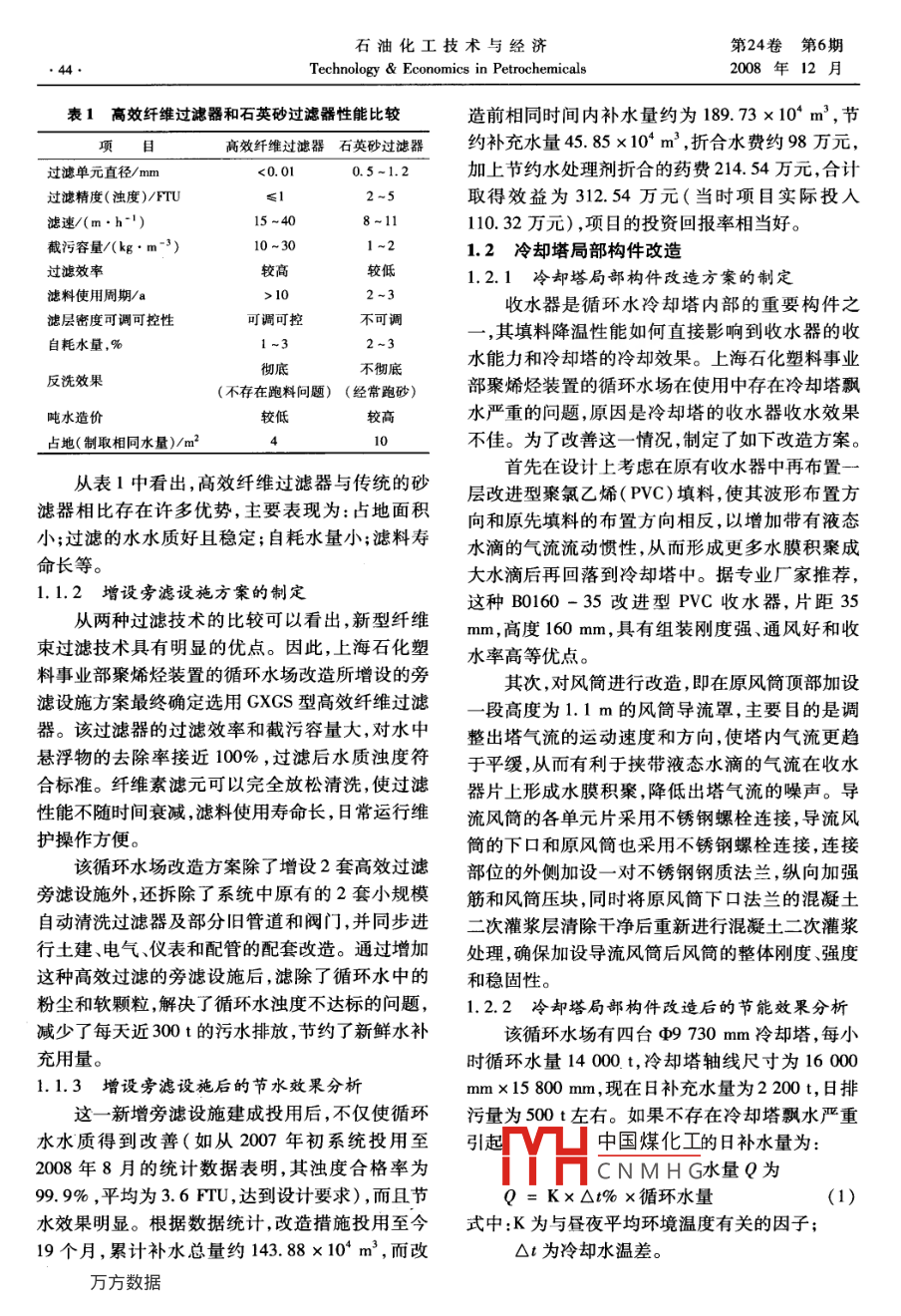 第24卷第6期石油化工技術(shù)與經(jīng)濟(jì)2008年12月Technology Economics in Petrochemicals石化裝置循環(huán)水場的技術(shù)改造毛春屏(中國石化上海石油化工股份有限公司塑料事業(yè)部,200540)摘要:介紹了中國石化上海石油化工股份有限公司塑料事業(yè)部在循環(huán)水場節(jié)能改造中一些技術(shù)措施的應(yīng)用情況,增設(shè)旁濾設(shè)施和改造冷卻塔構(gòu)件的措施具有良好的節(jié)水效果。探討了變頻技術(shù)對冷卻塔水泵和風(fēng)機(jī)的節(jié)電效果,改變藥劑處理方式與工業(yè)循環(huán)水清洗處理方式對提高水的利用率和減小環(huán)境污染的意關(guān)鍵詞;循環(huán)水場節(jié)能措施應(yīng)用文章編號:1674-1099(2008)06-0043-05中圖分類號:Tv991.41文獻(xiàn)標(biāo)識碼:A國家“十一五”規(guī)劃綱要中提出,到2010年環(huán)水場中的污水排放和新鮮水的補(bǔ)充量。目前,我國萬元GDP能耗要降低20%,主要污染物排放為這種過濾目的而增設(shè)的旁濾設(shè)施所采用的成熟減少10%,并將其列為重要的約束性指標(biāo)。上海技術(shù)主要有石英砂過濾技術(shù)和高效纖維過濾技是中國經(jīng)濟(jì)發(fā)展的龍頭,能源消耗和污染物排放術(shù),前者為傳統(tǒng)技術(shù),后者是近年來開發(fā)的新技的逐年遞減目標(biāo),使“節(jié)能減排”任務(wù)日益艱巨。術(shù),能減輕對周邊環(huán)境和水體的污染,節(jié)約新鮮補(bǔ)中國石化上海石油化工股份有限公司(以下簡稱充水的耗量,但在水處理效果、裝置占地面積、工上海石化)作為國內(nèi)重要的石油化工生產(chǎn)基地,程造價、運(yùn)行成本、水質(zhì)和水量的穩(wěn)定性及節(jié)水效每年除了完成上海市下達(dá)的綜合能源消費(fèi)量指標(biāo)果等方面存在差異。以外,還要完成中國石化集團(tuán)公司下達(dá)的萬元產(chǎn)1.L.I石英砂過濾器和高效纖維過濾器的性能值綜合能耗指標(biāo)。因此,圍繞“低成本戰(zhàn)略”展開比較的節(jié)能減排工作已成為上海石化的一項重要任傳統(tǒng)的砂濾器由于結(jié)構(gòu)形式所限,對提高過務(wù)濾效率的貢獻(xiàn)并不明顯。雖然減小濾料砂的顆粒對上海石化塑料事業(yè)部在循環(huán)水場中開展的尺寸可增大其比表面積從而提高過濾效率,但在節(jié)能改造措施的應(yīng)用進(jìn)行分析,在充分依托現(xiàn)有減小濾料尺寸的同時既增大了濾層過濾水壓頭的設(shè)施基礎(chǔ)上,通過一些成熟技術(shù)的應(yīng)用,達(dá)到了降損失,也增大了濾料在反沖洗操作及過濾操作時低能耗、減少循環(huán)水場生產(chǎn)運(yùn)行成本和節(jié)約費(fèi)用流失的機(jī)會。因此,砂濾技術(shù)及其他顆粒狀濾料的目的,為企業(yè)帶來了可觀的經(jīng)濟(jì)效益。過濾技術(shù)的過濾效率已受到限制。新型纖維束過濾技術(shù)采用軟填料,即以纖維節(jié)水措施束作為濾元,其濾料單絲直徑可達(dá)幾十微米甚至近年來,隨著水資源的日益緊張和水價的不幾微米,屬微米級濾料(砂濾料屬毫米級),具有斷上漲,石化企業(yè)的節(jié)水工作顯得尤為重要。由比表面積大,濾層可壓縮,堆積密度、過濾精度、過于循環(huán)水場系統(tǒng)的用水量一般占到企業(yè)總用水量濾阻力均可根據(jù)需要調(diào)整的特性,其濾層有序穩(wěn)的60%左右故在確保該系統(tǒng)正常運(yùn)行情況下節(jié)定,使用壽命可達(dá)15年以上。表1為高效纖維約用水,是節(jié)能的首要目標(biāo)。目前,企業(yè)在循環(huán)水過濾器和石英砂過濾器的性能比較。場系統(tǒng)所采用的節(jié)水措施主要有:采用高效過濾中國煤化工器、高效收水器等新型節(jié)水設(shè)備,優(yōu)化系統(tǒng)旁濾設(shè)CNMHG施和冷卻塔局部構(gòu)件;提高循環(huán)水濃縮倍數(shù)等。作者簡介:毛春屏,女,1966年出生,1988年畢業(yè)于上海石油1.1循環(huán)水場增設(shè)旁濾設(shè)施化工高等??茖W(xué)校高分子材料加工機(jī)械專業(yè),工程師,長期在工業(yè)生產(chǎn)中,通常采用過濾技術(shù)來減少循從事投資項目管理工作石油化工技術(shù)與經(jīng)濟(jì)第24卷第6期44Technology Economics in Petrochemicals2008年12月表1高效纖維過濾器和石英砂過濾器性能比較造前相同時間內(nèi)補(bǔ)水量約為18973×104m3,節(jié)項目高效纖維過濾器石英砂過濾器約補(bǔ)充水量45.85×10m3,折合水費(fèi)約98萬元過濾單元直徑/mm<0.01加上節(jié)約水處理劑折合的藥費(fèi)214.54萬元,合計過濾精度(濁度)/FTU取得效益為312.54萬元(當(dāng)時項目實際投入濾速/(m·h1)15~40110.32萬元),項目的投資回報率相當(dāng)好。截污容量/(kg·m3)1.2冷卻塔局部構(gòu)件改造過濾效率較高較低1.2.1冷卻塔局部構(gòu)件改造方案的制定濾料使用周期/a收水器是循環(huán)水冷卻塔內(nèi)部的重要構(gòu)件之濾層密度可調(diào)可控性可調(diào)可控不可調(diào)2~3其填料降溫性能如何直接影響到收水器的收自耗水量,%徹底不徹底水能力和冷卻塔的冷卻效果。上海石化塑料事業(yè)反洗效果(不存在跑料問題)(經(jīng)常跑砂)部聚烯烴裝置的循環(huán)水場在使用中存在冷卻塔飄噸水造價較低較高水嚴(yán)重的問題,原因是冷卻塔的收水器收水效果占地(制取相同水量)/m2不佳。為了改善這一情況,制定了如下改造方案從表1中看出,高效纖維過濾器與