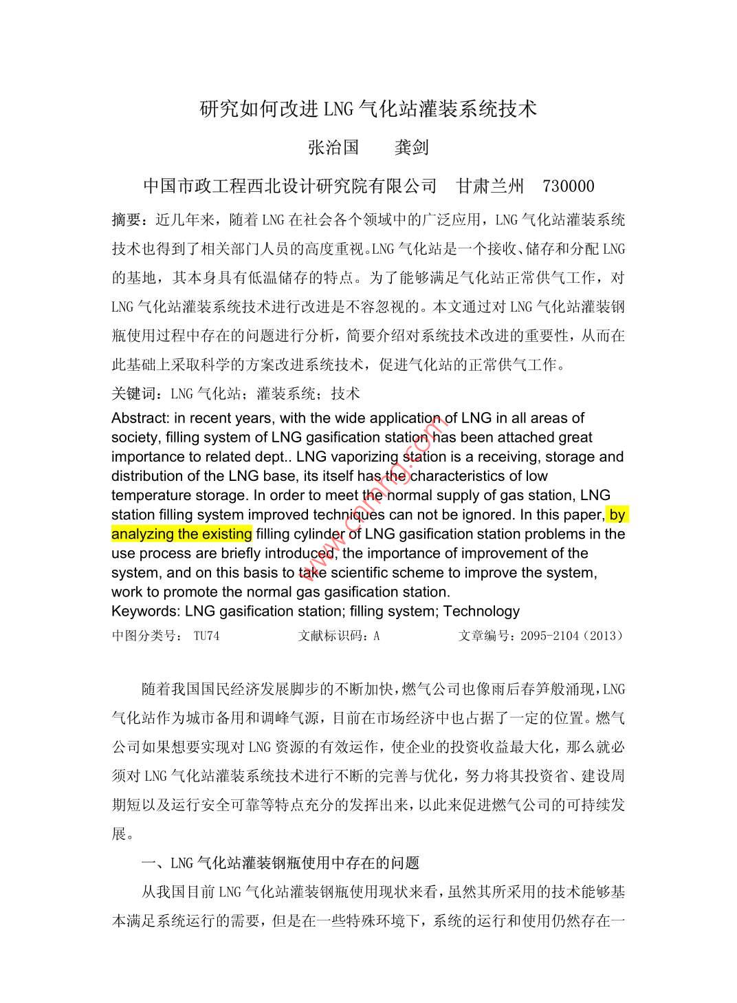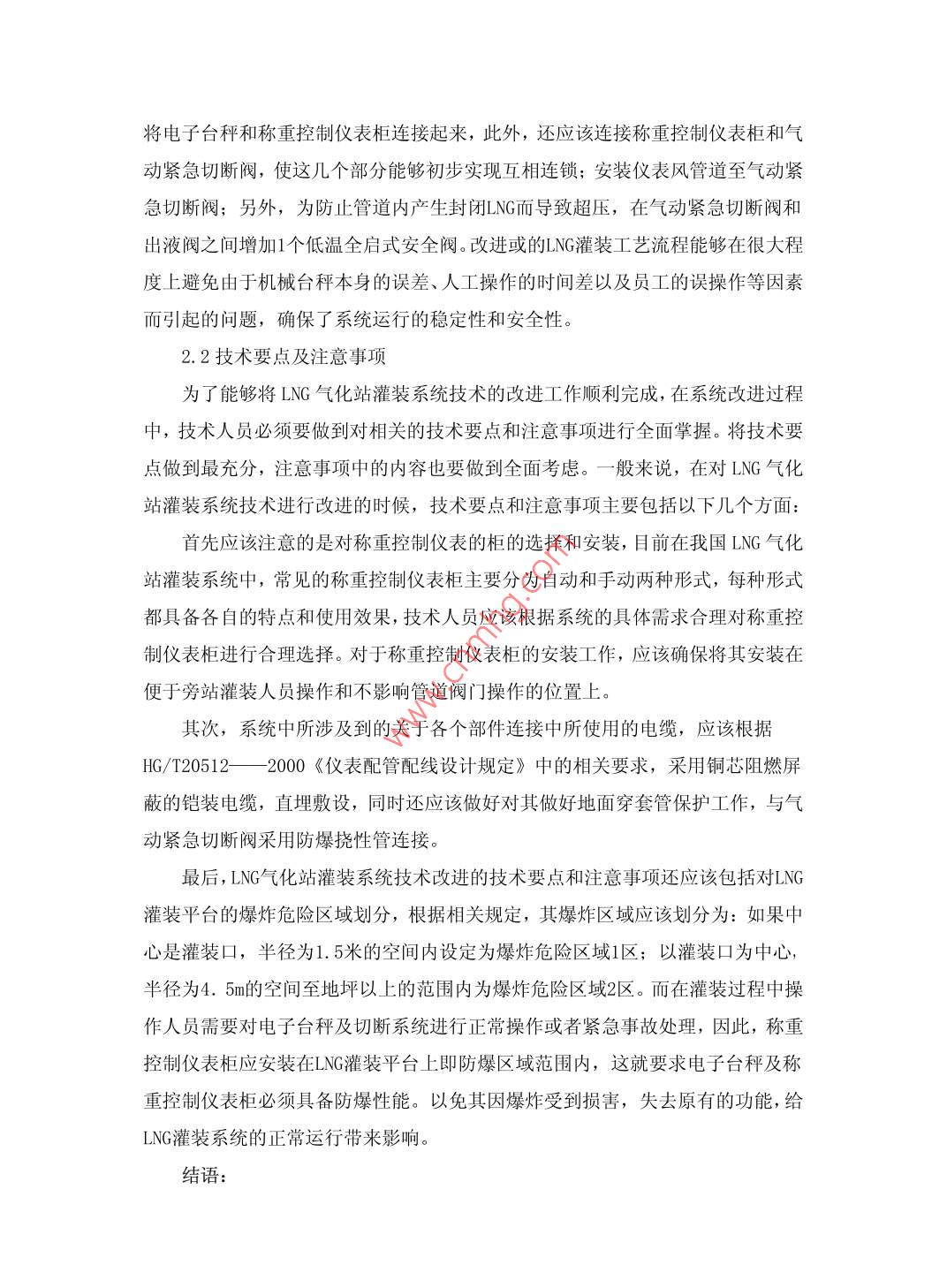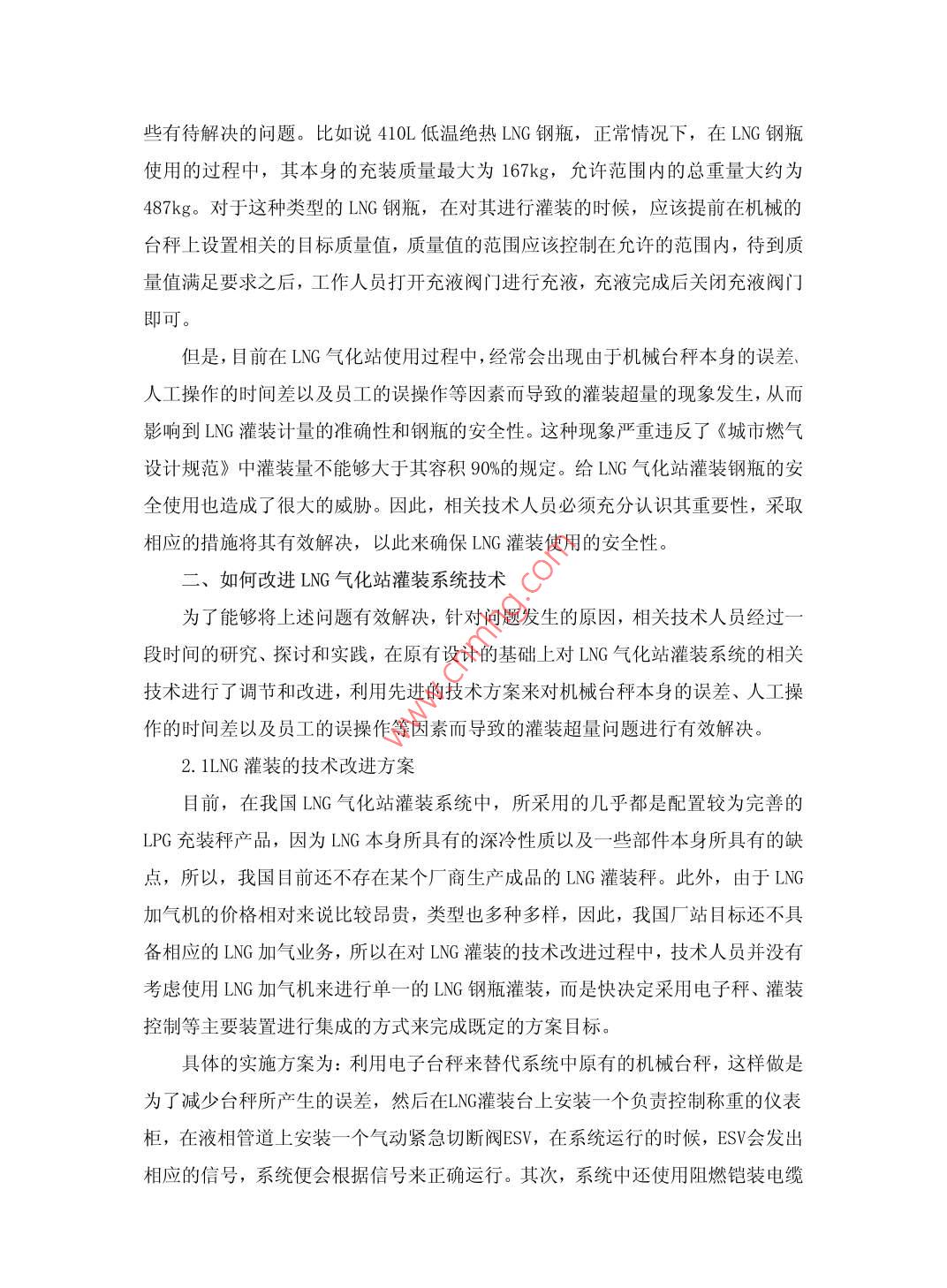 研究如何改進LNG氣化站灌裝系統(tǒng)技術張治國龔劍中國市政工程西北設計研究院有限公司甘肅蘭州 730000摘要:近幾年來,隨著LNG在社會各個領域中的廣泛應用,LNG氣化站灌裝系統(tǒng)技術也得到了相關部門人員的高度重視。LNG氣化站是一一個接收、儲存和分配LNG的基地,其本身具有低溫儲存的特點。為了能夠滿足氣化站正常供氣工作,對LNG氣化站灌裝系統(tǒng)技術進行改進是不容忽視的。本文通過對LNG氣化站灌裝鋼瓶使用過程中存在的問題進行分析,簡要介紹對系統(tǒng)技術改進的重要性,從而在此基礎上采取科學的方案改進系統(tǒng)技術,促進氣化站的正常供氣工作。關鍵詞: LNG 氣化站;灌裝系統(tǒng);技術Abstract: in recent years, with the wide application of LNG in all areas ofsociety, flling system of LNG gasification station has been attached greatimportance to related dept.. LNG vaporizing station is a receiving, storage anddistribution of the LNG base, its itself has the characteristics of lowtemperature storage. In order to meet the normal supply of gas station, LNGstation flling system improved techniques can not be ignored. In this paper, byanalyzing the existing flling cylinder of LNG gasification station problems in theuse process are briefly introduced, the importance of improvement of thesystem, and on this basis to take scientific scheme to improve the system,work to promote the normal gas gasification station.Keywords: LNG gasification station; flling system; Technology中圖分類號: TU74文獻標識碼: A文章編號: 2095-2104 (2013)隨著我國國民經濟發(fā)展腳步的不斷加快,燃氣公司也像雨后春筍般涌現(xiàn),LNG氣化站作為城市備用和調峰氣源,目前在市場經濟中也占據(jù)了- -定的位置。燃氣公司如果想要實現(xiàn)對LNG資源的有效運作,使企業(yè)的投資收益最大化,那么就必須對LNG氣化站灌裝系統(tǒng)技術進行不斷的完善與優(yōu)化,努力將其投資省、建設周期短以及運行安全可靠等特點充分的發(fā)揮出來,以此來促進燃氣公司的可持續(xù)發(fā)展。一、LNG 氣化站灌裝鋼瓶使用中存在的問題從我國目前LNG氣化站灌裝鋼瓶使用現(xiàn)狀來看,雖然其所采用的技術能夠基本滿足系統(tǒng)運行的需要,但是在一-些特殊環(huán)境下,系統(tǒng)的運行和使用仍然存在一些有待解決的問題。比如說410L低溫絕熱LNG鋼瓶,正常情況下,在LNG鋼瓶使用的過程中,其本身的充裝質量最大為167kg,允許范圍內的總重量大約為487kg。對于這種類型的LNG鋼瓶,在對其進行灌裝的時候,應該提前在機械的臺秤上設置相關的目標質量值,質量值的范圍應該控制在允許的范圍內,待到質量值滿足要求之后,工作人員打開充液閥門進行充液,充液完成后關閉充液閥門即可。但是,目前在LNG氣化站使用過程中,經常會出現(xiàn)由于機械臺秤本身的誤差、人工操作的時間差以及員工的誤操作等因素而導致的灌裝超量的現(xiàn)象發(fā)生,從而影響到LNG灌裝計量的準確性和鋼瓶的安全性。這種現(xiàn)象嚴重違反了《城市燃氣設計規(guī)范》中灌裝量不能夠大于其容積90%的規(guī)定。給LNG氣化站灌裝鋼瓶的安全使用也造成了很大的威脅。因此,相關技術人員必須充分認識其重要性,采取相應的措施將其有效解決,以此來確保LNG灌裝使用的安全性。二、如何改進LNG氣化站灌裝系統(tǒng)技術為了能夠將上述問題有效解決,針對問題發(fā)生的原因,相關技術人員經過一-段時間的研究、探討和實踐,在原有設計的基礎上對LNG氣化站灌裝系統(tǒng)的相關技術進行了調節(jié)和改進,利用先進的技術方案來對機械臺秤本身的誤差、人工操作的時間差以及員工的誤操作等因素而導致的灌裝超量問題進行有效解決。2.1LNG灌裝的技術改進方案目前,在我國LNG氣化站灌裝系統(tǒng)中,所采用的幾乎都是配置較為完善的LPG充裝秤產品,因為LNG本身所具有的深冷性質以及--些部件本身所具有的缺點,所以,我國目前還不存在某個廠商生產成品的LNG灌裝秤。此外,由于LNG加氣機的價格相對來說比較昂貴,類型也多種多樣,因此,我國廠站目標還不具備相應的LNG加氣業(yè)務,所以在對LNG灌裝的技術改進過程中,技術人員并沒有考慮使用LNG加氣機來進行單- -的LNG鋼瓶灌裝,而是快決定采用電子秤、灌裝控制等主要裝置進行集成的方式來完成既定的方案目標。具體的實施方案為:利用電子臺秤來替代系統(tǒng)中原有的機械臺秤,這樣做是為了減少臺秤所產生的誤差,然后在LNG灌裝臺上安裝-一個 負責控制稱重的儀表柜,在液相管道上安裝一- 個氣動緊急切斷閥ESV,在系統(tǒng)運行的時候,ESV會發(fā)出相應的信號,系統(tǒng)便會根據(jù)信號來正確運行。其次,系統(tǒng)中還使用阻燃鎧裝電纜將電子臺秤和稱重控制儀表柜連接起來,此外,還應該連接稱重控制儀表柜和氣動緊急切斷閥,使這幾個部分能夠初步實現(xiàn)互相連鎖;安裝儀表風管道至氣動緊急切斷閥;另外,為防止管道內產生封閉LNG而導致超壓,在氣動緊急切斷閥和出液閥之間增加1個低溫全啟式安全閥。改進或的LNG灌裝工藝流程能夠在很大程度上避免由于機械臺秤本身的誤差、人工操作的時間差以及員工的誤操作等因素而引起的問題,確保了系統(tǒng)運行的穩(wěn)定性和安全性。2.2技術要點及注意事項為了能夠將LNG氣化站灌裝系統(tǒng)技術的改進工作順利完成,在系統(tǒng)改進過程中,技術人員必須要做到對相關的技術要點和