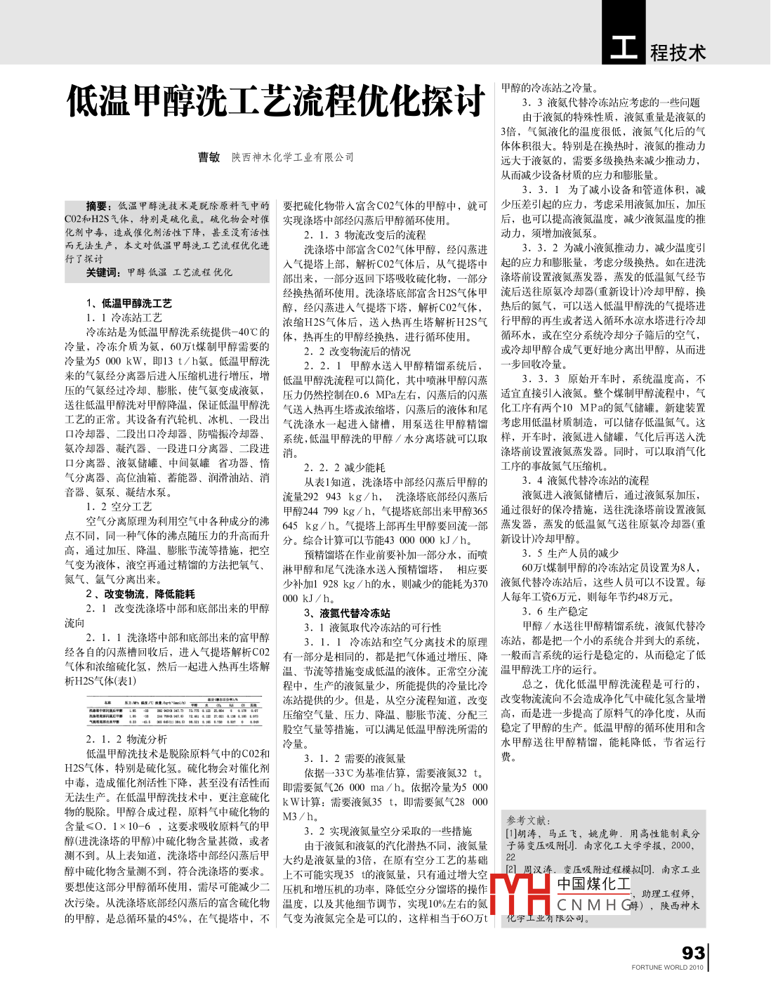工程技術(shù)低溫甲醇洗工藝流程優(yōu)化探討甲醇的冷凍站之冷量。3.3液氦代替冷凍站應(yīng)考慮的一些問題由于液氮的特殊性質(zhì),液氮重量是液氨的倍,氣氮液化的溫度很低,液氮?dú)饣蟮臍怏w體積很大。特別是在換熱時(shí),液氮的推動力曹敏陜西神木化學(xué)工業(yè)有限公司遠(yuǎn)大于液氨的,需要多級換熱來減少推動力從而減少設(shè)備材質(zhì)的應(yīng)力和膨脹量。3.3.1為了減小設(shè)備和管道體積,減摘要:低溫甲醇洗技術(shù)是脫除原料氣中的要把硫化物帶入富含C02氣體的甲醇中,就可少壓差引起的應(yīng)力,考慮采用液氮加壓,加壓C02和H2S氣體,特別是硫化氨。硫化物會對催實(shí)現(xiàn)滌塔中部經(jīng)閃蒸后甲醇循環(huán)使用。后,也可以提高液氮溫度,減少液氮溫度的推化劑中毒,造成催化劑活性下降,甚至沒有活性2.1.3物流改變后的流程動力,須增加液氮泵而無法生產(chǎn),本文對低溫甲醇洗工藝流程優(yōu)化進(jìn)洗滌塔中部富含C02氣體甲醇,經(jīng)閃蒸進(jìn)3.3.2為減小液氮推動力,減少溫度引行了探討入氣提塔上部,解析C02氣體后,從氣提塔中起的應(yīng)力和膨脹量,考慮分級換熱。如在進(jìn)洗關(guān)鍵詞:甲醇低溫工藝流程優(yōu)化部出來,一部分返回下塔吸收硫化物,一部分滌塔前設(shè)置液氮蒸發(fā)器,蒸發(fā)的低溫氮?dú)饨?jīng)節(jié)經(jīng)換熱循環(huán)使用。洗滌塔底部富含H2S氣體甲流后送往原氨冷卻器(重新設(shè)計(jì))冷卻甲醇,換1、低溫甲醇洗工藝醇,經(jīng)閃蒸進(jìn)入氣提塔下塔,解析C02氣體,熱后的氮?dú)?可以送入低溫甲醇洗的氣提塔進(jìn)1.冷凍站工藝濃縮H2S氣體后,送入熱再生塔解析H2氣行甲醇的再生或者送入循環(huán)水涼水塔進(jìn)行冷卻冷凍結(jié)是為低溫甲醉洗系統(tǒng)提供40℃的體,熱再生的甲醇經(jīng)換熱,進(jìn)行循環(huán)使用。循環(huán)水,或在空分系統(tǒng)冷卻分子篩后的空氣冷量,冷凍介質(zhì)為氨,60萬t煤制甲醇需要的2.2改變物流后的情況或冷卻甲醇合成氣更好地分離出甲醇,從而進(jìn)冷量為5000kW,即13t/h氨。低溫甲醇洗步回收冷量來的氣氨經(jīng)分離器后進(jìn)入壓縮機(jī)進(jìn)行增壓,增低溫甲醇洗流程可以簡化,其中噴淋甲醇閃蒸3.3.3原始開車時(shí),系統(tǒng)溫度高,不壓的氣氨經(jīng)過冷卻、膨脹,使氣氨變成液氨壓力仍然控制在0.6MP左右,閃蒸后的閃蒸適宜直接引入液氮。整個(gè)煤制甲醇流程中,氣送往低溫甲醇洗對甲醇降溫,保證低溫甲醇洗氣送入熱再生塔或濃縮塔,閃蒸后的液體和尾化工序有兩個(gè)10MPa的氮?dú)鈨蕖P陆ㄑb置工藝的正常。共設(shè)備有汽輪機(jī)冰機(jī)、一段出氣洗滌水一起進(jìn)入儲槽,用泵送往甲醇精餾考慮用低溫材顧制造,可以儲存低溫氮?dú)饪诶鋮s器、二段出口冷卻器、防喘振冷卻器系統(tǒng),低溫甲醇洗的甲醇/水分離塔就可以取樣,開車時(shí),液氮進(jìn)入儲罐,氣化后再送入洗氨冷卻器、凝汽器、一段進(jìn)口分離器、二段進(jìn)消。滌塔前設(shè)置液氮蒸發(fā)器。同時(shí),可以取消氣化口分離器、液氨儲罐、中間氨罐省功器、惰2.2.2減少能耗工序的事故氮?dú)鈮嚎s機(jī)氣分離器、高位油箱、蓄能器、潤滑油站、消從表1知道,洗滌塔中部經(jīng)閃蒸后甲醇的3.4液氮代替冷凍站的流程音器、氨泵、凝結(jié)水泵。流量292943kg/h,洗滌塔底部經(jīng)閃蒸后液氮進(jìn)入液氮儲槽后,通過液氮泵加壓,1.2空分工藝甲醇24490kg/h,氣提塔底部出來甲醇365通過很好的保冷措施,送往洗滌塔前設(shè)置液氮空氣分離原理為利用空氣中各種成分的沸65k/h,氣提塔上部再生甲醇要回流一部蒸發(fā)器,蒸發(fā)的低溫氟氣送住原氨冷卻器(重點(diǎn)不同,同一種氣體的沸點(diǎn)隨壓力的升高而升分。綜合計(jì)算可以節(jié)能430000新設(shè)計(jì)冷卻甲醇髙,通過加壓、降溫、膨脹節(jié)流等措施,把空預(yù)精餾塔在作業(yè)前要補(bǔ)加一部分水,而噴3.5生產(chǎn)人員的減少氣變?yōu)橐后w,液空再通過精留的方法把氧氣,淋甲醇和尾氣洗滌水送人預(yù)精餾塔,相應(yīng)要60萬煤制甲醇的冷凍站定員設(shè)置為人少補(bǔ)加1928kg/h的水,則減少的能耗為370液氮代替冷凍站后,這些人員可以不設(shè)置。每2、改變物流,降低能耗00kJ/h。人每年工資6萬元,則每年節(jié)約48萬元。2.1改變洗滌塔中部和底部出來的甲醇3、液氮代替冷凍站3.6生產(chǎn)穩(wěn)定流向3.1液氮取代冷凍站的可行性甲醇/水送往甲醇精餾系統(tǒng),液氮代替冷2.1.1洗滌塔中部和底部出來的富甲醇3.1.1冷凍站和空氣分離技術(shù)的原理凍站,都是把一個(gè)小的系統(tǒng)合并到大的系統(tǒng)經(jīng)各自的閃蒸槽回收后,進(jìn)入氣提塔解析C02有一部分是相同的,都是把氣體通過增壓、降一般而言系統(tǒng)的運(yùn)行是穩(wěn)定的,從而穩(wěn)定了低氣體和濃縮硫化氫,然后一起進(jìn)入熱再生塔解溫、節(jié)流等措施變成低溫的液體。正??辗至骷状枷垂ば虻倪\(yùn)析H2S氣體表1)程中,生產(chǎn)的液氮量少,所能提供的冷量比冷總之,優(yōu)化低溫甲醇洗流程是可行的“答(站起的少,是;從字分程知道,政變改變物選述向不念高樣氣化含股空氣量等措施,可以滿足低溫甲醇洗所需的穩(wěn)定了甲醇的生產(chǎn)。低溫甲醇的循環(huán)使用和含2.1.2物流分析冷量。水甲醇送