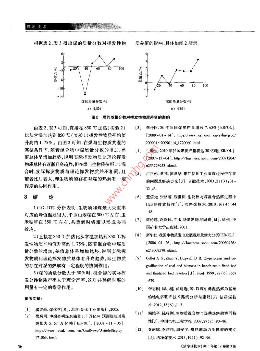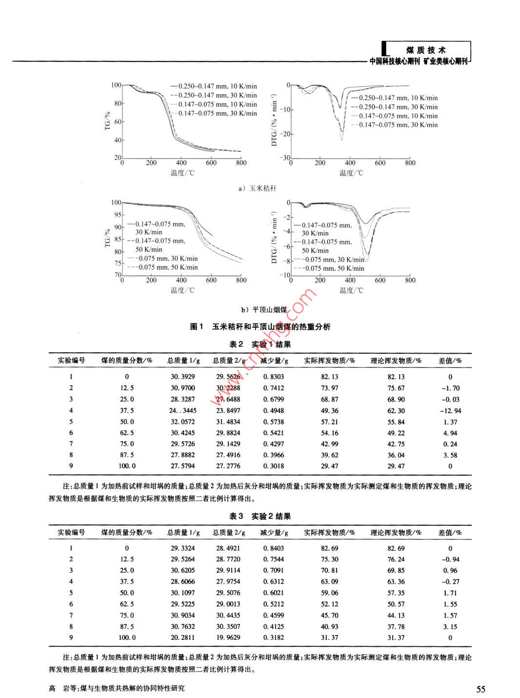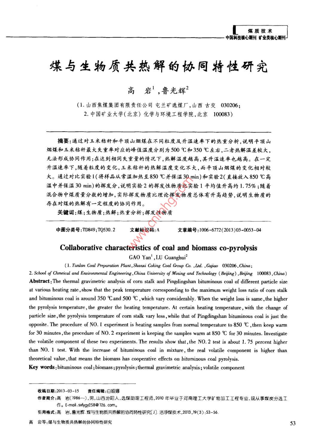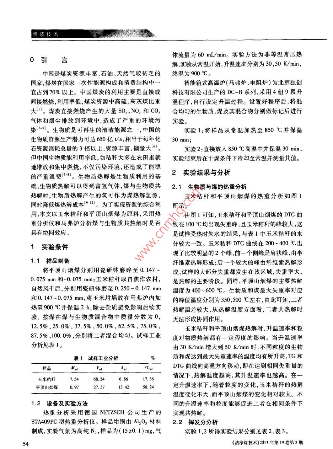 煤質(zhì)技術(shù). 中國科技核心期刊礦業(yè)類核心期刊J煤與生物質(zhì)共熱解的協(xié)同特性研究高巖',魯光輝2(1.山西焦煤集團有限責(zé)任公司屯蘭礦選煤廠,山西古交030206;2.中國礦業(yè)大學(xué)(北京)化學(xué)與環(huán)境工程學(xué)院,北京100083)摘要:通過對玉米秸稈和平頂山煙煤在不同粒度及升溫速率下的熱重分析,說明平頂山煙煤和玉米秸稈最大失重率對應(yīng)的峰值溫度分別為500 C和350 C左右,二者熱解溫差較大,無法形成協(xié)同作用;在達到相同失重量的情況下,熱解溫度越高,其升溫速率也越高。在一定升溫速率下,隨著粒度的變化,五米秸稈的熱解溫度變化不大,而平項山煙煤的變化相對較大。通過對比實驗1(將樣品從常溫加熱至850 C并保溫30 min)和實驗2(直接放入850 C高溫中并保溫30 min)的揮發(fā)分, 說明實驗2的揮發(fā)性物質(zhì)比實驗1平均值升高約1. 75% ;隨著混合物中煤質(zhì)量分數(shù)的增加,實際揮發(fā)物質(zhì)比理論揮發(fā)物質(zhì)總體有升高趨勢,說明生物質(zhì)的存在對煤的熱解有一-定程度的協(xié)同作用。關(guān)鍵詞:煤;生物質(zhì);熱解;熱重分析;揮發(fā)性物質(zhì)中圈分類號:TD849;TQ530.2文獻標識碼:A文章編號:1006-6772(2013)03-0053-04Collaborative characteristics of coal and biomass co-pyrolysisGAO Yan' ,LU Guanghui?(1. Tunlan Coal Preparation Plant , Shanxi Coking Coal Group Co. ,Ld. , Gyjao 030206 . China ;2. School of Chmeical and Ervironmenal Engineering , China University of Mining and Technology (Beijing) , Beijing 100083 ,China)Abstract:The thermal gravimetric analysis of corm stalk and Pingdingshan bituminous coal of diferent particle sizeat various heating rate , show that the peak temperature corresponding to the maximum weight loss ratio of corn stalkand bituminous coal is around 350 9 and 500 C , which vary considerably. When the weight loss is same , the higherthe pyrolysis temperature , the greater the heating temperature. At certain heating temperature , with the change ofparticle size , the pyrolysis temperature of cormn stalk vary less , while that of Pingdingshan bituminous coal is just theopposite. The procedure of NO. I experiment is heating samples from normal temperature to 850 C ,then keep warmfor 30 minutes , the procedure of NO. 2 experiment is keeping the samples warm at 850 C for 30 minutes. Investigatethe volatile component of these two experiments. The results show that , the NO. 2 test is about 1. 75 percent higherthan NO.1 test. With the increase of bituminous coal in mixture, the real volatile component is higher thantheoretical value , that means the biomass has cooperative effects on bituminous coal pyrolysis.Key words :bituminous coal ;biomass ;pyrolysis ;thermal gravimetric analysis ; volatile component收稿日期:2013-03-15責(zé)任編輯:白婭娜作者簡介:高巖( 1986--) ,男,山西汾陽人,選煤助理工程師,2010年畢業(yè)于河南理工大學(xué)礦物加工工程專業(yè),現(xiàn)從事煤炭分選工作。E-mail: sxfygy258@ 126. com。引用格式:高巖,魯光輝 煤與生物質(zhì)共熱解的協(xié)同特性研究[J].潔凈煤技術(shù),2013 ,19(3) :53-56.高巖等:煤與生物質(zhì)共熱解 的協(xié)同特性研究5煤質(zhì)技術(shù)體流量為60 mL/min。實驗方法為非等溫常壓熱0引言解,實驗從常溫開始,升溫速率分別為30 ,50 K/ min,中國是煤炭資源豐富,石油、天然氣較貧乏的終溫為900 C。國家,煤炭在國家--次性能源構(gòu)成和消費結(jié)構(gòu)中一智能箱式高溫爐(馬弗爐、電阻爐)為北京獨創(chuàng)直占到70%以上。中國煤炭的利用主要是直接或科技有限公司生產(chǎn)的DC-B系列,采用4組9段升間接燃燒,利用率低,煤炭資源中高硫、高灰煤比重溫程序,自行設(shè)定升溫過程。設(shè)置好程序后,將混大"。煤炭直接燃燒產(chǎn)生的大量SO2,NO,和CO2.合均勻的生物質(zhì)、煤及其混合物分別做標記后進行氣體和煙塵排放到環(huán)境中,造成了嚴重的環(huán)境污實驗。染(2-5)。生物質(zhì)是可再生的清潔能源之一,中國的實驗1:將樣品從常溫加熱至850C并保溫生物質(zhì)資源生產(chǎn)潛力可達650億Va,相當于每年化30 min;石資源消耗總量的3倍以上,資源豐富.儲量大。。實驗2:直接放入850C高溫中并保溫30min。但中國生物質(zhì)能利用率低,如秸稈大多在農(nóng)田里就實驗結(jié)束后 在干燥條件下冷卻至常溫并測量其值。地堆放和集中燃燒,不僅污染環(huán)境,還造成了能源2實驗結(jié)果與分析的嚴重浪費[7-8]。生物質(zhì)熱解是生物質(zhì)利用的基礎(chǔ),生物質(zhì)熱解可以得到富氫氣體,煤與生物質(zhì)共2.1生物 質(zhì)與煤的熱重分析熱解時,生物質(zhì)熱解產(chǎn)生的氫可作為煤熱解氫源,玉米秸稈和平頂山煙煤的熱重分析如圖1同時降低煤熱解成本[9-12]。為了實現(xiàn)資源的綜合利所示。用,本文以玉米秸稈和平頂山煙煤為原料,采用熱由圖1可知,玉米秸稈和平頂山煙煤的DTG曲重分析儀和馬弗爐分析煤與生物質(zhì)共熱解時是否線在100 C均出現(xiàn)失重峰,且玉米秸稈的峰較大,這具有協(xié)同效應(yīng)。是試樣受熱時失水的結(jié)果,與表1中玉米秸稈的水分較大- -致。玉米秸稈DTC曲線在200~400 C出1實驗條件現(xiàn)了比較明顯的2個峰,前一個側(cè)峰是肩狀峰,由半1.1樣品制備纖維素?zé)峤庑纬?后-個較大的峰由纖維素?zé)峤庑螌⑵巾斏綗熋悍謩e用瓷研缽磨碎至0. 147 ~成,試樣的大部分失重都發(fā)生在該區(qū)域,失重率大,0. 075 mm和-0.075 mm;玉米秸稈取自焦作農(nóng)村,是熱解的