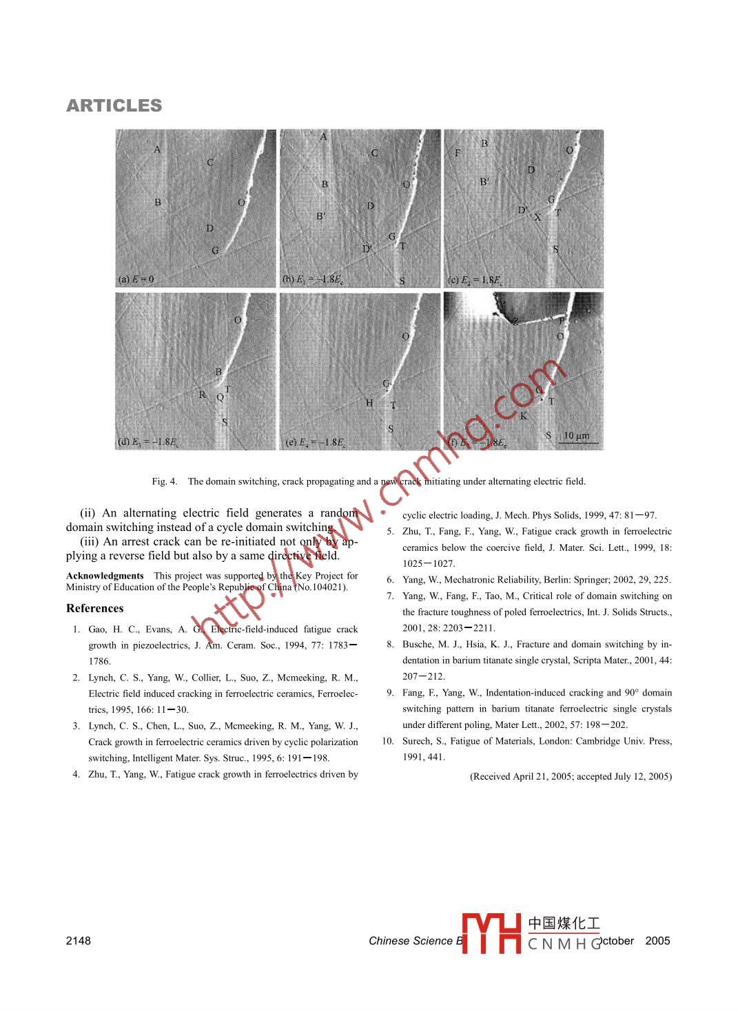 ARTICLES .Chinese Science Blletin 2005 Vol. 50 No.19 2145- 2148lationship between the domain switching and electricallyinduced fatigue cracking in BaTiO3 single crystal by inInvestigation on propagationsitu AFM observation. .process of electrically induced 1 Experimental procedureUnpoled and poled BaTiO3 single crystals with a sizefatigue cracking using AFMof 1X5X5 mm3 were used in this study. The poling di-rection was the [001] direction, and the indentation testWANG Fang, SU Yanjing, HE Jianying, QIAO Lijie .was carried out on the polished (100) surface with a load& CHU Wuyangof 0.98N and a dwell time of 20 s. A negative field of E =1.8E, where E.= 102 V/mm served as the coercive field,Beiing. Beiing 100083. ChinaCorrespondence should be addressed to Su Yanjing (email: yjsu@mater.was first applied in the [00 1]direction for one minute.ustb.edu.cn)After in situ examining the domain switching band aroundustb.crack tip using AFM, a same negative field was appliedAbstract Propagation process of electrically inducedsecondly for one minute. Then, a positive field of E=1.8E。fatigue cracking in BaTiO3 single crystal has been studiedwas applied. The electric field was alternated for sevenusing atomic force microscope (AFM). The results show thattimes including negative field of fours times and positivealternating electric field generates a random domain switch-field of three times.ing around indentation cracks instead of a cyclic domainswvitching and an arrest indentation crack can be re-initiated 2 Results and discussionby applying either positive or negative alternating electricThe domain switching bands in an unpoled BaTiO3field.Keywords: domain switching, atomic force microscope, elctricallyan optical microscope and AFM. The width of the domaininduced fatigue cracking.switching bands measured by AFM is about 8 um, whichDOI: 10.1360/982004 508is basically consistent with that by an optical microscope.For both unpoled and poled samples etched after in-A cyclic crack growth in ferroelectrics could be in- denting, the 9(duced by an alternating electric field"- l. Various models the interior flank of the indentation cracks, i.e. OAB andfor electrically induced fatigue cracking have been re- OCD zones, as shown in Fig. 2(a). Using height model ofviewed by Yango'. A model of small-scale discharge forAFM, the AFM image of the indentation crack is shown infatigue crack growth was proposed by Lynch et al.23. ZhuFig. 2(b). The domain switching zone PA in Fig. 2(b) isand Yang proposed a mechanics model for fatigue crack composed of domain switching bands shown in Fig. 2(c).growth driven by cyclic domain switching. Under an The height of the convex domain switching bands is aboutalternating electric field, the field concentrated at the 6 nm based on the section analysis of the bands, as showncrack tip causes the ferroelectrics to undergo cyclic do- in Fig. 2(d).main switching. Driven by the domain switching inducedUsing deflection model of AFM, the cracks of OA andstress field, the crack experiences a repeated process of OB are white and that of OC and OD are black (Fig. 3().initiation, growth, arrest, and re-initiation'.. However On the other hand, the domain switching bands in thethere is no direct evidence on whether field-induced cyclic OAB zone are black, but those in the OCD zone are whitedomain swithing results in crack growth.(Fig. 3(a)). After applying a negative field of 1.8Ec, theFor ferroelectric single crystals, domain switching can domain switching bands in the OAB and OCD zones in-be observed using a polarized optical microscope'9. Our crease, but there is no crack growth (Fig. 3(b). After the .experiments, however, showed that the domain switching negative field is applied secondly, there form new domainobserved using the polarized optical microscope was only switching bands of MN, which are far away from the do-a party of the whole domain switching zone, which could main switching zone induced by indenting, as shown inbe exhibited through etching using HCl+HF solution.Fig. 3(c). After applying a positive field of 1 8Ec, there areEtching itself, however, could enhance domain switching no evident changes in the bands and the cracks (Fig. 3(d)).and crack propagation, therefore, the relationship between The cracks and the bands no more change evidently after ahe electric field-induced domain switching and crack negative field is applied thirdly (Fig. 3(e)). After the posi-growth under alternating electric filed cannot be in situtive field is applied secondly, the bands of MN disappearinvestigated through etching.and the new bands of GH and OK form (Fig. 3(). AfterAtomic force microscope (AFM) can be used to find the negative field is applied fourthly, the new bands of GHthe convex on the surface; thus, it is possible that the 90° get widened (Fig. 3(g)). After the positive field is applieddomain switching zone or bands can be observed using thirdly, no evident change occurs (Fig. 3(h)). Although theAFM. The objective of this paper is to investigate the re-domain bands change, continnonslv, cracks do not propa-中國煤化工Chinese Science Blletin Vol. 50 No. 19 October 2005YHCNMH G2145.ARTICLES- 60.0- 40.0t 20.0S0 um20.0 40.0 60.0 80.0 umFig. 1. The domain switching band in an unpoled BaTiO3 single crystal etching using HF +HCI. (a) Optical photography; (b) AFM image.50um(dP(b0 uimFig. 2. The dormain swithing zones limited to interior flank of the indentation cracks in poled Ba TiO3 single crystal. (a) Optical pictureafter etching; (b) AFM image on the polished surface; (C)AFM image of crack AP and domain switching bands; (d) section analysis ofthe switching bands.ate under the alternating electric field.from T to X and the band TS widens (Fig. 4(c)). AfterFig.4(a) is another indentation crack. After applying a applying a positive field of 1 .8Ec, the crack tip propagatesnegative field of 1.8Ec, the domain switching bands grow, continuously, and the band TS widens further (Fig. 4()).e.g