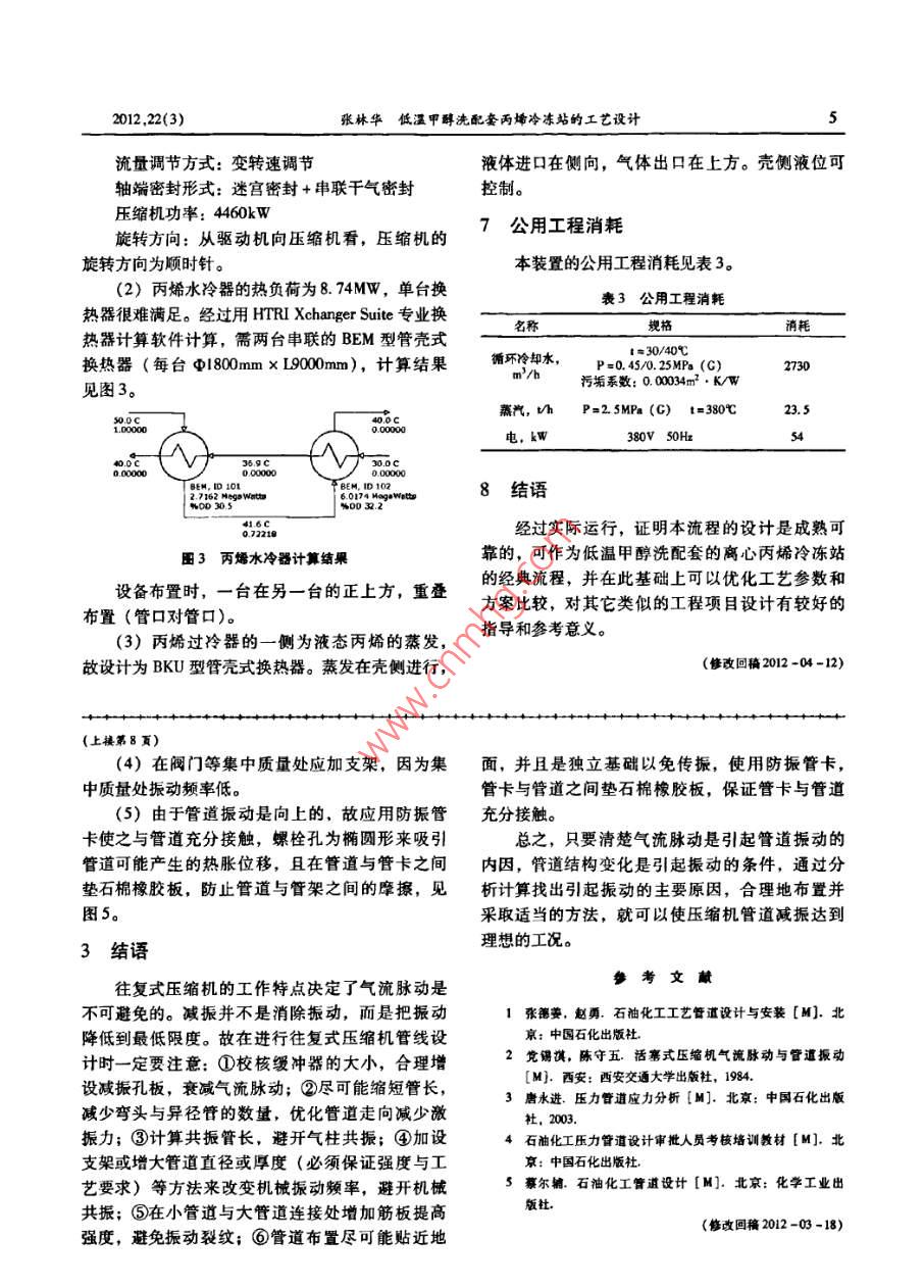 2012,22(3)張林華低溫甲醇洗配螽丙烯冷凍站的工藝設(shè)計設(shè)計多技術(shù)低溫甲醇洗配套丙烯冷凍站的工藝設(shè)計張林華·華陸工程科技有限責(zé)任公司西安710065摘要介紹低溫甲醇洗配套的丙烯冷凍站設(shè)計的基本原理,用 ASPEN PLUS軟件進行流程模擬計算,設(shè)計工藝流程。分析流程模擬的特點及需要注意的問題,并說明關(guān)鍵設(shè)備的選型關(guān)鍵詞低溫甲醇洗丙烯冷凍站模擬低溫甲醇洗是一種氣體凈化工藝。該工藝以表1丙烯與氨壓縮制冷對比冷甲醇為吸收溶劑,利用甲醇在低溫下對酸性氣丙烯壓縮氨壓縮體溶解度極大的優(yōu)良特性,脫除原料氣中的酸性氫為無色、具有強烈刺澈性氣氣體。由于吸收、解吸及換熱過程的不可逆性,人身安全無嘉,無味的有毒物質(zhì)。氨對水的溶解以及泵在輸送過程中會產(chǎn)生一定的溫升,因此低蝕性較強溫甲醇洗需要外供冷量40℃,丙烯飽系統(tǒng)運行40℃,氨飽和壓力0.72bar。目前,甲醇洗配套的冷凍站制冷方法主要有壓力制冷系統(tǒng)即氨制冷系統(tǒng)低壓側(cè)為負(fù)壓丙烯壓縮制冷、氨壓縮制冷、氨吸收制冷、氨壓于低壓系統(tǒng)制冷劑為閉式循縮吸收混合制冷等。如果是用于生產(chǎn)合成氨,建議選用氨作制冷劑,否則推薦用丙烯作制冷劑。工藝穩(wěn)定性穩(wěn)定擎不氣體容易進人制冷系統(tǒng)造成制冷效率降低,功耗丙烯的制冷溫度可以達到-40℃,這是常壓下氨所不能達到的。另外丙烯的壓縮機進口為正壓,壓制冷劑效率機型號大于丙烯壓縮機,效率低于丙烯壓縮機縮機的設(shè)計也較方便。本文以某600ka煤制甲醇運行成本低項目為依托,介紹低溫甲醇洗配套的丙烯壓縮制冷(丙烯冷凍站)系統(tǒng)的設(shè)計。3丙烯壓縮制冷的基本原理1丙烯與氨壓縮制冷的比較丙烯制冷屬于液體氣化制冷,利用丙烯液體氣化時的吸熱效應(yīng)實現(xiàn)制冷。液體在蒸發(fā)器內(nèi)氣氨作為制冷劑在早期大型的冷凍裝置中(主化提供冷量,為了使蒸發(fā)過程連續(xù)進行,必須不要用于合成氨裝置)被廣泛采用,但隨著技術(shù)的斷地從蒸發(fā)器內(nèi)抽出蒸氣,再不斷地將液體補充發(fā)展與進步,現(xiàn)在國內(nèi)外的大型冷凍裝置多采用進去。通過一定的方法把蒸氣抽出,使它冷凝后丙烯為制冷劑。丙烯本質(zhì)上的一些優(yōu)點,使它幾再回到蒸發(fā)器中。要使蒸氣在常溫下冷凝,則需乎已經(jīng)取代了氨的應(yīng)用。兩種冷媒壓縮制冷的比將蒸氣的壓力提高到常溫下的飽和壓力,這就實較見表1。現(xiàn)了制冷工質(zhì)在低溫低壓下蒸發(fā),產(chǎn)生制冷效應(yīng),2丙烯的物性并在高溫高壓下冷凝,向外放出熱量。因此,液體氣化制冷由氣化、升壓、冷凝、降壓四個過程丙烯是一種無色略帶甜味的易燃?xì)怏w,分子組成。丙烯壓縮制冷通過循環(huán)連續(xù)為低溫甲醇洗式為C3H,分子量42.08,沸點-47.7℃,熔點18525℃,其密度為空氣的L46倍,臨界溫度為裝置提供冷量。918℃,臨界壓力為462MPa,爆炸極限為20%4丙烯壓縮制冷的流程模擬1l%(vol),閃點為-108℃。4.1流程模擬張林華:工程師。2001年畢業(yè)于西北輕工業(yè)學(xué)院(現(xiàn)陜西科技大學(xué))應(yīng)用化學(xué)專業(yè)。一直從事化工工程設(shè)計工作。聯(lián)系電話(029)87989321, E-mail: zh1895@ chinahualueng, couCHEMICAL ENGINEERING DESIGN化工設(shè)計2012,22(3)某600kt/a甲醇項目,低溫甲醇洗要求配套的計規(guī)定功能,方便、快捷、準(zhǔn)確地實現(xiàn)模擬計算;丙烯冷凍站的最大負(fù)荷為6570kW(-40℃)。②在建模塊時,巧妙利用了流股比例分配器(B6根據(jù)設(shè)計任務(wù)及工廠條件,擬采用離心式丙 FXPLIT),可以準(zhǔn)確地計算出冷凝丙烯液體的分烯壓縮機,蒸汽透平驅(qū)動。用 ASPEN PLUS做整個配,模擬收斂壓縮制冷系統(tǒng)的流程模擬。在模擬中,一個細(xì)節(jié)就是送至低溫甲醇洗的模擬條件:①低溫甲醇洗要求的是-40℃的冷液態(tài)丙烯是過冷的,壓力為64bar。在到達甲醇量,即低溫甲醇洗返回的氣態(tài)丙烯為-40℃的飽和洗裝置的節(jié)流閥后進蒸發(fā)器蒸發(fā)制冷,而閥后壓氣體;②供給低溫甲醇洗裝置的液態(tài)丙烯應(yīng)為過力為-40℃丙烯對應(yīng)的飽和壓力,即L.41bar,在冷,在低溫甲醇洗界區(qū)內(nèi)節(jié)流、蒸發(fā)。節(jié)流后有16.95%(ml)的丙烯液體氣化了,實根據(jù)模擬條件,設(shè)置冷凍站工藝模擬流程見際進蒸發(fā)器的液態(tài)丙烯只有83.05%(mol),因此圖1。要特別注意此部分的損失。所以本流程中規(guī)定的是模塊 RESTISOL的熱負(fù)荷為6750kW,已考慮了節(jié)流的損失。5丙烯壓縮制冷的流程設(shè)計根據(jù)流程模擬,設(shè)計丙烯冷凍站的工藝流程見圖2。內(nèi)壓縮機系統(tǒng)丙水冷器圖1丙烯冷凍站工藝流程模擬壓縮機初步定為兩段壓縮段間有補氣,壓縮機出口壓力為18bar。為了準(zhǔn)確模擬,在此設(shè)置兩個設(shè)計規(guī)定:①規(guī)定模塊 RECTISOL的熱西負(fù)荷為6570kW,變量是流股C3H的流量;②規(guī)態(tài)內(nèi)烯饣低溫甲酚定模塊E1702H和E1702C的熱負(fù)荷相等,變量是丙烯過冷器模塊B6的流股分配比例。模擬計算結(jié)果見表2。表2流程模擬物料平衡表圖2丙烯冷凍站工藝流程物流編號流程簡述:來自低溫甲醇洗的氣態(tài)丙烯((相態(tài))(氣)(氣)(氣)(氣)(氣)()40℃,1.41bar)進冷凍站
