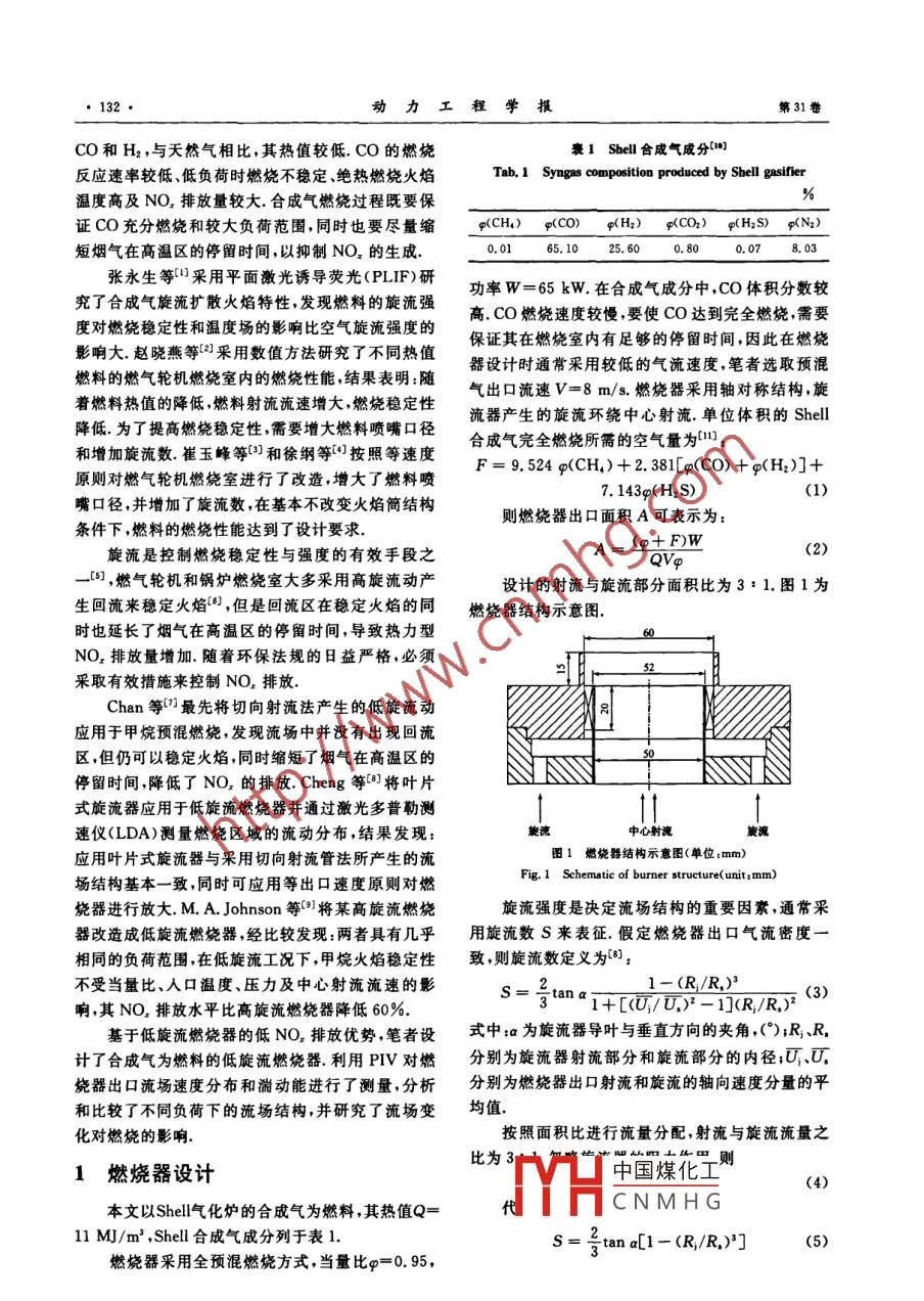 第31卷第2期動力工程學(xué)報Vol 31 No. 2011年2月Journal of Chinese Society of Power engineeringFeb. 2011文章編號:16747607(2011)020131-06中圖分類號:TF055文獻標識碼:A學(xué)科分類號:610合成氣低旋流燃燒器設(shè)計與流動結(jié)構(gòu)的分析尹航,鐘仕立,戴韌,陳永辰(上海理工大學(xué)能源與動力工程學(xué)院,上海200093)摘要:設(shè)計了一個合成氣低旋流燃燒器,采用PIV技術(shù)對不同負荷下的冷態(tài)流場進行了測量,并比較分析了不同中心射流流速對旋流流場的影響.鮚果表明:流場中出現(xiàn)中心回流區(qū)時的旋流數(shù)與中心流速無關(guān),高旋流與低旋流的分界點為S=0.7;流場中的軸向速度、徑向速度和湍動能均關(guān)于燃燒器中心軸線對稱;中心軸線上無量綱軸向速度的分布與中心射流流遠(負荷)無關(guān),燃燒器出口下游形成一個發(fā)散低速區(qū),有利于穩(wěn)定充分燃燒;隨中心射流速度的增大,徑向速度成正比增大,湍動能明顯增加關(guān)鍵詞:合成氣;低旋流燃燒器;流場;旋流強度;旋流數(shù);PIV技術(shù)Design of Low Swirl Syngas Burner and Analysis on the Flow PatternYIN Hang, ZHONG Shi-li, DAI Ren, CHEN Yong-chen( School of Energy and Powering Engineering, University of Shanghai for Science andTechnology, Shanghai 200093, ChinaAbstract: a syngas burner with low swirling intensity was designed and the cold state flow fields at differ-ent loads were measured using PIV technology. The influence of different central jet velocities on swirlingflow field was compared and analyzed. Results show that when the central recirculation zone appears, theritical swirl number has nothing to do with the central jet velocity, and the demarcation between high andlow swirl flow is s=0. 7. The axial velocity, radial velocity and turbulent kinetic energy are all symmetrical about the burner center axis. The dimensionless axial velocity profile along the central axis has nothingto do with the central jet velocity(load), and downstream the burner outlet there is a low speed area whichis helpful to sufficient combustion. With the rise of central jet velocity, the radial velocity increases pro-portionally, while the turbulent kinetic energy increases significantlKey words: syngas; burner with low swirling intensity; flow field; swirling intensity swirl number; Pivtechnology在我國的一次能源結(jié)構(gòu)中,煤炭的主體地位在解決方案,而合成氣的清潔和高效燃燒是其中的重今后相當長一段時間內(nèi)不會改變,煤炭直接燃燒帶要環(huán)節(jié)來了嚴重的環(huán)境污染,煤炭聯(lián)產(chǎn)系統(tǒng)和整體煤氣化合成氣生產(chǎn)方法有固體燃料氣化、輕質(zhì)烴類轉(zhuǎn)聯(lián)合循環(huán)系統(tǒng)(IGCC)是實現(xiàn)煤炭潔凈燃燒的有效化和重油部分氧化等,合成氣的主要可燃成分是中國煤化工收稿日期:201006-10修訂日期:20100917CNMHG基金項目:上海市重點學(xué)科建設(shè)資助項目(J505011)作者簡介:尹航(1978),男,遼寧錦州人博士研究生,主要從事氣體燃料燃燒方面的研究電話(TeL):13917251930;E-mail: yinhang36@ gamil. co132·動力工程學(xué)報第31卷O和H2,與天然氣相比,其熱值較低.CO的燃燒1Shel合成氣成分m反應(yīng)速率較低、低負荷時燃燒不穩(wěn)定、絕熱燃燒火焰Tab 1 Syngas composition produced by Shell gasifier溫度高及NO排放量較大合成氣燃燒過程既要保證CO充分燃燒和較大負荷范圍,同時也要盡量縮(CH1)p(CO)Hz)yCO2)(H2S)r(N2)短煙氣在高溫區(qū)的停留時間,以抑制NO2的生成張永生等采用平面激光誘導(dǎo)熒光(PLIF)研功率W=65kW.在合成氣成分中,CO體積分數(shù)較究了合成氣旋流擴散火焰特性,發(fā)現(xiàn)燃料的旋流強高.CO燃燒速度較慢,要使CO達到完全燃燒,需要度對燃燒穩(wěn)定性和溫度場的影響比空氣旋流強度的影響大趙曉燕等采用數(shù)值方法研究了不同熱值保證其在燃燒室內(nèi)有足夠的停留時間,因此在燃燒燃料的燃氣輪機燃燒室內(nèi)的燃燒性能,結(jié)果表明:隨:隨器設(shè)計時通常采用較低的氣流速度筆者選取預(yù)混著燃料熱值的降低,燃料射流流速增大,燃燒穩(wěn)定性氣出口流速V=8m/s.燃燒器采用軸對稱結(jié)構(gòu),旋降低為了提高燃燒穩(wěn)定性需要增大燃料噴嘴口徑合成氣完全燃燒所霱的空氣量為心體積的Shel流器產(chǎn)生的旋流環(huán)繞中心射流.單和增加旋流數(shù)崔玉峰等和徐綱等按照等速度原則對燃氣輪機燃燒室進行了改造,增大了燃料噴F=9524g(CH,)+2381[g(CO)+g(H2)]+7.143g(H2S)(1)嘴口徑,并增加了旋流數(shù),在基本不改變火焰筒結(jié)構(gòu)則燃燒器出口面積A可表示為:條件下,燃料的燃燒性能達到了設(shè)計要求旋流是控制燃燒穩(wěn)定性與強度的有效手段之A=(o+F)W5,燃氣輪機和鍋爐燃燒室大多采用高旋流動產(chǎn)設(shè)計的射流與旋流部分面積比為3:1.圖1為生回流來穩(wěn)定火焰,但是回流區(qū)在穩(wěn)定火焰的同燃燒器結(jié)構(gòu)示意圖時也延長了煙氣在高溫區(qū)的停留時間,導(dǎo)致熱力型NO2排放量增加.隨著環(huán)保法規(guī)的日益嚴格,必須采取有效措施來控制NO2排放Chan等最先將切向射流法產(chǎn)生的低旋流動應(yīng)用于甲烷預(yù)混燃燒,發(fā)現(xiàn)流場中并沒有出現(xiàn)回流區(qū),但仍可以穩(wěn)定火焰,同時縮短了煙氣在高溫區(qū)的停留時間,降低了NO2的排放 Cheng等將葉片式旋流器應(yīng)用于低旋流燃燒器并通過激光多普勒測速儀(LDA)測量燃燒區(qū)域的流動分布,結(jié)果發(fā)現(xiàn)中心射流應(yī