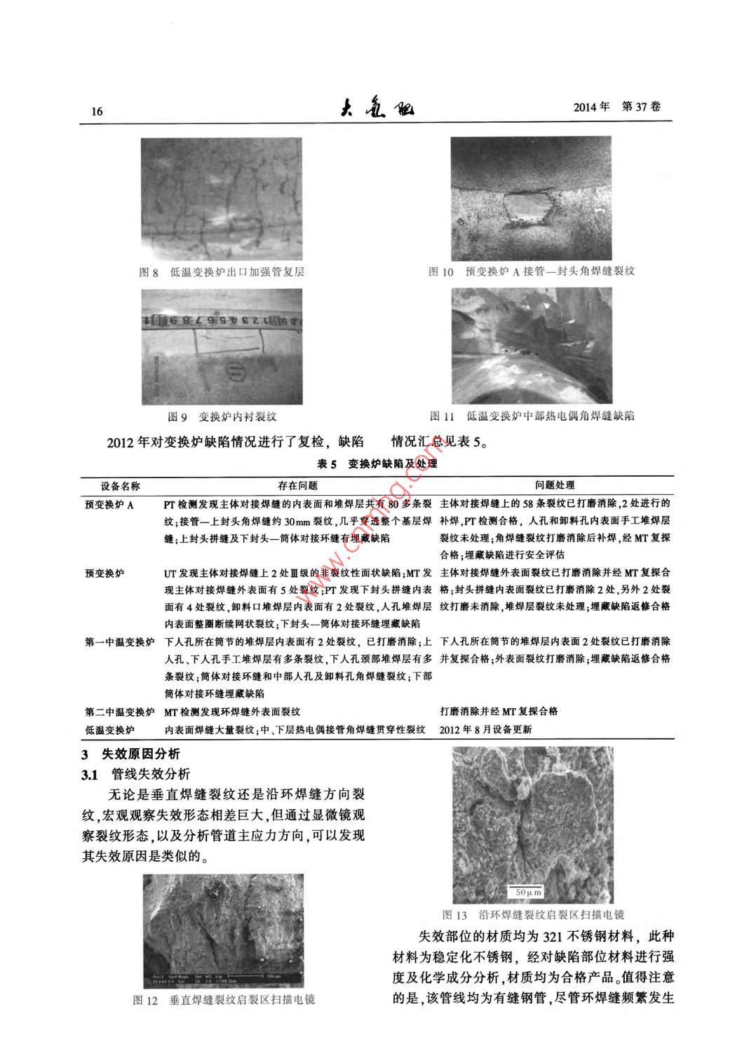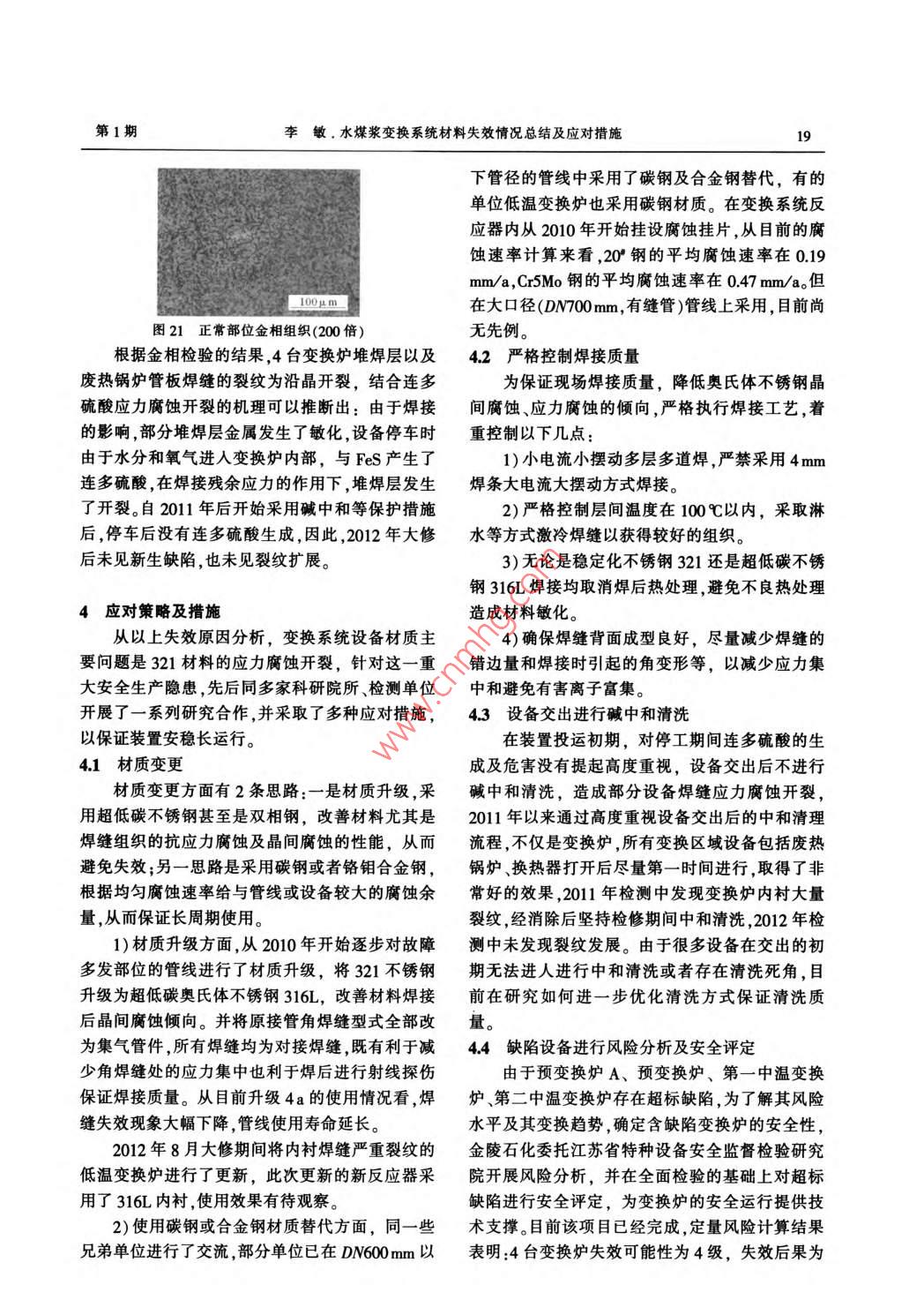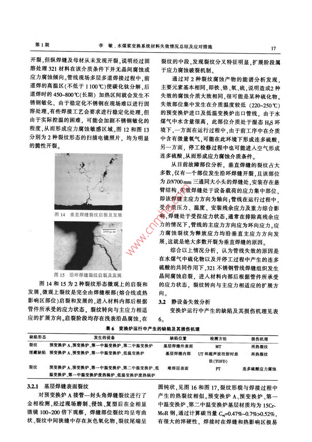 2014年2月Feb.2014第37卷第1期Large Scale Nitrogenous Fertilizer IndustryVol 37 No. 1水煤漿變換系統(tǒng)材料失效情況總結(jié)及應(yīng)對措施李敏(中國石化金陵分公司,江蘇南京210033)摘要:水煤漿變換系統(tǒng)不銹鋼管線及設(shè)備多次發(fā)生材質(zhì)失效,對此開展全面失效分析,并通過材質(zhì)升級、風(fēng)險分析及安全評定聲發(fā)射在線監(jiān)測等手段保證裝置安穩(wěn)長運行。關(guān)鍵詞:水煤漿變換系統(tǒng)奧氏體不銹鋼應(yīng)力腐蝕1概述中溫換熱器中國石化金陵分公司(簡稱金陵石化)煤化工裝置采用CE水煤漿加壓氣化技術(shù),其中變換系統(tǒng)第一區(qū)第二區(qū)中溫變采用一氧化碳耐硫變換工藝,由2臺并聯(lián)的預(yù)變變換爐區(qū)人變換熾?yún)^(qū)換爐串聯(lián)2臺中溫變換爐和1臺低溫變換爐組甲烷化換熱器廢熱鍋爐成,變換爐間有廢熱鍋爐取熱調(diào)溫,經(jīng)水分離器后變換氣廢熱鍋爐廢熱鍋爐送至NHD脫硫脫碳工段。變換系統(tǒng)流程見圖1。圖1凈化裝置變換系統(tǒng)流程表1工藝氣干基主要成分及狀態(tài)溫度/壓力/工藝氣(干基)主要成分,%項目℃MPaHSH,預(yù)變換爐前介質(zhì)第一中溫變換爐進口至第二中溫變換爐出口28042034-3.81(出口)/40(進口)0141(出口)22(進口)0.355(出口)/365(進口)低溫變換爐后介質(zhì)2600.30.3由于變換系統(tǒng)設(shè)備及管線長期在臨氫含硫、特點是溫度較低且屬于含有HSCH、CO2、H2的濕高溫高壓介質(zhì)下運行(主要介質(zhì)成分見表1),存在態(tài)介質(zhì),管線材質(zhì)均為d720mm×18mm單焊縫不氫腐蝕、回火脆化、蠕變、連多硫酸應(yīng)力腐蝕等損銹鋼管,SUS321材質(zhì)Crl8NlT),其余管徑管傷機理。從2005年9月裝置投產(chǎn)以來,變換系統(tǒng)線極少發(fā)生焊縫開裂表2為2005年9月裝置開不銹鋼管線及設(shè)備多次發(fā)生腐蝕失效故障,對裝工以來管線故障統(tǒng)計。從表2可以看出,管線裂紋置安穩(wěn)長生產(chǎn)造成了重大威脅。目前國內(nèi)外煤化主要存在3種形態(tài),一種為裂紋在垂直焊縫方向工領(lǐng)域在此環(huán)節(jié)的材料選型并未形成指導(dǎo)性標(biāo)準幾乎等距排列,裂紋長度約130-140mm,起源于焊規(guī)范,對失效原因、監(jiān)控措施以及材質(zhì)選型,通過縫內(nèi)表面,穿過焊縫并于熱影響區(qū)發(fā)生分叉,具有和科研單位、高校合作在實踐中摸索安全穩(wěn)定運較典型應(yīng)力腐蝕裂紋形態(tài),見圖2。另一種為沿環(huán)行的方法。焊縫方向開裂,裂紋是單支的,長度較長,由管內(nèi)壁焊縫根部啟裂,向外壁發(fā)展。由變徑管內(nèi)壁環(huán)焊2材質(zhì)失效情況說明21管線焊縫失效收稿日期:2013-08-14;收到修改稿日期:2013-12-26。變換系統(tǒng)不銹鋼管線失效部位集中在預(yù)變換作者簡介:李敏,男,1980年2月出生,工程師,本科學(xué)歷,畢業(yè)于南京工業(yè)大學(xué)材料學(xué)院腐蝕與防護專業(yè),現(xiàn)任中國石化金陵爐進口以及低溫變換爐出口2條DN00m管線分公司煤化工運行部設(shè)備管理科副科長。聯(lián)系電話:025-的環(huán)焊縫以及接管角焊縫上,其失效部位的共同58972025;E-maillim.jlsh@sinopec.com14瓦留2014年第37卷縫兩邊的(焊趾)根部同時啟裂和發(fā)展的裂紋基本沿熔合線擴展,裂紋分叉特征典型,見圖3、圖4。表22005年9月裝置開工以來管線故障統(tǒng)計時間故障部位裂紋形態(tài)是否導(dǎo)致停車處理辦法2006-11低溫變換爐出口DM00mm管線環(huán)焊縫垂直于焊縫2007年9月更換管線2007-03低溫變換爐出口DN700mm管線環(huán)焊縫垂直于焊縫2007年9月更換管線2007-10預(yù)變換爐進口DN700mm管線環(huán)焊縫垂直于焊縫2008年6月更換為雙焊縫管線200808低溫變換爐出口DN700mm管線角焊縫垂直于焊縫200902低溫變換爐出口DN700mm管線環(huán)焊縫垂直于焊縫否否否否否是2009年4月貼補,2009年5月更換為雙焊縫管線2009年4月貼補,2009年5月更換為雙焊縫管線2009-04預(yù)變換爐進口DN700mm管線環(huán)焊縫及熱沿焊縫方向更換部分管件,加固支撐電偶角焊縫200905預(yù)變換爐進口DM00mm管線環(huán)焊縫沿焊縫方向是更換全部管件,加固支撐2009-10低溫變換爐出口D№00mm加強管環(huán)焊縫垂直于焊縫否009年1l月貼補,2010年3月整條管線更換為316L2009-11預(yù)變換爐進口DN700mm管線環(huán)焊縫沿焊縫方向是更換管線,改變局部管線布置,2010年3月整體更換為316L管線201004預(yù)變換爐進口管線DN50mm接管角焊縫垂直于焊縫2011年3月更換原有角焊縫部位管線為整體成型的316L集氣管件201007第一中溫變換爐進口激冷管線DN250mm垂直于焊縫否01年1月貼補,2011年3月更換原有角焊縫部位環(huán)焊縫管線為整體成型的316L集氣管件2010-11預(yù)變換爐進口管線多處DN250mm接管角垂直于焊縫是011年1月貼補,2011年3月更換原有角焊縫部位焊縫管線為整體成型的316L集氣管件2010-11低溫變換爐進口管線DN40mm熱電偶角垂直于焊縫否2011年3月更換原有角焊縫部位管線為整體成型的焊縫316L集氣管件2012-04低溫變換爐出口壓力表接管座角焊縫垂直于焊縫2012年8月更換低溫變換爐出口所有角焊縫部位管線為整體成型的316L集氣管件013-01預(yù)變換爐A進口介質(zhì)死區(qū)環(huán)焊縫垂直于焊縫013年4月貼補第三種為接管角焊縫裂紋,裂紋垂直焊縫方向,由根部啟裂向外壁發(fā)展,見圖5。圖2垂直于焊縫裂紋形態(tài)圖5接管角焊縫裂紋形