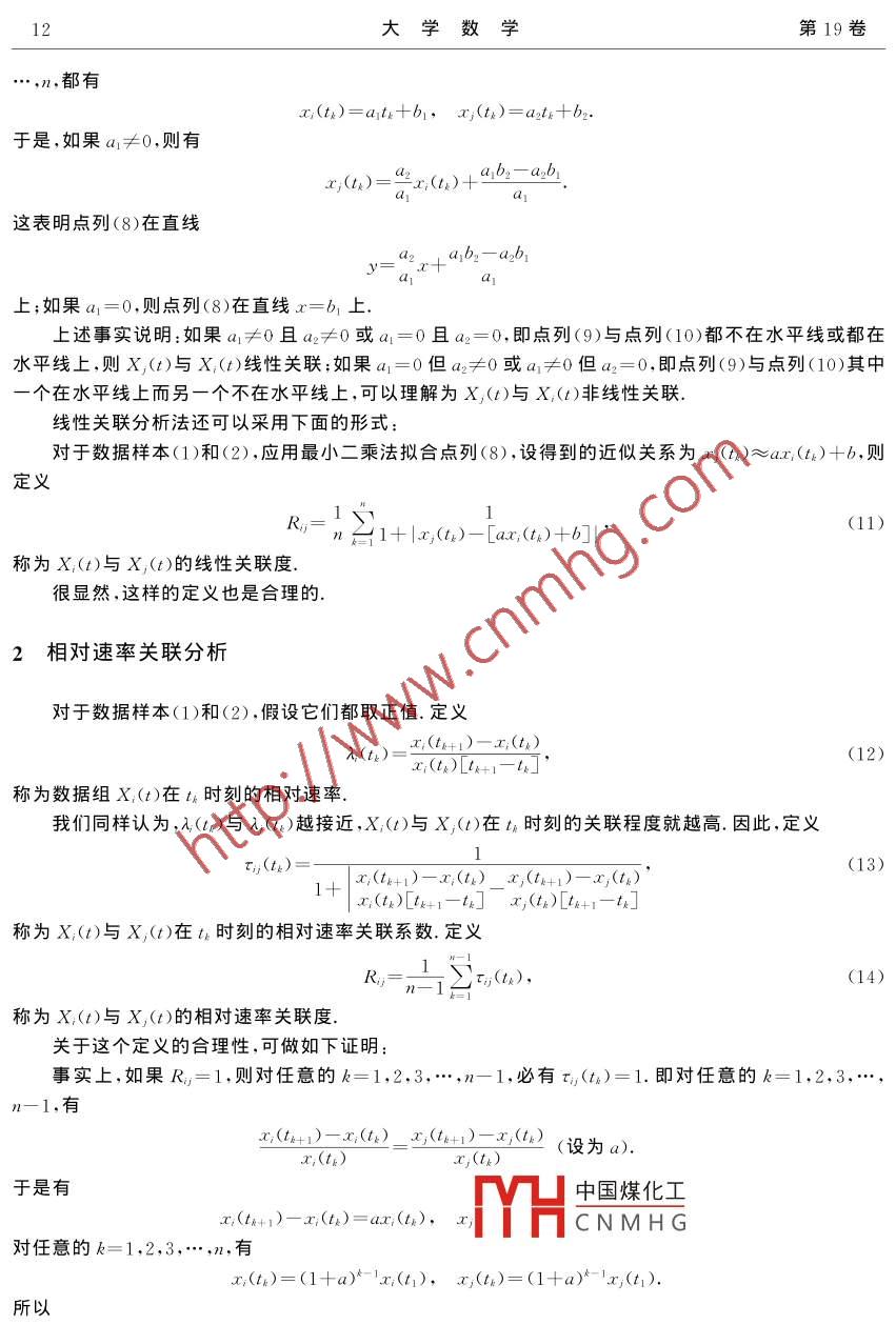 第19卷第4期大學(xué)數(shù)學(xué)Vol.19,N2. 42003年8月COLLEGE MATHEMATICSAug.2003關(guān)聯(lián)分析的方法及應(yīng)用郝一凡(沈陽(yáng)教育學(xué)院數(shù)學(xué)與計(jì)算機(jī)系,遼寧沈陽(yáng)110016)[摘要]提出了根據(jù)采集的數(shù)據(jù)來(lái)分析其關(guān)聯(lián)程度的方法.[關(guān)鍵詞]線性;速率;關(guān)聯(lián);關(guān)聯(lián)度[中圖分類號(hào)] O159[文獻(xiàn)標(biāo)識(shí)碼] B[文章編號(hào)] 1672- 1454(2003)04-0010-05在復(fù)雜的客觀世界中,任何事物之間都存在著不同程度的相互關(guān)聯(lián).然而,這些關(guān)聯(lián)往往是灰色的、模糊的,很難確定哪些事物之間的關(guān)聯(lián)密切,而哪些事物之間的關(guān)聯(lián)不密切.這便使我們?cè)谔幚韱?wèn)題的時(shí)候,很難抓住問(wèn)題的主要矛盾和主要特征.從嚴(yán)格的意義上講,兩個(gè)事物之間是否有關(guān)聯(lián),應(yīng)該通過(guò)反映這兩個(gè)事物的數(shù)量特征之間的關(guān)系來(lái)研究.為此,我們有定義設(shè)有變量 X和變量Y,若Y=f(X),則稱變量Y與變量X按關(guān)系f相關(guān)聯(lián).但是,實(shí)際上大多數(shù)事物之間的關(guān)聯(lián)都是不確定的,按上述定義來(lái)研究?jī)蓚€(gè)事物之間的關(guān)聯(lián)未免太理想化了,也是很難做到的..設(shè)數(shù)據(jù)樣本X;(t)= {x;(t),x;(t2),..,x;(tn)}(1)及X;(l)= {x;(l),x;(e),..x;(1n)}(2)是通過(guò)相等的時(shí)間間隔采集得到的.即對(duì)k=2,3,..,n-1,有te+1-tn=tn-tn-.我們的目的是:分析X;(t)與X;(t)這兩組數(shù)據(jù)之間按什么關(guān)系關(guān)聯(lián);關(guān)聯(lián)程度多大.確切地說(shuō),X;(t)與X;(t)兩組數(shù)據(jù)之間按關(guān)系f的關(guān)聯(lián)程度可以表示為1門(3)n 1+x,(tr)-fLx;(tk)丁i不難看出,R,不僅依賴于數(shù)據(jù)樣本(1)和(2),而且與f的選擇有關(guān).而問(wèn)題就出在客觀存在的f是未知的,事先并不知道X;(t)與X;(t)究竟按什么關(guān)系關(guān)聯(lián)更密切.在種類繁多的f中,選擇什么樣的f對(duì)問(wèn)題的研究更有意義?為此,我們給出下面的關(guān)聯(lián)分析的方法.1線性關(guān)聯(lián)分析對(duì)于數(shù)據(jù)樣本(1)和(2),假定x;(t)≠x;(2), x;(中國(guó)煤化工CNMHG. x;(tk+1:YHw;(th)=x(tn)- -x;(tk-1) .. x;(te+1)-x;(tk)(5)x;(tn)-x,(tk-1)'[收稿日期] 2002-07-22第4期郝一凡:關(guān)聯(lián)分析的方法及應(yīng)用1分別稱為數(shù)據(jù)組X,(t)和X;(t)在th時(shí)刻的線性變化率.這里規(guī)定,如果分母x;(tk)-x;(tn-1)=0 (或 x;(tn)-x;(ta- 1)=0),則用x;(to-1)-x;(tx-2) (或x;(te-1)-x;(t- 2))來(lái)替換.....直至分母不為0.顯然:當(dāng)x;(te+1)=x;(tn)=x;(tx- )時(shí),X;(t)在th時(shí)刻呈線性水平狀態(tài);當(dāng)w;(t)=1時(shí),X;(t)在tk時(shí)刻呈線性遞增或線性遞減狀態(tài);當(dāng)w;(t)>1時(shí),X;(t)在tk時(shí)刻呈加速遞增或加速遞減狀態(tài);當(dāng)0≤w;(t;)<1時(shí),X(t)在tk時(shí)刻呈減速遞增或減速遞減狀態(tài);當(dāng)w,(t2)<0時(shí),X,(t)在tk時(shí)刻呈極大或極小狀態(tài).我們認(rèn)為,w;(tn)與w,(t)越接近,X;(t)與X;(t)在tk時(shí)刻的線性關(guān)聯(lián)程度就越高.因此,對(duì)于數(shù)據(jù)樣本(1)和(2),定義的(l)= -1+x;(tx+1)-x;(tk)_ x;(t&+1)-x;(tg)(6)| x;(tk)- x;(tn-1) x;(tn)- -x;(tr-1)稱為X,(t)與X;(t)在te時(shí)刻的線性關(guān)聯(lián)系數(shù);定義(7)n一2稱為X,(t)與X;(t)的線性關(guān)聯(lián)度.關(guān)于這個(gè)定義的合理性,可做如下證明:事實(shí)上,如果R,=1,則對(duì)任意的k=2,3...,n-1,必有氣(t)=1.即對(duì)任意的k=2,3...,n-1,有x:(te+)-x;(tk)_ xj(te+1)-x;(th)(設(shè)為a≠0).x;(tn)- x;(tk-1) xj;(tn)- xj;(tk-)于是有x;(le+1)-x;(n)=a[x;(te)-x;(1n-1)],x;(n+)- x;(tn)=a[x;(tn)- x;(- )].整理得x;(te+1)-x;(t)=ak-'[x;(t2)- x;(t)],x;(le+1)- -x;(n)=a"-'[x;(t2)- x;(t)].所以x;(te+1)-x;(t)_ x;(t2)- x;(t)x;(t*+1)- - x;(tn)~ x;(t2)- x;(t)"這表明點(diǎn)列{(x;(t),x;(1))(x(2),x(2)),(x;(tn),x;(n))}(8)在一條直線上,即X;(t)與X;(I)線性關(guān)聯(lián).反之,如果X,(t)與X(l)線性關(guān)聯(lián),則對(duì)任意的k=1,2,.n,都有x;(ln)=ax;(l)+b.于是,對(duì)任意的k=2,3,.,n-1,都有x;(tx+1)-x;(tp)_[ _ax;(tx+1)+b]- [ax;(tk)+b]_ x;(te+1)-x;(tp)x;(tp)- x;(tk-1) [ax;(tp)+b]- [ax;(tx-1)+b]~ x;(th)- x;(tk-1)所以,對(duì)任意的k=2,3,..,n-1,有R,=1.中國(guó)煤化工特別地,如果點(diǎn)列MHCNM HG{(1,x;(t)),(lz,x;(l2)),",(in,z;(Ln))}在一條直線上,點(diǎn)列{(1 ,x;(l)),(l2,x;())..(n,x;(1,))}也在一條直線上,那么,點(diǎn)列(8)-定在一條直線上.事實(shí)上,設(shè)點(diǎn)列(9)在直線y=anx+by上,點(diǎn)列(10)在直線y=aqx+b2上,即對(duì)任意的k=1,2,3,2大學(xué)數(shù)學(xué)第19卷..n,都有x;(tk)=ante+b,x;(tz)=azte+b2.于是,如果as≠0,則有x;(tn)="x;(t)+'ab,-a2b.a這表明點(diǎn)列(8)在直線._aabz-a2b1an上;如果an=0,則點(diǎn)列(8)在直線x=b1上.上述事實(shí)說(shuō)明:如果an≠0且ar≠0或an=0且a2=0,即點(diǎn)列(9)與點(diǎn)列(10)都不在水平線或都在水平線上,則X,(t)與X,(t)線性關(guān)聯(lián);如果a1=0但ar≠0或an≠0但an=0,即點(diǎn)列(9)與點(diǎn)列(10)其中一個(gè)在水平線上而另一個(gè)不在水平線上,可以理解為X;(t)與X;(t)非線性關(guān)聯(lián).線性關(guān)聯(lián)分析法還可以采用下面的形式:對(duì)于數(shù)據(jù)樣本(1)和(2),應(yīng)用最小二乘法擬合點(diǎn)列(8),設(shè)得到的近似關(guān)系為x;(t)≈ax;(tn)+b,則定義R= n臺(tái)1+ |x,(u)-[ax;(t)+6]1'稱為X;(t)與X;(t)的線性關(guān)聯(lián)度.很顯