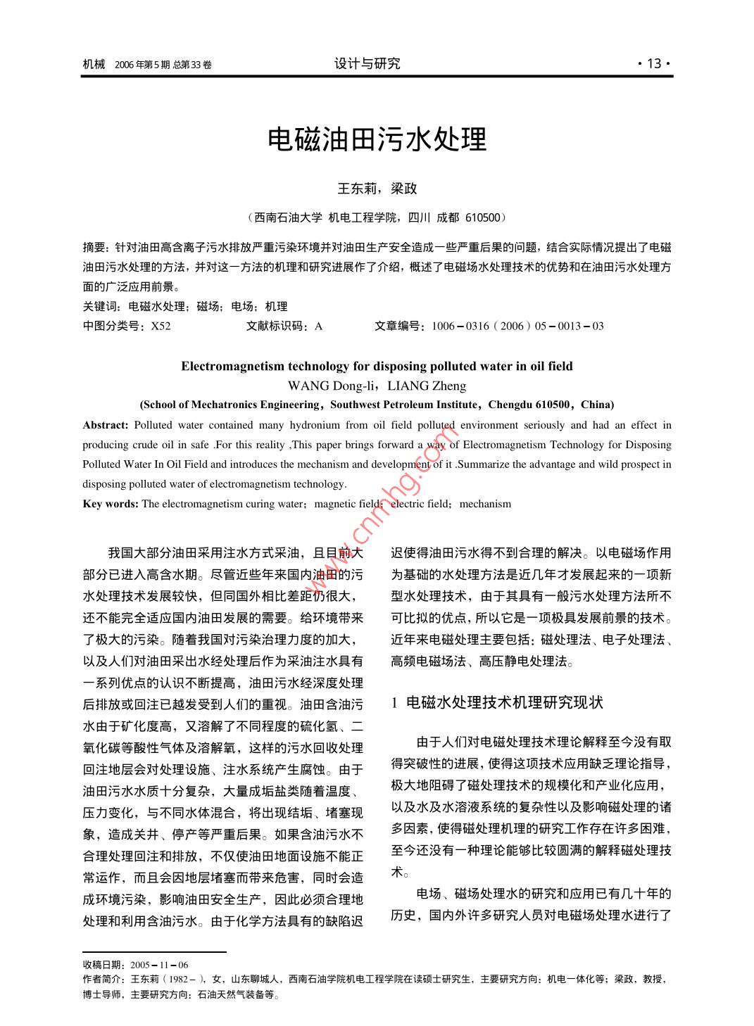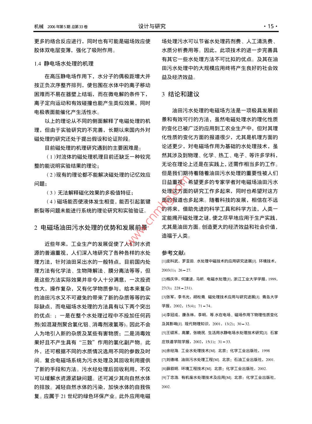 機(jī)械2006年第5期總第33卷設(shè)計(jì)與研究電磁油田污水處理王東莉,梁政(西南石油大學(xué)機(jī)電工程學(xué)院,四川成都610500)摘要:針對(duì)油田高含離子污水排放嚴(yán)重污染環(huán)境并對(duì)油田生產(chǎn)安全造成一些嚴(yán)重后果的問(wèn)題,結(jié)合實(shí)際情況提岀了電磁油田污水處理的方法,并對(duì)這一方法的機(jī)理和研究進(jìn)展作了介紹,概述了電磁場(chǎng)水處理技術(shù)的優(yōu)勢(shì)和在油田污水處理方面的廣泛應(yīng)用前景。關(guān)鍵詞:電磁水處理;磁場(chǎng);電場(chǎng);機(jī)理中圖分類號(hào):X52文獻(xiàn)標(biāo)識(shí)碼:A文章編號(hào):1006-0316(2006)05-0013-03Electromagnetism technology for disposing polluted water in oil fieldWANG Dong-li, LIANG ZhengSchool of Mechatronics Engineering, Southwest Petroleum Institute, Chengdu 610500, China)Abstract: Polluted water contained many hydronium from oil field polluted environment seriously and had an effect inproducing crude oil in safe. For this reality This paper brings forward a way of Electromagnetism Technology for DisposingPolluted Water In Oil Field and introduces the mechanism and development of it. Summarize the advantage and wild prospect indisposing polluted water of electromagnetism technologyKey words: The electromagnetism curing water; magnetic field; electric field; mechanism我國(guó)大部分油田采用注水方式采油,且目前大遲使得油田污水得不到合理的解決。以電磁場(chǎng)作用部分已進(jìn)入高含水期。盡管近些年來(lái)國(guó)內(nèi)油田的污為基礎(chǔ)的水處理方法是近幾年才發(fā)展起來(lái)的一項(xiàng)新水處理技術(shù)發(fā)展較快,但同國(guó)外相比差距仍很大,型水處理技術(shù),由于其具有一般污水處理方法所不還不能完全適應(yīng)國(guó)內(nèi)油田發(fā)展的需要。給環(huán)境帶來(lái)可比擬的優(yōu)點(diǎn),所以它是一項(xiàng)極具發(fā)展前景的技術(shù)。了極大的污染。隨著我國(guó)對(duì)污染治理力度的加大,近年來(lái)電磁處理主要包括:磁處理法、電子處理法、以及人們對(duì)油田采出水經(jīng)處理后作為采油注水具有高頻電磁場(chǎng)法、高壓靜電處理法。系列優(yōu)點(diǎn)的認(rèn)識(shí)不斷提高,油田污水經(jīng)深度處理后排放或回注已越發(fā)受到人們的重視。油田含油污1電磁水處理技術(shù)機(jī)理研究現(xiàn)狀水由于礦化度高,又溶解了不同程度的硫化氫、二氧化碳等酸性氣體及溶解氧,這樣的污水回收處理由于人們對(duì)電磁處理技術(shù)理論解釋至今沒(méi)有取回注地層會(huì)對(duì)處理設(shè)施、注水系統(tǒng)產(chǎn)生腐蝕。由于得突破性的進(jìn)展,使得這項(xiàng)技術(shù)應(yīng)用缺乏理論指導(dǎo)油田污水水質(zhì)十分復(fù)雜,大量成垢鹽類隨著溫度極大地阻礙了磁處理技術(shù)的規(guī)?;彤a(chǎn)業(yè)化應(yīng)用,壓力變化,與不同水體混合,將出現(xiàn)結(jié)垢、堵塞現(xiàn)以及水及水溶液系統(tǒng)的復(fù)雜性以及影響磁處理的諸象,造成關(guān)井、停產(chǎn)等嚴(yán)重后果。如果含油污水不多因素,使得磁處理機(jī)理的研究工作存在許多圖難,合理處理回注和排放,不僅使油田地面設(shè)施不能正至今還沒(méi)有一種理論能夠比較圓滿的解釋磁處理技常運(yùn)作,而且會(huì)因地層堵塞而帶來(lái)危害,同時(shí)會(huì)造術(shù)成環(huán)境污染,影響油田安全生產(chǎn),因此必須合理地電場(chǎng)、磁場(chǎng)處理水的研究和應(yīng)用已有幾十年的處理和利用含油污水。由于化學(xué)方法具有的缺陷遲歷史,國(guó)內(nèi)外許多研究人員對(duì)電磁場(chǎng)處理水進(jìn)行了收稿日期:2005-11-06作者簡(jiǎn)介:王東莉(1982-),女,山東聊城人,西南石油學(xué)院機(jī)電工程學(xué)院在讀碩士硏究生,主要研究方向:機(jī)電一體化等;梁政,教授,博士導(dǎo)師,主要研究方向:石油天然氣裝備等。設(shè)計(jì)與研究機(jī)械2006年第5期總第33卷大量的試驗(yàn)和研究,積累了不少寶貴的實(shí)驗(yàn)數(shù)據(jù)和晶析出所要求的過(guò)飽和度,使之在很低的溫度下便實(shí)際經(jīng)驗(yàn),提岀了一些有用的理論:水流經(jīng)磁場(chǎng),開(kāi)始結(jié)晶析出,從而加快了結(jié)晶速度。因此,經(jīng)過(guò)橫向切割磁力線,產(chǎn)生磁場(chǎng)處理水,磁場(chǎng)處理作用高頻電磁場(chǎng)處理后,水體中將彌散大量旳微晶,水可使水的電離常數(shù)下降,PH值增加,氧氣的含量增溫差的循環(huán)變化使微晶效應(yīng)更為突出,從而大大強(qiáng)加,溶解度增加,水流動(dòng)性增強(qiáng),總硬度降低,結(jié)化體積結(jié)晶率,使直接在換熱表面上的結(jié)晶顯著減構(gòu)疏松等。少。對(duì)經(jīng)處理后的水的水垢結(jié)晶體的顯微研究表明,1.1磁場(chǎng)處理對(duì)水合離子的作用碳酸鈣結(jié)晶從原來(lái)的方解石轉(zhuǎn)變?yōu)榧y石,由于紋石晶體結(jié)構(gòu)疏松,很容易被流水帶走,因此減少了水磁場(chǎng)處理水會(huì)破壞水中原來(lái)的結(jié)構(gòu),使較大的垢向器壁的沉積締合水分子集團(tuán)變成較小的締合水分子集團(tuán),甚至根據(jù)美國(guó)學(xué)者麥克林“磁性流體力學(xué)”理論是單個(gè)的水分子。而且磁場(chǎng)處理還可以破壞水溶液廣泛存在于水體中的微晶可通過(guò)絮凝作用結(jié)合成較