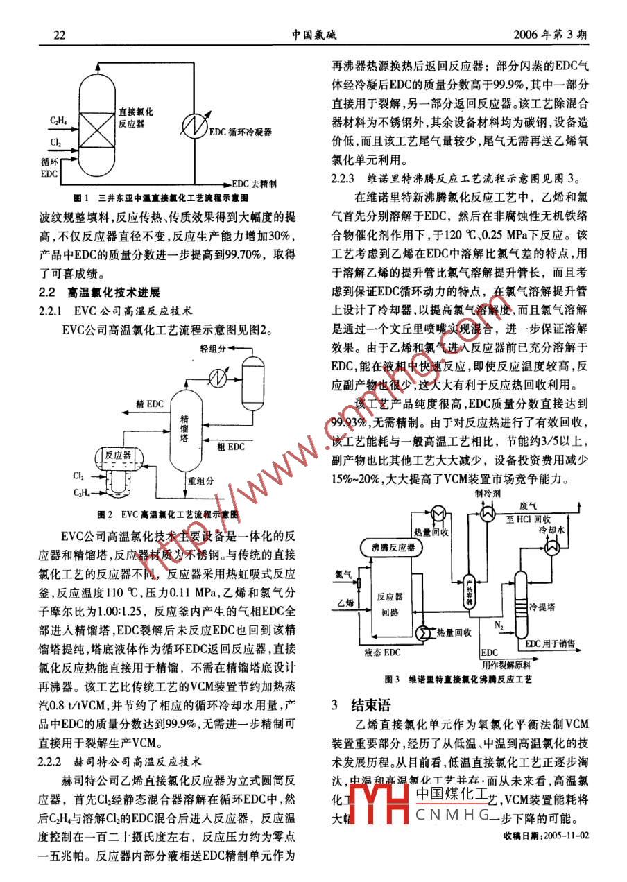 中國氯堿No.32006年3月China Chlor- AlkaliMar.,200621乙烯直接氯化生產(chǎn)二氯乙烷的技術(shù)進(jìn)展顧衛(wèi)民(.上海氯堿化工股份有限公司,上海200241)摘要:介紹了 乙烯直接氯化到二氯乙烷的技術(shù)進(jìn)展情況,對比了液相法中的低溫、中溫、高溫的技術(shù)特點。在分析了高溫氯化法的有關(guān)工藝的基礎(chǔ)上,認(rèn)為該工藝將逐步成為發(fā)展主流。關(guān)鍵詞:乙烯;直接氯化;二氯乙烷;進(jìn)展中圖分類號:TQ222.2t3文獻(xiàn)標(biāo)識碼:B文章編號:1009-1785(2006)03 -0021-02Technology development of dichloroethane by ethylene directchlorinated processGU Wei-min(PVC plant of Shaihai Chlor- alkali Chemical Co., Ltd, Shanghai 200241)Abstract: The development status of technology of dichloroethane by ethylene chlorinated process wereintroduced. The technology characteristics of liquid phase in low temperature, and middle temperature andhigh temperature were compared. The basic of high temperature chlorination process were analysed, and itpointed that this process would be the mainstream of development.Key words: ethylene; direct chlorination; dichloroethane; development1前言化工藝的反應(yīng)溫度在110~120 C ,反應(yīng)熱可以充分氯乙烯工業(yè)化生產(chǎn)工藝主要有電石乙炔法和平利用,降低了裝置的能耗,是乙烯直接氯化反應(yīng)的主衡氧氯化法,其中以后者居多。直接氯化是平衡氧氯要發(fā)展方向?;ǖ闹匾に噯卧?它是氣一液非均相反應(yīng),催化2乙烯直接氯化技術(shù)進(jìn)展劑為FeCl3。通常催化劑溶解在二氯乙烷(EDC)液相2.1中 溫氯化技術(shù)發(fā)展中,乙烯和氯氣自反應(yīng)器底部通入,在EDC液相層中上海氯堿和山東齊魯在上世紀(jì)80年代引進(jìn)了日反應(yīng)生成EDC,該反應(yīng)為放熱反應(yīng),反應(yīng)式如下。本三井東壓直接氯化反應(yīng)技術(shù)。該工藝主要設(shè)備為C.H,+Cl2催化型C2H2Cl2(EDC)+180 kJ/mol立式圓筒型不銹鋼反應(yīng)器,反應(yīng)溫度約為九十?dāng)z氏乙烯直接氯化反應(yīng)有氣相法和液相法。但氣相.度,反應(yīng)壓力0.015 MPa,乙烯和氯氣反應(yīng)的分子摩法目前還只停留在實驗室階段,由于反應(yīng)選擇性差爾比為1.00:1.25,反應(yīng)在含有FeCl,催化劑的液相而沒有工業(yè)化。液相法工藝按反應(yīng)溫度可分為低溫EDC中進(jìn)行,反應(yīng)熱由氣化的EDC帶出,冷凝后大部氯化、中溫氯化和高溫氯化工藝。這3種工藝目前世分EDC循環(huán)回反應(yīng)器,另一部分經(jīng)冷凝液相去精餾。界均有采用。低溫氯化反應(yīng)溫度為50 C,特點是反反應(yīng)器內(nèi)裝有拉西環(huán)金屬填料。工藝流程示意圖見應(yīng)選擇性高,液相氯化和液相出料催化劑損失多,生圖1成EDC需水洗產(chǎn)生大量廢水,EDC效率并不比其他進(jìn)行MH中國煤化工:魯對中溫氯化技術(shù)工藝的效率高,設(shè)備工藝復(fù)雜投資大,屬今后淘汰工CN M H G了一定比例的NaCl藝。中溫氯化技術(shù)反應(yīng)溫度約九十?dāng)z氏度,液相氯助催化劑,反應(yīng)選擇性有了進(jìn)一步提高,產(chǎn)品中EDC化、氣相出料,特點是催化劑留在反應(yīng)液中,不需要的,質(zhì)量分?jǐn)?shù)由99.5%提高到99.65%,降低了裝置的水洗,只需脫輕、重組分就可用于EDC裂解。高溫氯單耗。在反應(yīng)器拉西環(huán),上增加了高度為0.5 m的金屬2中國氯堿2006年第3期再沸器熱源換熱后返回反應(yīng)器;部分閃蒸的EDC氣體經(jīng)冷凝后EDC的質(zhì)量分?jǐn)?shù)高于99.9% ,其中一部分直接用于裂解,另-部分返回反應(yīng)器。該工藝除混合直接氯化CH4反應(yīng)器器材料為不銹鋼外,其余設(shè)備材料均為碳鋼,設(shè)備造/EDC循環(huán)冷凝器價低,而且該工藝尾氣量較少,尾氣無需再送乙烯氧循環(huán)氯化單元利用。2.2.3維諾 里特沸騰反應(yīng)工藝流程示意困見圖3。+ EDC去精制圈1三井東亞中溫直接氧化工藝流程示意圈在維諾里特新沸騰氯化反應(yīng)工藝中,乙烯和氯波紋規(guī)整填料,反應(yīng)傳熱、傳質(zhì)效果得到大幅度的提氣首先分別溶解于EDC,然后在非腐蝕性無機鐵絡(luò)高,不僅反應(yīng)器直徑不變,反應(yīng)生產(chǎn)能力增加30%,合物催化劑作用下,于120 C.0.25 MPa下反應(yīng)。該產(chǎn)品中EDC的質(zhì)量分?jǐn)?shù)進(jìn)一步提高到99.70%,取得工藝考慮到乙烯在EDC中溶解比氯氣差的特點,用了可喜成績。于溶解乙烯的提升管比氯氣溶解提升管長,而且考2.2高溫氯化技術(shù)進(jìn)展慮到保證EDC循環(huán)動力的特點,在氯氣溶解提升管2.2.1 EVC 公司高溫反應(yīng)技術(shù)上設(shè)計了冷卻器,以提高氯氣溶解度,而且氯氣溶解EVC公司高溫氯化工藝流程示意圖見圖2。是通過一個文丘里噴嘴實現(xiàn)混合,進(jìn)一步保證溶解輕組分+ 1效果。由于乙烯和氯氣進(jìn)人反應(yīng)器前已充分溶解于EDC,能在液相中快速反應(yīng),即使反應(yīng)溫度較高,反0-應(yīng)副產(chǎn)物也很少,這大大有利于反應(yīng)熱回收利用。精EDC該工藝產(chǎn)品純度很高,EDC質(zhì)量分?jǐn)?shù)直接達(dá)到|精99.93% ,無需精制。由于對反應(yīng)熱進(jìn)行了有效回收,館粗EDC該工藝能耗與一-般高溫工藝相比,節(jié)能約3/5以上,(反應(yīng)器副產(chǎn)物也比其他工藝大大減少,設(shè)備投資費用減少|(zhì)重組分15%~20%,大大提高了VCM裝置市場競爭能力。CH- +制冷劑廢氣團2 EVC高溫氯化工藝流程示意圄至HC1回收EVC公司高溫氯化