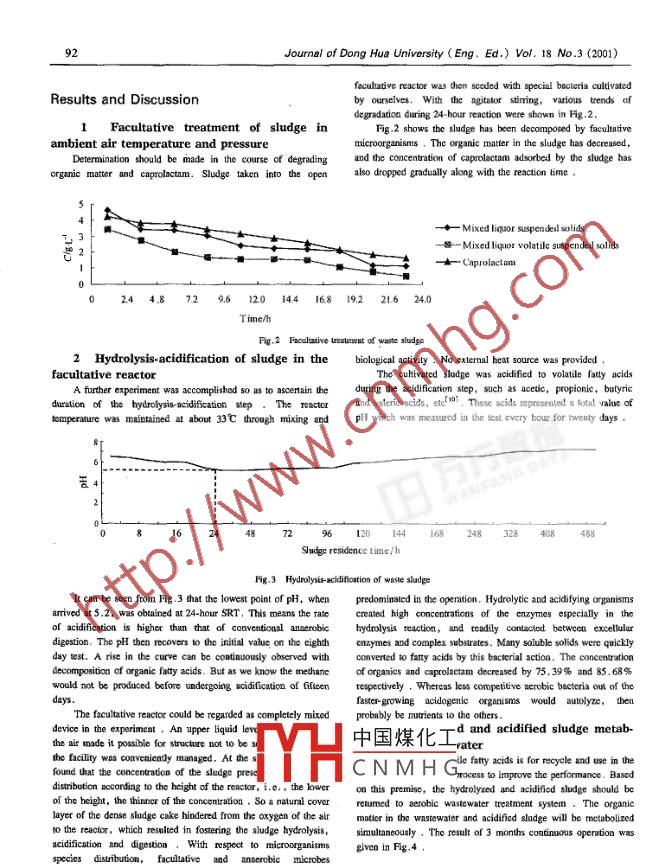Journal of Dong Hua University (Eng. Ed.) Vol. 18 No .3(2001) 91Process of Waste Sludge Facultative MetabolismLi Yin(李茵)Callege曠Briroumenal Scieace & Enghering. Dong Hus Ualreriy, Shatphul, 20051Laboratory- scale experimentswere conducted to62- -65 t(0],determine new technology of waste sludge facultativeAnserobic sludge digsion may bc divided into two steps :metabolism . 10-L laboratory-scale facultative reactorshydrolysis- acidogenesis and methanogenesisl0.1ol. In the first step,were operated during 24-hour sludge residence timecomplex organie substrtes aro solubilzod and subsequenty(SRT) and in room temperature . Results show that theInetabolized t如 produce mainly volaile faty acide . This is calledlorganic matter in waste sludge after hydrolyais.the hydolysis-acidihcatio of faculative meabolisn。The secondacldilcatlon will be reduced by 75. 39%,the removalstep contains methane pouetort ,rate of COD。above 85%。Adrantage of the process isThe main chicie of this research is two invesigte a proceshydrolysis acidification in ambient air temperature asof wate sludge metabolismn, which 地tgard he hydrolysis-there is no need lor facilities to be sealed or heated. Inacldlfication器some preteatmneat, and therefore achite 2E70-additdon, the sludge will be recycled into the wastewaterdischarge of sluodge in the acrobic wastewater treatment system.treatment system and finally towards serodigcharge.Keyuwords : fulutive metaboliom ,hydrobysis acidjicarion ,Experimentalsludge treament, proees: anudy.1 Sludge propertyin this experiment, waste sludge was taken from 且cerainIntroductionwastcewaler trcatment station of Shanghai Chenical Fber FPactory.The sudge contained 50%一70% of sting volume ( SV )。hn order to provide better environmental prodecion, theWhreas he anount of mixed liquor suspended solis( MISS )amount of wasleswater treatment increaes in recent years. Sludgewas on avenage 11.553 g/L, with 67.35% volaole matter. Theproduction is consequently going up and sludge teanent costs arecontent of organic matter was up to 75%一-90%, while thealo rising.As a result it has become ncessry t如o improve organicconcenmtbon of caprolactam reached 4043 -4723 mg/L. .mater degndatbon ffciency。The most widely adopted method of2 Apparatus and materialssludgo teatrbent curenly 瑪amnetobic digstiof'nl. Singl-stageBoth facllative rector and completely mixed aenaionsBtrobice thermophilie digestion processes are considered to lacksedimnentadon tank were made of plexiglass with a volume of 10process sabill and pathogen contof2-51, Dual-smagelitrs。The ractio under fasulative opeating condion requiredthemophilie/ mesophiliedigestionsystems have gainedemploying a set of low-speed gear agitator whose speed waspulrityle.], however, sludge resideace time will last 15reguinted to 40- -45 round/mindays'l and the systems 0e uncconormical to be opernated beecause3 Experimental processb digsion teoperature ia he thermophile age is u toThe experimental process flowsbet is sthown in Fg.1.hydolyriesidogcueilswaste sludgesoluble compoundsvolatile fatty acidsetrobis bopeal beatnent in seratian basimCO, ,HO, NH ,et.中國煤化工Sludge property tst iustates that most of orga.JYHCNMHG.B retuned 0o initial biochemicaland caprolactam wr adsorbed in loele of sctvwing the recyele with waslewalernot complotely metabolized. Paculatve microrganisms should betreatment, the shudpe will be decomposed. Eventualy, it reachedintroduced into the rector. Hyrolyxis acdficatio digstionztr0- discbarge. I ws for this purpose that laboratory-scule sudiesC8O coovert the complcated organic 0 volaile fatty acisl(Fig.were initiated.Receirnd Jul.28. 2000)2Journal of Dong Hua University ( Eng. Ed.) Vol. 18 No.3 (2001)faculative reactor was thenseoded with special bectris culivatedResults and Discussionby ouselves. With he agitaor stinring. varios trends ofdegradation during 24 bhour Treaction were shown in Hg.2.1 Facultative treatment of sludge inFng.2 shows te sludge has been decomaposed by faculativeambient air temperature and pressuremicrorgnims. The organic matter in the sludgc has decresed,Determination should be made in the course of degradingand the concentration of eaprolectam adsorbed by the sludge hasorganic mater and eaprolactam. Sludge taken into the openalso dropped gnadually alang with the reaction time .5「十Mixed liqpor suspendel solids營2-譬- Mixed liquor volatile suspended solids-士Caprolacam024 4.8, 72 9.6 120 144 168 19.2 21.6 24.0TimthFg.2 Fecalaive ureatnet of yate sludga2 Hydrolysis. acidification of sludge in thebiological activity . No extermal beat source was provided.facultative reactorThe cuhivated sludge was ucitedd to volatile faty acidsA furher experiment wa accomplishod 5o a to ascertain thedurtng 配acldifcarion sitp. soch as actie, propionic, butyrieduration of the byrolyis nidifictin p。The reactorand vateric acids. ete 10。These acids representedt a lutal value ofemperawre was maittained at about 33C hrough mixing andpH which ws measured in the tst every bour for twenty days .86告41624187276120 144168 248 328 408 488Sug residence timne/hg.3 Fyuyvlalifacio of wste sludgeIt can be seen from Fig.3 that the lowest point of pH, whenpredooninaced in the operation. Hyrolyte and adidifying organismsamived atS.2. was obuained at 24-hour SRT, This means the Talecrealed high conccntations of the enzymes especially in theof ddifieation i higher than that of coaventioal anserabicbydolysis reaction。 and teadily contacolot betwen excellulardigestion. The pH then recovors 0 the inia value, 明n the eighthenymes and complax subtrates. Many soluble solids were quiclydayest. A rise in the cure can be continuously observed withconveted t如 faty aclds by this bacerial action. The concentrationdecomposition of organic ftty scids. But酷w know the mehaneof organies and caprolactam decreased by 75.39名and 85. 68%would not be produced before undergoing cidifeation of fileentupetrvely . Whereas less compeiive s