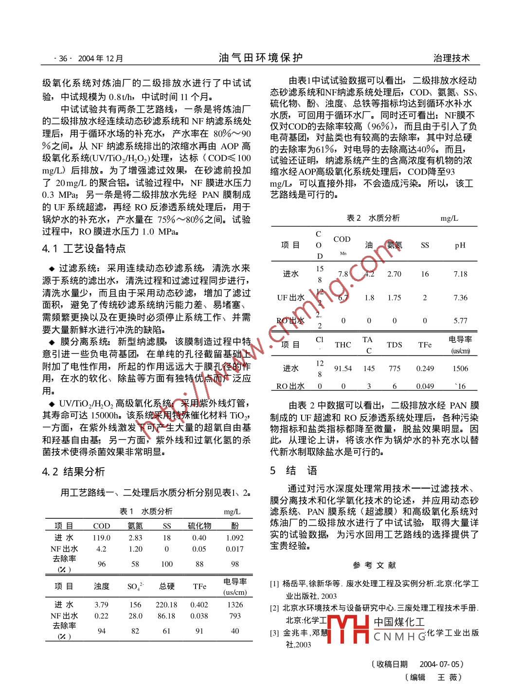 治理技術油氣田環(huán)境保護第14卷.第4期,.35.煉油污水的深度處理蘇志遠徐寶柱尚龍(中國石油錦西石化分公司)摘要論述了煉油污水深度處理的常用技術一一 過濾、膜分離及化學氧化技術,對煉油污水深度處理進行了中試試驗,并結合試驗結果對動態(tài)砂濾系統(tǒng)、PAN膜處理系統(tǒng)和高級氧化系統(tǒng)處理煉油廠二級排放水的適用性進行了論證.結果表明,二級排放水經動態(tài)砂濾系統(tǒng)和NF納濾系統(tǒng)處理后,COD. 氨氮、SS、硫化物、酚、濁度、總鐵等指標均達到循環(huán)水補水水質要求,可以回用于循環(huán)水場;經PAN膜制成的uF超濾和RO反滲透系統(tǒng)處理后,各種污染物指標和鹽類指標都降至微量,且脫鹽效果明顯.關鍵詞煉油廢水深度處理動態(tài)砂濾 膜分離技術 氧化處理技術煉油廢水成分復雜,含油、氨氮、酚、氰、.苯質。該膜還能高效分離油水,而且對于乳化和非乳酮、醚、硫、有機磷、金屬鹽類等,有機物濃度高,化油具有相同的排斥率,使用壽命長。醋酸纖維素經二級處理后,COD 含量仍在80~100mg/L, 懸浮膜(CA)可制得切割相對分子質量為1000~ 50000物20~-30mg/L總硬度200~300 mg/L,必須經過的各種膜。聚砜膜(PS) 分子中的砜基使聚合物具-系列的深度處理方可回用。常用的污水深度處理有良好的抗氧化性和穩(wěn)定性,分子中所有的鍵都不工藝有過濾、膜分離和化學氧化技術。易水解,使聚合物耐酸、堿。聚偏氟乙烯膜(PVDF)具有良好的溶劑相容性。1過濾技術在污水深度處理中,常把過濾作為預處理",常3氧化技術 .用濾料有石英砂、無煙煤粒、石榴石粒、 陶粒以及◆過氧化氫氧化[3]過氧化氫是 -種常見的氧化聚苯乙烯發(fā)泡塑料球等。石英砂使用最為廣泛。常劑,能較好去除細菌、大腸菌群,降低濁度,可維用的濾池有快濾池、虹吸濾池、無閥濾池、壓力濾持比臭氧更長的消毒殺菌效果。其成本與傳統(tǒng)氯氣罐等,但都屬于間斷運行的過濾設施。目前已有無相當,遠遠低于二氧化氯和臭氧的成本。需停車反洗、在運行過程中自動連續(xù)清洗的動態(tài)過◆高級氧化1高級氧化系統(tǒng)的基本原理是利用光濾系統(tǒng)。催化氧化、光化學氧化技術所產生的自由基在短時2膜分離技術[2間內迅速分解水中的有機污染物,特別是能夠高效分解水中劇毒物質氰化物和氨氮。氰化物可被完全根據膜的孔徑大小,可將膜分為微濾膜(MF)、分解為二氧化碳、氮氣、二氧化氮和硝酸根;氨氮超濾膜(UF)、 納濾膜(NF) 和反滲透膜(RO)。被分解為氮氣、二氧化氮、硝酸根。同時該系統(tǒng)對目前其它有機化合物有著極高的分解能力,能迅速分解商品化的膜主要有聚丙烯腈膜(PAN)、 醋酸纖維素酚類、醛類和鹵化烴類物質.膜(CA)、聚砜膜(PS)、聚偏氟乙烯膜(PVDF)-般采用加入氧化劑, 催化劑或借助紫外線等等。應用最廣泛的是聚丙烯腈膜(PAN), 該膜在整產生羥基自由基。目前比較突出的高級氧化技術有個膜大家族中是獨一無二的, 該膜具有極好的抗酸UVTiO,/H2O2 (過氧化氫與多相光催化結合)、堿、抗腐蝕、抗氧化性和抗油性以及高適應性,主UV/TiO2/O2(多相光催化氧化)、UV/H2O2 (過氧化氫要的特點是能有效地去除水中COD,能夠高效分離加紫外光)。水中的油類物質、酚類物質以及水中的復合鹽Al(OH); 等分子量大于4煉油污水中國煤化工1000以上的物質,能夠有效去除懸浮固體顆粒性物連續(xù)采用MHCNMHG處理系統(tǒng)和高蘇志遠,畢業(yè)于華東理工大學有機化工專工學碩士,現(xiàn)任中國石油錦西石化分公司安全環(huán)保處副處長,高級工程師。通訊地址:中國石油錦西石化分公司安全環(huán)保處郵編125001.. 36.2004年 12月油氣田環(huán)境保護治理技術級氧化系統(tǒng)對煉油廠的二級排放水進行了中試試由表1中試試驗數據可以看出,二級排放水經動態(tài)砂濾系統(tǒng)和NF納濾系統(tǒng)處理后,COD、 氨氮\ SS、驗,中試規(guī)模為0.8t/h,中試時間11個月。中試試驗共有兩條工藝路線,-條是將煉油廠硫化物、酚、濁度、總鐵等指標均達到循環(huán)水補水的二級排放水經連續(xù)動態(tài)砂濾系統(tǒng)和NF納濾系統(tǒng)處水質,可回用于循環(huán)水廠。同時還可看出: NF膜不理后,用于循環(huán)水場的補充水,產水率在80%~90僅對COD的去除率較高(96%), 而且由于引入了負%之間。從NF納濾系統(tǒng)排出的濃縮水再由AOP高電荷基團,對鹽類也有較高的去除率,其中對總硬級氧化系統(tǒng)(UV/TiO2/H2O2)處理,達標(COD≤100的去除率為61%,對電導的去除高達40%。而且,試驗還證明,納濾系統(tǒng)產生的含高濃度有機物的濃mg/L)后排放。為了增強濾過效果,在砂濾前投加縮水經AOP高級氧化系統(tǒng)處理后,COD降至93了20mg/L的聚合鋁。試驗過程中,NF 膜進水壓力mg/L可以直接外排,不會造成污染。所以,該工0.3 MPa;另一條是將二級排放水先經PAN 膜制成藝路線是可行的。的UF系統(tǒng)超濾,再經RO反滲透系統(tǒng)處理后,用于鍋爐水的補充水,產水量在75%~80%之間。試驗表2水質分析mg/L過程中,RO 膜進水壓力1.0 MPaoCOD4.1工藝設備特點項目油氨氮sspH◆過濾系統(tǒng):采用連續(xù)動態(tài)砂濾系統(tǒng)清洗水來進水.84.22.707.18源于系統(tǒng)的濾出水,清洗過程和過濾過程同步進行,清洗水量少,而且由于采用動態(tài)砂濾,增加了濾過UF出水.7.8 1.757.36面積,避免了傳統(tǒng)砂濾系統(tǒng)納污能力差、
