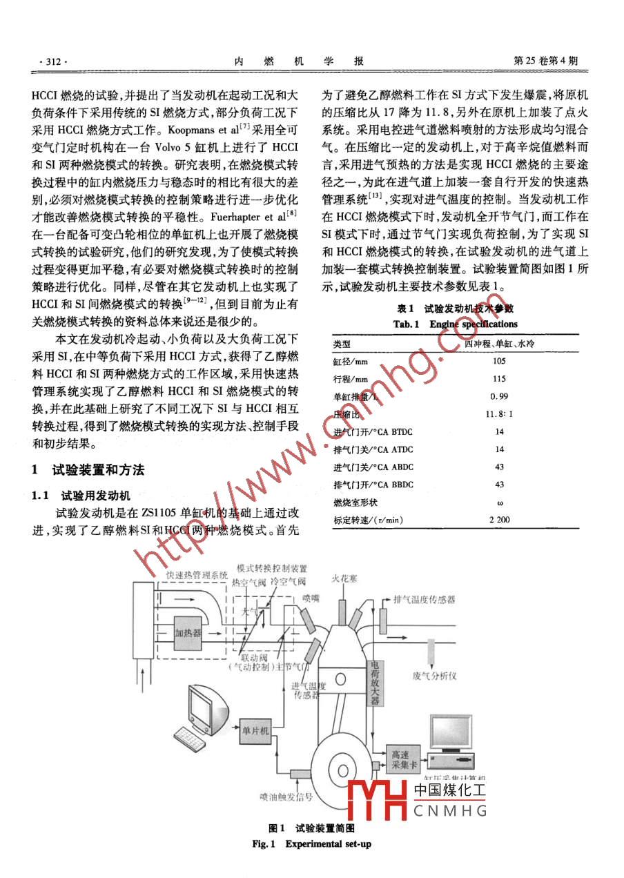 第25卷(2007)第4期內(nèi)燃機學報Transactions of CSICEVol.25(2007)No.4文章編號:1000-0909(2007)04-0311-0525050乙醇燃料SI-HCCI-SI燃燒模式轉(zhuǎn)換過程的研究郭英男,彭亞平,譚滿志,黃為鈞,劉發(fā)發(fā),李華(吉林大學內(nèi)燃機系,吉林長春130022)摘要:在一臺單缸試驗機上進行了乙醇燃料均質(zhì)壓燃(HCI)和火花點燃(SI)兩種燃燒模式相互轉(zhuǎn)換的試驗研究。結(jié)果表明,采用進氣熱管理系統(tǒng),可以實現(xiàn)乙醇燃料在兩種燃燒方式間的轉(zhuǎn)換。在S向HCCI轉(zhuǎn)換過程中,由于混合氣瞬間變稀,而高溫熱氣進到缸內(nèi)有一定的時間,轉(zhuǎn)速和平均有效壓力下降,經(jīng)過約4個工作循環(huán)后,隨著高溫熱氣連續(xù)、均勻地進到缸內(nèi),實現(xiàn)了連續(xù)穩(wěn)定的HCCI燃燒,因此轉(zhuǎn)速和平均有效壓力上升,并且很快達到穩(wěn)定。在HCC向SI轉(zhuǎn)換過程中,由于存在火花點火,對混合氣的溫度不是很敏感,因此過渡時間減少,發(fā)動機很快達到穩(wěn)定狀態(tài)。關(guān)鍵詞:乙醇;均質(zhì)壓燃;燃燒模式轉(zhuǎn)換;快速熱管理系統(tǒng)中圖分類號:TK401文獻標志碼:AStudy on the Transition Mode of Ethanol SI-HCCI-SI Combustion ModeTransitionGUO Ying-nan, PENG Ya-ping TAN Man-zhi, HUANG Wei-jun, LIU Fa-fa, LI HuaDepartment of Intermal Combustion Engine, Jilin University, Changchun 130022, China)Abstract: Mode transition of ethanol combustion between homogeneous charge compression ignition(HCCI)and spark ignition( SI)was investigated in a single cylinder diesel engine. Experimental resultsshowed that combustion mode transition could be realized with the Fast-Thermo Management system, Dur-ng the transition process form SI to HCCI, the mixture becomes the leaner and a time is needed for thehomogeneous charge of high temperature entering into the cylinder, leading to decrease in engine speedand mean effective pressure. After 4 cycles, with the entering of high temperature intake charge into thecylinder, the HCCI combustion is realized and increases the engine speed and the mean effective pressureand engine is operated stably. During the transition process form HCCI to SI, with aid of spark ignitionthe transition period decreases and engine quickly gets its stable operationKeywords: Ethanol; HCCI; Combustion mode transition; Fast-thermo management system引言化學反應(yīng)動力學的影響,過濃和過稀的混合氣將分別導致爆震燃燒和失火,因此發(fā)動機工作在HCCI發(fā)動機采用均質(zhì)壓燃(HCCI)方式工作時,均質(zhì)混模式下的運行范圍較窄。在發(fā)動機冷起動、怠速工況合氣在壓縮行程末期實現(xiàn)壓燃,混合氣在缸內(nèi)幾乎是時,難以形成HCI穩(wěn)定燃燒所需要的條件;在大負荷同時著火,不存在火焰?zhèn)鞑ァS捎诓捎玫氖蔷鶆虻南」r時,由于混合氣變濃,燃燒反應(yīng)速度加快,出現(xiàn)爆混合氣,缸內(nèi)燃燒溫度低,NO,和碳煙的排放極低,因震燃燒,因此難以在全工況范圍內(nèi)采用HCCI方式工此被認為是一種能同時滿足降低油耗和排放的新型燃作,在實際應(yīng)用中采用HCCI和傳統(tǒng)的S或壓燃(CI燒方式。燃燒方式結(jié)合的方法是解決HCCI工作范圍窄的方案從上世紀70年代首次提出HCCl的概念-2),到之目前為止全球范圍內(nèi)已經(jīng)開展了廣泛的試驗和模擬研究。研究表明,HCCI的著火與燃燒主要是受混合氣的ThYHE中國煤化工燒模式轉(zhuǎn)換的是CNMHG動機上進行了關(guān)于收稿日期200612-17;修回日期:20003.19。01CB2020)基金項目:國家重點基礎(chǔ)研究發(fā)展規(guī)劃資助項目作者簡介:郭英男,教授,E-mail; guoyu@ju.edu312內(nèi)燃機學報第25卷第4期HCCI燃燒的試驗,并提出了當發(fā)動機在起動工況和大為了避免乙醇燃料工作在S方式下發(fā)生爆震,將原機負荷條件下采用傳統(tǒng)的SI燃燒方式部分負荷工況下的壓縮比從17降為11.8,另外在原機上加裝了點火采用HCCI燃燒方式工作。 Koopmans et al”采用全可系統(tǒng)。采用電控進氣道燃料噴射的方法形成均勻混合變氣門定時機構(gòu)在一臺 Volvo5缸機上進行了HCI氣。在壓縮比一定的發(fā)動機上,對于高辛烷值燃料而和SI兩種燃燒模式的轉(zhuǎn)換。研究表明,在燃燒模式轉(zhuǎn)言,采用進氣預熱的方法是實現(xiàn)HCCI燃燒的主要途換過程中的缸內(nèi)燃燒壓力與穩(wěn)態(tài)時的相比有很大的差徑之一,為此在進氣道上加裝一套自行開發(fā)的快速熱別,必須對燃燒模式轉(zhuǎn)換的控制策略進行進一步優(yōu)化管理系統(tǒng),實現(xiàn)對進氣溫度的控制。當發(fā)動機工作才能改善燃燒模式轉(zhuǎn)換的平穩(wěn)性。 Fuerhapter et al在HCCI燃燒模式下時發(fā)動機全開節(jié)氣門,而工作在在一臺配備可變凸輪相位的單缸機上也開展了燃燒模SI模式下時,通過節(jié)氣門實現(xiàn)負荷控制,為了實現(xiàn)SI式轉(zhuǎn)換的試驗研究,他們的研究發(fā)現(xiàn),為了使模式轉(zhuǎn)換和HCCI燃燒模式的轉(zhuǎn)換,在試驗發(fā)動機的進氣道上過程變得更加平穩(wěn),有必要對燃燒模式轉(zhuǎn)換時的控制加裝一套模式轉(zhuǎn)換控制裝置。試驗裝置簡圖如圖1所策略進行優(yōu)化。同樣,盡管在其它發(fā)動機上也實現(xiàn)了示,試驗發(fā)動機主要技術(shù)參數(shù)見表1。HCCI和SI間燃燒模式的轉(zhuǎn)換2,但到目前為止有表1試驗發(fā)動機技術(shù)參數(shù)關(guān)燃燒模式轉(zhuǎn)換的資料總體來說還是很少的。Tab 1 Engine specifications本文在發(fā)動機冷起動、小負