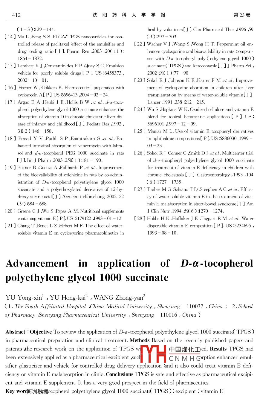 第23卷第6期沈陽(yáng)藥科大學(xué)學(xué)報(bào)Vol.23No.62006年6月Journal of Shenyang Pharmaceutical UniversityJun. 2006 p.407文章編號(hào): 1006 2858( 2006 )06 -0407- 06聚乙二醇1000維生素E琥珀酸酯應(yīng)用進(jìn)展于永新1,俞紅凱2,王中彥?( 1.中國(guó)醫(yī)科大學(xué)附屬第四醫(yī)院遼寧沈陽(yáng)110032 ; 2.沈陽(yáng)藥科大學(xué)藥學(xué)院遼寧沈陽(yáng)110016 )摘要:目的對(duì)聚乙二醇1000維生素E琥珀酸酯TPGS )的理化性質(zhì)、在藥物制劑與臨床治療中的應(yīng)用進(jìn)行綜述。方法依據(jù)近期國(guó)外公開(kāi)發(fā)表的文獻(xiàn)與專利對(duì)TPGS的研究應(yīng)用及理化性質(zhì)與安全性進(jìn)行分類、歸納和整理。結(jié)果TPGS在制劑研究中可作為增溶劑、吸收促進(jìn)劑、乳化劑、增塑劑以及脂溶性藥物傳遞系統(tǒng)的載體在臨床上可治療維生素E缺乏癥改善維生素E缺乏患者體內(nèi)維生素E水平。結(jié)論TPGS作為一種安全有效的藥用輔料與維生素E補(bǔ)充劑在藥學(xué)領(lǐng)域應(yīng)用前景廣闊將會(huì)得到廣泛應(yīng)用。關(guān)鍵詞:聚乙二醇1000 維生素E琥珀酸酯;藥用輔料;維生素E中圖分類號(hào):R 94文獻(xiàn)標(biāo)識(shí)碼:A聚乙二醇1000維生素E琥珀酸酯( Da-ooo-子性表面活性劑1。當(dāng)其與難溶性藥物形成膠pherol polyethylene glycol 1000 succinate ,TPGS ,Vita-束或乳劑時(shí)將顯著增加藥物在胃腸中的吸收從min E TPGS ,Tocophersolan )是維生素E的水溶性而提高生物利用度。與其他表面活性劑相比,衍生物,由維生素E琥珀酸酯( VES )的羧基與聚TPGS具有生育酚酯的結(jié)構(gòu),從而有-定的抗氧乙二醇PEG)1000酯化而成相對(duì)分子質(zhì)量約為化性,這有助于增加制劑的穩(wěn)定性2。有報(bào)道,1 513 ,已載入《美國(guó)藥典》。TPGS最早由美國(guó)TPGS對(duì)P糖蛋白有抑制作用轉(zhuǎn)運(yùn)受P-糖蛋白Eastman公司生產(chǎn)并上市,在國(guó)外現(xiàn)已廣泛應(yīng)用阻滯的藥物如阿霉素、紫杉醇、長(zhǎng)春堿、秋水仙堿于制劑研究中作為增溶劑、吸收促進(jìn)劑、乳化劑、等與TPGS合用后都明顯增加了在胃腸道內(nèi)的增塑劑以及水難溶性和脂溶性藥物傳遞系統(tǒng)的載吸收提高了生物利用度3。體如固體分散體、眼部給藥的載體、鼻腔內(nèi)給藥的載體等。2 TPGS的安全性毒理學(xué)研究表明,TPGS 作為維生素E營(yíng)養(yǎng)1 TPGS 的理化性質(zhì)補(bǔ)充劑或作為藥用輔料應(yīng)用時(shí)是很安全的。.TPGS為淡黃色的蠟狀固體近乎無(wú)味能溶Eastman公司的研究人員發(fā)現(xiàn),成年大鼠口服于水,也能溶于乙醇等大多數(shù)極性有機(jī)溶劑。室TPGS.維生素E琥珀酸酯和聚乙二醇1000的溫下在水中溶解度的質(zhì)量分?jǐn)?shù)為20%,若超過(guò)此LDso值均超過(guò)7g kg~'。飼料中TPGS含量質(zhì)量濃度將形成高黏度的液晶相。隨著在水中濃度分?jǐn)?shù)為0.002%、0.2%、2.0%時(shí),喂飼雄性和雌的增加液晶相的結(jié)構(gòu)逐漸變化從各向同性的球性大鼠90d結(jié)果顯示,TPGS對(duì)受試動(dòng)物的體質(zhì)狀膠束到圓筒狀膠束、正反六角形膠束、反球狀膠量、器官質(zhì)量、血液學(xué)、血清化學(xué)、食物消耗量、顯束,最后成薄層片狀液晶態(tài)。TPGS熔點(diǎn)約微形態(tài)學(xué)以及生長(zhǎng)率均無(wú)不良影響。按上述方法39 C,且有較高的降解溫度在200C下穩(wěn)定在喂飼175d后,受試組的生育指數(shù)與對(duì)照組相比空氣中穩(wěn)定,但遇堿不穩(wěn)定。室溫時(shí)臨界膠束濃無(wú)明顯差異并且新生大鼠均正常。對(duì)母子兩代度的質(zhì)量分?jǐn)?shù)約為0.02% ,親水親油平衡值大I中國(guó)煤化工查結(jié)果顯示沒(méi)有因.(HLB)約為13~ 17。 由于TPGS的兩親性質(zhì)及YHCNMH改變。在幼鼠胚胎器官良好的水溶性,對(duì)親脂性物質(zhì)而言是很好的非離組織形成期間對(duì)母鼠喂飼TPGS,生下來(lái)的幼鼠收稿日期2005 07-05作者簡(jiǎn)介:于永新( 1970- ) ,男(漢族)遼寧沈陽(yáng)人主管藥師主要從事醫(yī)院藥學(xué)工作Tel. 024- 62043627 E mailSpugr冉窮數(shù)據(jù)hoo. como .408沈陽(yáng)藥科大學(xué)學(xué)報(bào)第23卷體內(nèi)并未發(fā)現(xiàn)由TPGS產(chǎn)生的畸變4。提高呋噻米的水溶解度和溶解速率。通過(guò)溶劑法(以甲醇作為溶劑)制備呋噻米- TPGS( 質(zhì)量比為3 TPGS在藥物制劑中的應(yīng)用1:2的固體分散體。在低溫下將呋噻米與TPGS3.1作為增溶劑以上述比例過(guò)( 150土6.6 );xm篩小心混合均勻,安普那韋是新型的HIV蛋白酶抑制劑其膠則得物理混合物。在呋噻米TPGS( 質(zhì)量比為1:囊及普通片的生物利用度極低,血中濃度難以檢2)的固體分散體中,呋噻米的水溶解度顯著增加測(cè)到。而給Beagle狗口服( 25 mg kg-1 )含質(zhì)量且溶解速率顯著加快。其物理混合物比純呋噻米分?jǐn)?shù)20%TPGS的安普那韋軟膠囊絕對(duì)生物利溶解度增加,可 能由于TPGS快速溶解后成了呋用度能達(dá)( 69+8 )% ,當(dāng)膠囊中所含TPGS的質(zhì)量噻米疏水部分的乳化劑。分別測(cè)24 h后的平衡分?jǐn)?shù)為50%時(shí),絕對(duì)生物利用度為( 80士16 )%。溶解度:物理混合物為133.6 mg L-1 ,固體分散Yu等5]考察了聚乙二醇1000維生素E琥珀酸酯體為345.8mg L-1 ,約是純呋噻米溶解度對(duì)安普那韋溶解度的影響以及加入TPGS對(duì)安普(18.25mg L-1的18.95倍。X-射線衍射研究那韋通