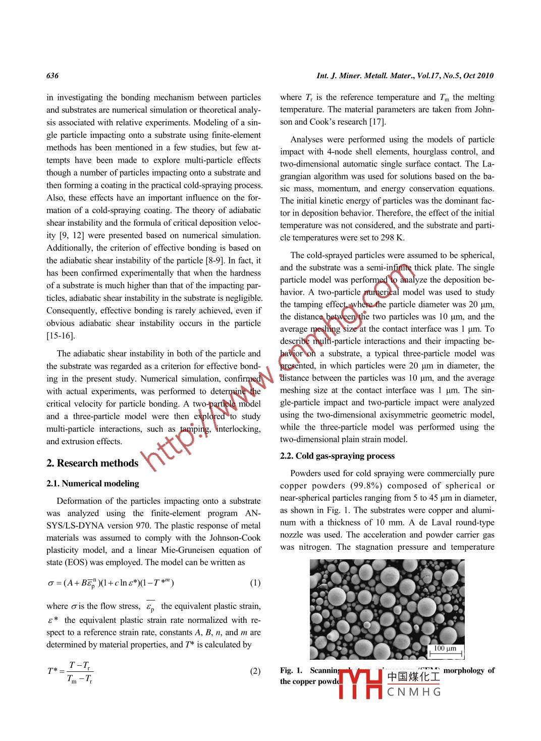 International Journal of Minerals, Metallurgy and MaterialsVolume 17, Number 5, October 2010, Page 635DOI: 10.1007/s12613-010-0367-8Deposition behavior of multi-particle impact in cold spraying processXiang-lin Zhou, Xiang-kun Wu, Hui-hua Guo, Jian-guo Wang, and Ji-shan ZhangState Key Laboratory for Advanced Metals and Materials, University of Science and Technology Bejing, Beiing 100083, China(Received: 10 December 2009; revised: 20 January 2010; accepted: 25 January 2010)Abstract: In the practical cold-spraying process, a number of particles impact onto a substrate and then form a coating. To study the defor-mation behavior and multi-particle interactions, single-particle, two-particle, and three-particle impacts were simulated using the AN-SYS/LS-DYNA version 970. A copper coating was prepared and scanning electron microscopy (SEM) was employed to analyze the micro-structures of the powders and the coating. Numerical results reveal that the critical deposition velocity is 600 m/s for a copper particle/coppersubstrate. The particles deform more fully due to multi-particle interactions, such as tamping, interlocking, and extrusion effects. The com-multi-particle morphology and compression ratio in the experiment are consistent with those of simulation results. Based on these results, thecoating of high performance can be prepared through selecting appropriate parameters and suitable pre-treatment processes.Keywords: spraying; deposition; interfaces; particle interactions; bonding; simulation[This work was financially supported by the National Natural Science Foundation of China (Nos. 50871019 cand 50874009) cand the NationalSuperiority Discipline Innovation Platform Project (SKL AMM-CS).]1. Introductionintimate conformal contact, which is beneficial to physicalbonding by Van der Waals forces. However, it is very diffi-Cold spraying is a new coating technology. Comparedcult to find experimental proofs of this type of bondingwith thermal spraying [1-2], some processes affected bymode, so far, the physical bonding mode just remains as athermally activation such as oxidation, decarburization,presumption [8]. For the metallurgical bonding, some re-phase transition, and micro-structural changes can besearchers [13-14] hold that the adiabatic temperature shouldavoided. In recent years, investigations on the cold-sprayingreach the melting point at the contact interface to achievetechnology have primarily focused on the optimization ofmetallurgical combination. This usually occurs in conditionsthe cold-spraying system [3-4] and processing parametersof a higher impact velocity or materials with lower melting[5], the development of new coating materials [6], applica-temperatures. For the mechanical bonding, Gruijicic et al.tions in specific fields [7], particle deposition behavior, and[9-10] proposed that jet-like metals may produce interfacialbonding mechanisms [8-12], etc. Numerical and experi-roll-ups and vortices through the Kelvin-Helmholtz effect,mental researches on the bonding mechanisms and deforma-which cause particles to mechanically combine on a sub-tion behavior have also been reported [8-15]. A number ofstrate. However, this view only derives from the qualitativedifferent bonding mechanisms in the particle/substrate con-tact interface, induced by adiabatic shear instability, haveanalysis and presumption.been proposed. For physical bonding, the formation ofFor the reason of the very short duration of particle im-jet-like metals at the local intensively deformed zones maypact, it is very difficult to observe the whole deformationdisrupt thin surface films such as oxides, and provideprocess of particles. Therefore, the most effective methodsCorresponding author: Xiang-lin Zhou E-mail: bkdzxl@sina.com◎University of Science and Technology Bejing and Springer-Verlag Berlin Heidelberg 2010中國(guó)煤化工包SpringerMYHCNM HG.636Int. J. Miner. Metall. Mater, Vol.17, No.5, Oct 2010in investigating the bonding mechanism between particleswhereTr is the reference temperature and Tm the meltingand substrates are numerical simulation or theoretical analy-temperature. The material parameters are taken from John-sis associated with relative experiments. Modeling of a sin-son and Cook's research [17].gle particle impacting onto a substrate using finite-elementAnalyses were performed using the models of particlemethods has been mentioned in a few studies, but few at-impact with 4-node shell elements, hourglass control, andtempts have been made to explore multi-particle effectstwo-dimensional automatic single surface contact. The La-though a number of particles impacting onto a substrate andgrangian algorithm was used for solutions based on the ba-then forming a coating in the practical cold-spraying process.sic mass, momentum, and energy conservation equations.Also, these effects have an important influence on the for-The initial kinetic energy of particles was the dominant fac-mation of a cold-spraying coating. The theory of adiabatictor in deposition behavior. Therefore, the effect of the initialshear instability and the formula of critical deposition veloc-temperature was not considered, and the substrate and parti-ity [9, 12] were presented based on numerical simulation.cle temperatures were set to 298 K.Additionally, the criterion of effective bonding is based onThe cold-sprayed particles were assumed to be spherical,the adiabatic shear instability of the particle [8-9]. In fact, ithas been confirmed experimentally that when the hardnessand the substrate was a semi-infinite thick plate. The singleof a substrate is much higher than that of the impacting par-particle model was performed to analyze the deposition be-ticles, adiabatic shear instability in the substrate is negligible.havior. A two-particle numerical model was used to studyConsequently, effective bonding is rarely achieved, even ifthe tamping effect, where the particle diameter was 20 um,the distance between the two particles wa
