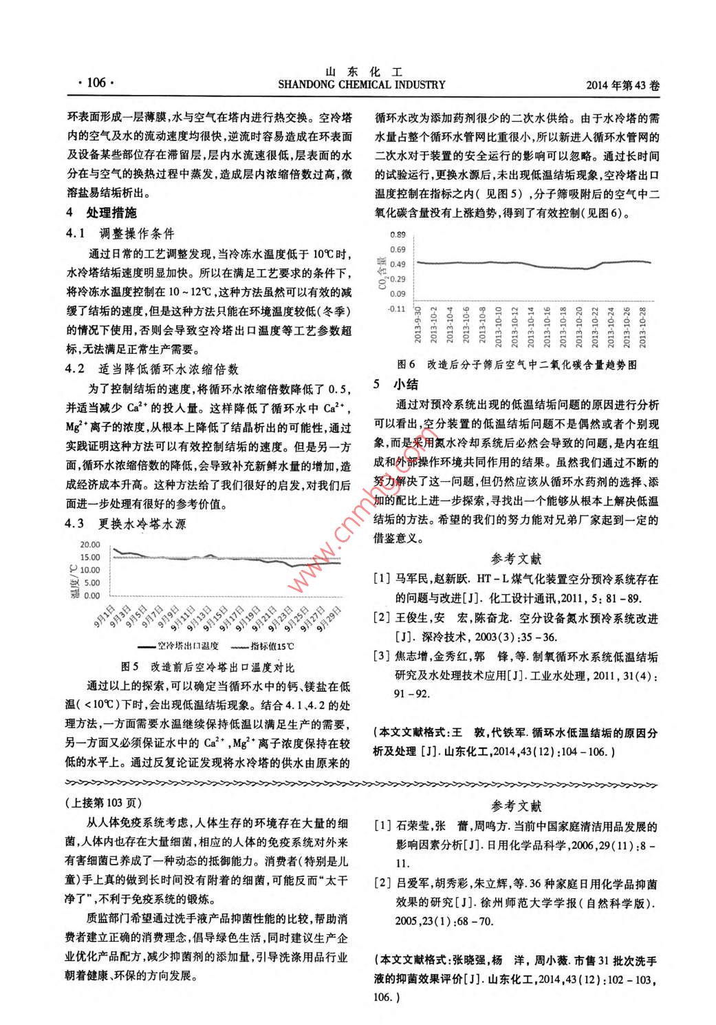 山東化工●104.SHANDONC CHEMICAL INDUSTRY2014年第43卷循環(huán)水低溫結垢的原因分析及處理王敦,代鐵軍(神華寧夏煤業(yè)集團煤制油項目建設指揮部,寧夏靈武750411)摘要:針對空分裝置出現(xiàn)的循環(huán)水低溫結垢的問題進行分析,并根據(jù)分析結果通過采用不同方法進行處理,尋找到-種經(jīng)濟、安全的方法。關鍵詞:空分裝置;循環(huán)水;低溫結垢中圖分類號:TQ085*.2文獻標識碼:B文章編號:1008 -021X(2014)12 -0104 -02Analysis and Treatment of the Circulating Water Low - temperature ScalingWang Dun , Dai Tiejun(Cool - to - Liquids Project Constuction Headquaters ,Shenhua Ningxia Coal. Industry Group , Linwu 750411 ,China)Abstract:Aiming at the problem of low - temperature scaling in circulating water systems at air abnuption set and accordingto the results by using different methods of treatment, eventually find out an economie, security solution.Key words:air abruption set;circulating water;low - temperature scaling神華寧煤集團煤炭化學工業(yè)分公司甲醇廠配備由四川本文通過對造成低溫結垢現(xiàn)象的原因進行分析,并根據(jù)空分設備集團提供的KDONAr - 3000/16160/930型空分裝產(chǎn)生原因采取多種措施進行處理,最終選擇了一種最為經(jīng)置,采用傳統(tǒng)的低溫法工藝,屬于帶前置吸附器、增壓膨脹、濟、科學的方法。氮自增壓、全精餾制氬、空氣循環(huán)的內(nèi)壓流程。與其他裝置1裝置概況不同的是,空分裝置配備有空氣預冷系統(tǒng),其循環(huán)水溫度最1.1 空分預冷系統(tǒng)流程說明低可降低至5 ~8C。在低溫條件下,循環(huán)水出現(xiàn)了低溫結該系統(tǒng)主要由空冷塔(T9101 )、水冷塔( T9102)及兩臺垢的現(xiàn)象。低溫結垢的形成會堵塞循環(huán)水流通通道,水冷循環(huán)水泵(P9101 - 1/2)和兩臺冷凍水泵(P9102 - 1/2)組塔、空冷塔填料結垢,影響換熱效果,循環(huán)水無法正常通過填成。(見圖1)。料造成在填料上部聚集,導致水冷塔水位低,溢流等現(xiàn)象。不得不經(jīng)常檢修處理或者化學清洗??諝馓嘶?94 9u3污復來自09302RC79102轉氮來自PC79602PC7910119101_山1H79101P0101-1 P9101-K 3910119102.Y9101⑥)89101墅氣自空壓機來L0Y9102M 801022891309106L9101 8外部風水9105擊涼水塘圖1預冷系 統(tǒng)流程圖收稿日期:2014-10-20作者簡介:王教(1986- -) ,助理工程師,本科,化學工程與工藝專業(yè),現(xiàn)主要從事煤制油項目工藝技術管理工作。第12期王敦,等:循環(huán)水低溫結垢的原因分析及處理,105●空氣冷卻塔(T- 9101)內(nèi)裝有兩層塔料,0.52MPa、余的污氮氣熱質交換冷 卻得到的14C冷凍水,經(jīng)冷凍水泵105C的空氣從空氣冷卻塔(T - 9101 )底部送入,由下往上穿(P -9102 - 1/2)加壓后,送人空氣冷卻塔頂部,與中部的冷過填料層,被從上往下的冷卻水冷卻,同時洗滌空氣中的卻水-并回給排水I段涼水塔。NOx,sO,C-等部分有害物質.最后穿越頂部的絲網(wǎng)分離1.2循環(huán)水概況器,進入分子篩純化系統(tǒng)。出空冷塔空氣的溫度約為15C。神華寧煤集團甲醇廠地處寧夏靈武市寧東煤化工基地,進人空氣冷塔的水分為兩段。下段是由給排水工段涼屬于西北內(nèi)陸地區(qū)。水資源貧乏,水中含有的鈣、鎂等離子水塔提供的329冷卻水,經(jīng)循環(huán)水泵(P -9101 - 1/2)加壓較多,水處理存在- -定難度。本廠的循環(huán)水水質見表1。入空冷塔(T -9101 )中部自上而下從空冷塔底部返回給排水工段涼水塔。.上段是由水冷卻塔(T - 9102)與分餾塔來的多表]循環(huán)水水質表項目化學需氧量( COD)/(mg/L)鉀離子含量補水鉀離子含量濃縮倍數(shù)硫酸鹽/(mg/L)總鐵/( mg/L)≤100/(mg/L)/(mg/L )>4≤1800≤數(shù)值2316.53.94.23688. 230.鈣硬+堿度總硬度(以目CaCO,計)/(mg/L)pH值(7.5-8.7)濁度NTL(以CaCO3鎂離子/(mg/L)計)/( mng/L)≤1600≤10≤11001239.688.424.53959.49<2裝置存在的問題202013年以來,空分裝置預冷系統(tǒng)水冷塔經(jīng)常出現(xiàn)溢流.∪1718液位難以控制,水泵打量差等現(xiàn)象。經(jīng)檢查后發(fā)現(xiàn)管線內(nèi)三16壁泵的葉輪、流通通道上存在大量的水垢,使流通面積減乘1516小.增加流通阻力。在裝置大檢修時,對水冷塔分布器及其管線進行了檢查,發(fā)現(xiàn)分布器.填料嚴重堵塞,管線也結垢嚴重.后對水冷塔填料進行了更換。分布器、管線進行了化學---實際值... 箱標飾15T清洗,但運行- -段時間后又出現(xiàn)了處理前出現(xiàn)的情況。冷凍圖32013年夏季空冷塔出口溫度趨勢圖水泵出口管線、泵體內(nèi)結垢嚴重.造成泵出口流量大幅下降,0.65 i見圖2D.6|生0.558070 L8 0.452.4三60三40注30圖4分子篩吸附后空氣中二氧化碳含量趨勢圖送210|3原因分析20134.12013-5-12013-6-12013-7-13.1溶解度的影響32 冷凍水泵出口流量趨勢圖循環(huán)水中鈣、鎂離子化合物,在水溫降低時溶解度均下由于水冷塔堵塞嚴重.水冷塔換熱效果不佳.導致空冷降,所以當循環(huán)水溫度由25C降至10C時,鈣、鎂鹽溶解度塔出口溫度達到18C(控制指標≤15C)以上(趨勢圖見圖下降,從水中析出,形成低溫結垢。3)??绽渌隹跍囟雀邥狗肿雍Y吸附能力下降.吸附后3.2溫度變化的影響的空氣中二氧化碳含量升高(趨勢圖見圖4)。二氧化碳在空冷塔上部屬低溫循環(huán)水,30C左右的供水首先由水冷低溫下形成干冰.會嚴重堵塞冷箱內(nèi)的流通通道,造成裝置塔冷卻至10C左右,然后在空冷塔中最終又升至40C左右,制冷量、分餾塔分離效果下降.氧氣提取率降低.最終造成產(chǎn)水溫