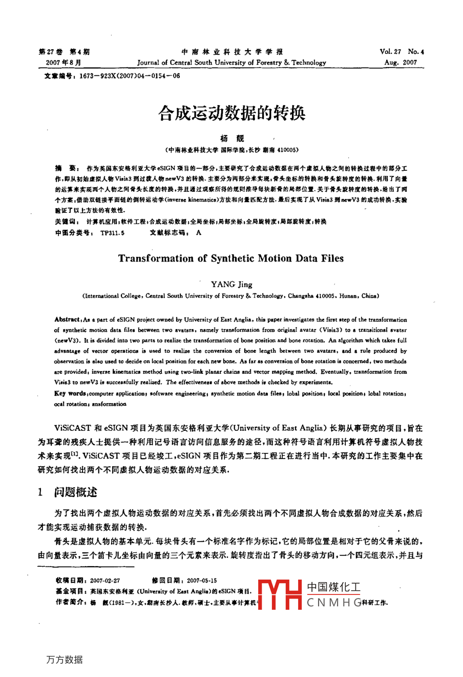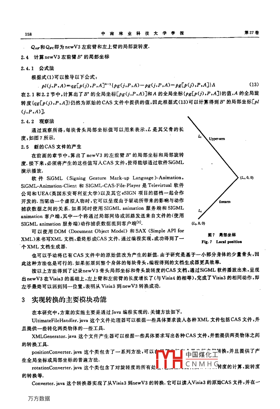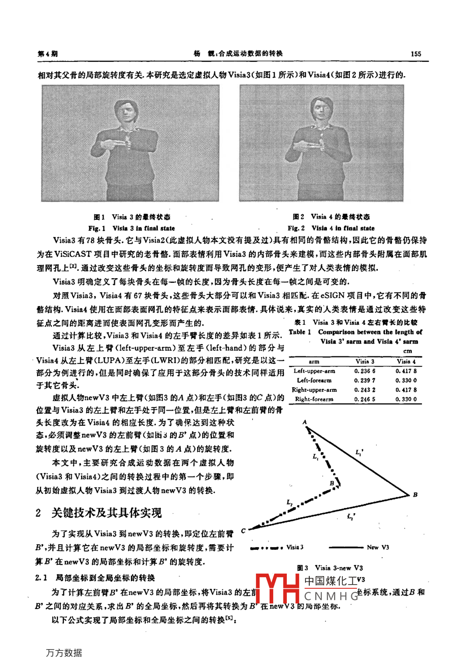 第27卷第4期中南林業(yè)科技大學(xué)學(xué)報Vol. 27 No. 42007年8月Journal of Central South University of Forestry & TechnologyAug. 2007文章編號: 1673- 923X(2007)04-0154-06合成運動數(shù)據(jù)的轉(zhuǎn)換楊靚(中南林業(yè)科技大學(xué)國際學(xué)院,長炒胡南410005)摘要;作為英國東安格利亞大學(xué)eSIGN項目的一部分,主要研究了合成運動數(shù)據(jù)在兩個虛撒人物之間的轉(zhuǎn)換過程中的都分工作,即從初始虛掀人物Viria3到過度人物newV3的轉(zhuǎn)換.主要分為兩部分來實現(xiàn),骨頭坐標(biāo)的轉(zhuǎn)換和骨頭旋轉(zhuǎn)度的轉(zhuǎn)換.利用了向量的運算來實現(xiàn)兩個人物之間骨頭長度的轉(zhuǎn)換.并且通過觀寮所得的規(guī)則推導(dǎo)每塊新骨的局郝位置關(guān)于骨頭旋轉(zhuǎn)度的轉(zhuǎn)換,給出丁兩個方案:借助雙鏈摟平面鏈的倒轉(zhuǎn)運動學(xué)(imverse kinematics)方法和向量匹配方去.最后委現(xiàn)了從Visin3到newV3的成功轉(zhuǎn)換,實驗驗證了以上方故的有效性.關(guān)鍵詞:計算機(jī)應(yīng)用;軟件 工程;合威運動數(shù)據(jù)1全局坐標(biāo):局部坐標(biāo);全局旋轉(zhuǎn)度:局部炭轉(zhuǎn)度;轉(zhuǎn)換中圖分類號: TP311.5文獻(xiàn)標(biāo)志碼:1Transformation of Synthetic Motion Data FilesYANG Jing(International College, Central South University of Forestry & Technology. Changsha 410005. Hunan, Chioa)Abstract;A由part of eSIGN project owned by Unvesity of East Anglia, this paper investigates the first step of the transformationof yothetic motion data files between two avstars. nanely trsntformation from originsl avatar (Visia3) 如8 transition B8vater(newV3). It is divided into two parts to realize the transformation of bone position and bone rotation. An algorithm which takes fulladvantage of vector operations i used to realize the conversion of bone leagth between two avetarB, and 8 tule produced byobservation itare provided; inverse kinematics method using two-link plsnsr chaing and vector mapping method. Eventually, transformstion fromVitis3 t如newV3袖succssully realized. The effectivenen of above methods io checked by xperiments.Key words;computer application; soltware engineering; ayathetic motion dota filea; lobal position; loeal poaition; lobal rotationocal rotation ansformatioaViSiCAST和eSIGN項目為英國東安格利亞大學(xué)(University of East Anglia)長期從事研究的項目,旨在為耳聾的殘疾人士提供一種利用記號語言訪問信息服務(wù)的途徑,而這種符號語言利用計算機(jī)符號虛擬人物技術(shù)來實現(xiàn)".ViSiCAST項目已經(jīng)竣工,eSIGN項目作為第二期工程正在進(jìn)行當(dāng)中.本研究的工作主要集中在研究如何找出兩個不同虛擬人物運動數(shù)據(jù)的對應(yīng)關(guān)系。1問題概述為了找出兩個虛擬人物運動數(shù)據(jù)的對應(yīng)關(guān)系,首先必須找出兩個不同虛擬人物合成數(shù)據(jù)的對應(yīng)關(guān)系,然后.才能實現(xiàn)運動捕獲數(shù)據(jù)的轉(zhuǎn)換.骨頭是虛擬人物的基本單元.每塊骨頭有一個標(biāo)準(zhǔn)名字作為標(biāo)記,它的局部位置是相對于它的父骨來說的,由向量表示,三個笛卡兒坐標(biāo)由向量的三個元素來表示.旋轉(zhuǎn)度指出了骨頭的移動方向,一個四元組表示,并且與收稿日期: 2007-02-27修回日期: 2007-05-15中國煤化工基金項目;英國東安格利重(University of East Anglis)的eSICN項目作者簡介:楊既(1981-),女 ,動南長沙人.教師,殘士.主要從事計算機(jī).MYHCNMHG科研工作第4期楊靚:合 成運動數(shù)據(jù)的轉(zhuǎn)換155相對其父骨的局部旋轉(zhuǎn)度有關(guān)本研究是選定虛擬人物Visia3(如圖1所示)和Visia4(如圖2所示)進(jìn)行的.圍1 Visia 3的最終狀態(tài)圍2 Visia 4的最終狀態(tài)Fig.1 Visia 3 in tinal stateFIg.2 Visia 4 io ftioal stateVisia3有78塊骨頭.它與Visia2(此虛擬人物本文沒有提及過)具有相同的骨骼結(jié)構(gòu),因此它的骨骼仍保持為在ViSiCAST項目中研究的老骨骼.面部表情利用Visia3的內(nèi)部骨頭來建模,而這些內(nèi)部骨頭附屬在面部肌理網(wǎng)孔上叩。通過改變這些骨頭的坐標(biāo)和旋轉(zhuǎn)度而導(dǎo)致網(wǎng)孔的變形,便產(chǎn)生了對人類表情的模擬。Visia3明確定義了每塊骨頭在每--幀的長度,因為骨頭長度在每一幀之間是可變的.對照Visia3,Visia4有67塊骨頭,這些骨頭大部分可以和Visia3相匹配.在eSIGN項目中,它有不同的骨骼結(jié)構(gòu).Visia4使用在面部表面網(wǎng)孔的特征點來表示面部表情.具體說來,真實的人類表情是通過改變這些特征點之間的距離進(jìn)而使表面網(wǎng)孔變形而產(chǎn)生的.表1Visia3和Visia4左右臂長的比較通過計算比較,Visia3和Visia4的左手臂長度的差異如表1所示.Table 1 Comparison between the length olVisia 3' sarm and Visla 4' sarmVisia3從左上臂(left- upper- arm)至左手(left-hand)的部分與cmVisia4從左上臂(LUPA)至左手(LWRI)的部分相匹配,研究是以這一_8rmVisia 3Visia 4部分為例進(jìn)行的,但是同時確保了應(yīng)用于這部分骨頭的技術(shù)同樣適用Lelft-upper-arm0.23660.4178Left-forearm0.23970.330 0于其它骨頭.Right-upper- arm0.2432 .0.417 8虛擬人物newV3中左上臂(如圖3的A點)和左手(如圖3的C點)的_ Righ-forerm0.246 50. 330 0位置與Visia3的左上臂和左手處于同-位置,但是左上臂和左前臂的骨頭長度改為在Visia4的相應(yīng)長度.為了確保達(dá)到這種狀態(tài),必須調(diào)整newV3的左前臂(如圖3的B'點)的位置和旋轉(zhuǎn)度以及newV3的左上臂(如圖3的A點)的旋轉(zhuǎn