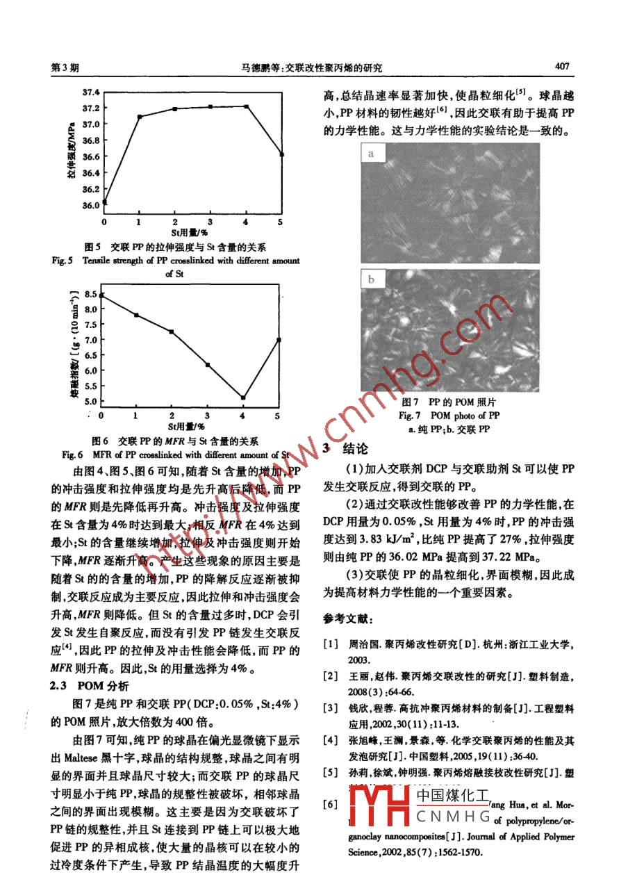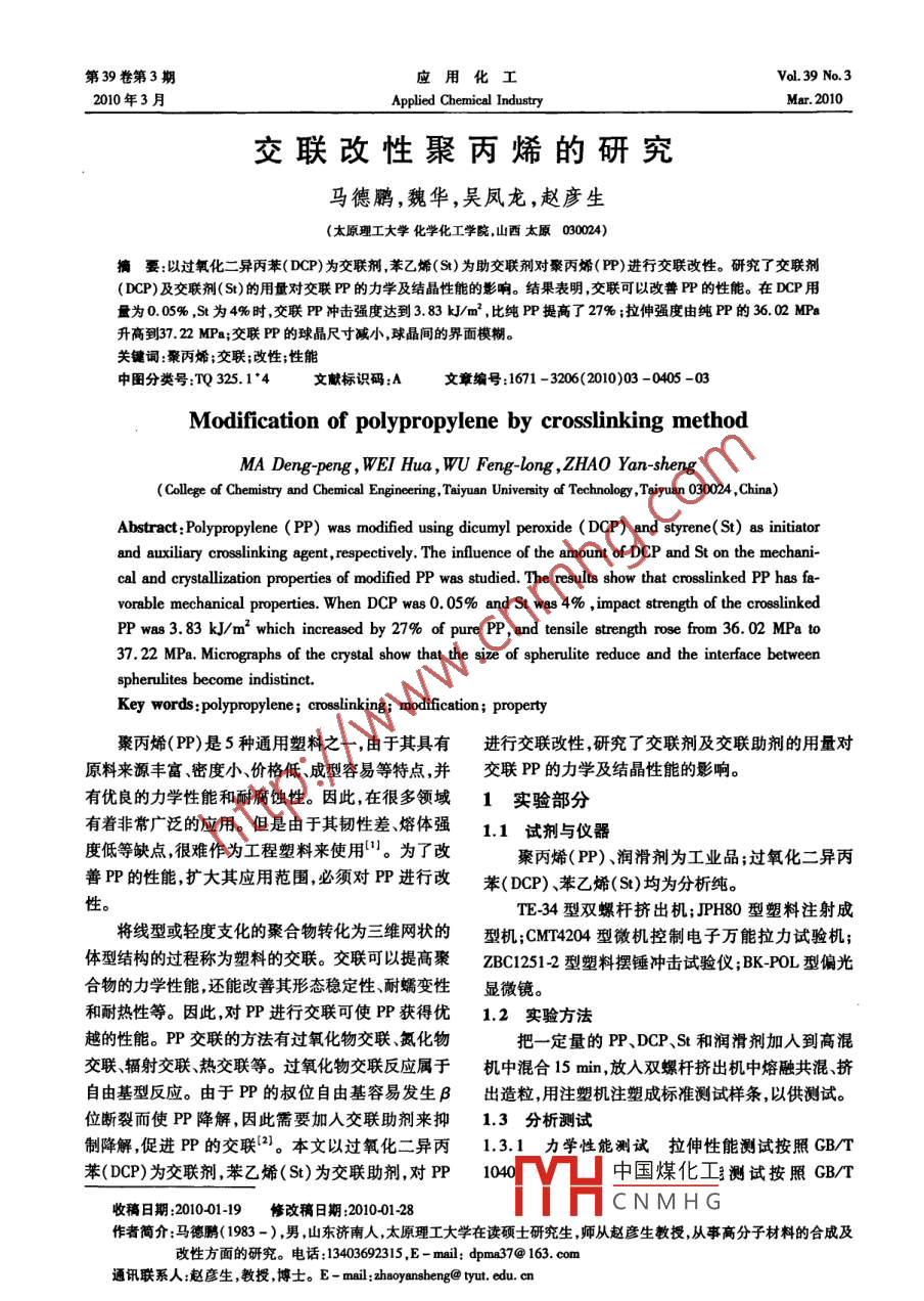 第39卷第3期應(yīng)用化工.39No.32010年3月pplied Chemical IndustryMar.2010交聯(lián)改性聚丙烯的研究馬德鵬,魏華,吳鳳龍,趙彥生(太原理工大學(xué)化學(xué)化工學(xué)院,山西太原090024)摘要:以過(guò)氧化二異丙苯(DCP)為交聯(lián)劑,苯乙烯(S)為助交聯(lián)劑對(duì)聚丙烯(PP)進(jìn)行交聯(lián)改性。研究了交聯(lián)劑(DcP)及交聯(lián)劑(St)的用量對(duì)交聯(lián)PP的力學(xué)及結(jié)晶性能的影響。結(jié)果表明,交聯(lián)可以改善P的性能。在DCP用量為0.05%,St為4%時(shí),交聯(lián)PP沖擊強(qiáng)度達(dá)到383kJ/m2,比純PP提高了27%;拉伸強(qiáng)度由純PP的36.02MP升高到3722MPa;交聯(lián)PP的球晶尺寸減小,球晶間的界面模糊。關(guān)鍵詞:聚丙烯;交聯(lián);改性;性能中圖分類(lèi)號(hào):TQ325.14文獻(xiàn)標(biāo)識(shí)碼:A文章編號(hào):1671-3206(2010)03-0405Modification of polypropylene by crosslinking methodMA Deng-peng, WET Hua, WU Feng-Long, ZHAO Yan-shengCollege of Chemistry and Chemical Engineering, Taiyuan University of Technology, Taiyuan 030024, China)Abstract: Polypropylene( PP)was modified using dicumyl peroxide(DCP)and styrene( St)as initiatorand auxiliary crosslinking agent, respectively. The influence of the amount of DCP and St on the mechanial and crystallization properties of modified PP was studied. The results show that crosslinked PP has fa-orable mechanical properties. When DCP was 0. 05% and St was 4%, impact strength of the crosslinkedPP was 3.83 kJ/m'which increased by 27% of pure PP, and tensile strength rose from 36.02 MPa to37. 22 MPa Micrographs of the crystal show that the size of spherulite reduce and the interface betweenspherulites become indistinct.Key words: polypropylene; crosslinking; modification; property聚丙烯(PP)是5種通用塑料之一,由于其具有進(jìn)行交聯(lián)改性,研究了交聯(lián)劑及交聯(lián)助劑的用量對(duì)原料來(lái)源豐富密度小、價(jià)格低、成型容易等特點(diǎn),并交聯(lián)PP的力學(xué)及結(jié)晶性能的影響。有優(yōu)良的力學(xué)性能和耐腐蝕性。因此,在很多領(lǐng)域1實(shí)驗(yàn)部分有著非常廣泛的應(yīng)用。但是由于其韌性差熔體強(qiáng)11試劑與儀器度低等缺點(diǎn)很難作為工程塑料來(lái)使用。為了改聚丙烯(PP)、潤(rùn)滑劑為工業(yè)品;過(guò)氧化二異丙善P的性能擴(kuò)大其應(yīng)用范圍必須對(duì)P進(jìn)行改苯(DCP)、苯乙烯(S)均為分析純。性TE34型雙螺桿擠出機(jī);PH80型塑料注射成將線(xiàn)型或輕度支化的聚合物轉(zhuǎn)化為三維網(wǎng)狀的型機(jī);CMT4204型微機(jī)控制電子萬(wàn)能拉力試驗(yàn)機(jī);體型結(jié)構(gòu)的過(guò)程稱(chēng)為塑料的交聯(lián)。交聯(lián)可以提高聚ZBC12512型塑料擺錘沖擊試驗(yàn)儀; BK-POL型偏光合物的力學(xué)性能還能改善其形態(tài)穩(wěn)定性、耐蠕變性顯微鏡。和耐熱性等。因此對(duì)PP進(jìn)行交聯(lián)可使PP獲得優(yōu)1.2實(shí)驗(yàn)方法越的性能。P交聯(lián)的方法有過(guò)氧化物交聯(lián)、氮化物把一定量的PP、DCP、St和潤(rùn)滑劑加入到高混交聯(lián)輻射交聯(lián)、熱交聯(lián)等。過(guò)氧化物交聯(lián)反應(yīng)屬于機(jī)中混合15min,放入雙螺桿擠出機(jī)中熔融共混、擠自由基型反應(yīng)。由于PP的叔位自由基容易發(fā)生B出造粒用注塑機(jī)注塑成標(biāo)準(zhǔn)測(cè)試樣條以供測(cè)試。位斷裂而使PP降解,因此需要加入交聯(lián)助劑來(lái)抑1.3分析測(cè)試制降解,促進(jìn)PP的交聯(lián)(。本文以過(guò)氧化二異丙1.3.1力學(xué)性能測(cè)試?yán)煨阅軠y(cè)試按照GB/T苯(DCP)為交聯(lián)劑,苯乙烯(St)為交聯(lián)助劑,對(duì)PP1040中國(guó)煤化工測(cè)試按照GBT收稿日期:201001-19修改稿日期:201001-28CNMHG作者簡(jiǎn)介:馬德鵬(1983-),男,山東濟(jì)南人,太原理工大學(xué)在讀碩士研究生,師從趙彥生教授,從事高分子材料的合成及改性方面的研究。電話(huà):13403692315,E-mil:dmn37@163.com通訊聯(lián)系人:趙彥生,教授博士。E-mail: haoyansheng@tyut.cdu應(yīng)用化工第39卷103993標(biāo)準(zhǔn)進(jìn)行。1.3.2熔體流動(dòng)速率的測(cè)定熔融指數(shù)按GB/T3682—2000測(cè)試,測(cè)試溫度為230℃,負(fù)荷2.16kg,每組切取樣條5個(gè),求平均值。熔體流動(dòng)速率(MFR)按下式計(jì)算:MFR式中MFR—熔體流動(dòng)速率,g/100000050.0.15020025030W——切取樣條質(zhì)量的算術(shù)平均值,g;圖3交聯(lián)PP的MFR與DCP含量的關(guān)系切取時(shí)間間隔,sFig 3 MFR of PP crosslinked with different content of DCP1.3.3偏光顯微鏡(POM)測(cè)試把樣品放入烘由圖1、圖2、圖3可知隨著DCP含量的增加,箱,在220℃恒溫10min,指壓成膜。在220℃恒溫交聯(lián)PP的沖擊和拉伸強(qiáng)度均呈現(xiàn)先升高后降低的10min后,在132℃下等溫結(jié)晶2h,取出在空氣中趨勢(shì),而MFR則是先降低后升高。在DCP含量為冷卻,用偏光顯微鏡觀察球晶結(jié)構(gòu)。005%,沖擊強(qiáng)度達(dá)到最大值,為3.83k/m2,比純2結(jié)果與討論P(yáng)P提高了27%;而拉伸強(qiáng)度為3722MPa,在一定的DCP用量范圍內(nèi)(0.05%~0.2%)基本保持不21交聯(lián)劑用量對(duì)交聯(lián)P力學(xué)性能及MFR的影響變;且MFR在DCP含量為0.05%時(shí)達(dá)到最小值為圖1圖2圖3分別是交聯(lián)PP的沖擊強(qiáng)度、拉5.1g/10min。產(chǎn)生這些現(xiàn)象的原因是因?yàn)榻宦?lián)與伸強(qiáng)度及MFR與DCP含量的曲線(xiàn)圖。其中St用降解是